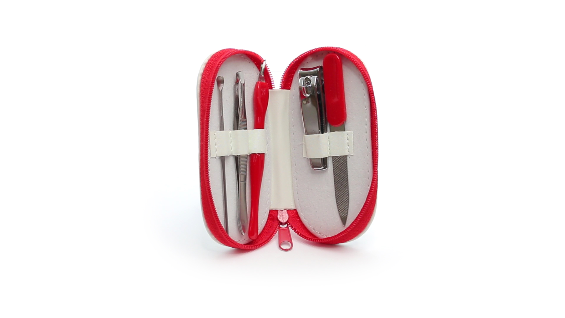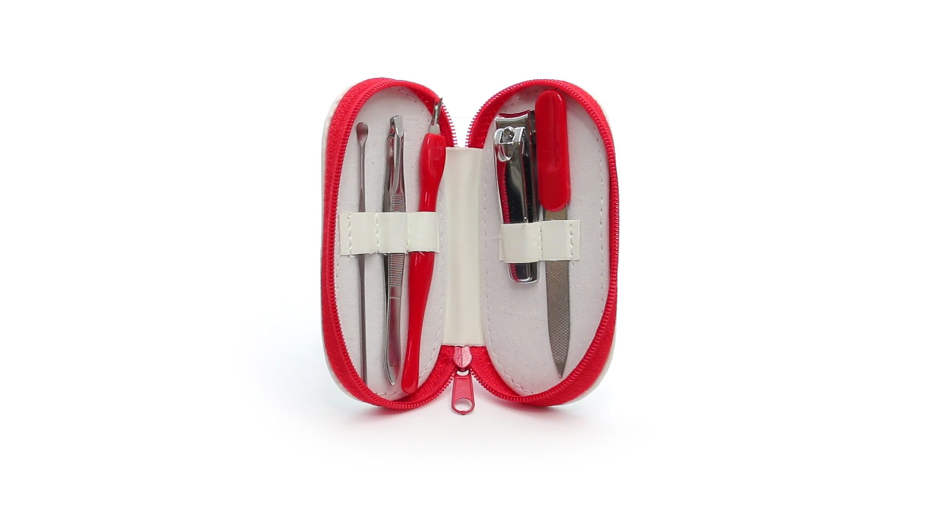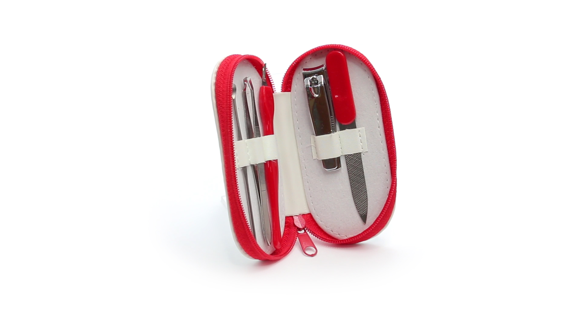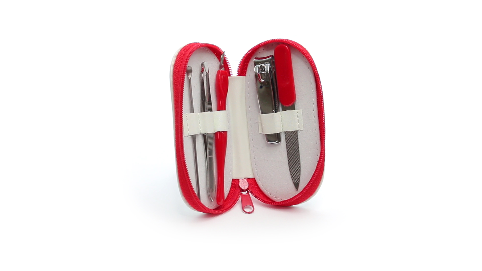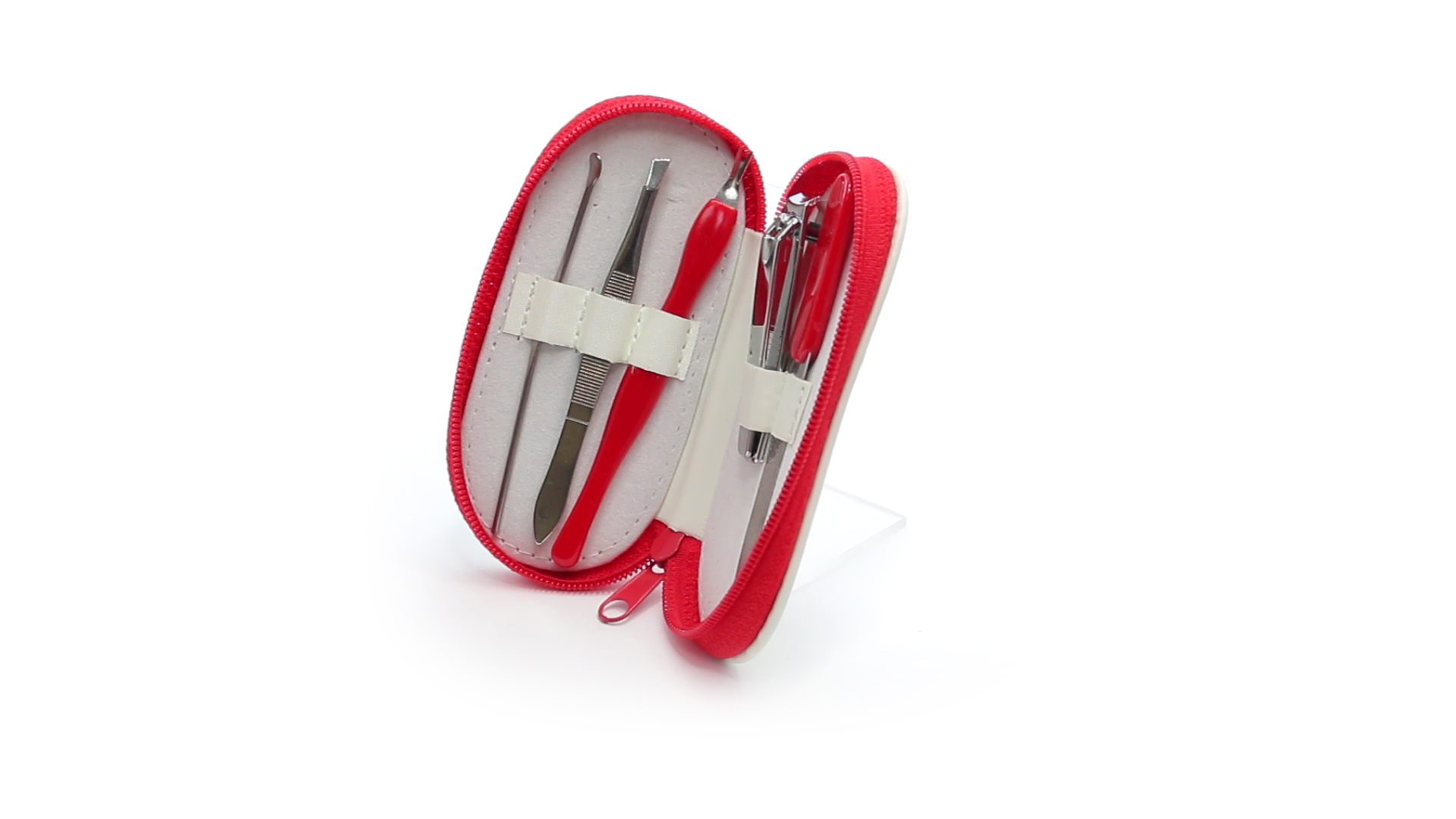 5-teiliges Maniküre-Set aus Edelstahl in einem Kunstleder-Etui mit Reissverschluss in lebendigen Farben. Enthält Nagelhautschneider, Feile, Nagelknipser, Pinzette und Nagelzubehör.