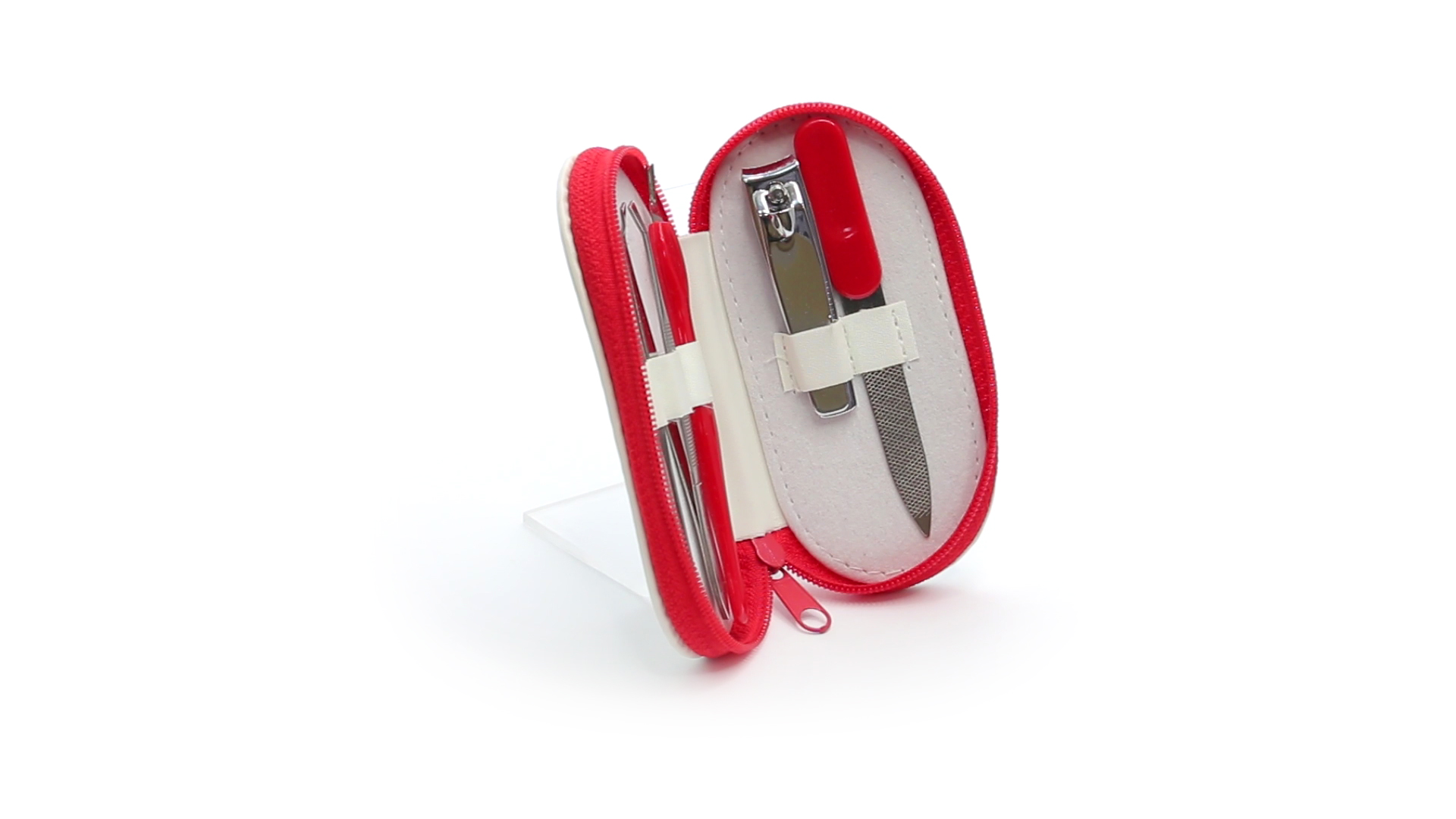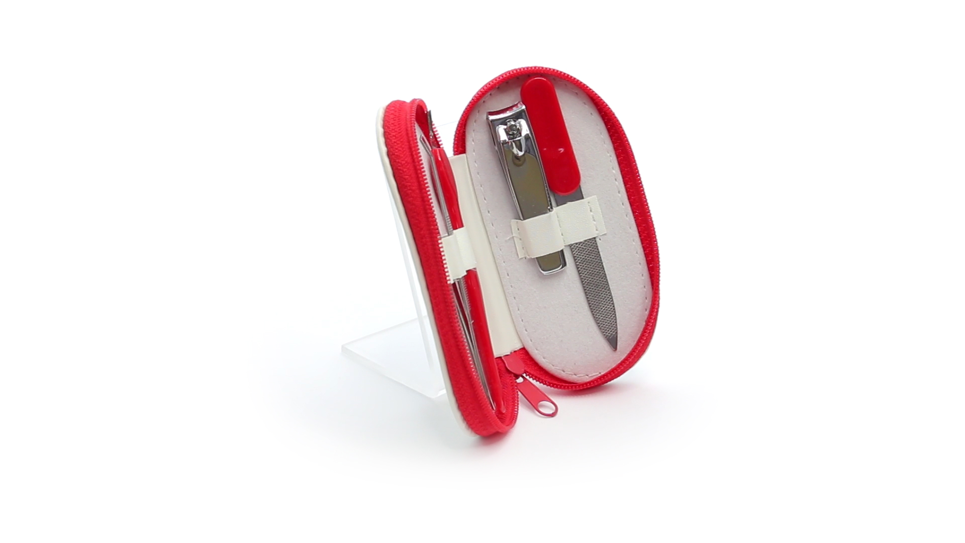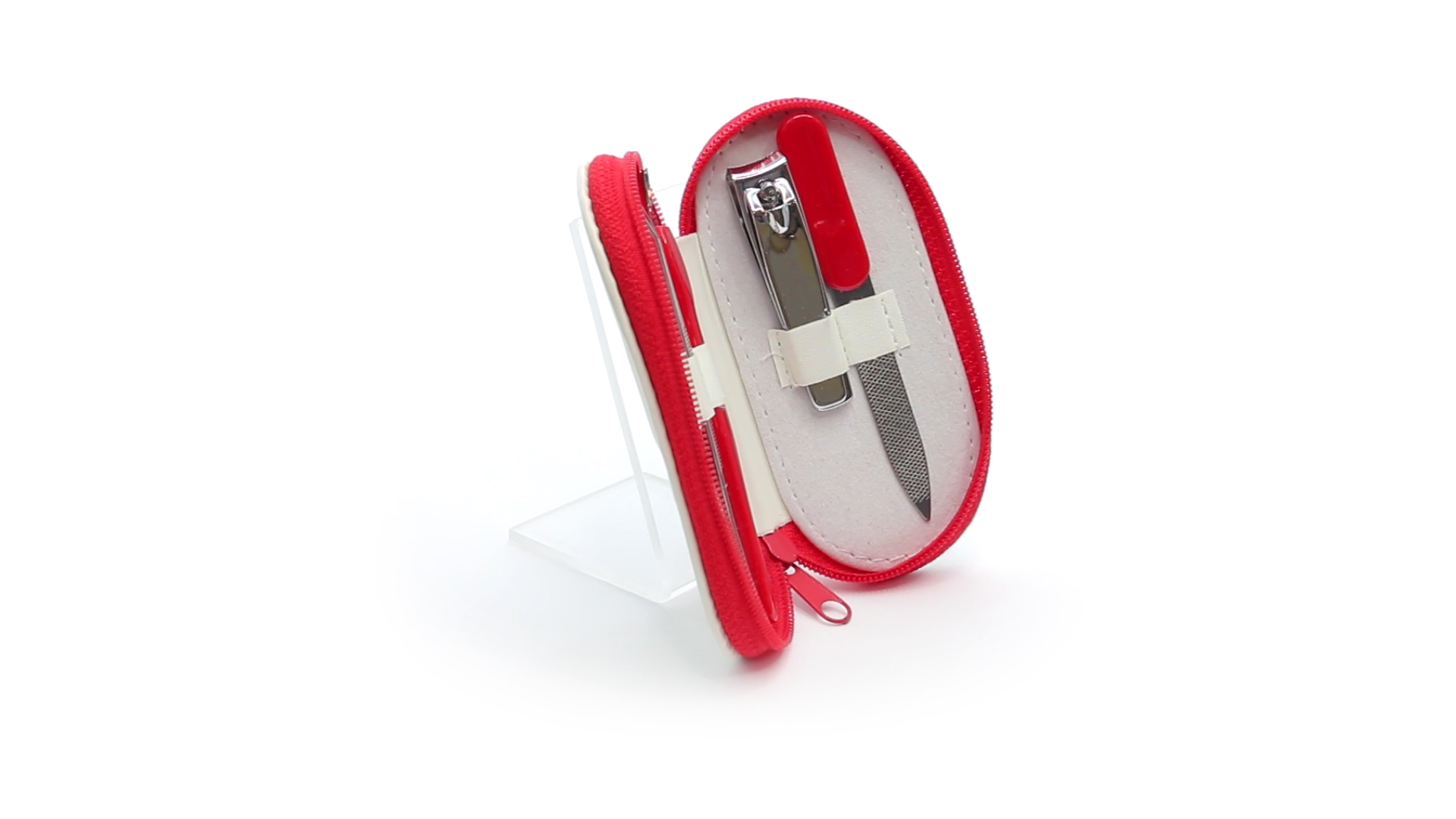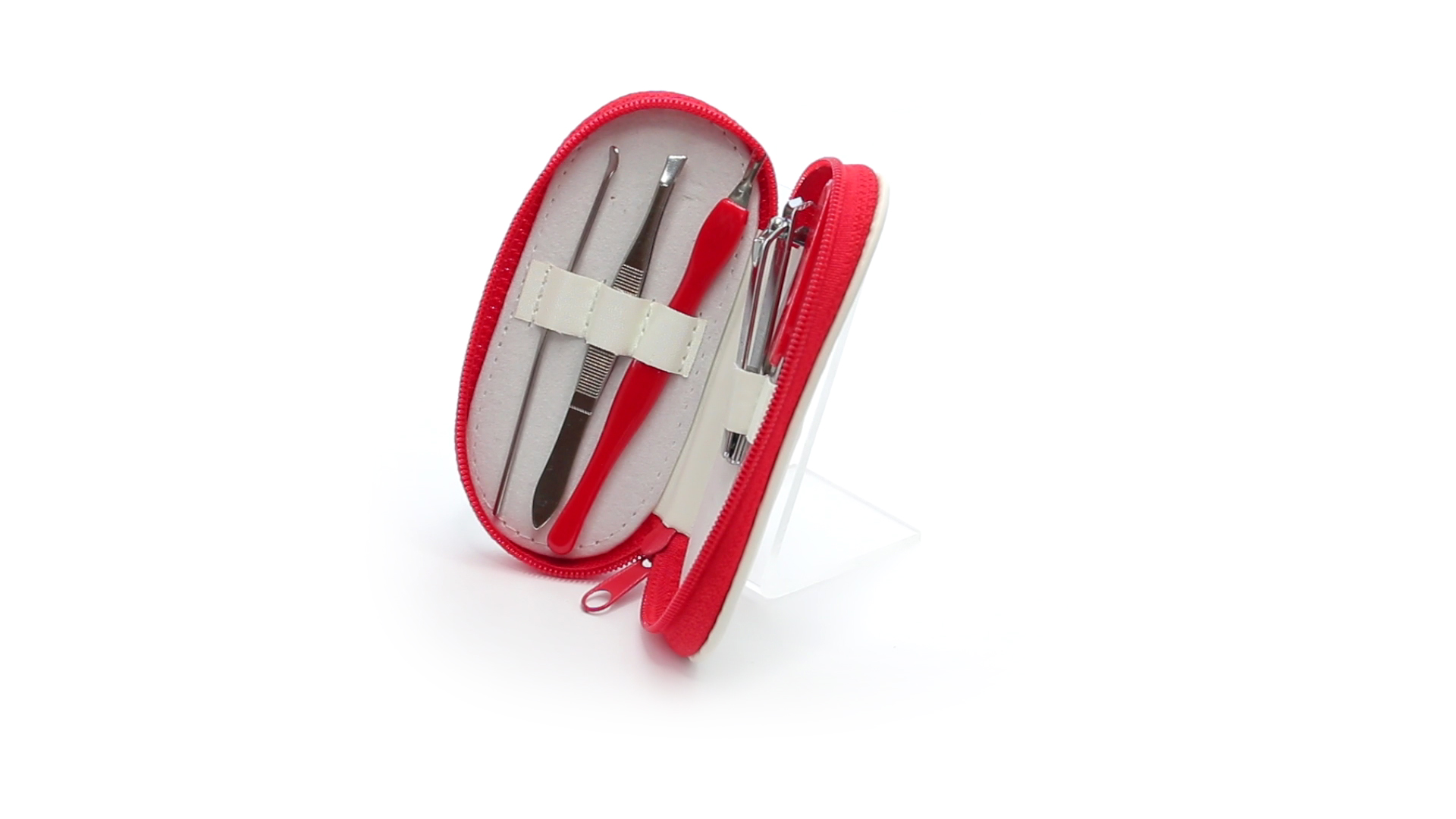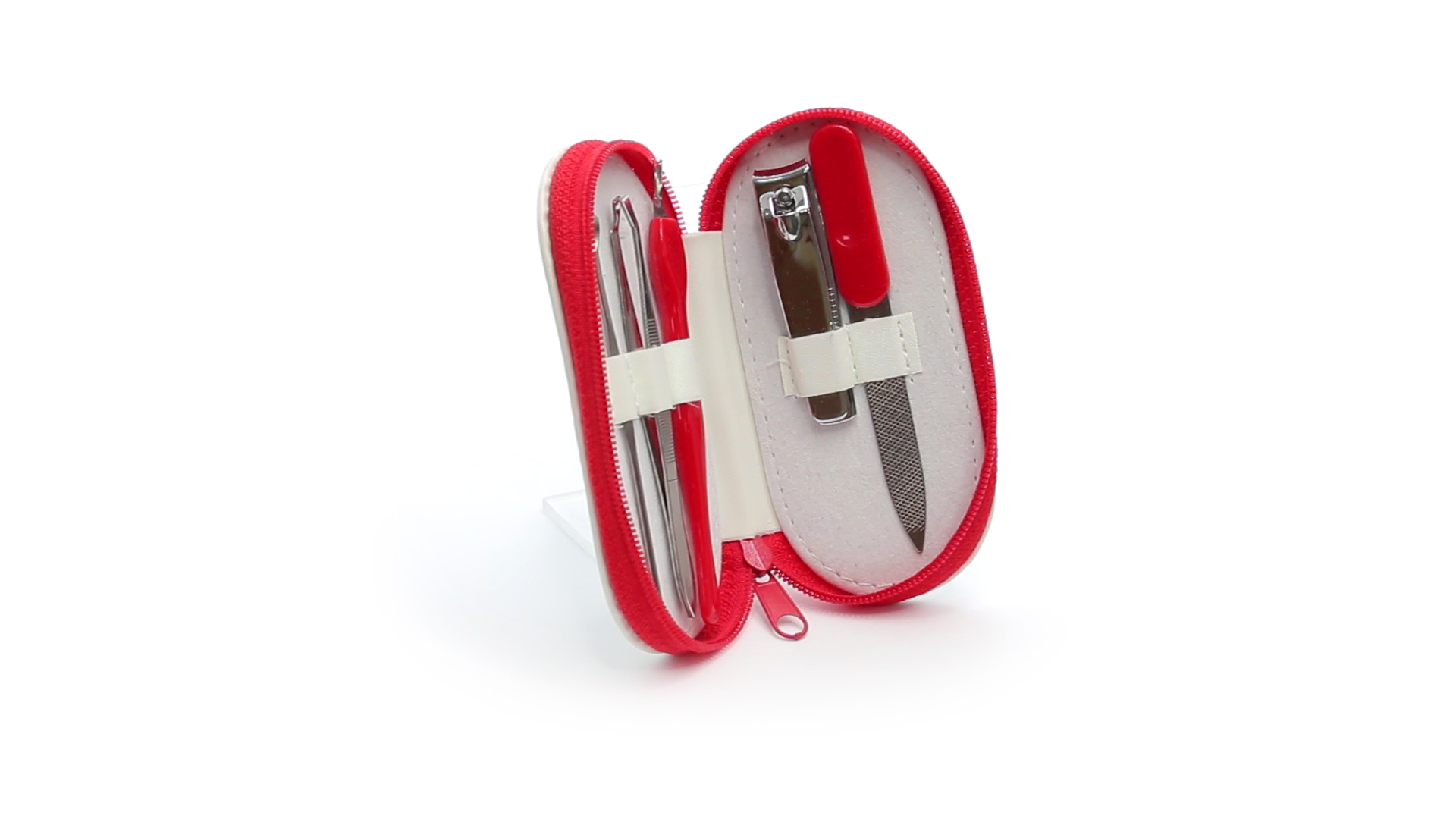 5-teiliges Maniküre-Set aus Edelstahl in einem Kunstleder-Etui mit Reissverschluss in lebendigen Farben. Enthält Nagelhautschneider, Feile, Nagelknipser, Pinzette und Nagelzubehör.