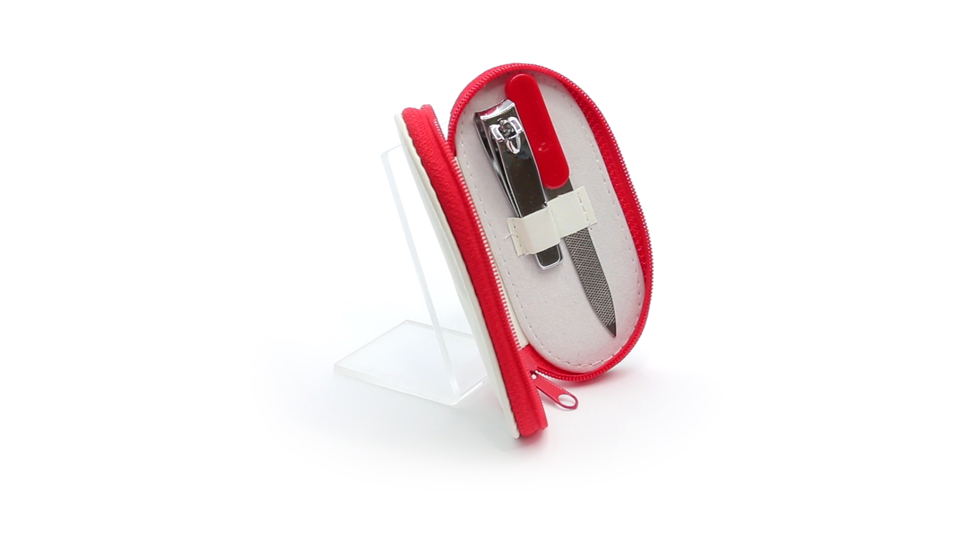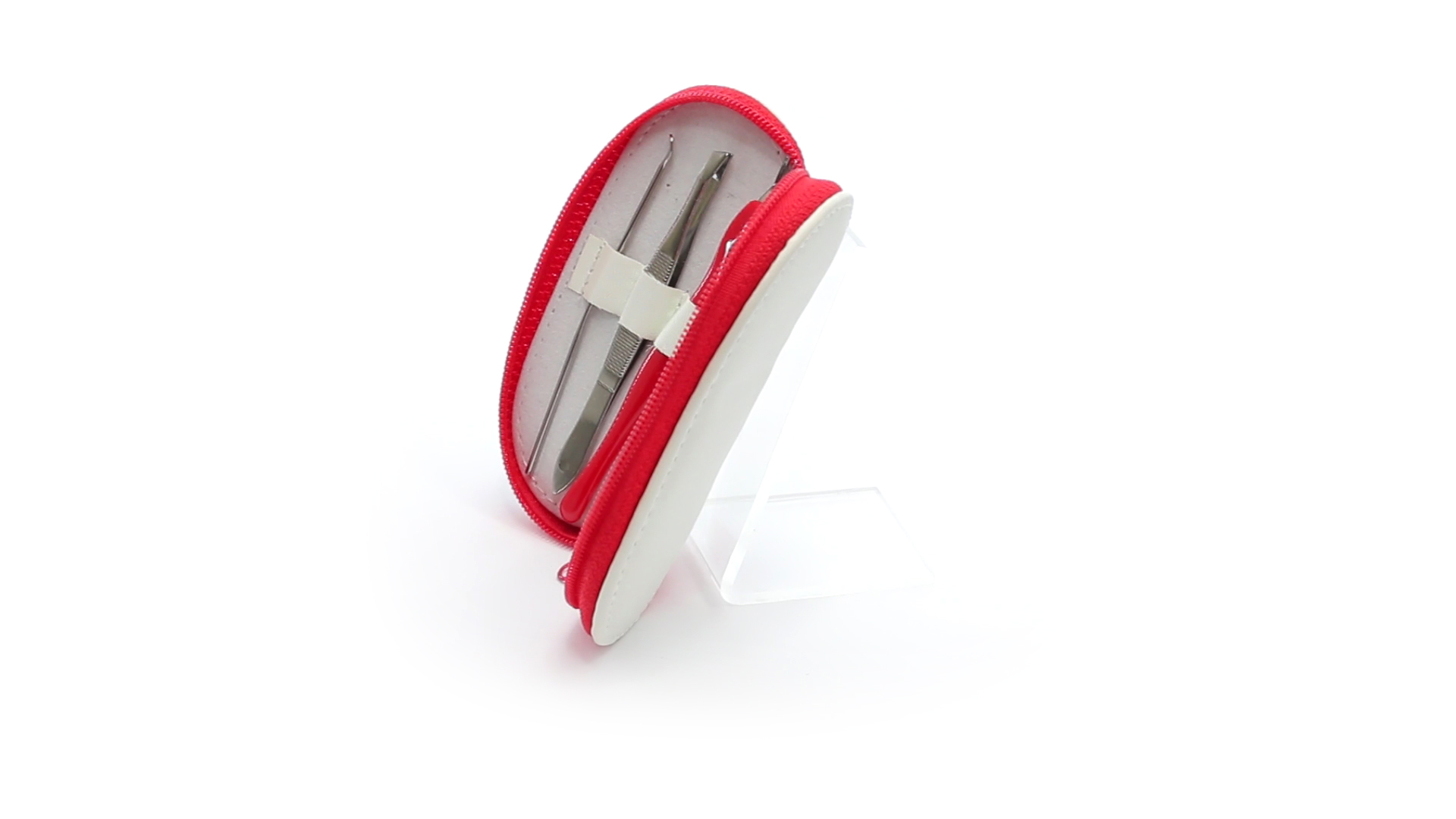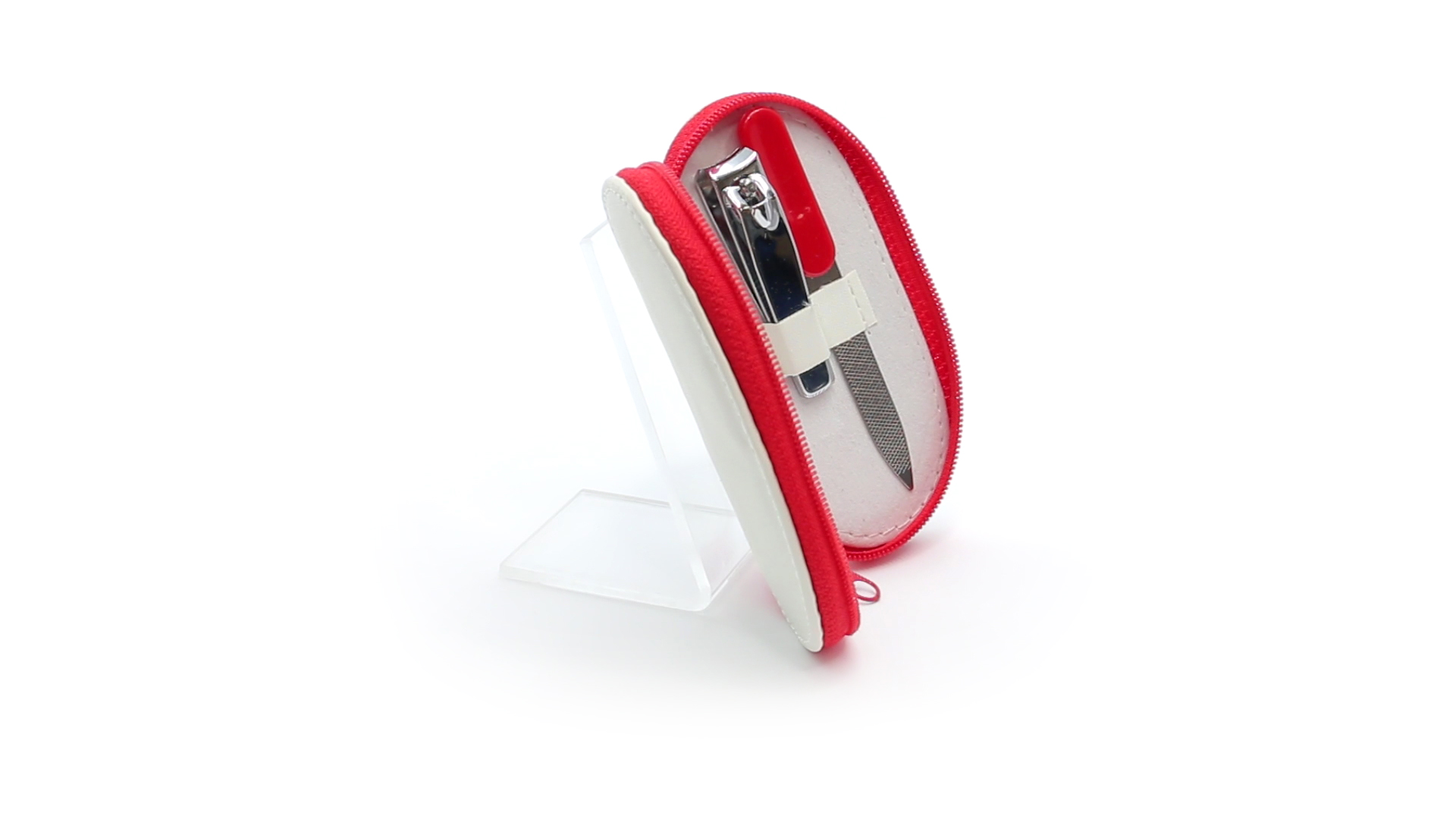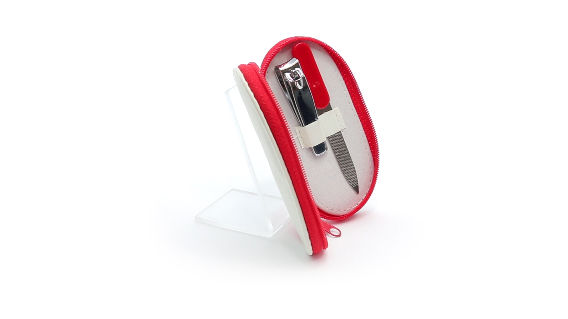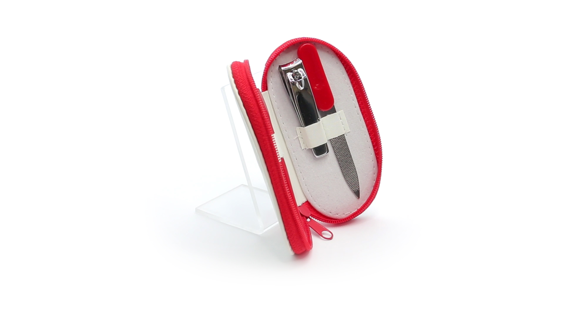 5-teiliges Maniküre-Set aus Edelstahl in einem Kunstleder-Etui mit Reissverschluss in lebendigen Farben. Enthält Nagelhautschneider, Feile, Nagelknipser, Pinzette und Nagelzubehör.