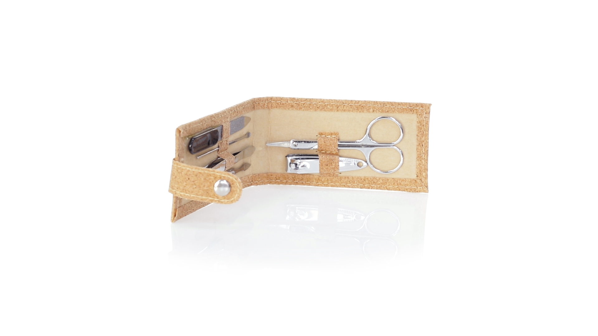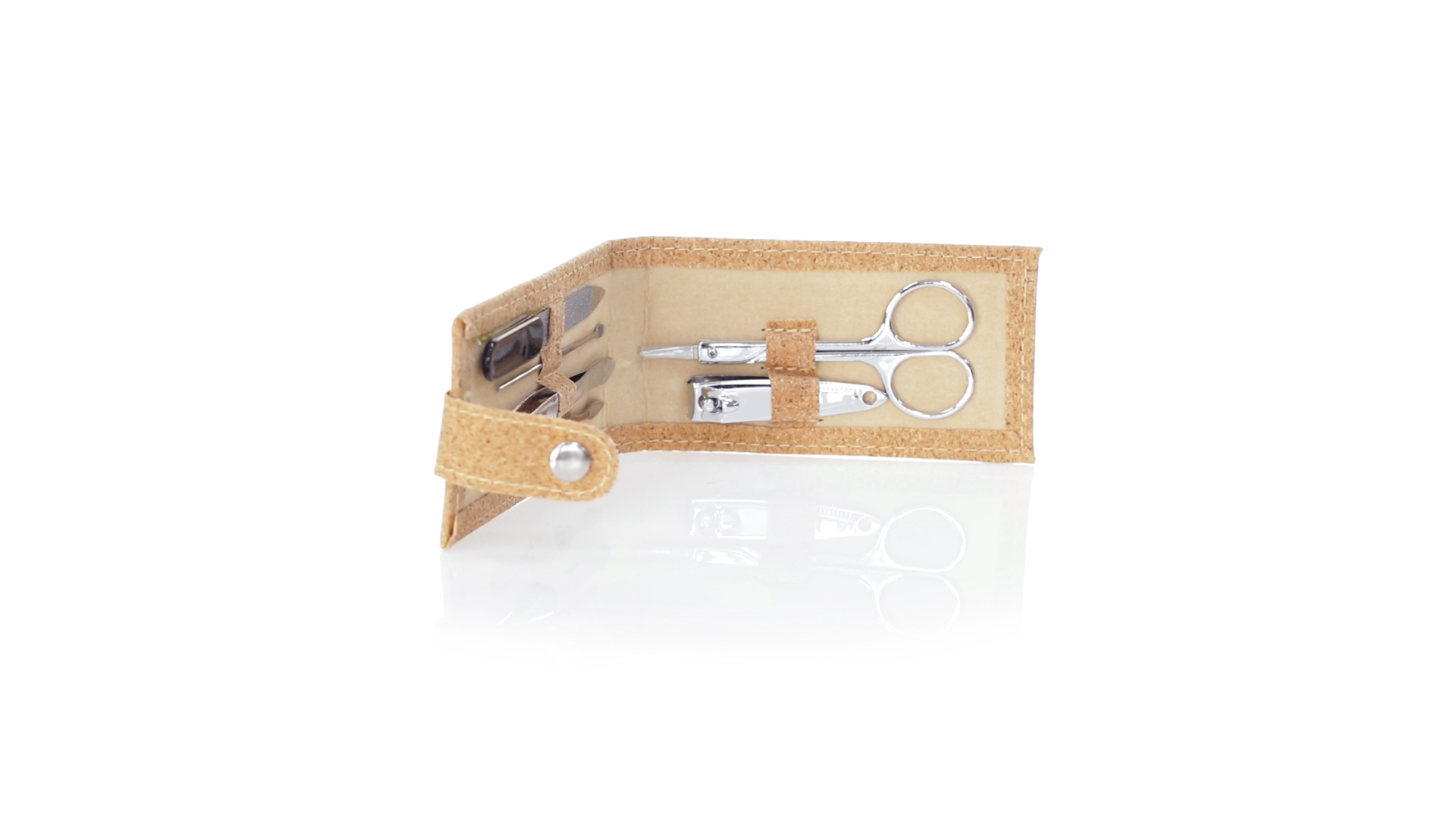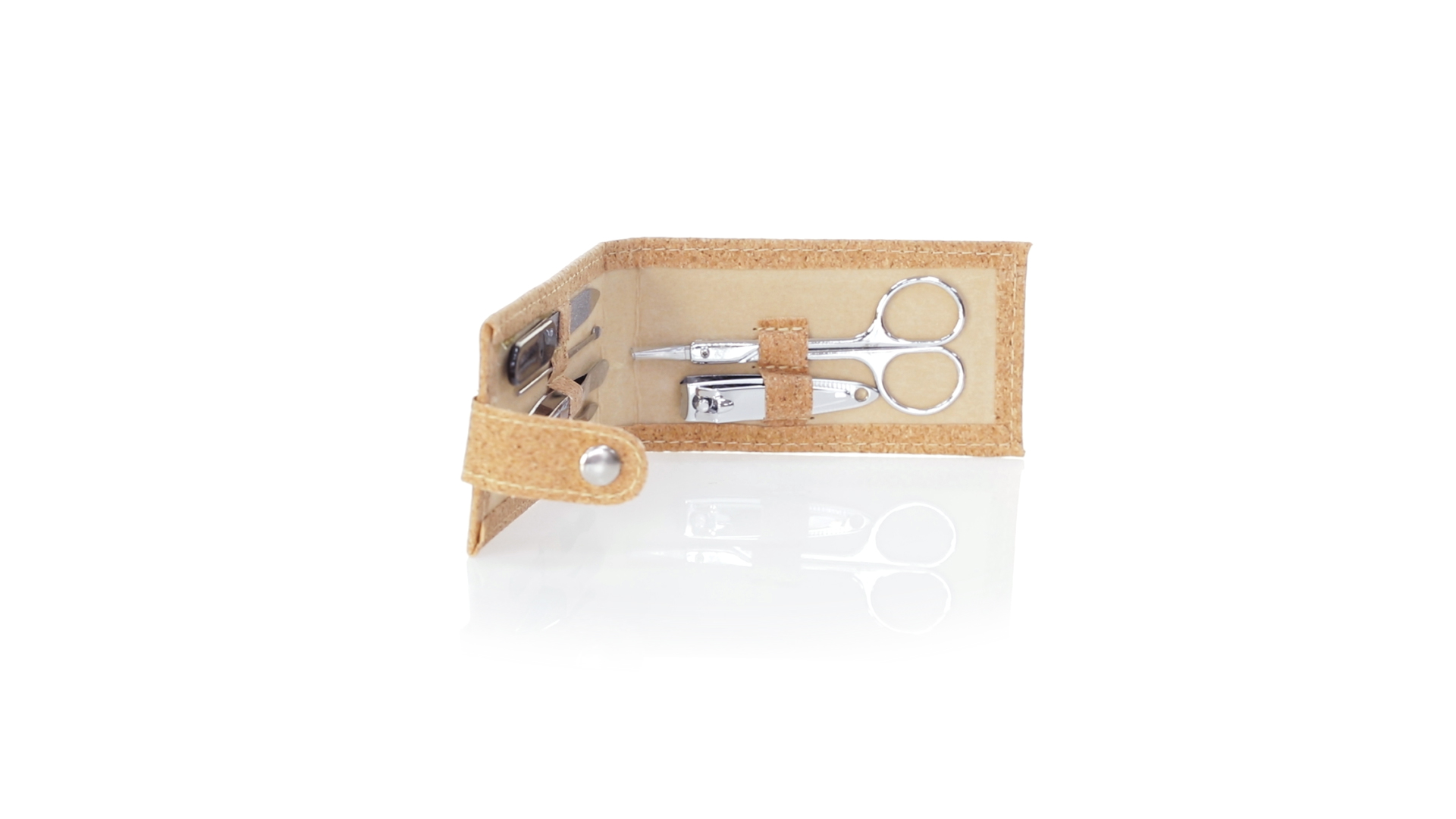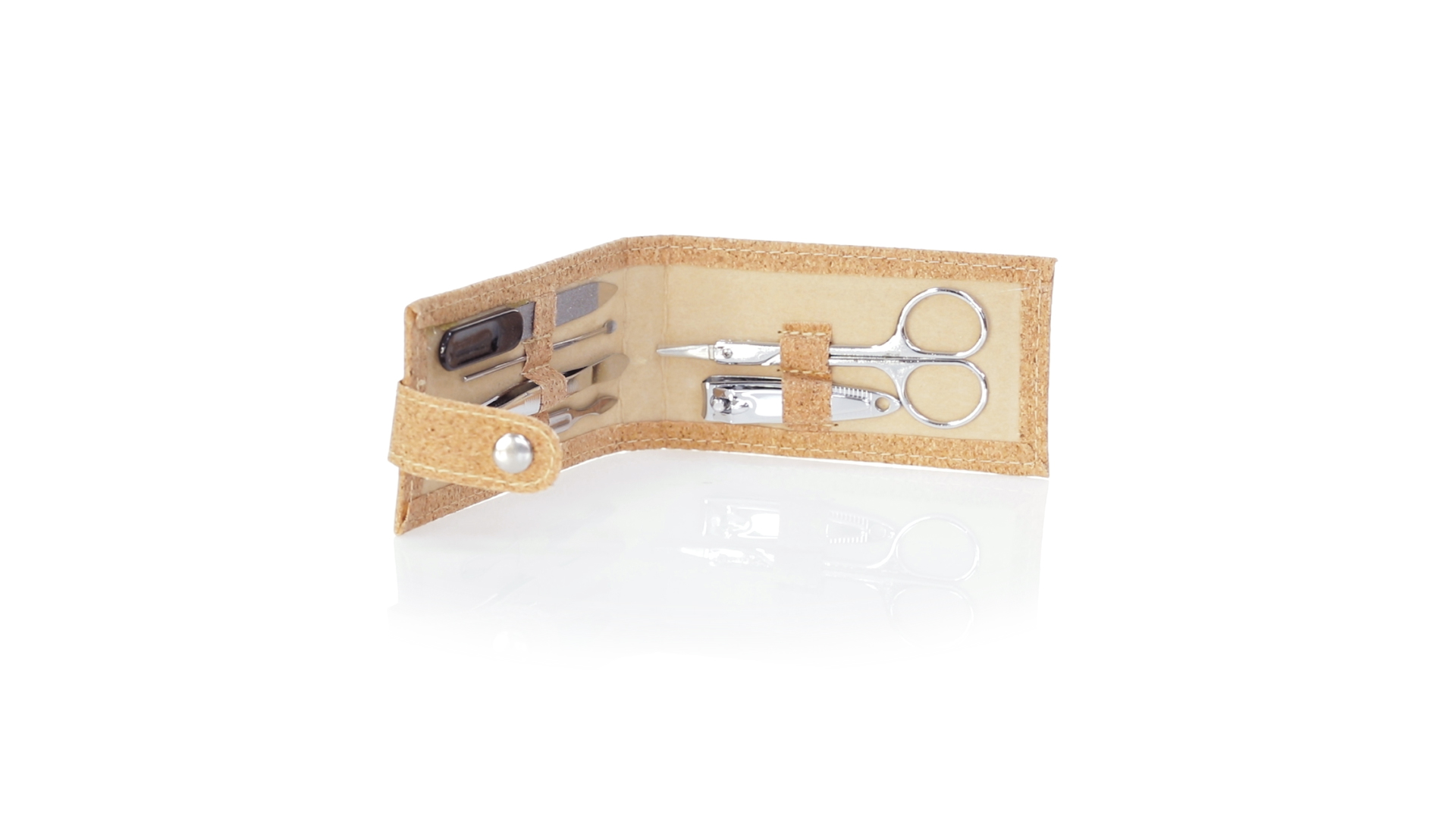 Linie "Natur" Maniküre-Set in einem Korketui, um die Verwendung natürlicher Rohstoffe zu fördern und Schadstoffemissionen zu reduzieren. Inklusive 6 Zubehörteile aus Edelstahl: Schere, Pinzette, Nagelknipser, Nagelfeile und 2 Nagelhautentferner. Innenliegende Zubehörhalter und Knopfverschluss. Vollständig ausklappbar für einfaches Branding.