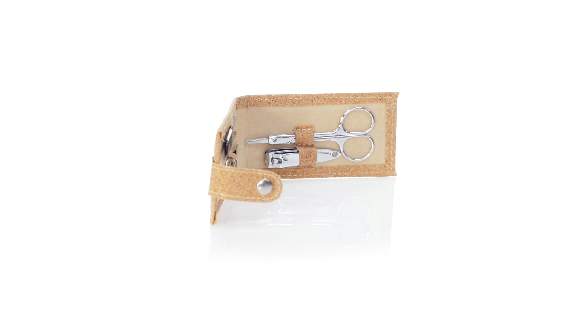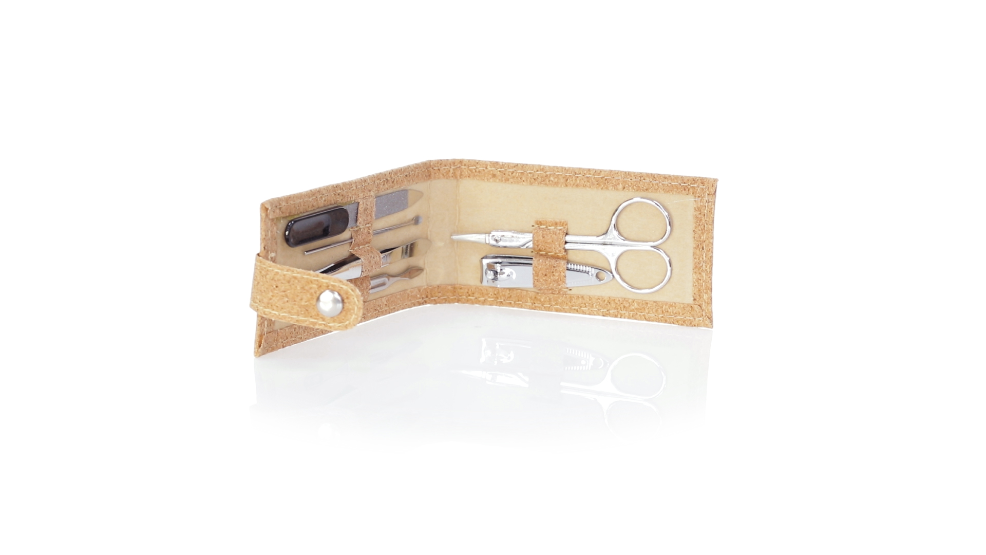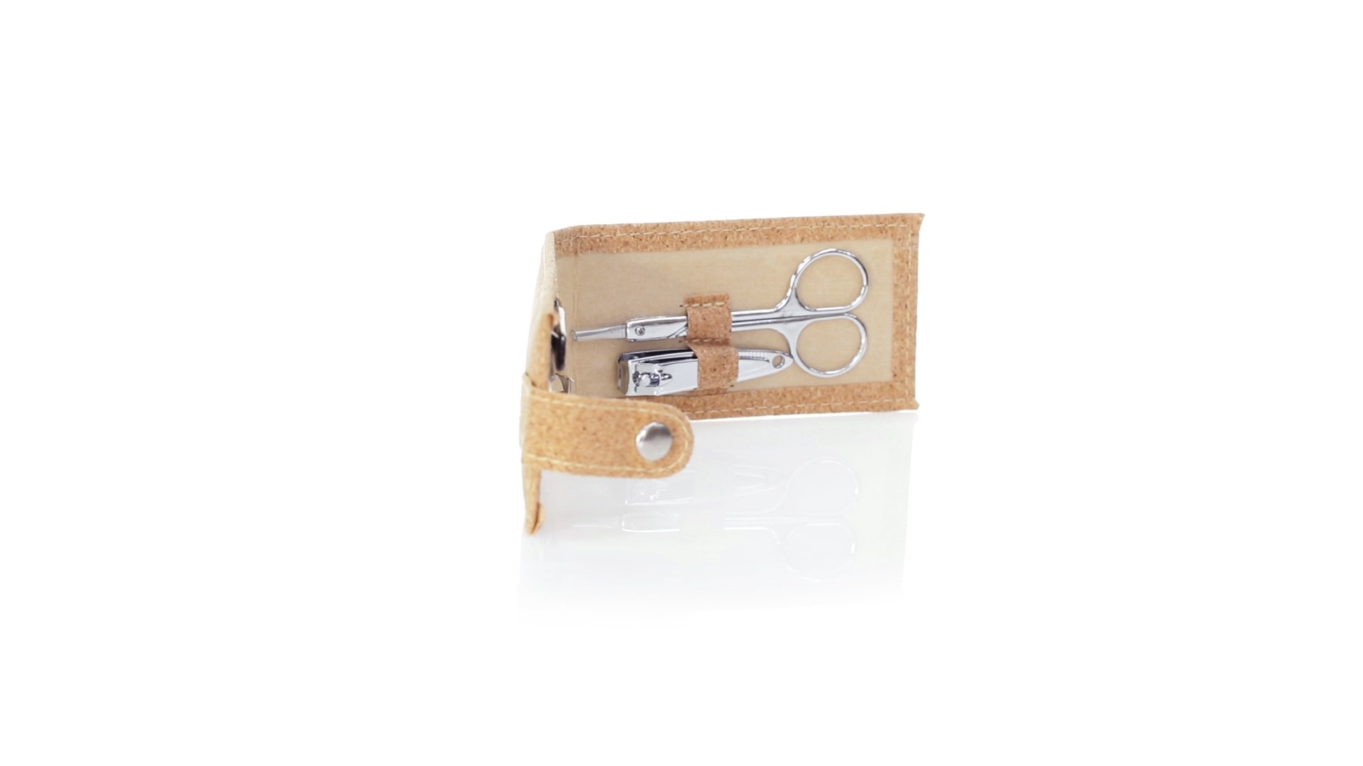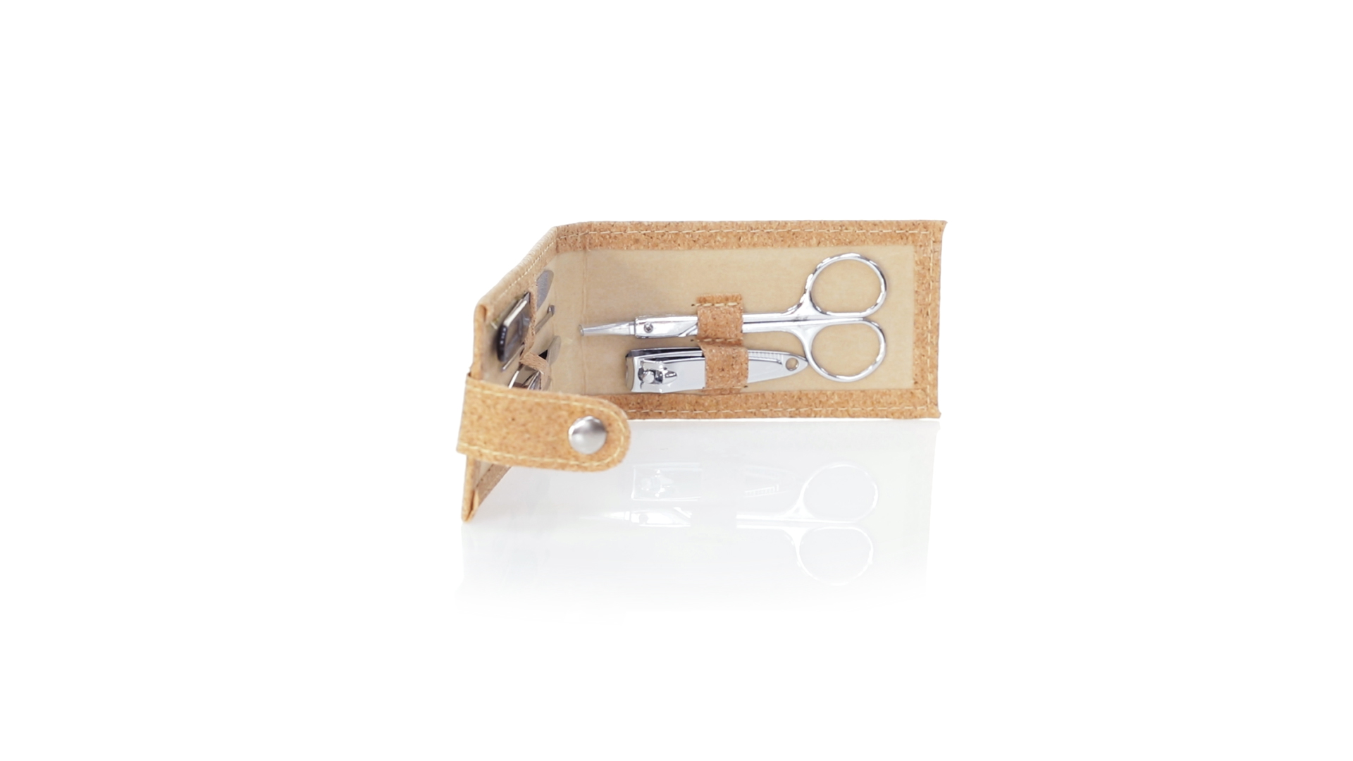 Linie "Natur" Maniküre-Set in einem Korketui, um die Verwendung natürlicher Rohstoffe zu fördern und Schadstoffemissionen zu reduzieren. Inklusive 6 Zubehörteile aus Edelstahl: Schere, Pinzette, Nagelknipser, Nagelfeile und 2 Nagelhautentferner. Innenliegende Zubehörhalter und Knopfverschluss. Vollständig ausklappbar für einfaches Branding.