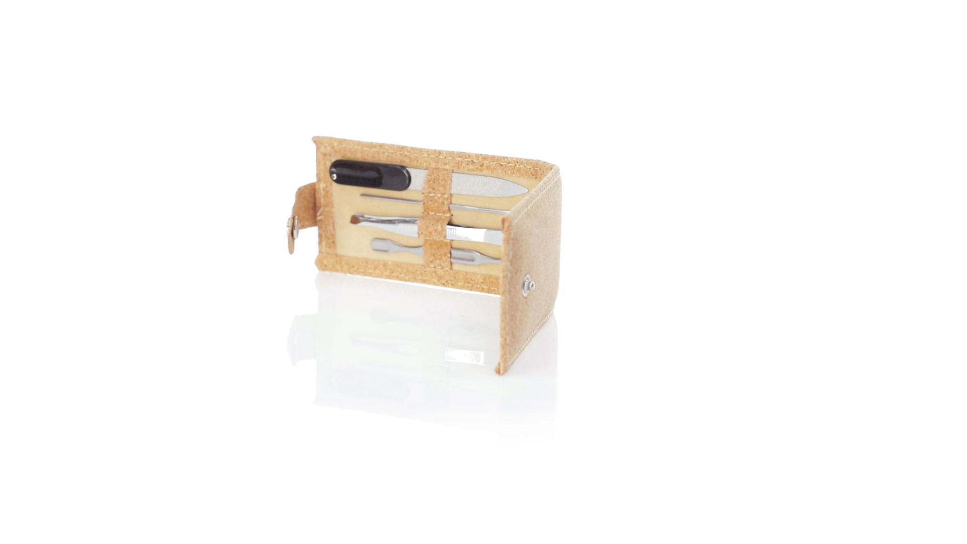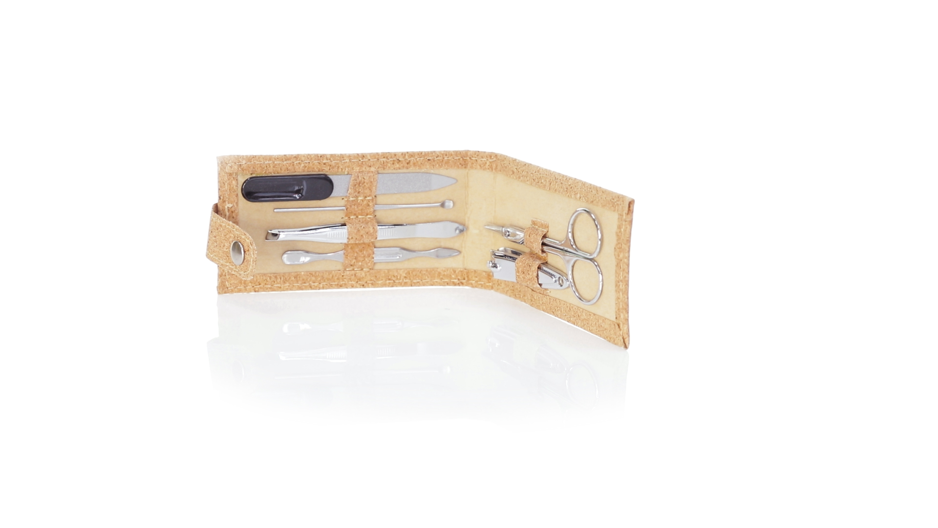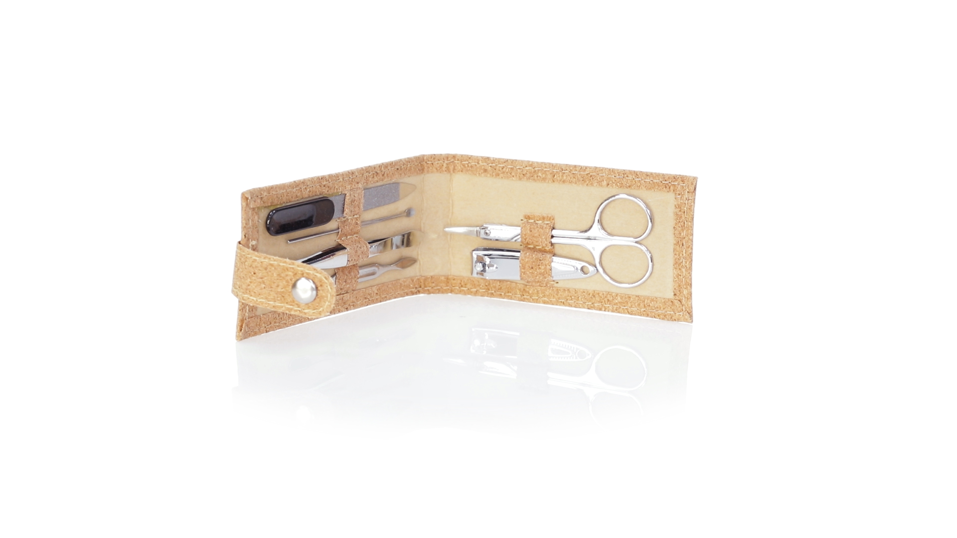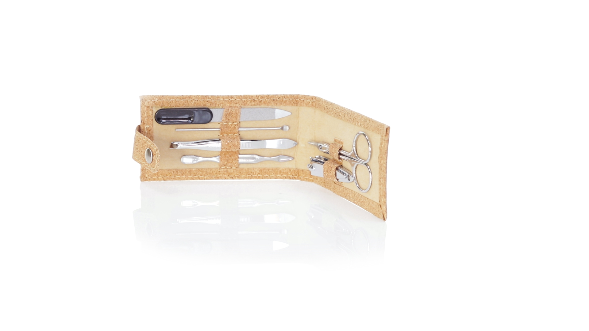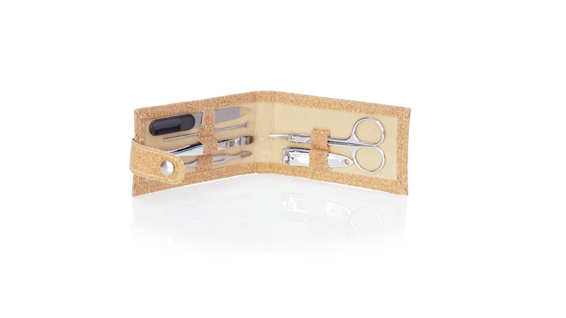 Linie "Natur" Maniküre-Set in einem Korketui, um die Verwendung natürlicher Rohstoffe zu fördern und Schadstoffemissionen zu reduzieren. Inklusive 6 Zubehörteile aus Edelstahl: Schere, Pinzette, Nagelknipser, Nagelfeile und 2 Nagelhautentferner. Innenliegende Zubehörhalter und Knopfverschluss. Vollständig ausklappbar für einfaches Branding.