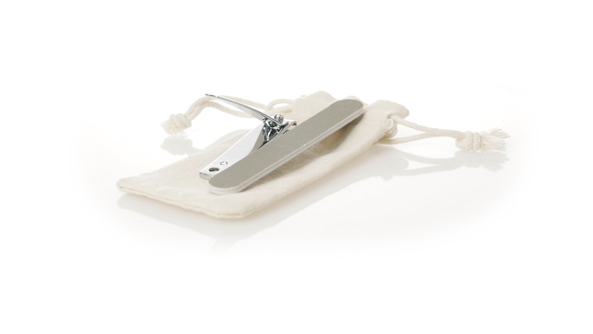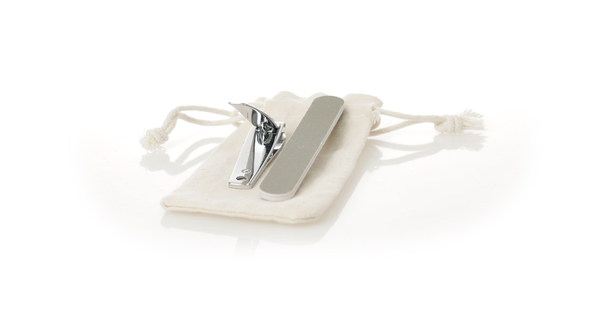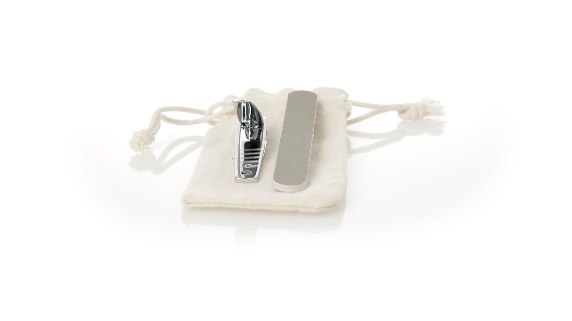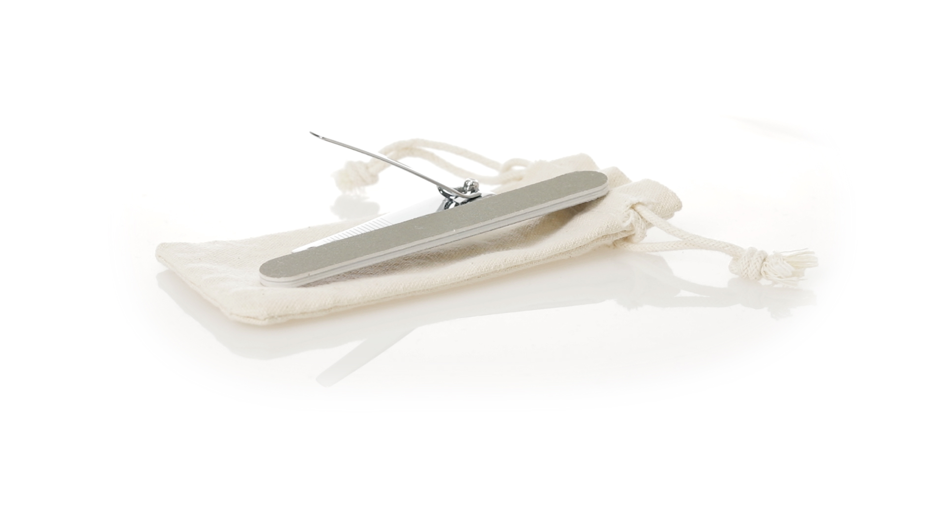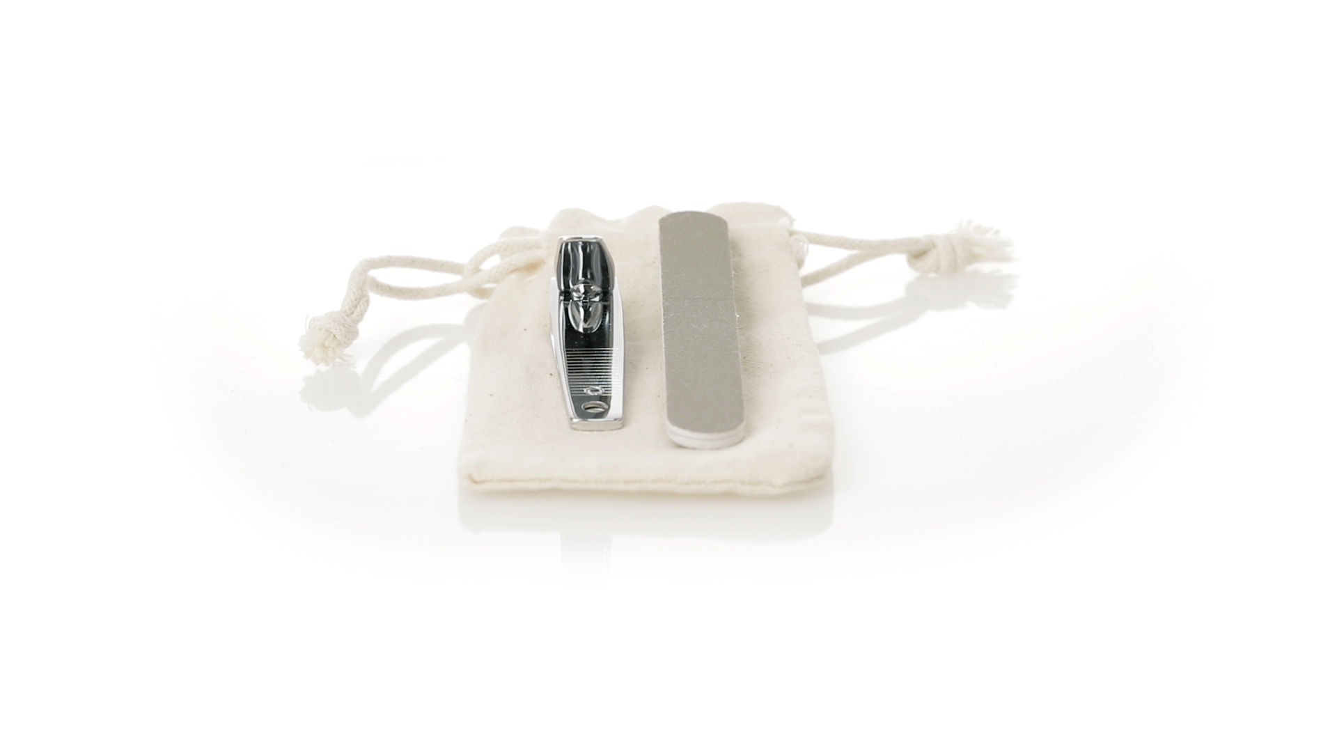 Maniküreset mit Nagelfräser und Feile. Präsentiert in individuellem Beutel aus natürlicher Baumwolle mit Schnurverschluss.