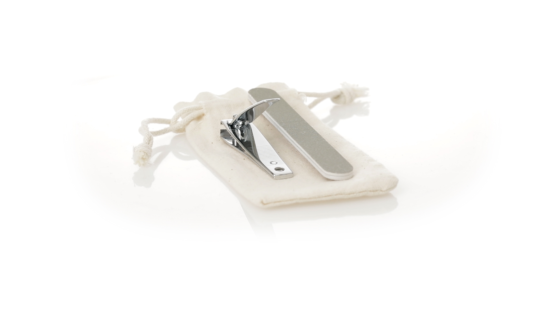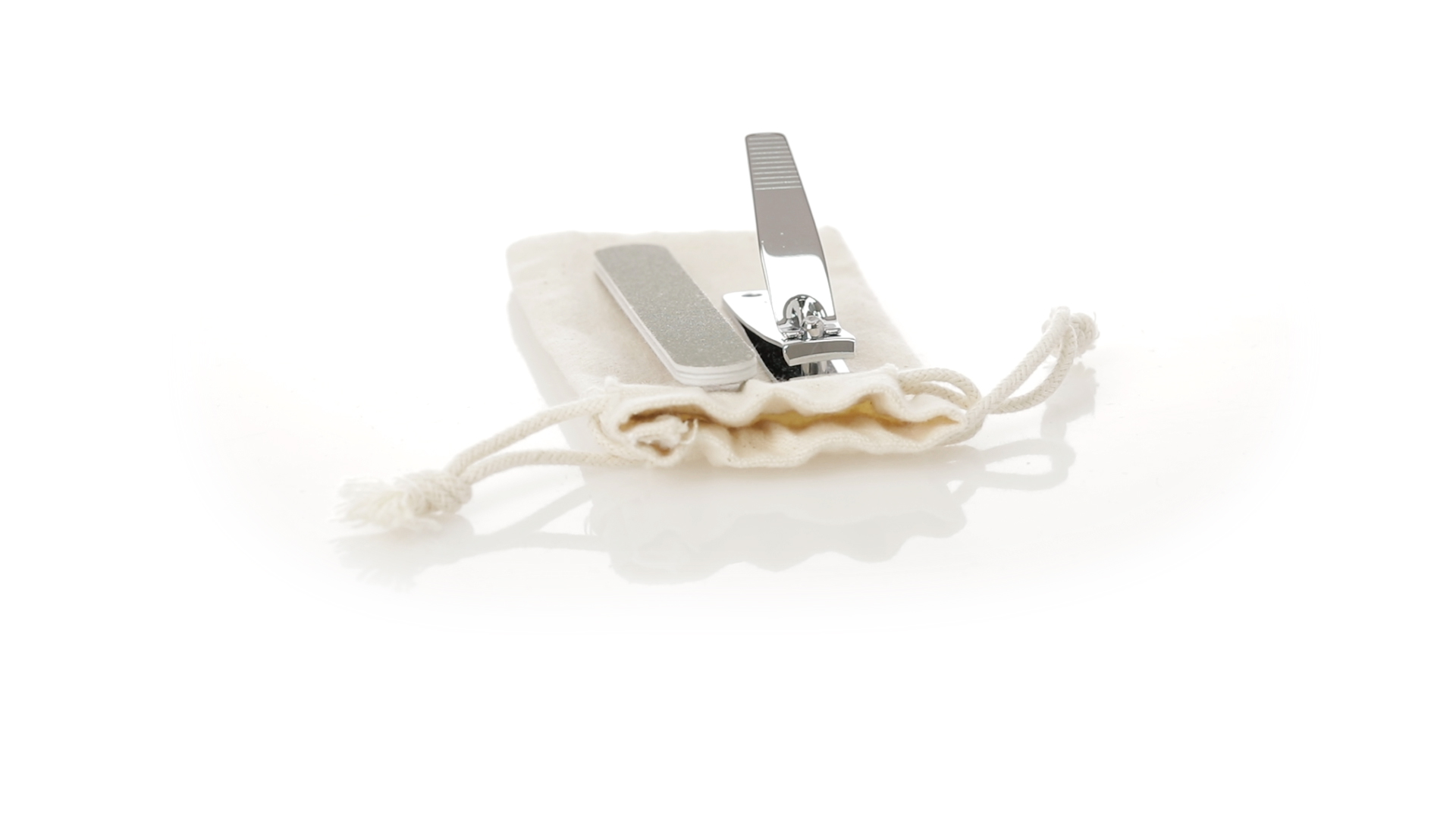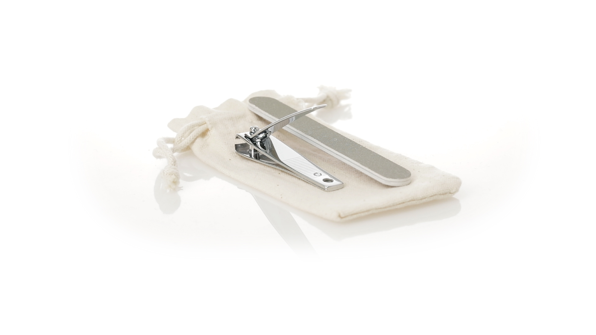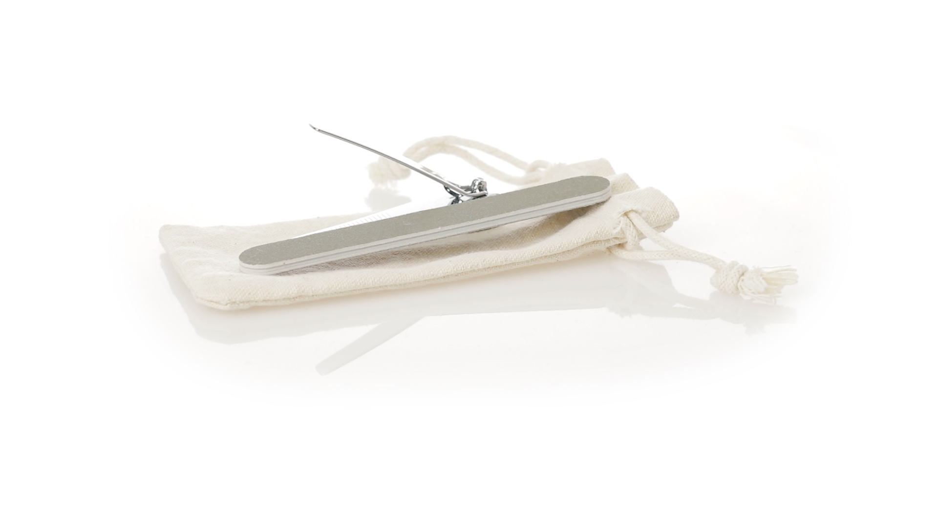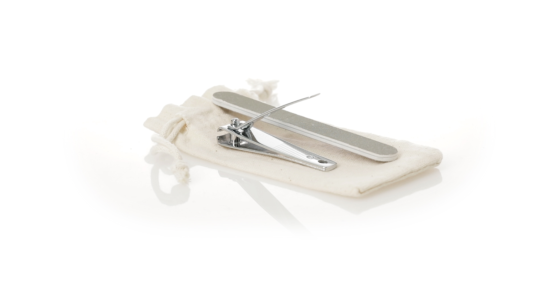 Maniküreset mit Nagelfräser und Feile. Präsentiert in individuellem Beutel aus natürlicher Baumwolle mit Schnurverschluss.