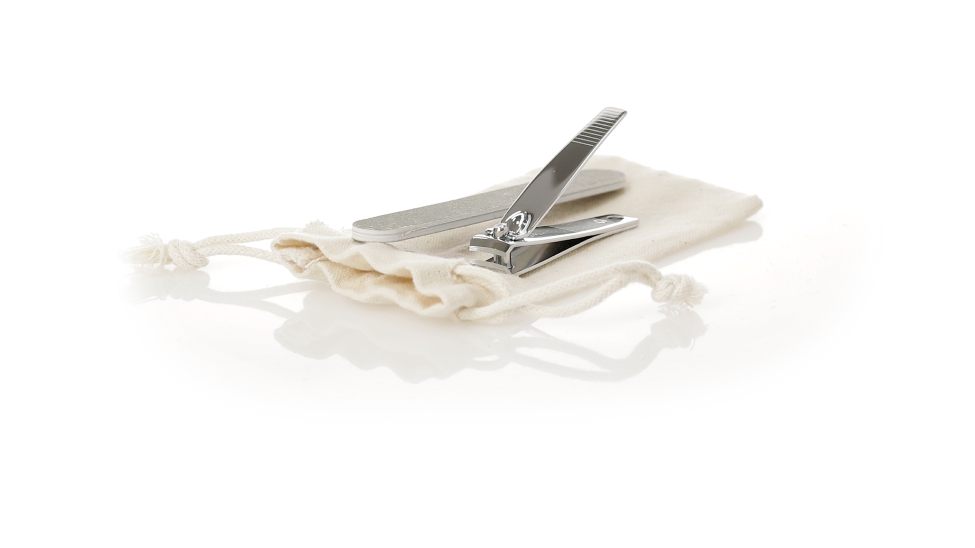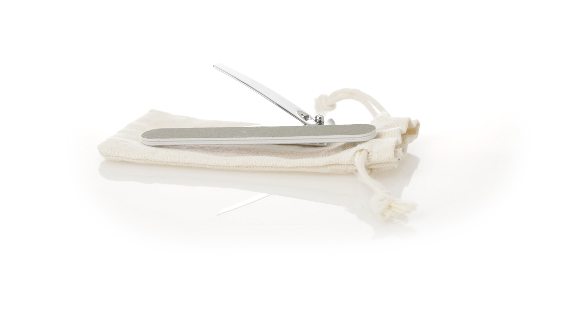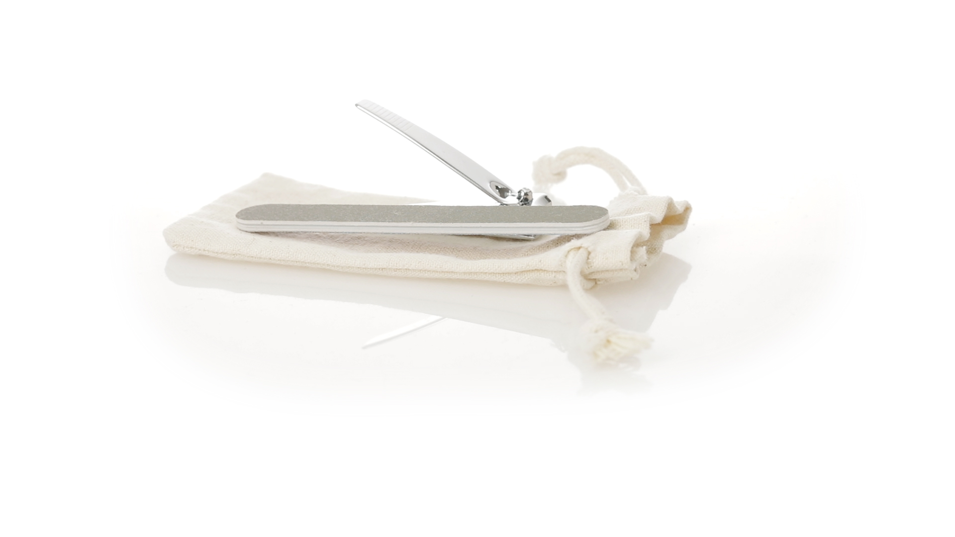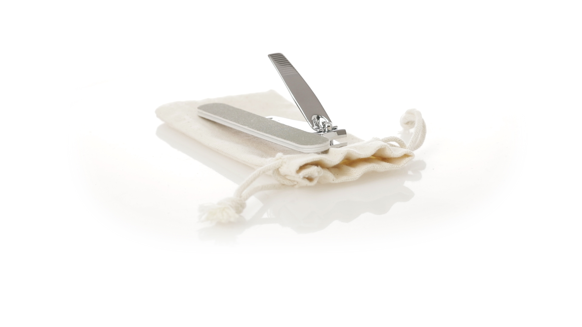 Maniküreset mit Nagelfräser und Feile. Präsentiert in individuellem Beutel aus natürlicher Baumwolle mit Schnurverschluss.