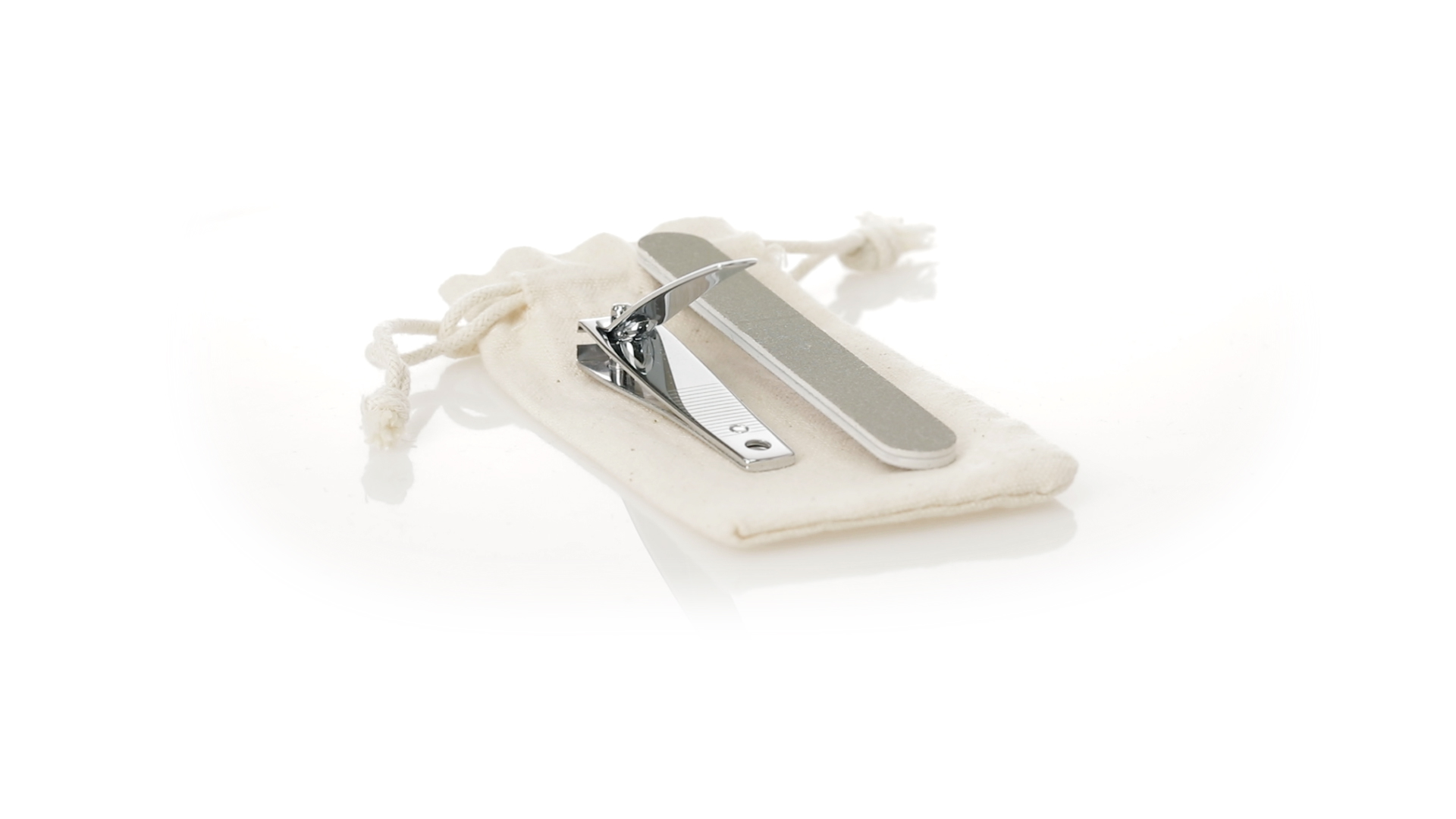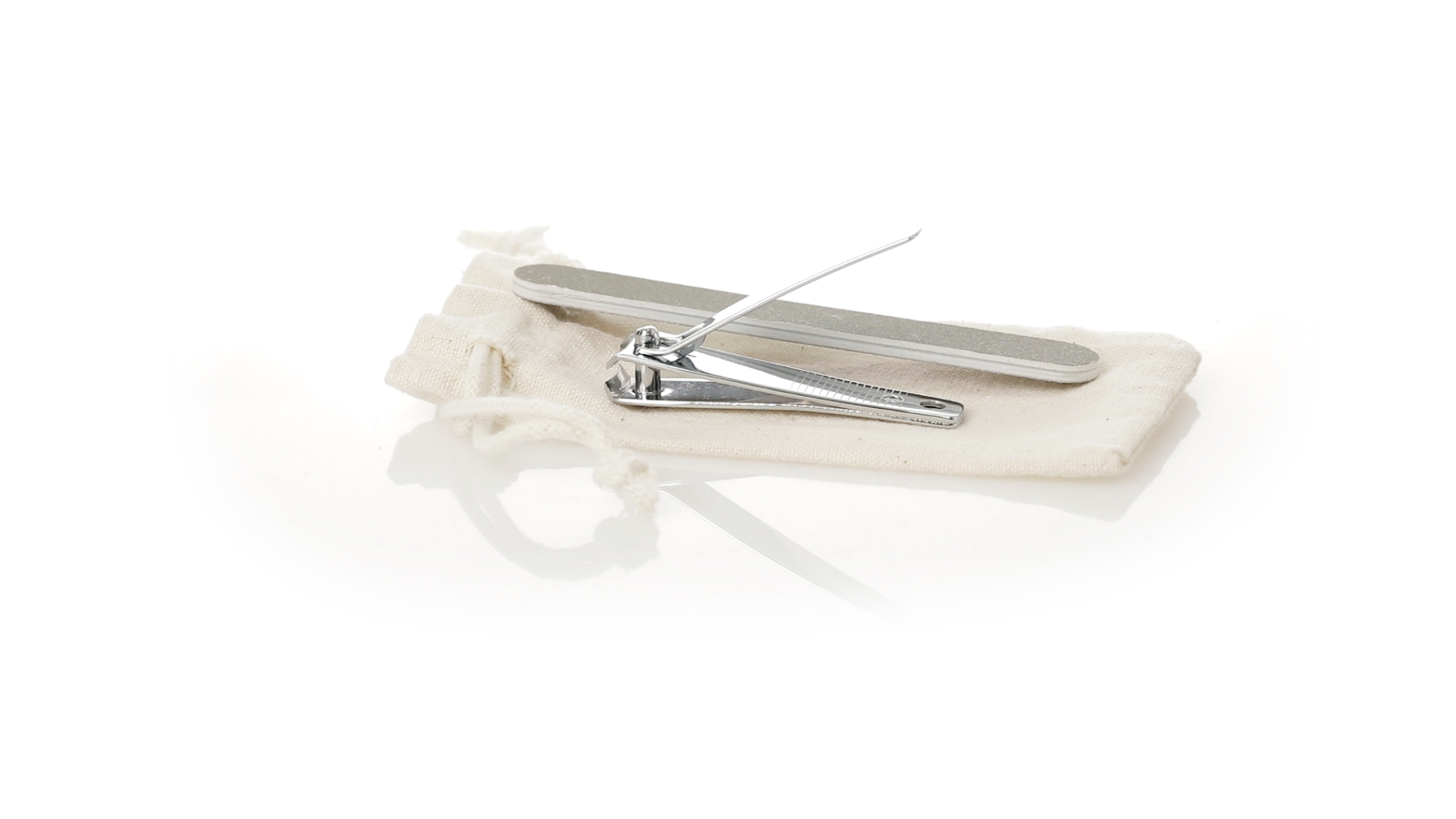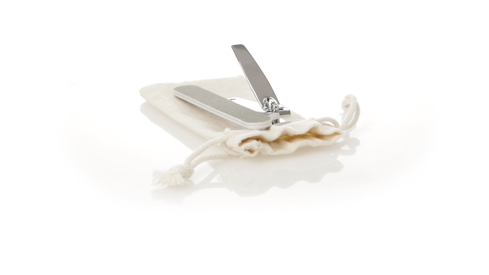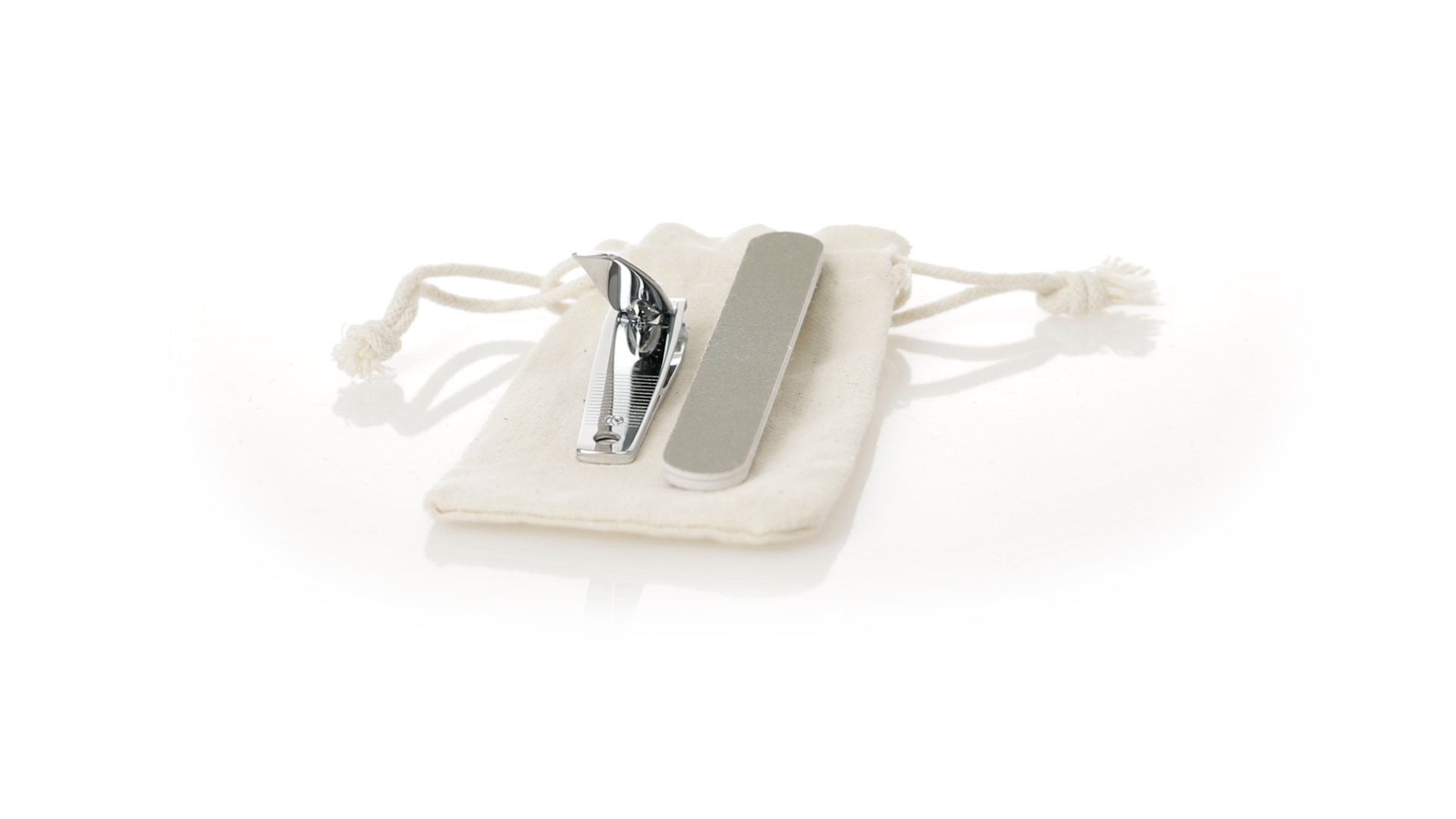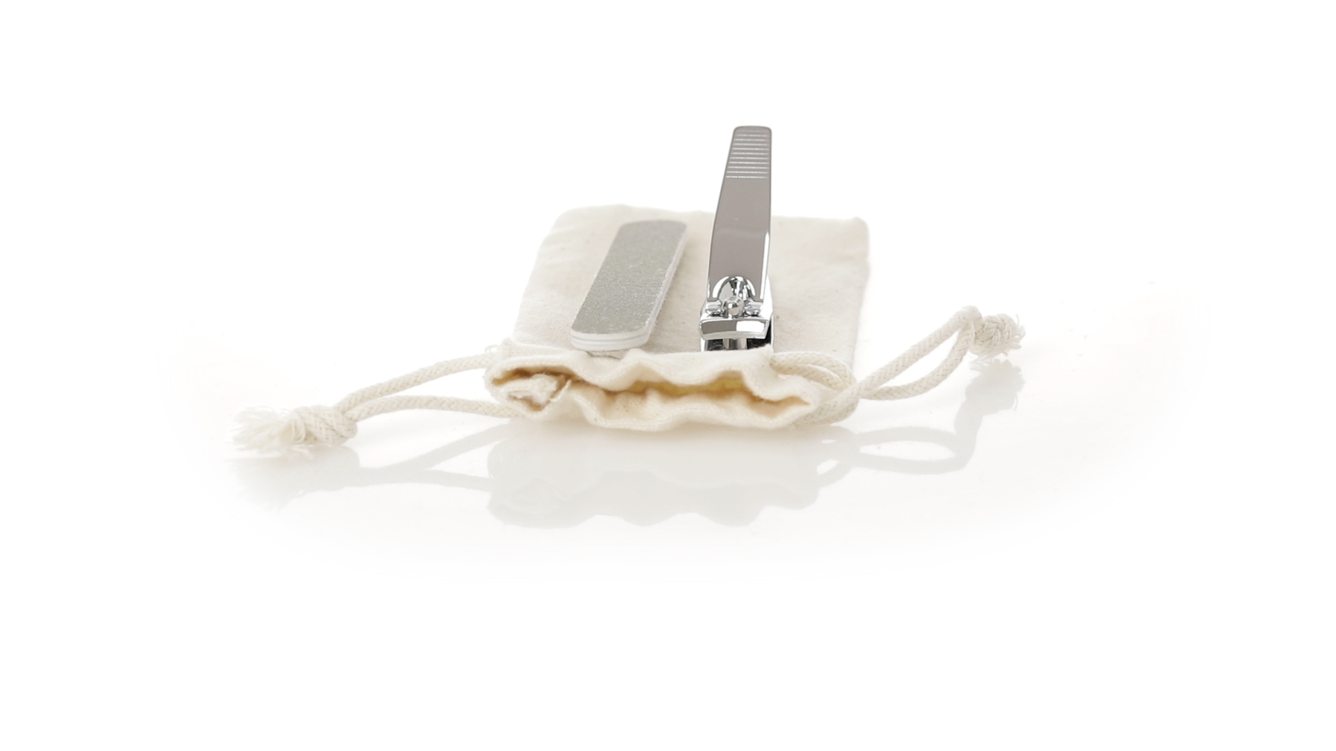Maniküreset mit Nagelfräser und Feile. Präsentiert in individuellem Beutel aus natürlicher Baumwolle mit Schnurverschluss.