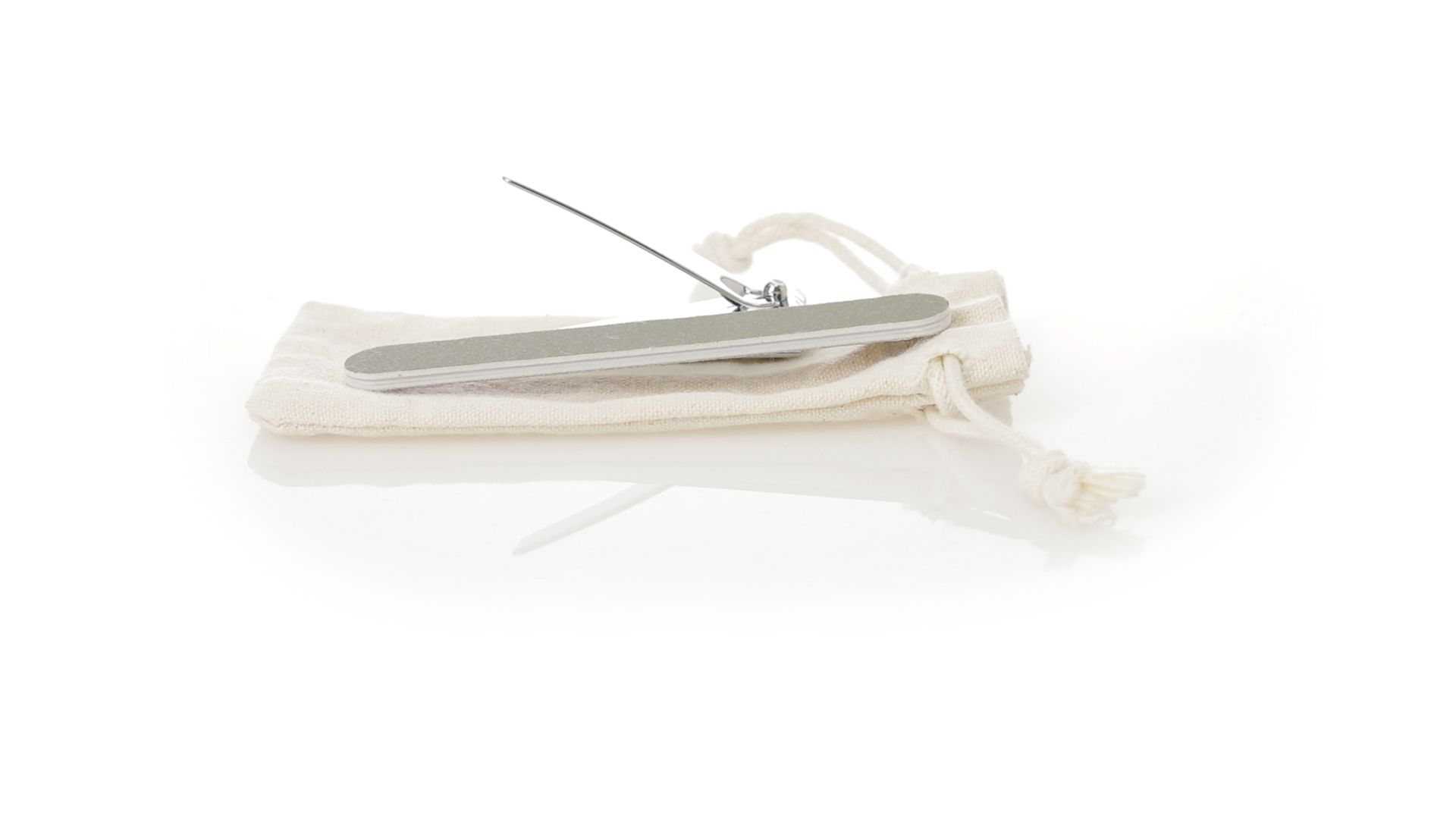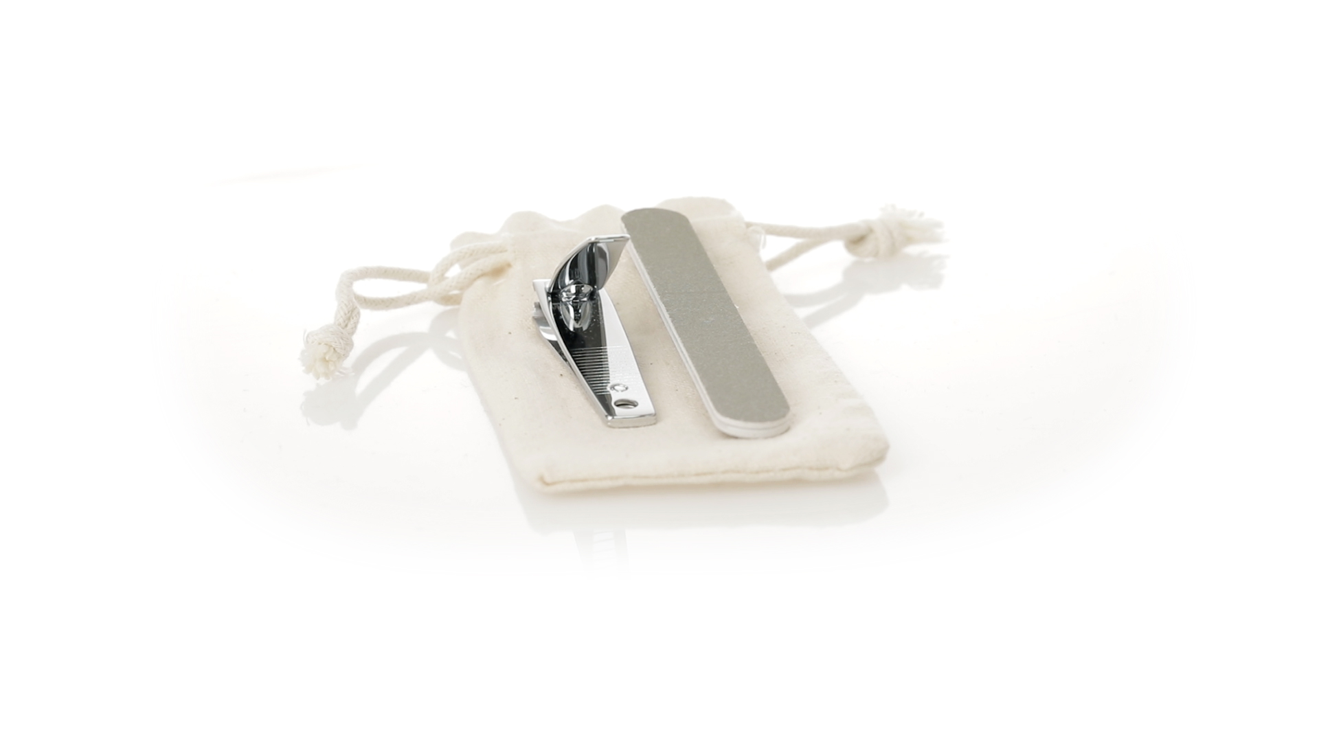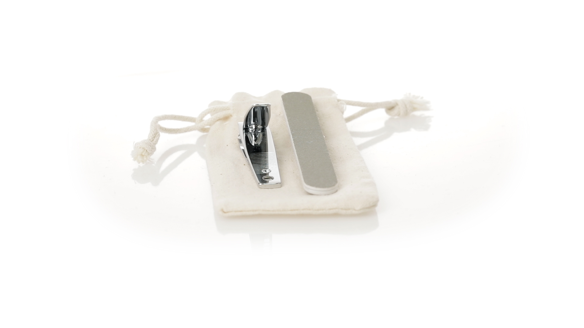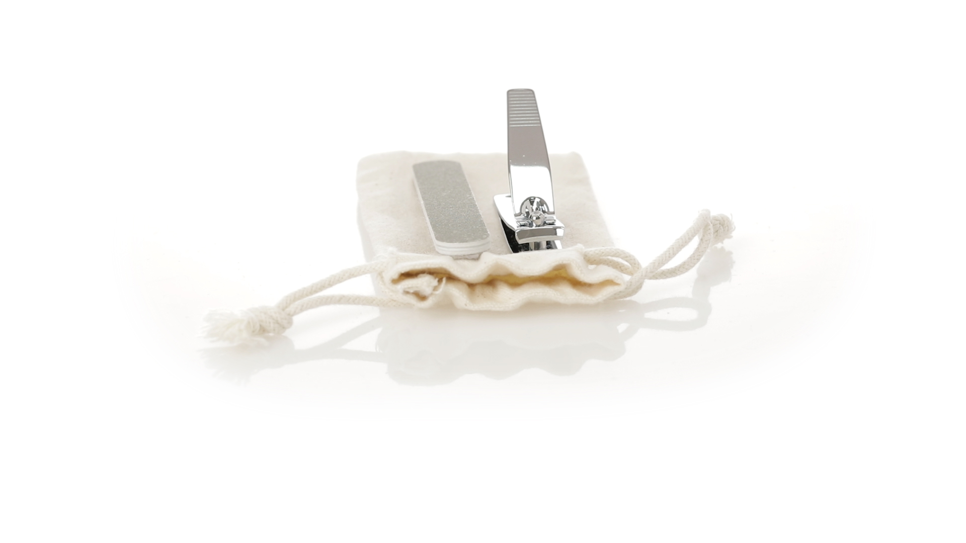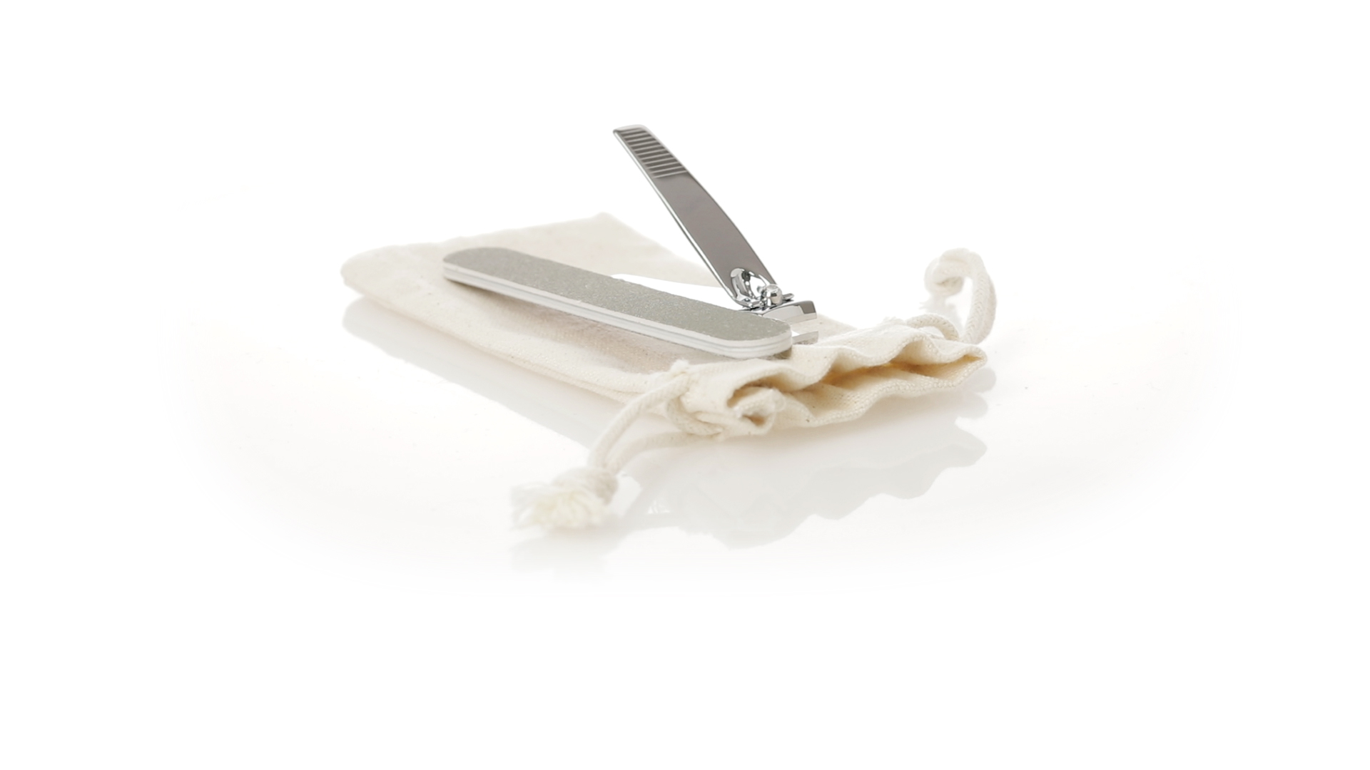 Maniküreset mit Nagelfräser und Feile. Präsentiert in individuellem Beutel aus natürlicher Baumwolle mit Schnurverschluss.