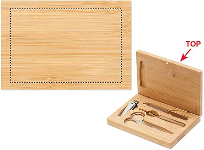 4-teiliges Maniküre-Set im Etui aus Bambus. Magnetverschluss. 4 Instrumente aus Edelstahl: Nagelschere, Nagelknipser, Nagelfeile und Pinzette. Bambus ist ein natürliches Produkt, es kann daher zu leichten Abweichungen in Farbe, Dekor und Massen kommen.
