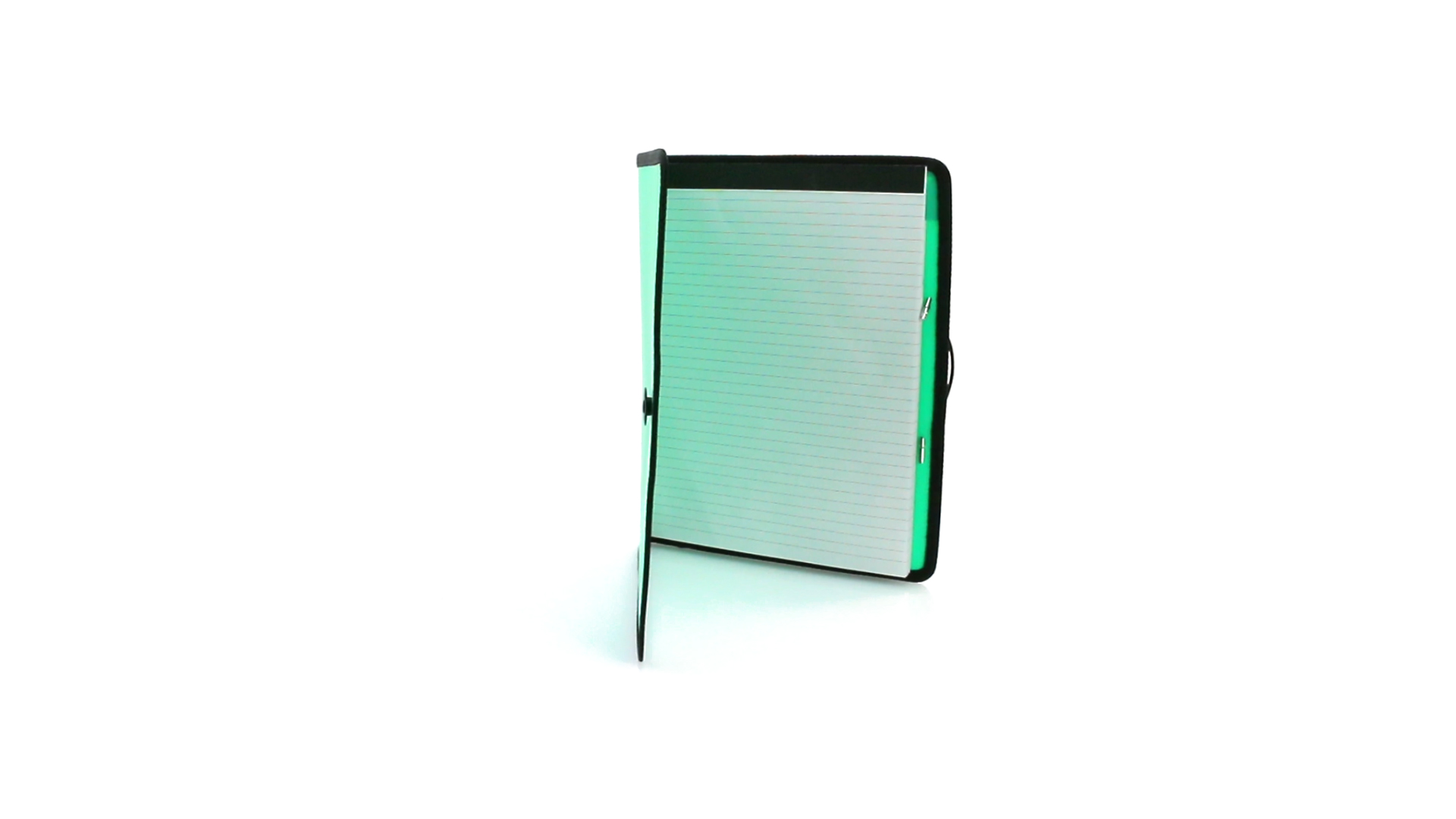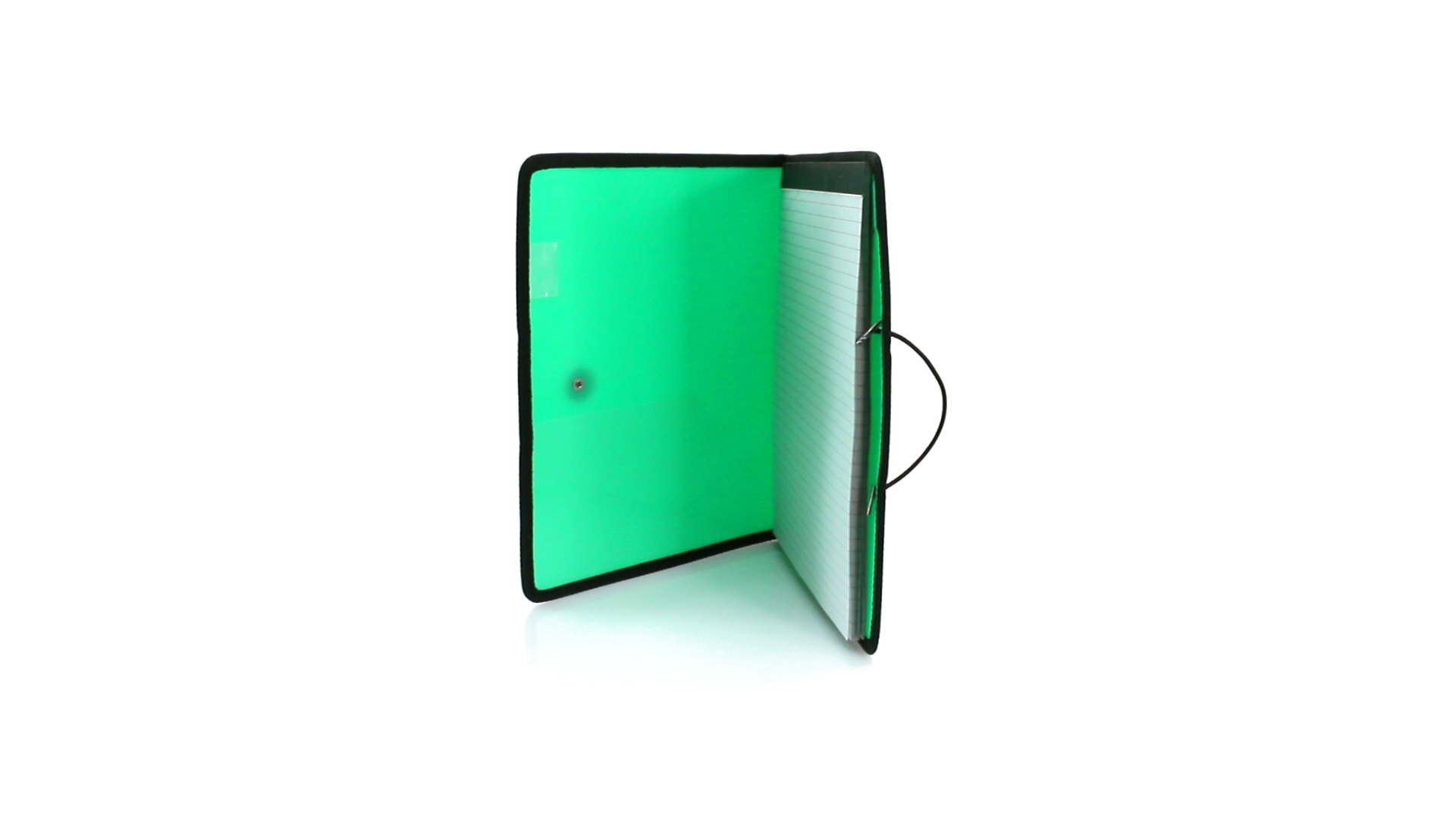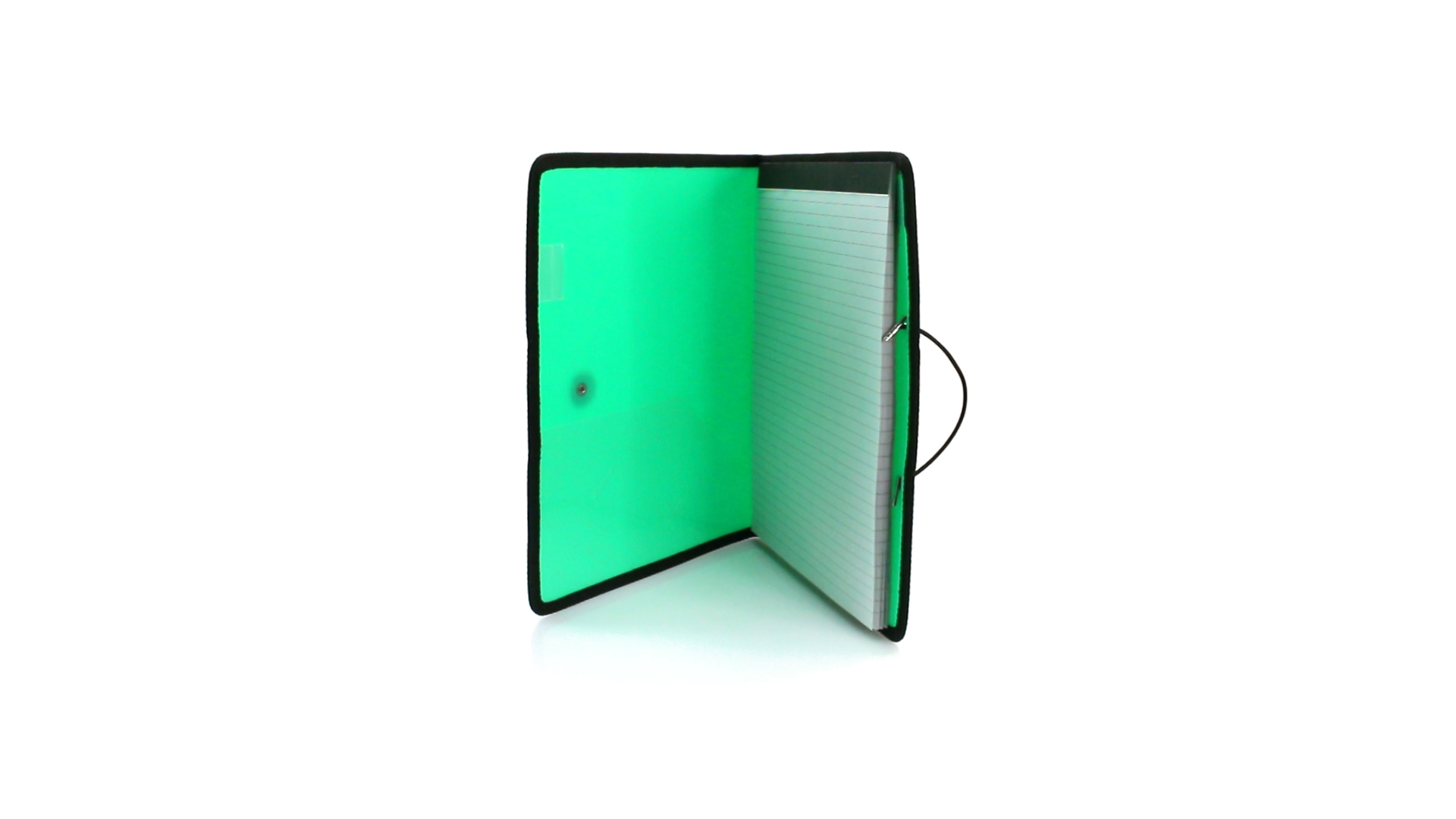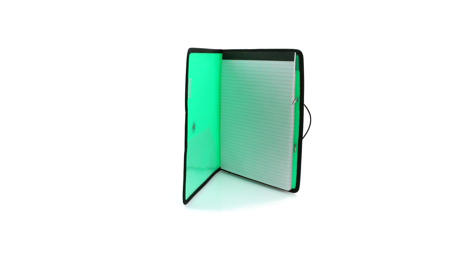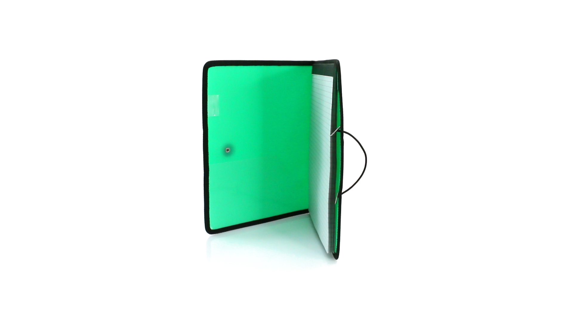 Mappe mit originellem Gummibandverschluss in verschiedenen Farben mit glänzendem Finish und schwarzen verstärkten Rändern. Im Inneren mit abnehmbarem Block mit 30 Blättern, transparentem Fach mit Klappe sowie Kartenfächern und Stifthalter.