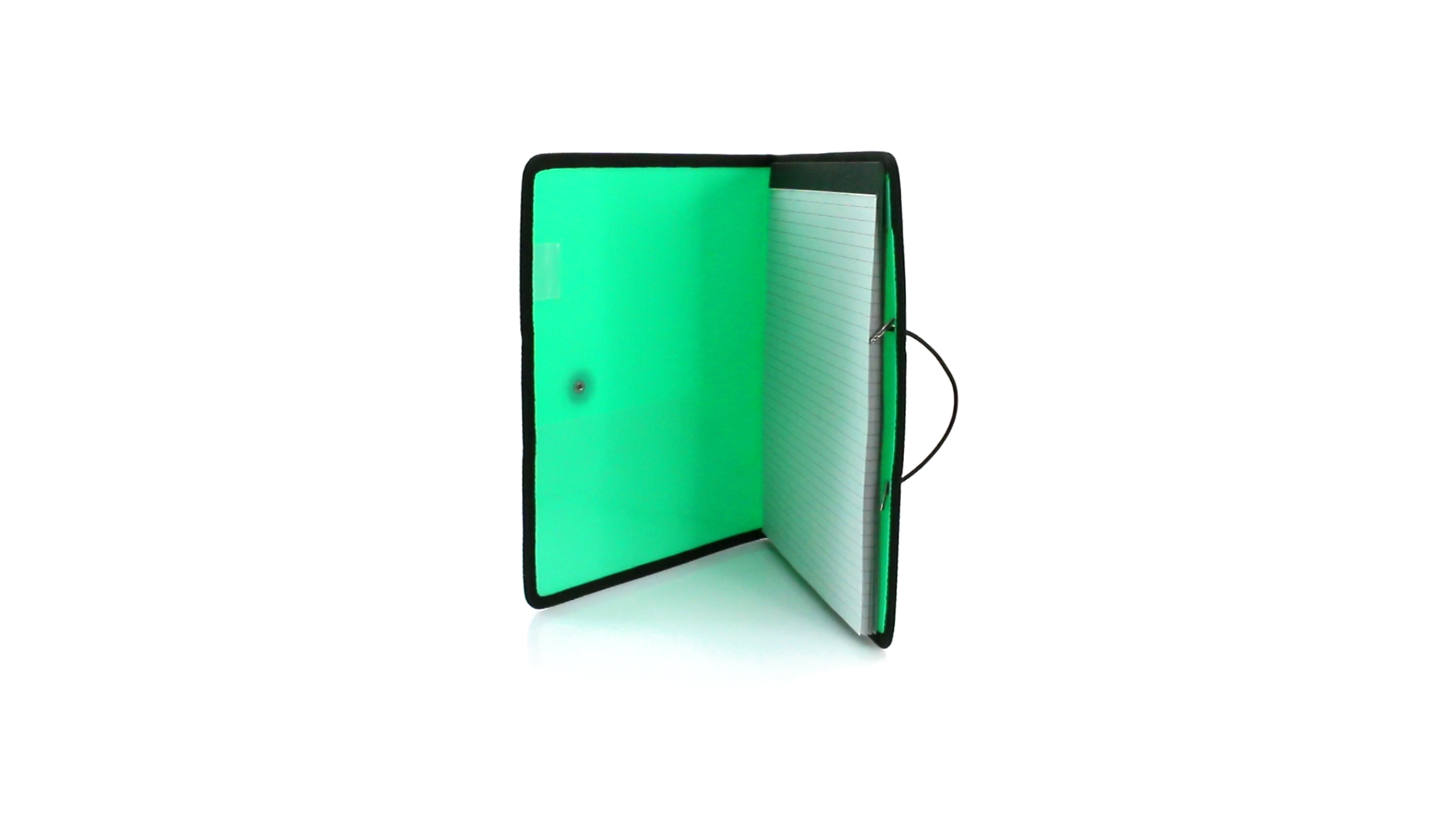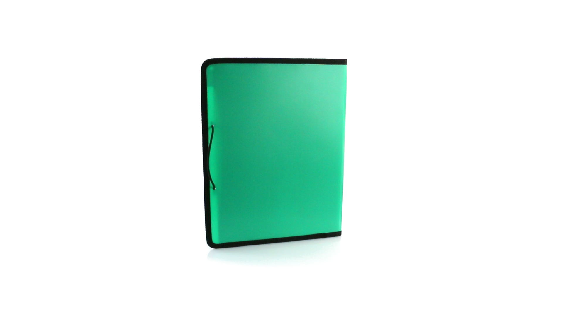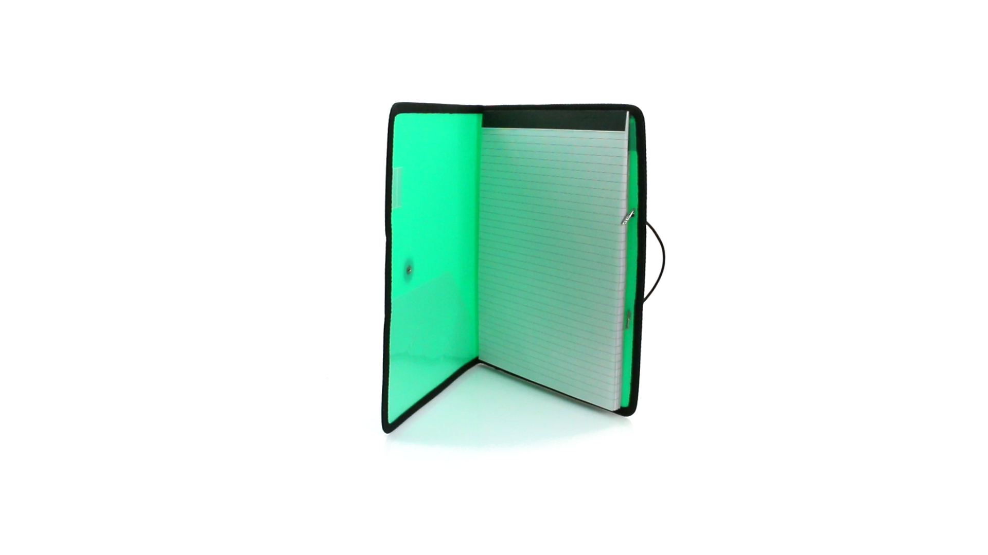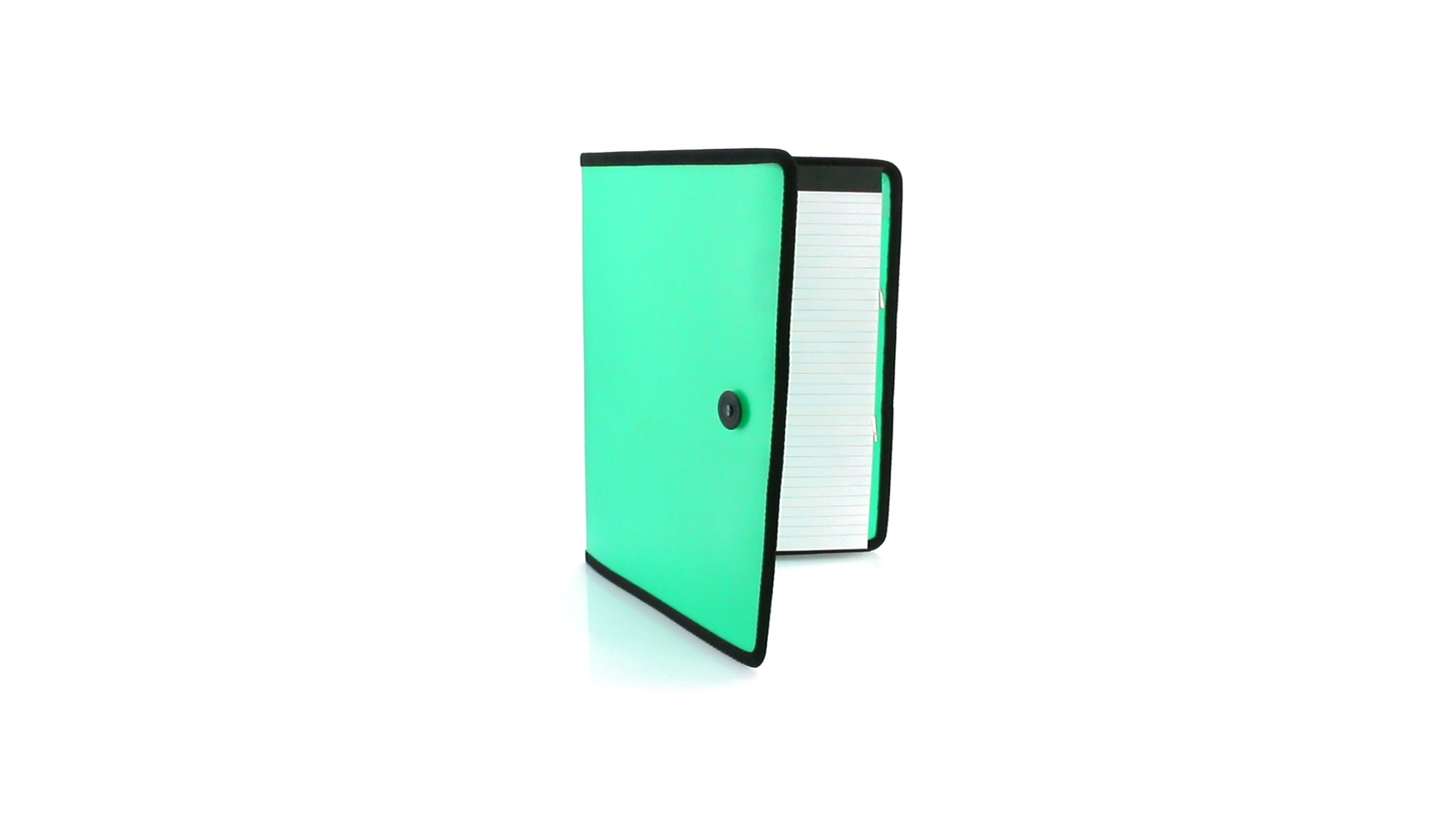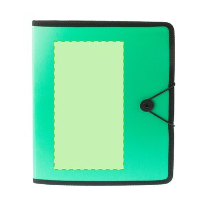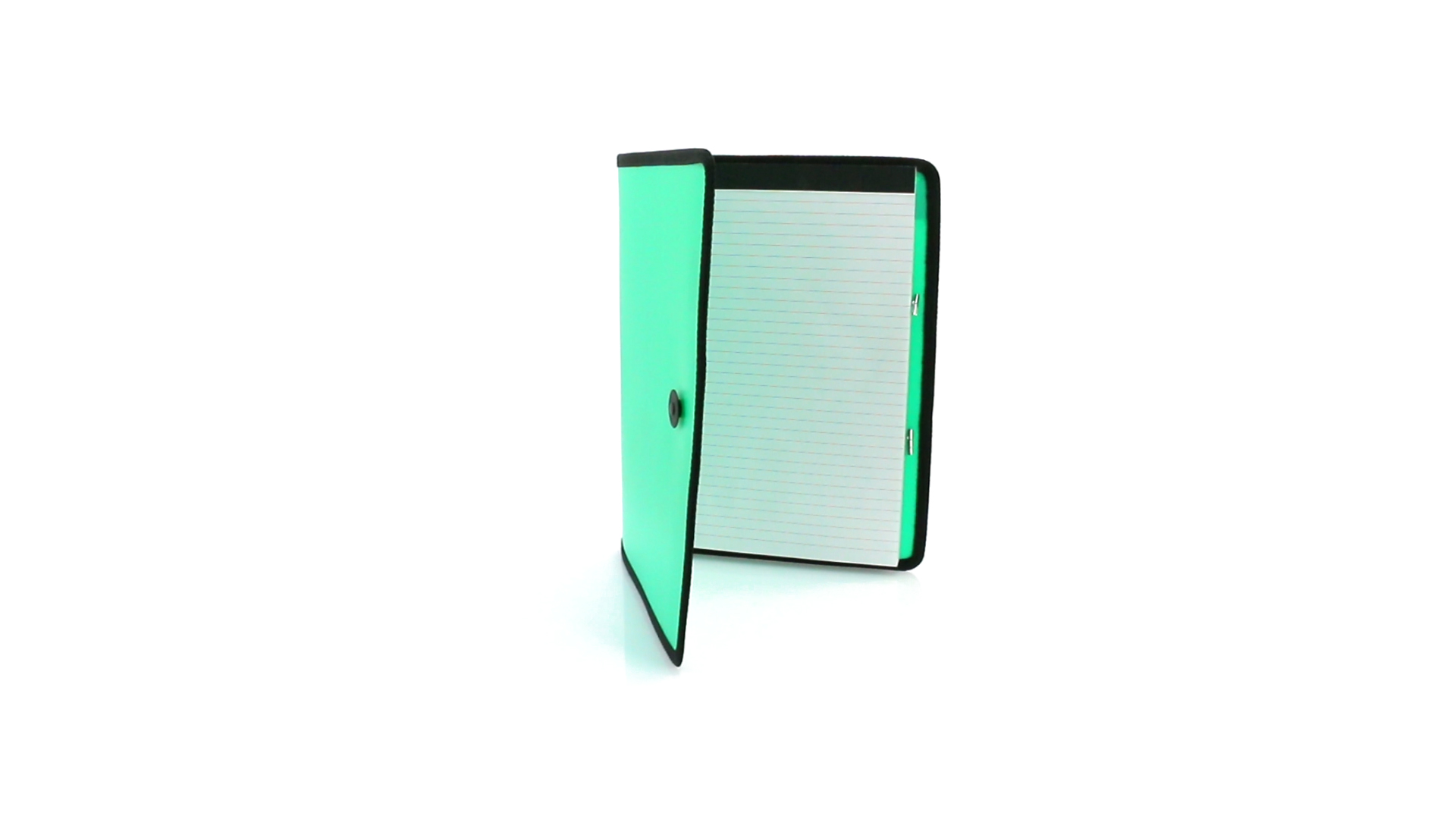 Mappe mit originellem Gummibandverschluss in verschiedenen Farben mit glänzendem Finish und schwarzen verstärkten Rändern. Im Inneren mit abnehmbarem Block mit 30 Blättern, transparentem Fach mit Klappe sowie Kartenfächern und Stifthalter.