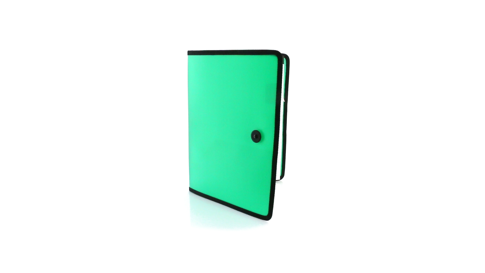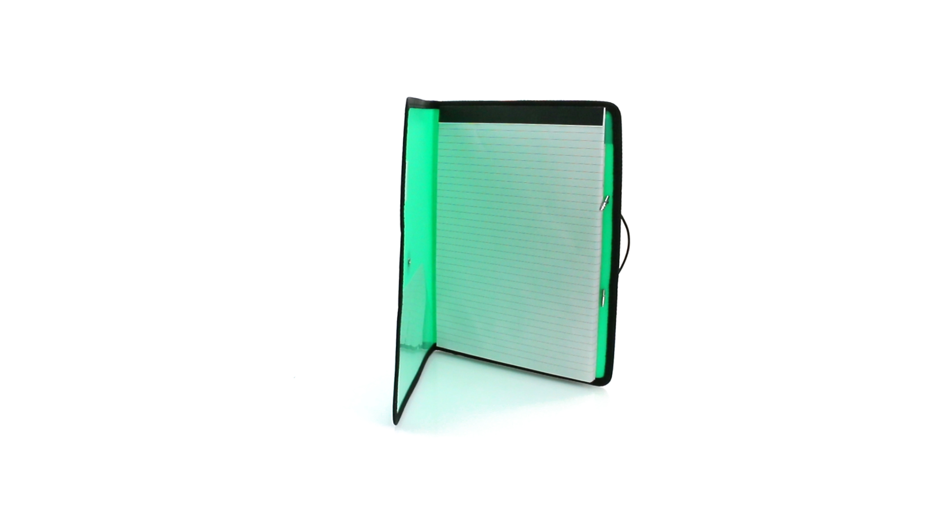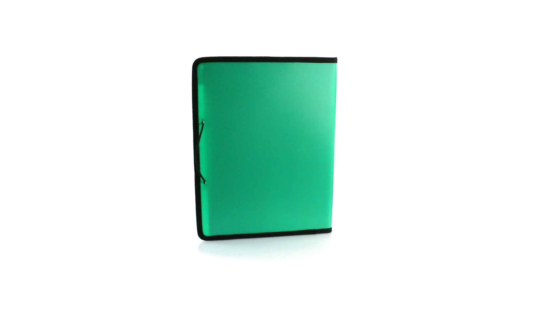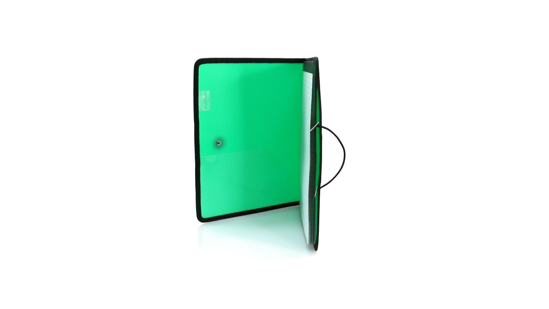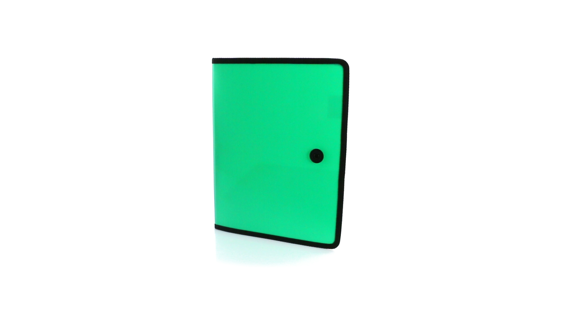 Mappe mit originellem Gummibandverschluss in verschiedenen Farben mit glänzendem Finish und schwarzen verstärkten Rändern. Im Inneren mit abnehmbarem Block mit 30 Blättern, transparentem Fach mit Klappe sowie Kartenfächern und Stifthalter.