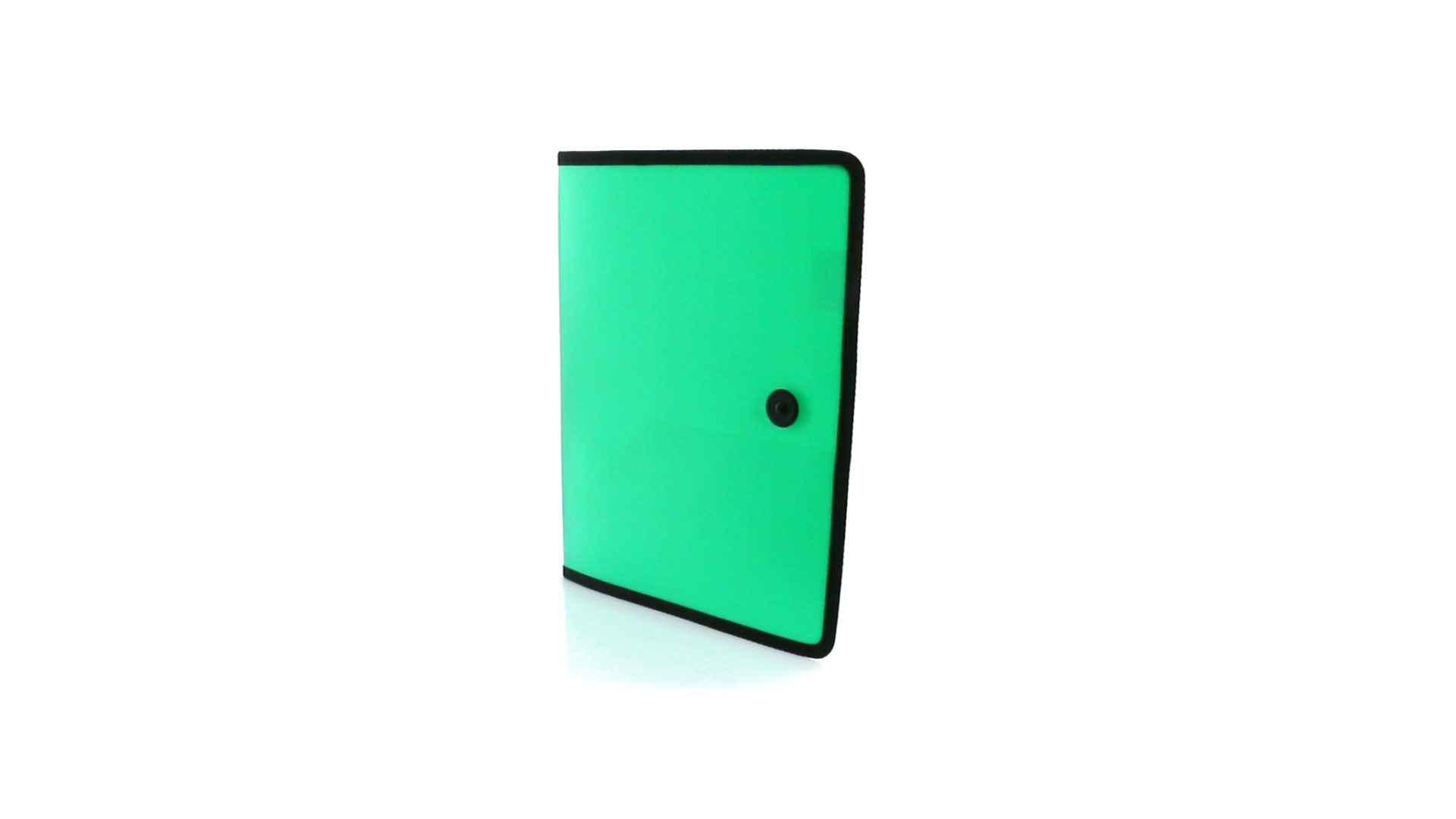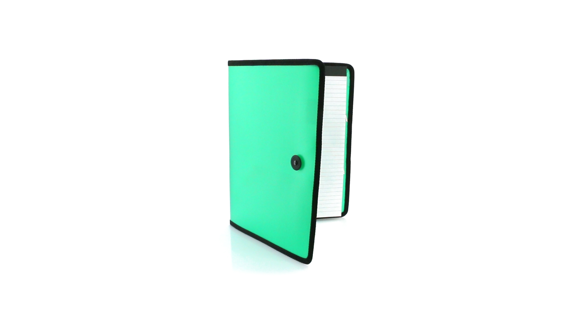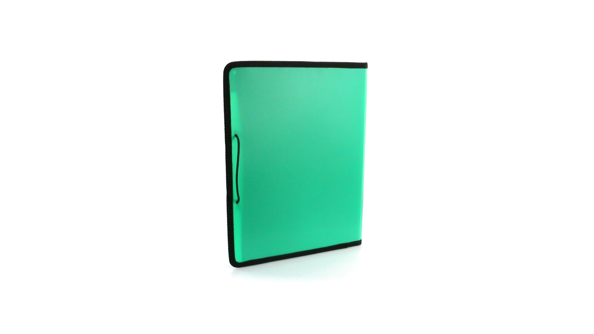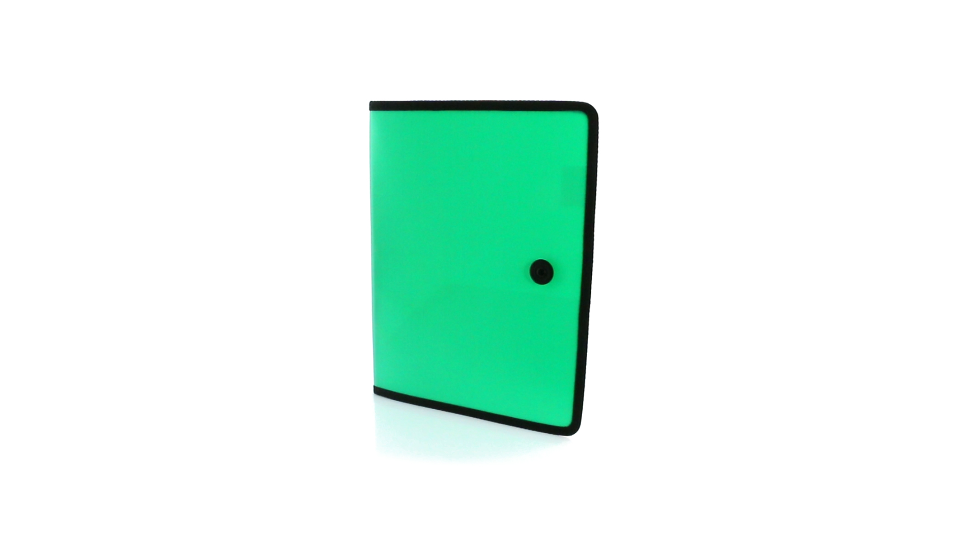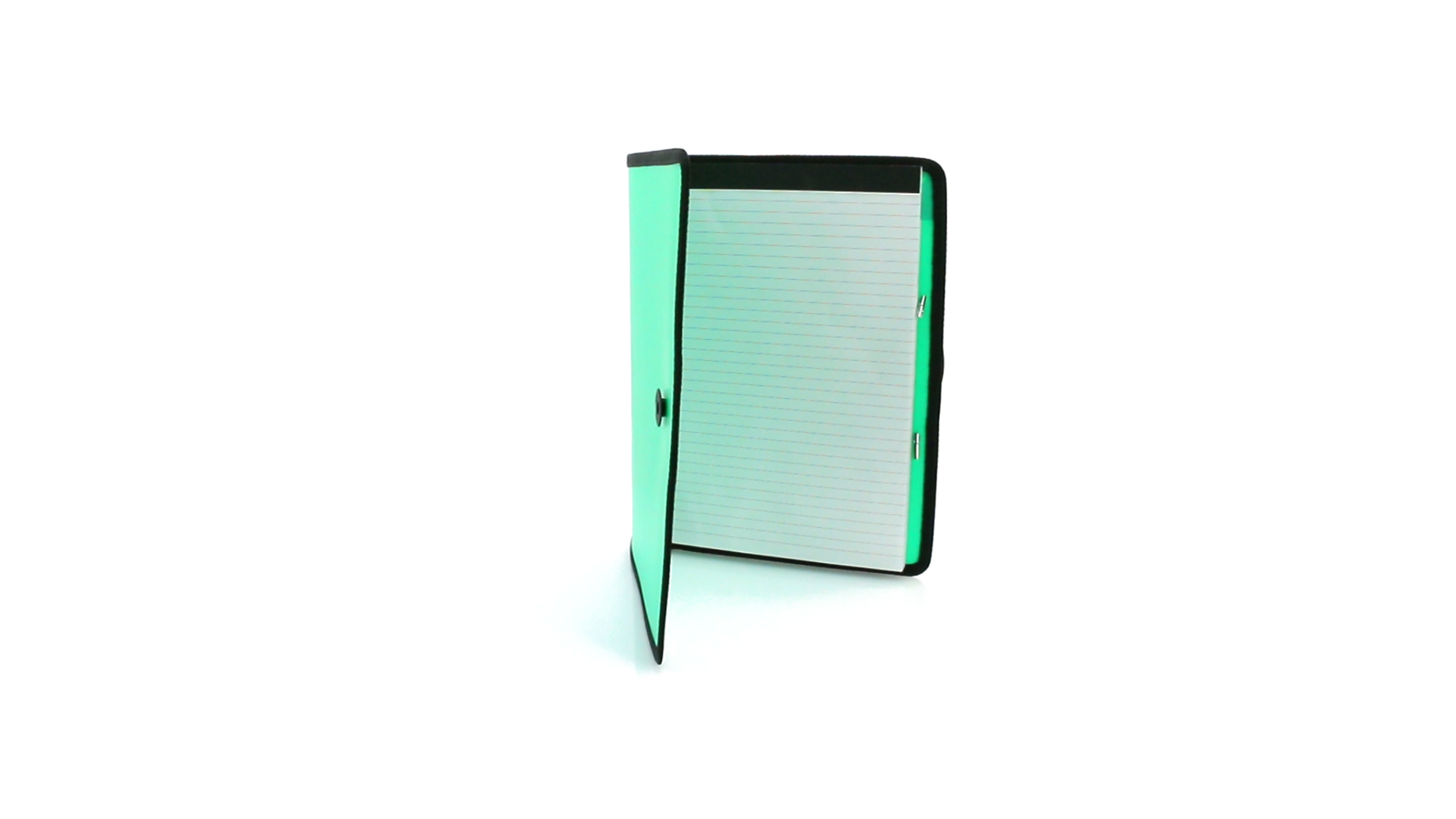Mappe mit originellem Gummibandverschluss in verschiedenen Farben mit glänzendem Finish und schwarzen verstärkten Rändern. Im Inneren mit abnehmbarem Block mit 30 Blättern, transparentem Fach mit Klappe sowie Kartenfächern und Stifthalter.