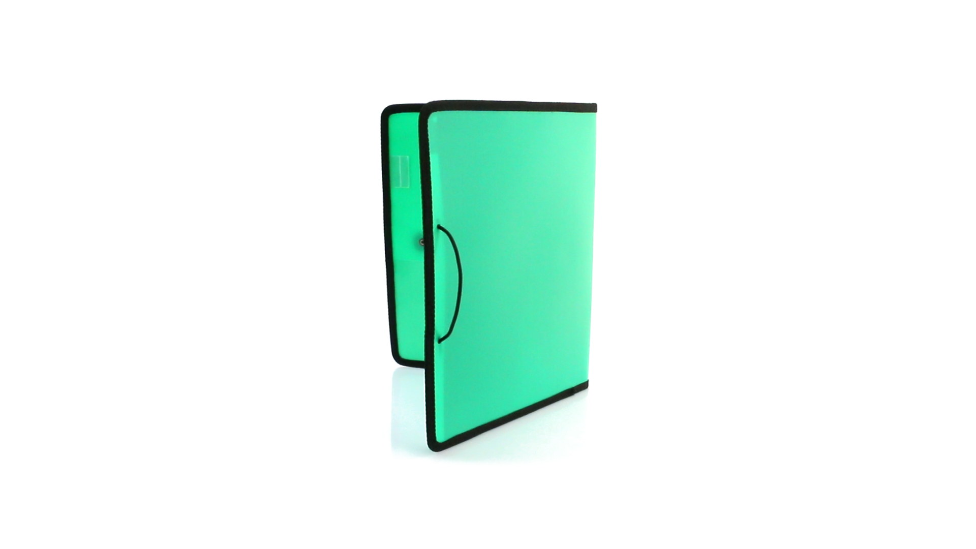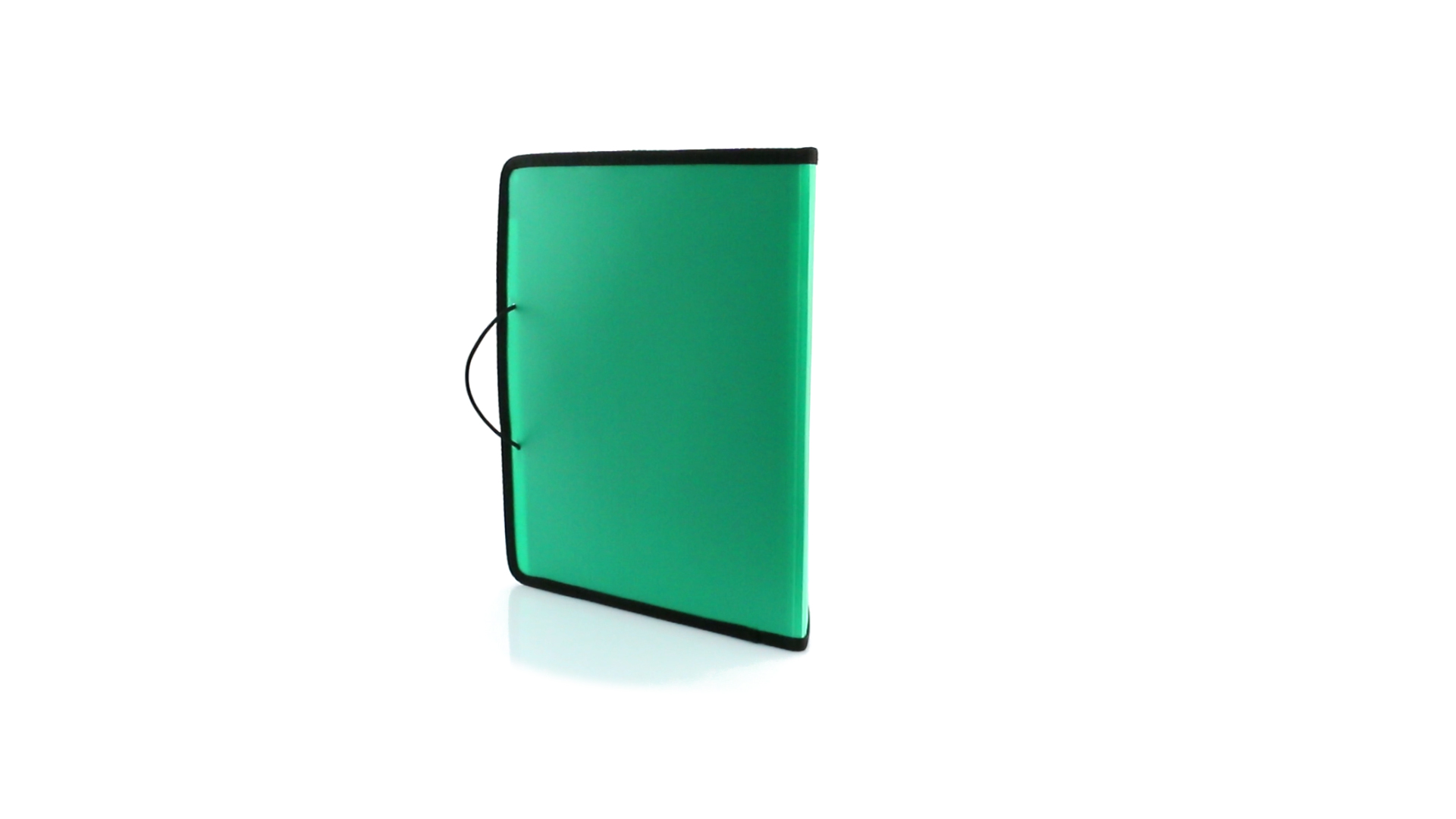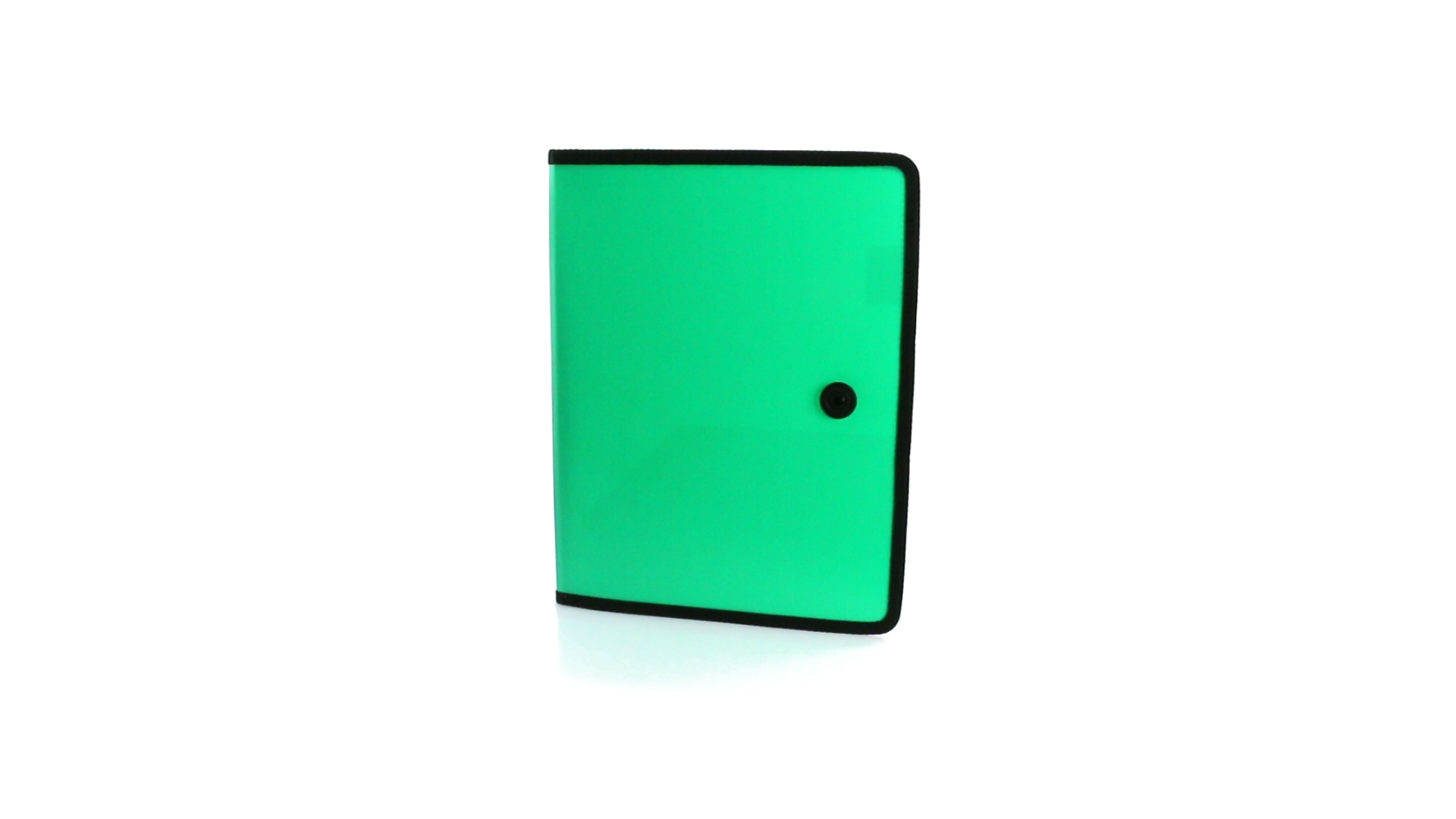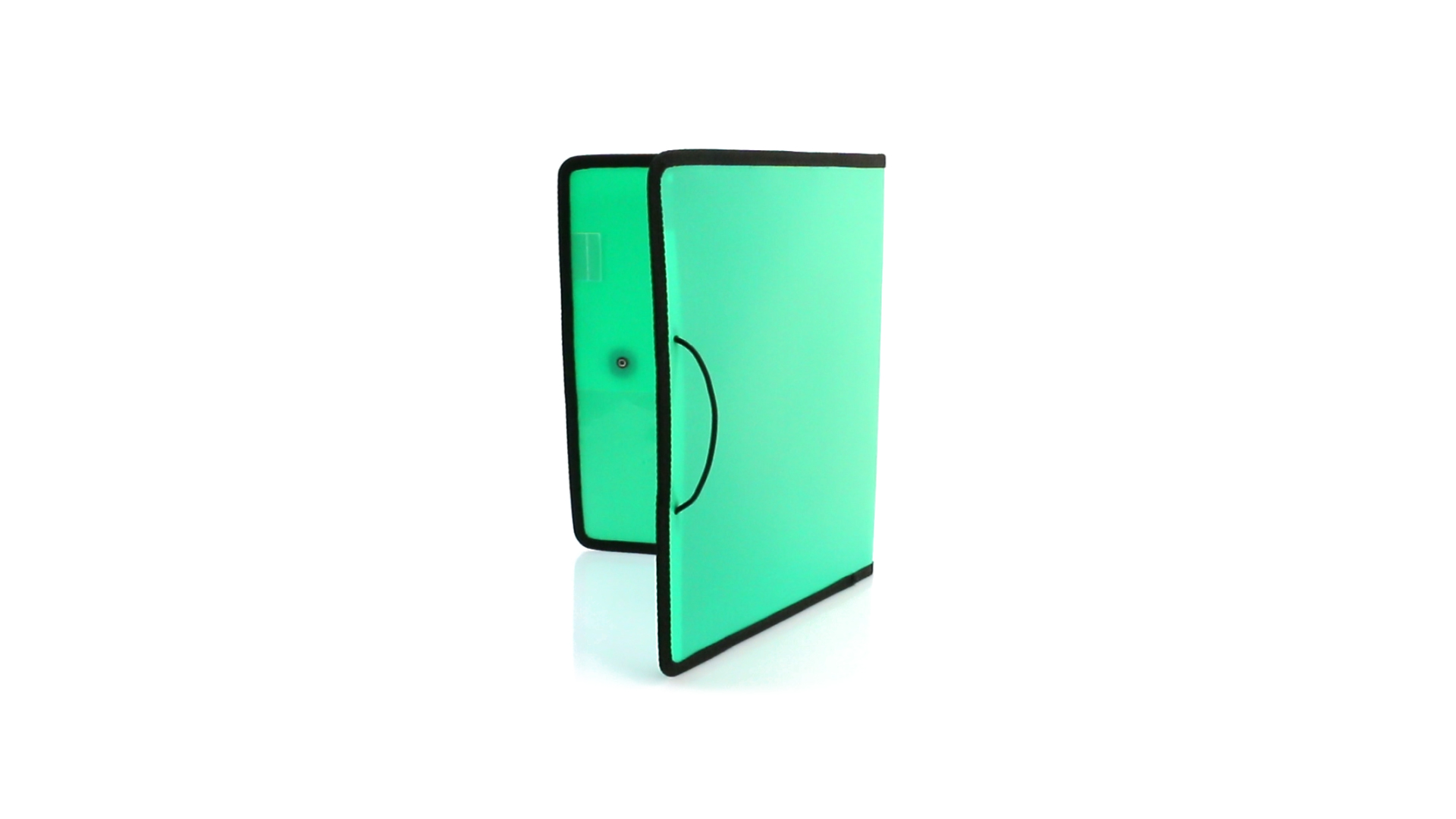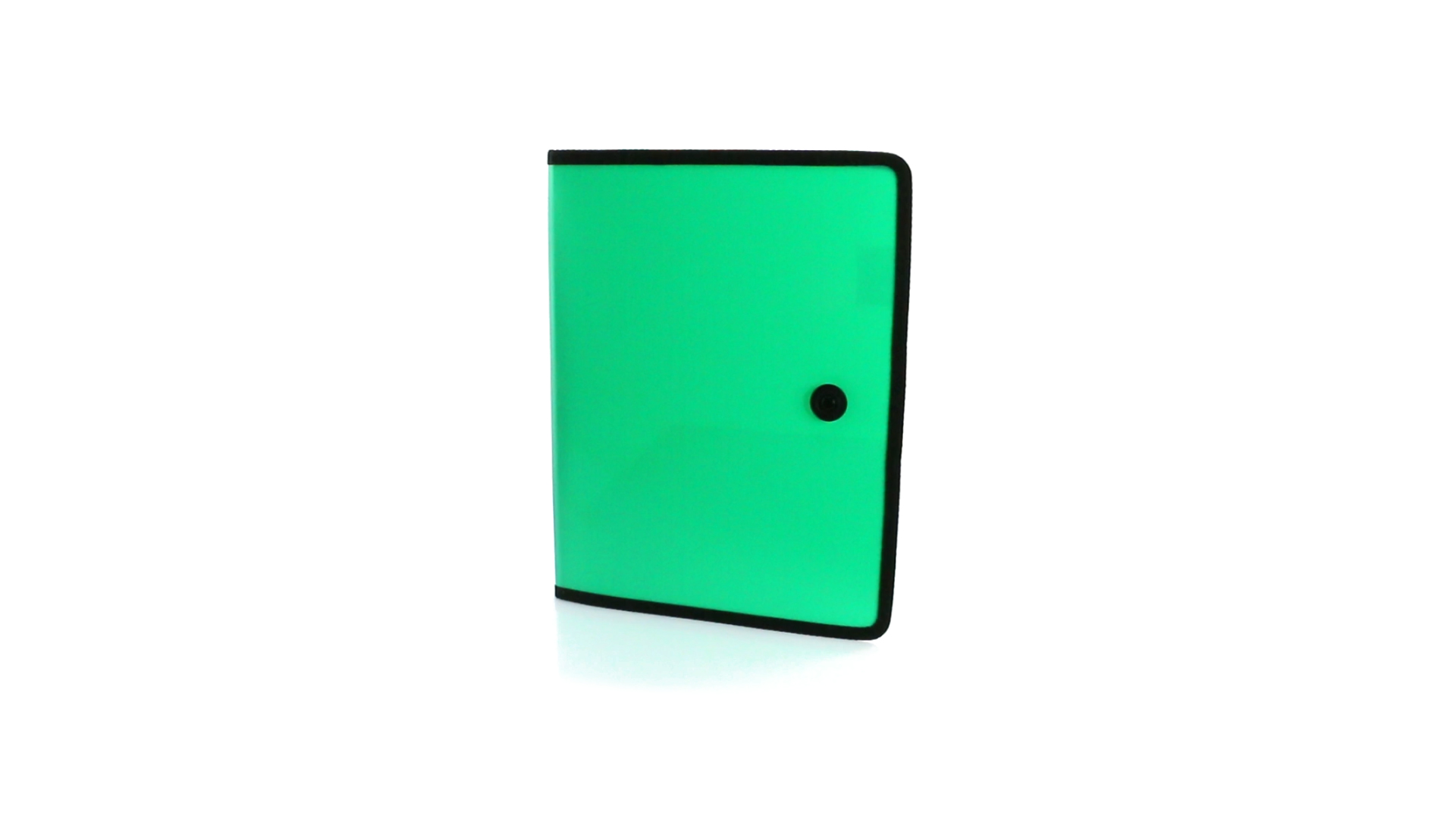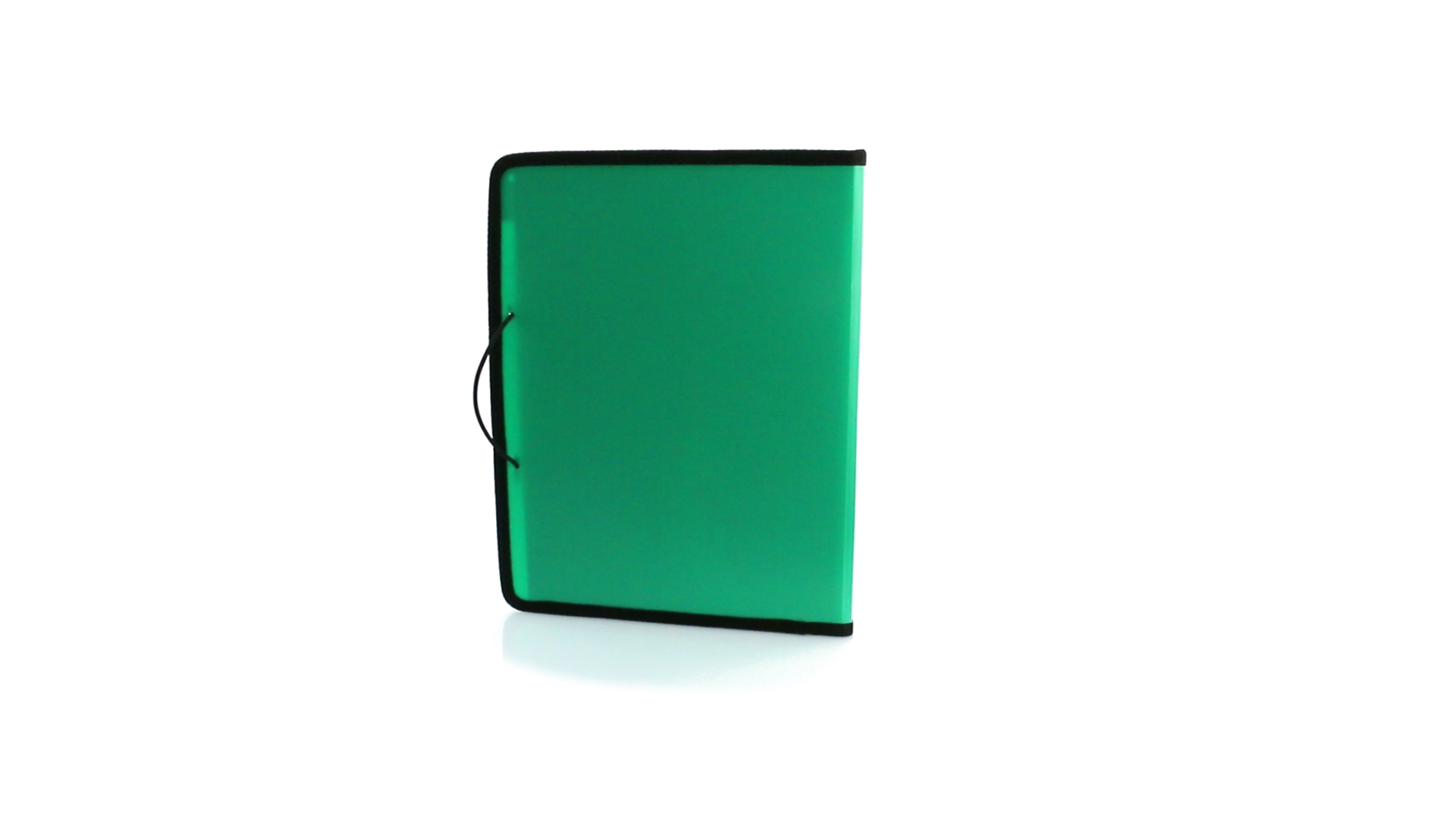 Mappe mit originellem Gummibandverschluss in verschiedenen Farben mit glänzendem Finish und schwarzen verstärkten Rändern. Im Inneren mit abnehmbarem Block mit 30 Blättern, transparentem Fach mit Klappe sowie Kartenfächern und Stifthalter.