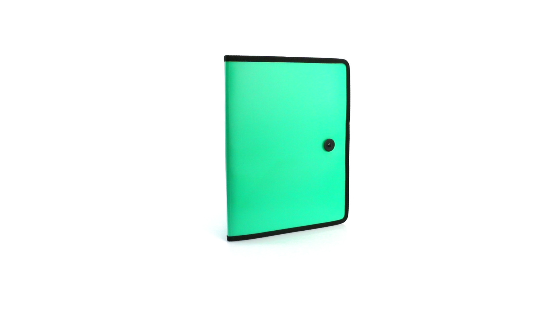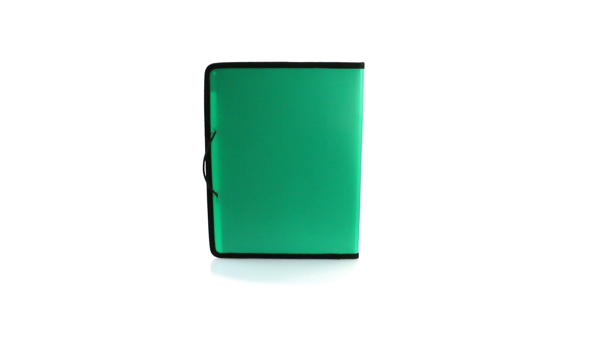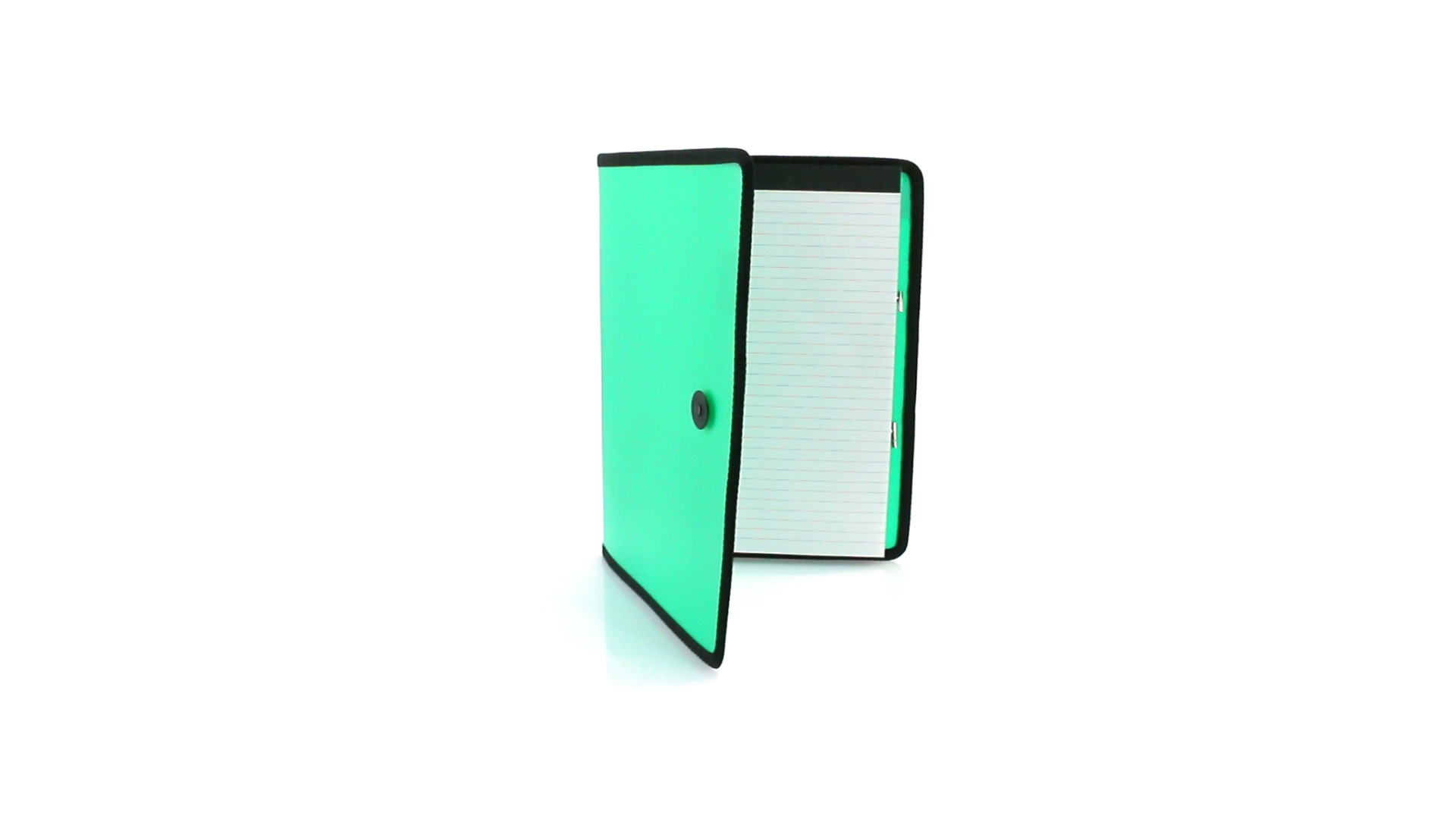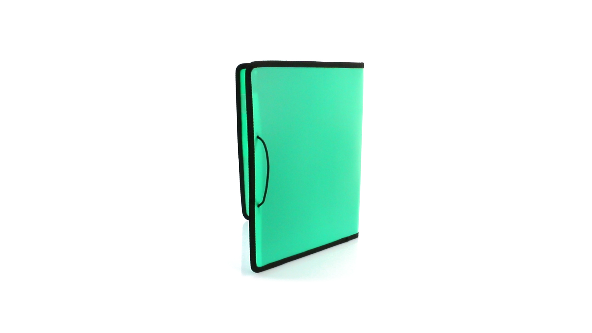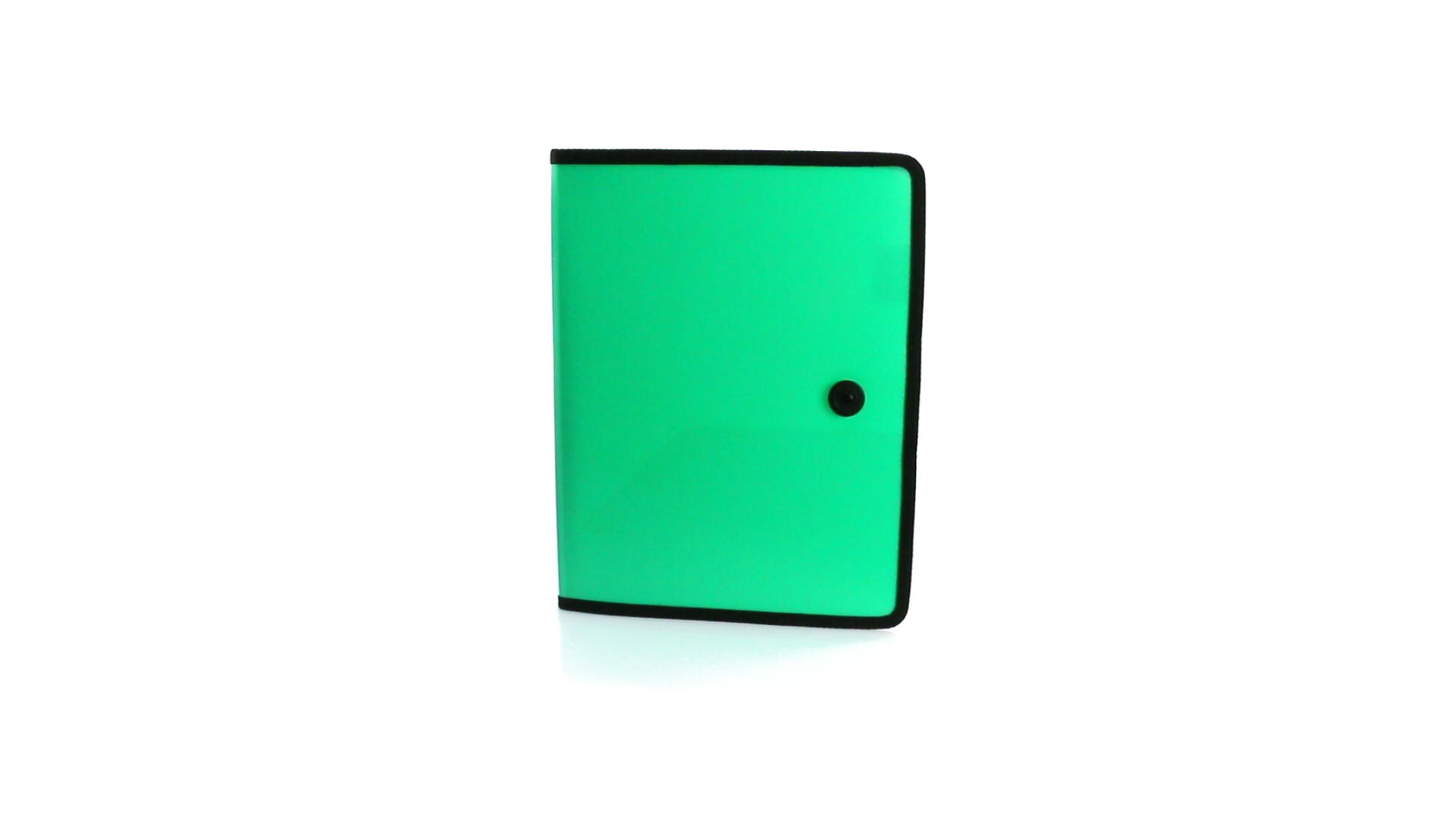 Mappe mit originellem Gummibandverschluss in verschiedenen Farben mit glänzendem Finish und schwarzen verstärkten Rändern. Im Inneren mit abnehmbarem Block mit 30 Blättern, transparentem Fach mit Klappe sowie Kartenfächern und Stifthalter.