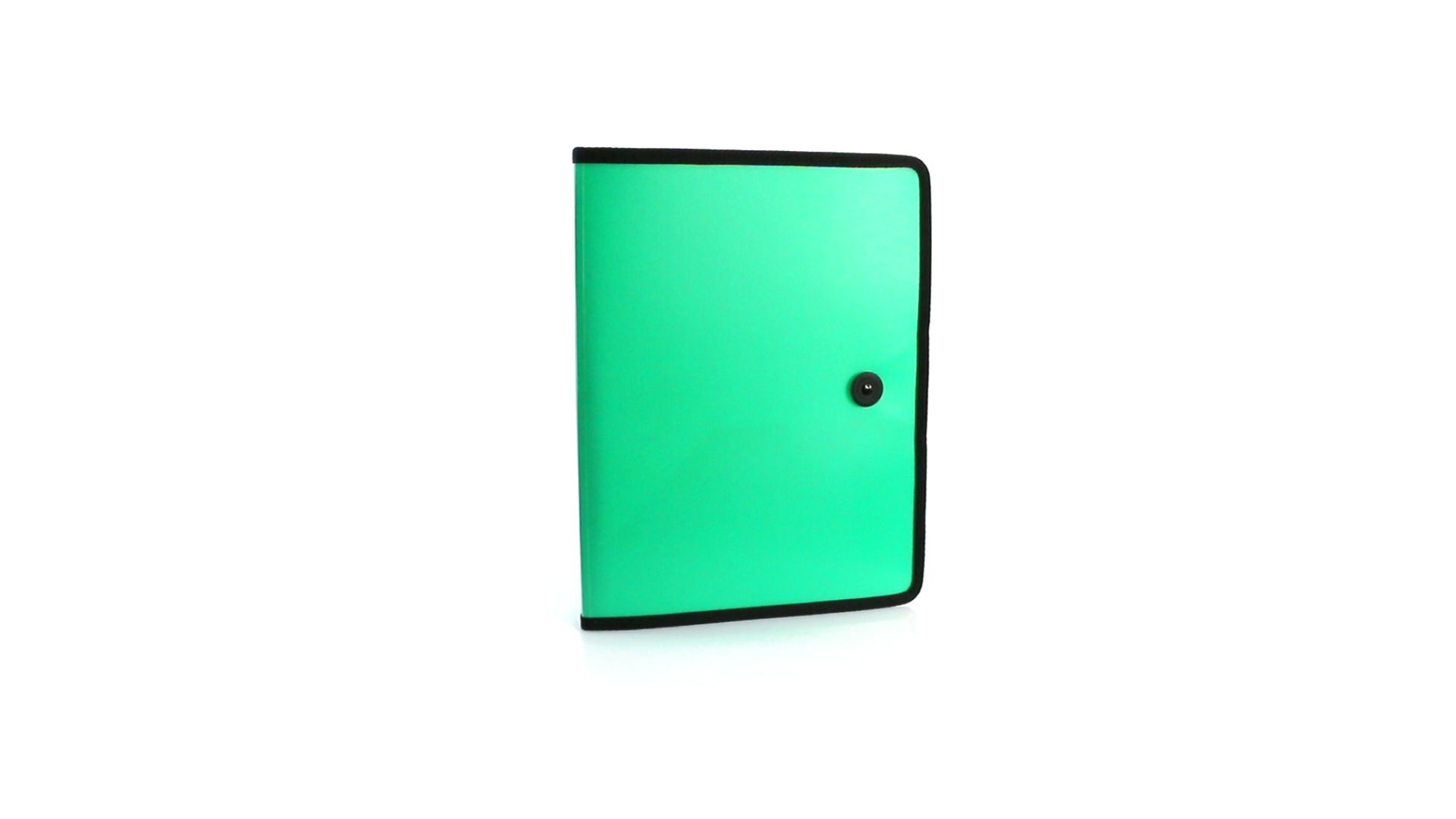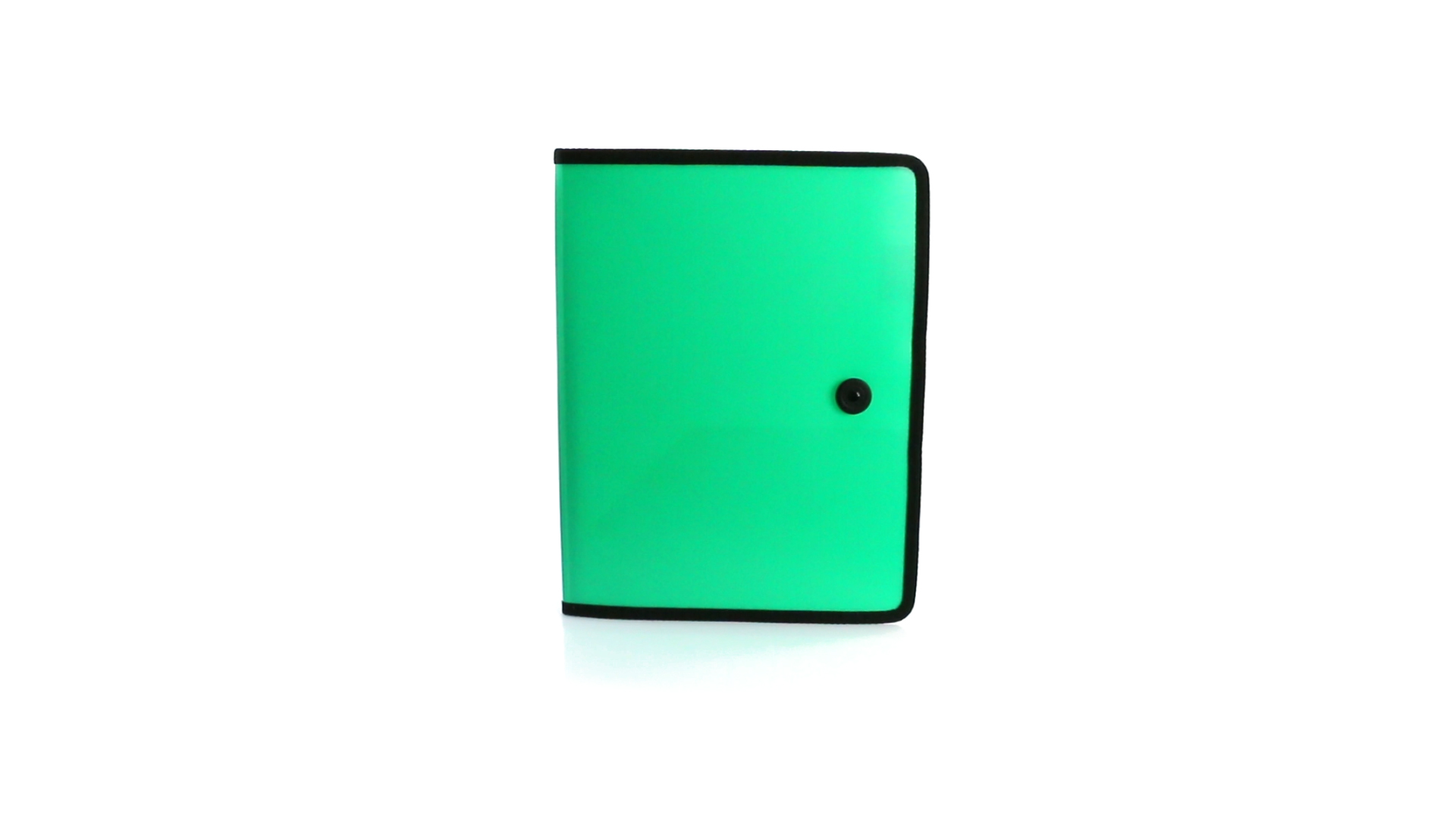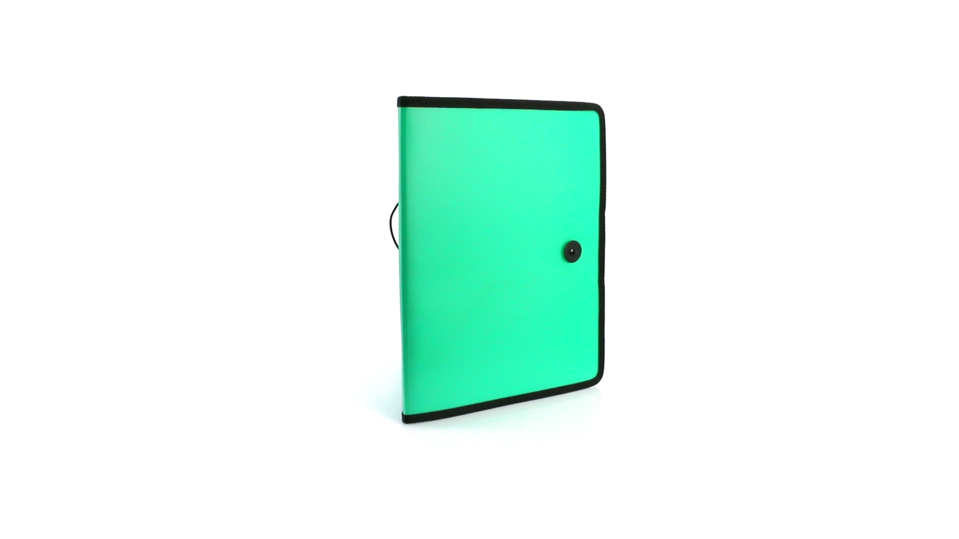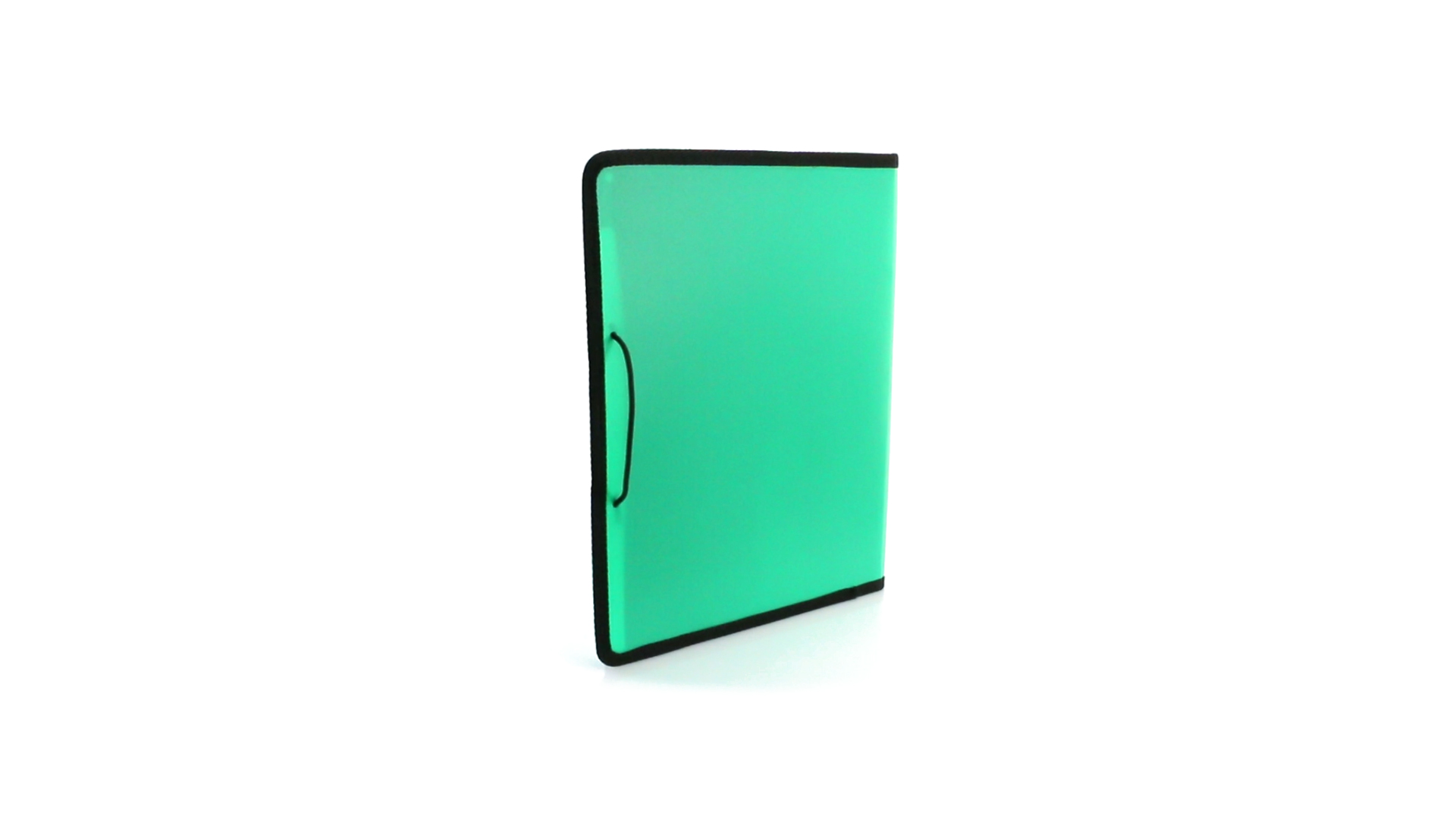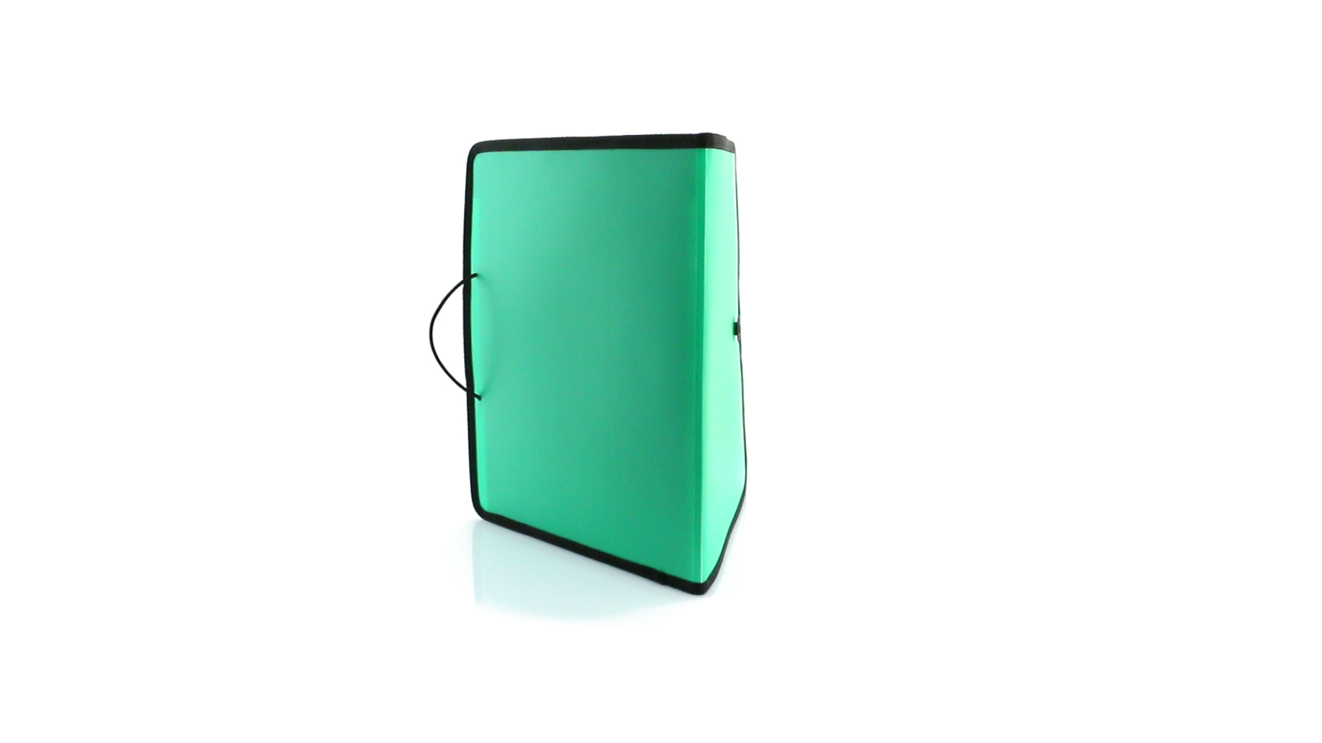 Mappe mit originellem Gummibandverschluss in verschiedenen Farben mit glänzendem Finish und schwarzen verstärkten Rändern. Im Inneren mit abnehmbarem Block mit 30 Blättern, transparentem Fach mit Klappe sowie Kartenfächern und Stifthalter.