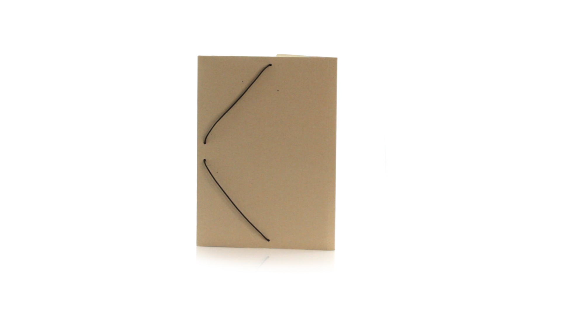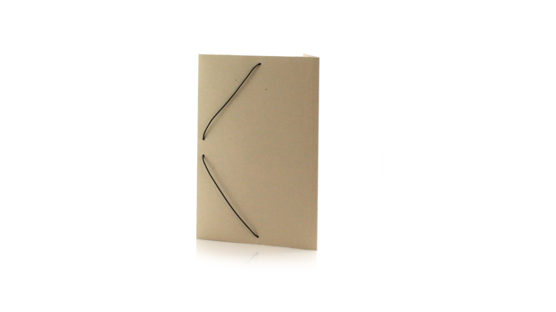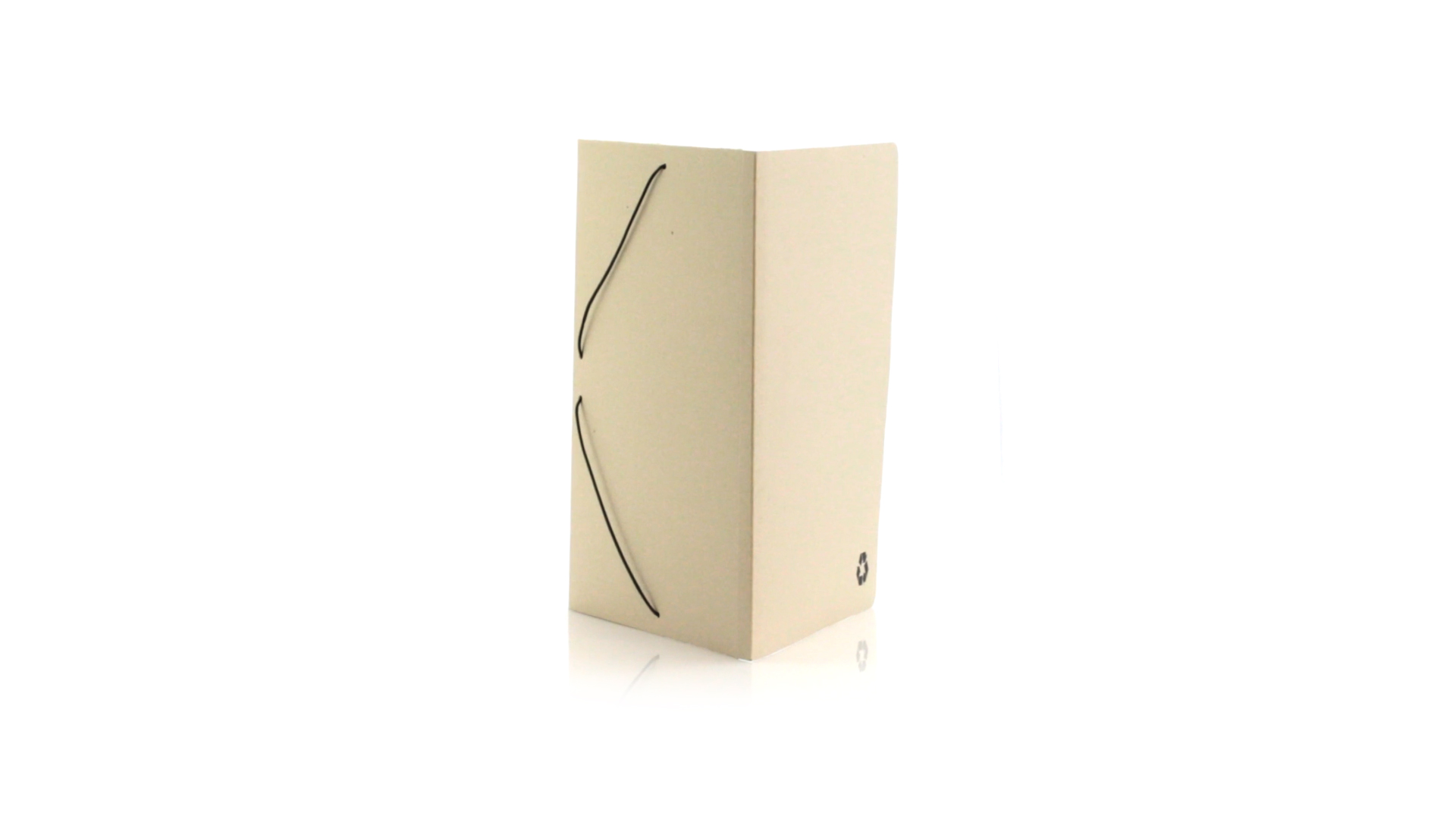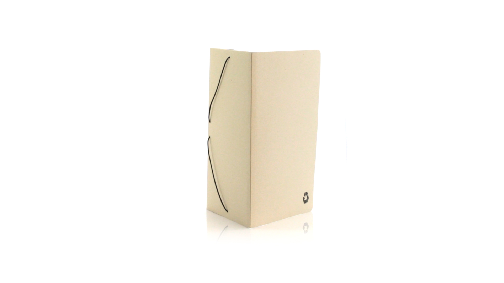 Ökologische Einschlagmappe aus Recyclingkarton mit grosser Kapazität, Gummieckspannern und drei Einschlagklappen.