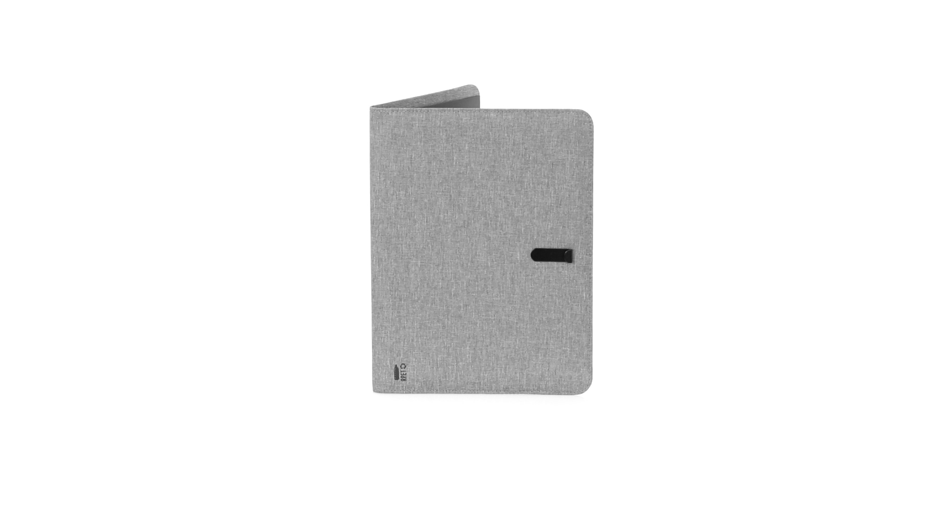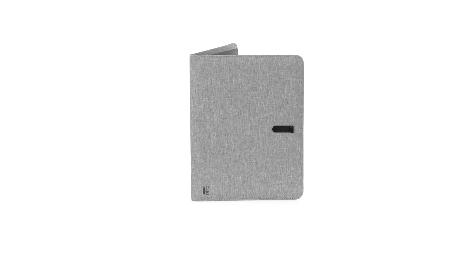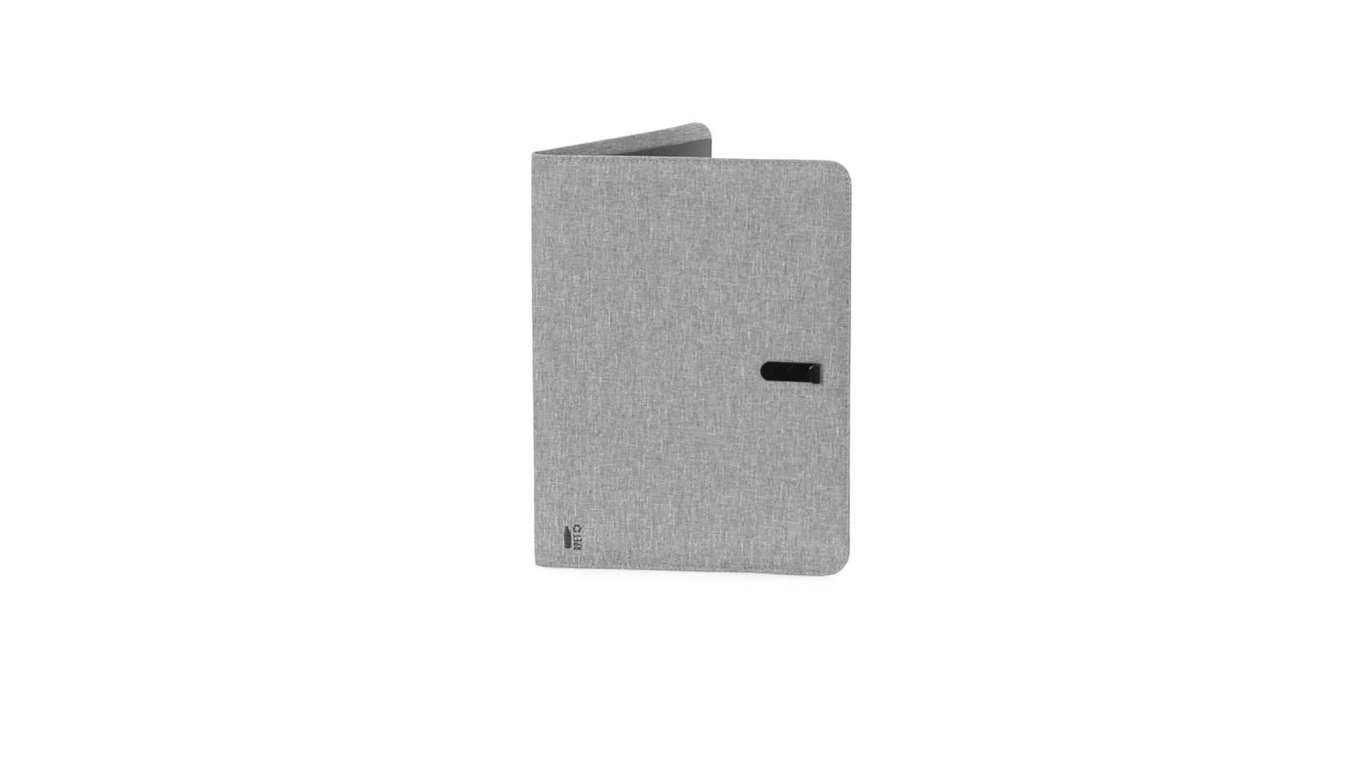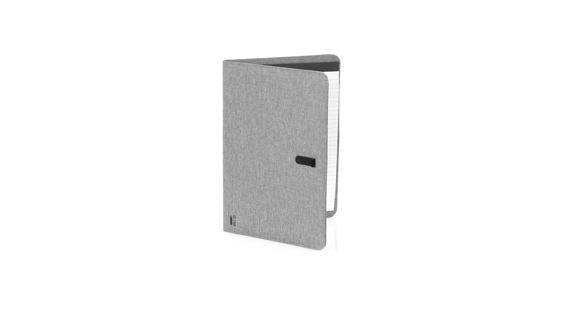 Eleganter Ordner im A4-Format aus Nature Line. Hergestellt aus widerstandsfähigem 600D RPET Melange-Effekt, hergestellt aus recyceltem Kunststoff, um die Wiederverwendung von Kunststoffabfällen zu fördern und einen Beitrag zur Nachhaltigkeit des Planeten zu leisten. Schwarze Details und Metallspange mit Gummiband speziell für die Laserbeschriftung entwickelt. Innen mit herausnehmbarem 20-Blatt-Block mit Einzelstreifen-Layout, 3 Klappentaschen, Kartenfächern und Stifthalter. RPET-Plakette in der Ecke.
