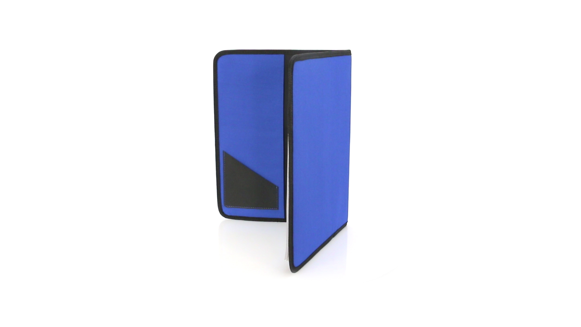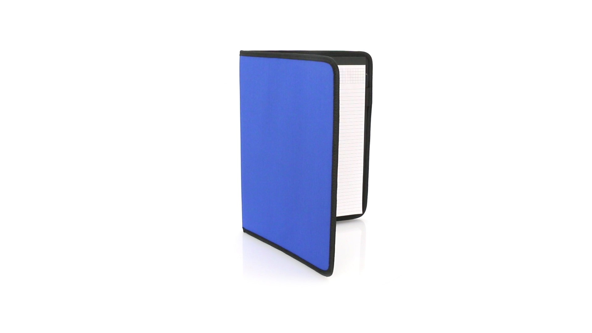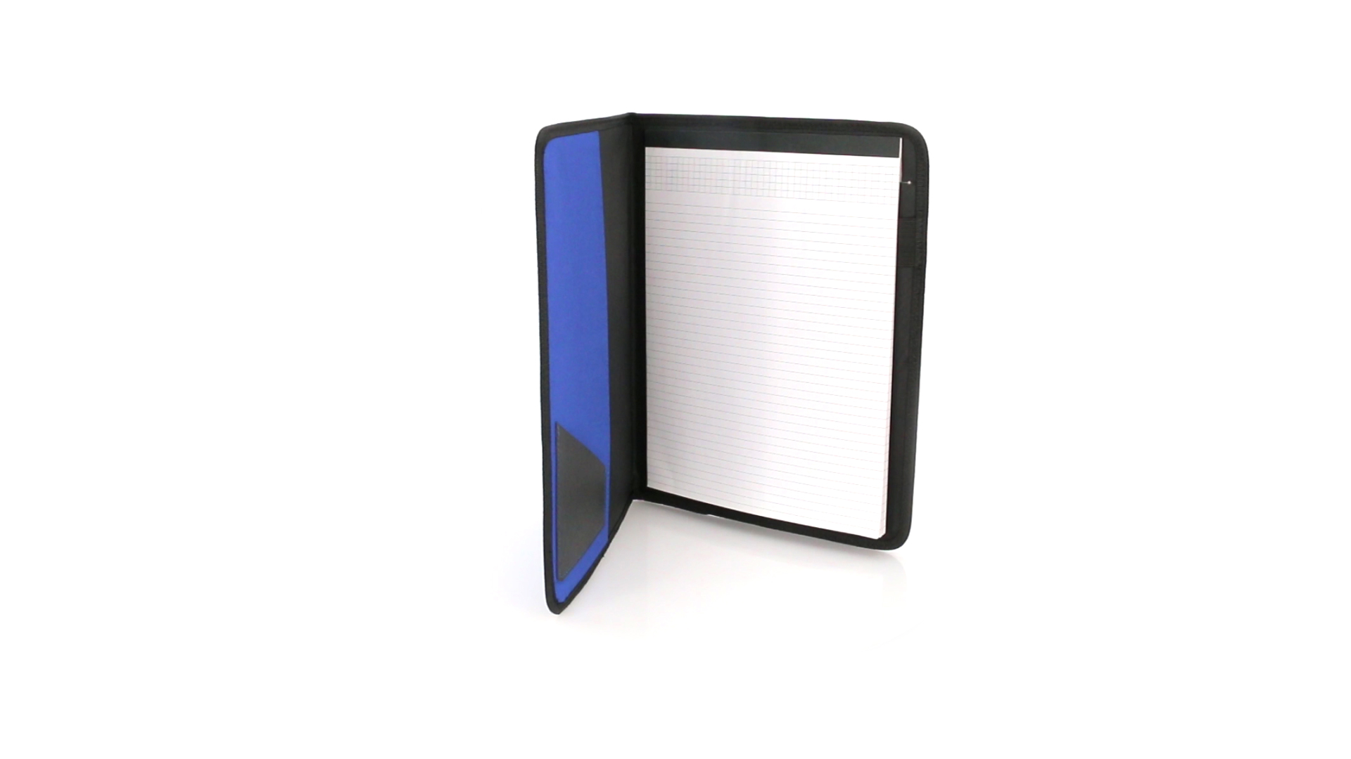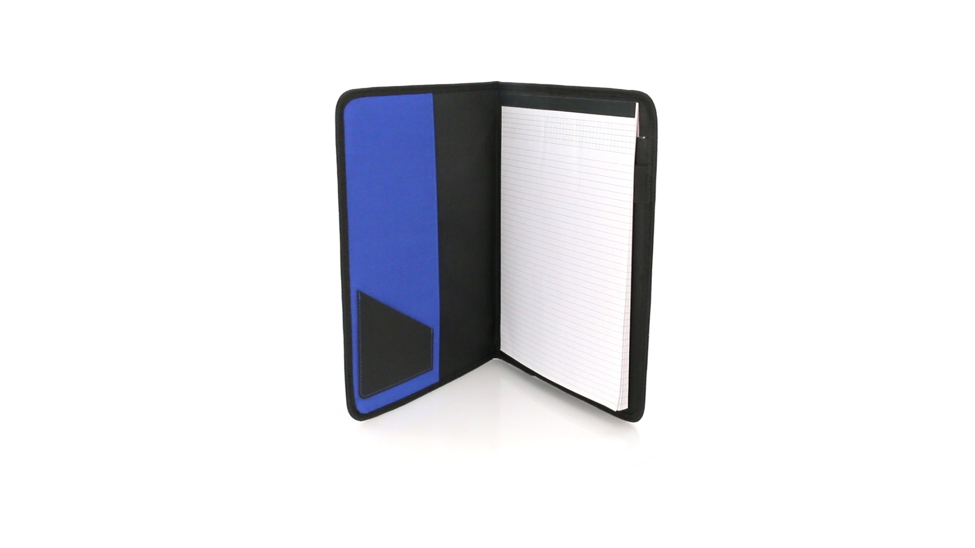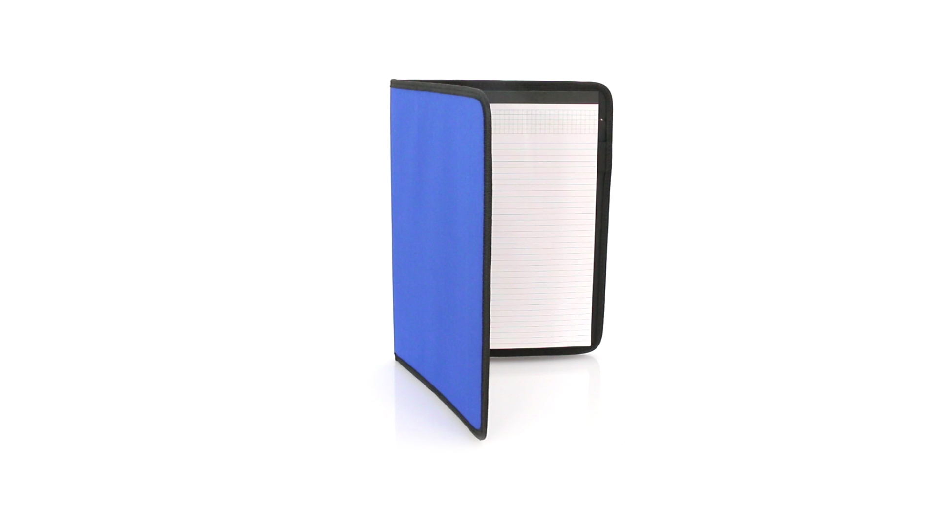 Mappe in verschiedenen Farben aus resistentem 600D Polyester mit verstärkten schwarzen Rändern. Im Inneren mit herausnehmbarem Block mit 20 Blättern, 2 Klappentaschen und Stifthalter.