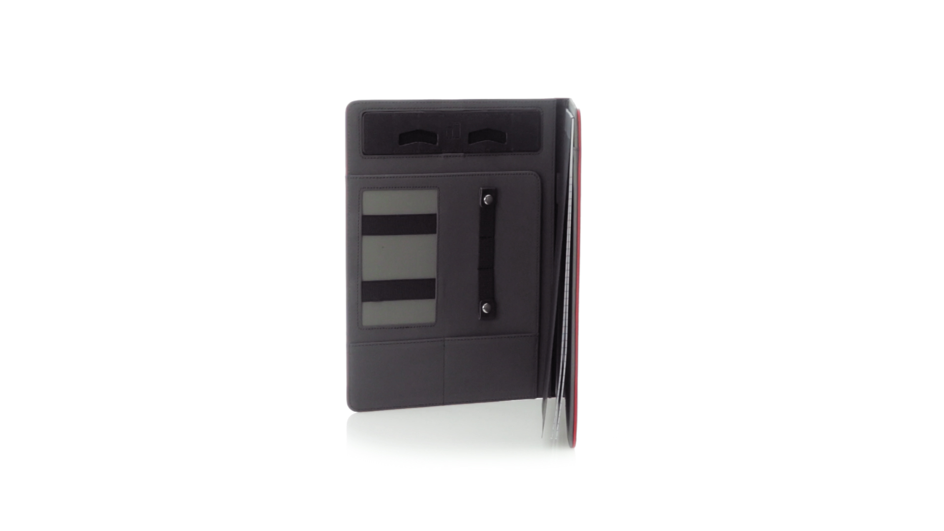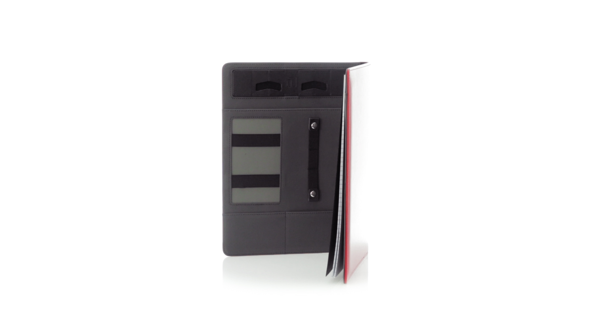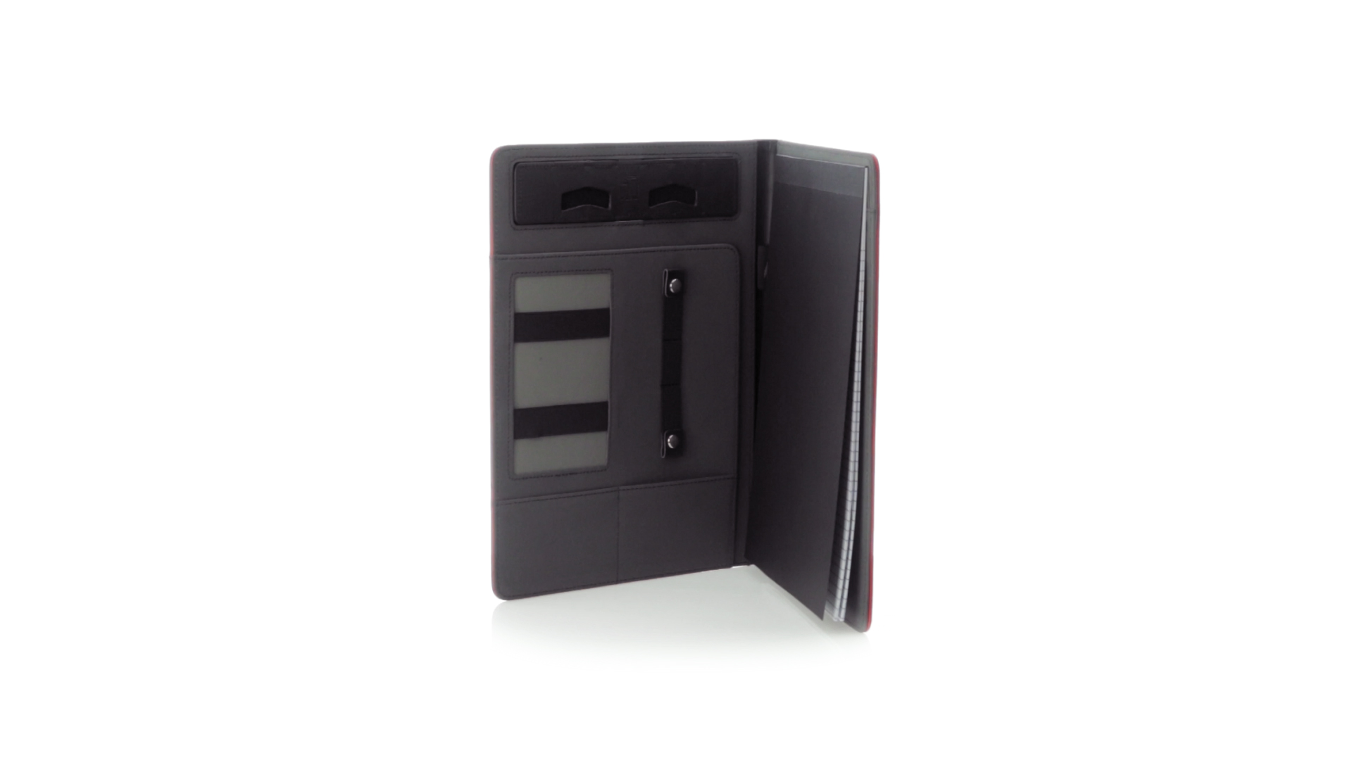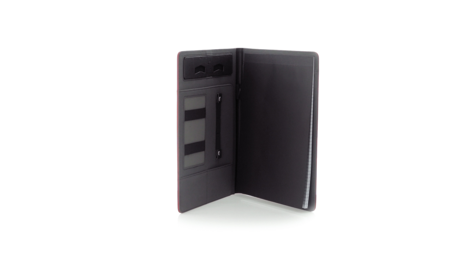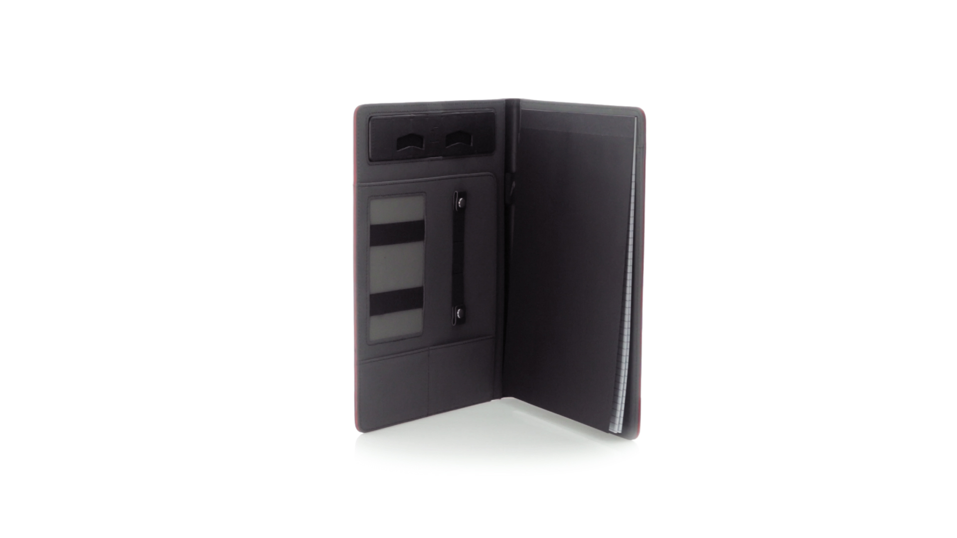 Hochwertige Mappe aus weichem Kunstleder in kräftigen Farben. Mit originellem Design und Fach auf dem Cover. Halterung im Inneren für Tablet von bis zu 10 Zoll und Smartphone. Mit herausnehmbarem Notizblock mit 20 linierten Blättern sowie Kalender und Stifthalter. Präsentiert in einer eleganten schwarzen Box.