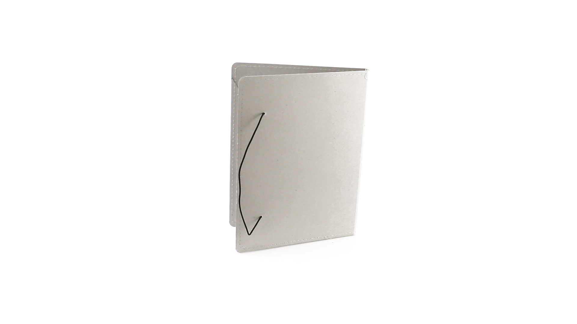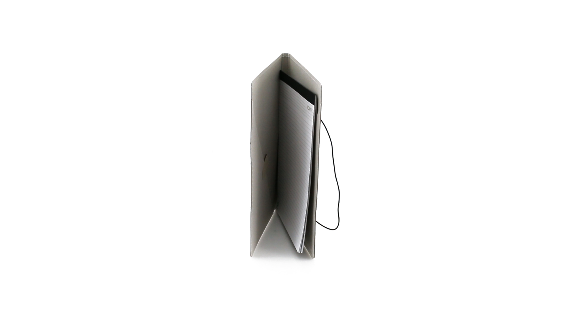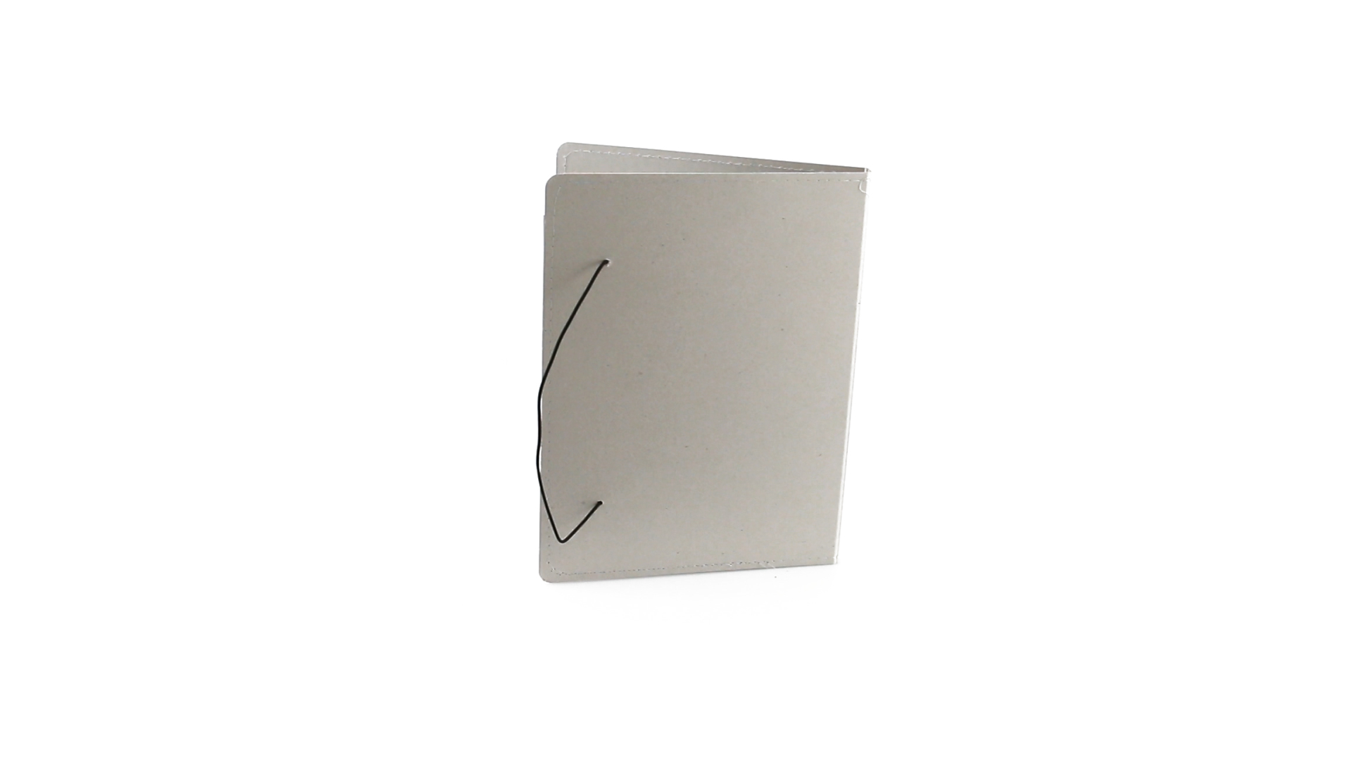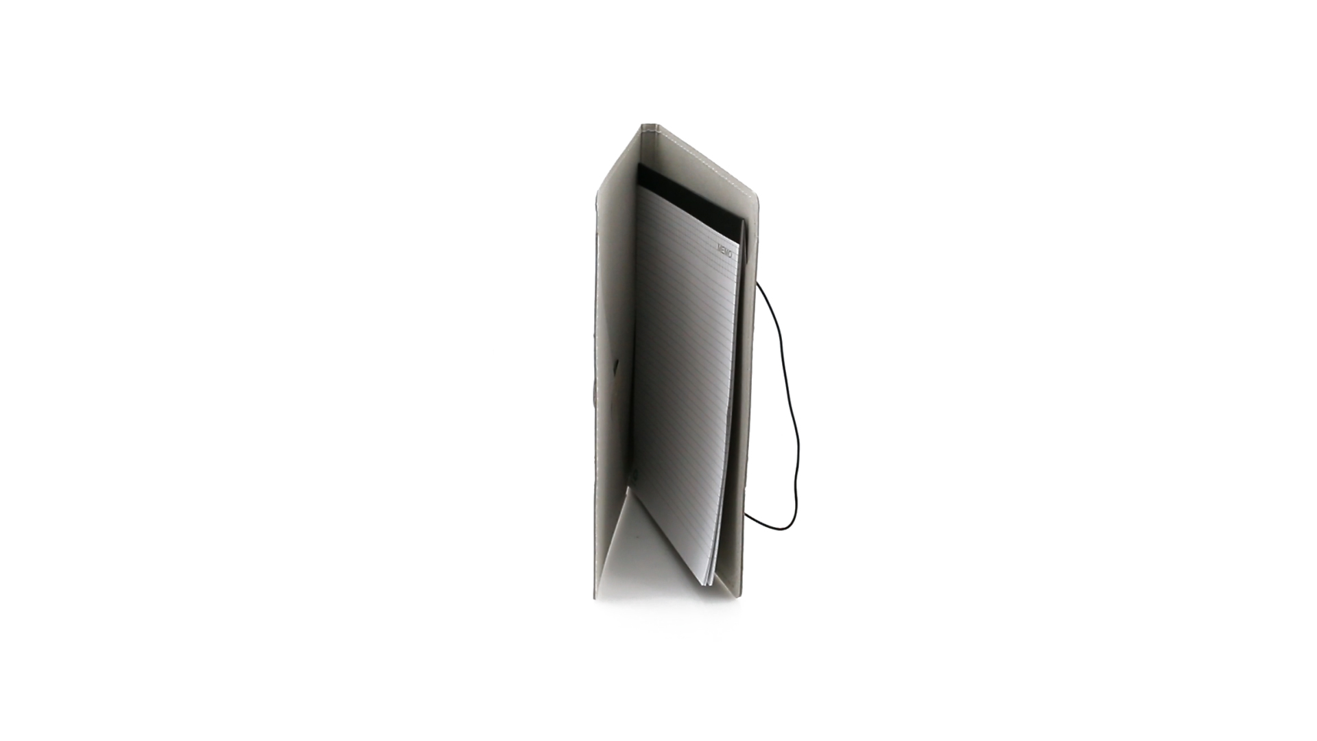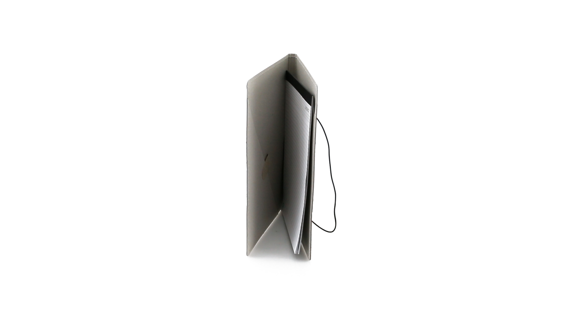 Mappe mit originellem Gummibandverschluss aus widerstandsfähigem Recyclingkarton mit Verstärkungsnähten. Mit Notizblock mit 20 linierten Blättern, dreieckiger Klappentasche und Stifthalter.