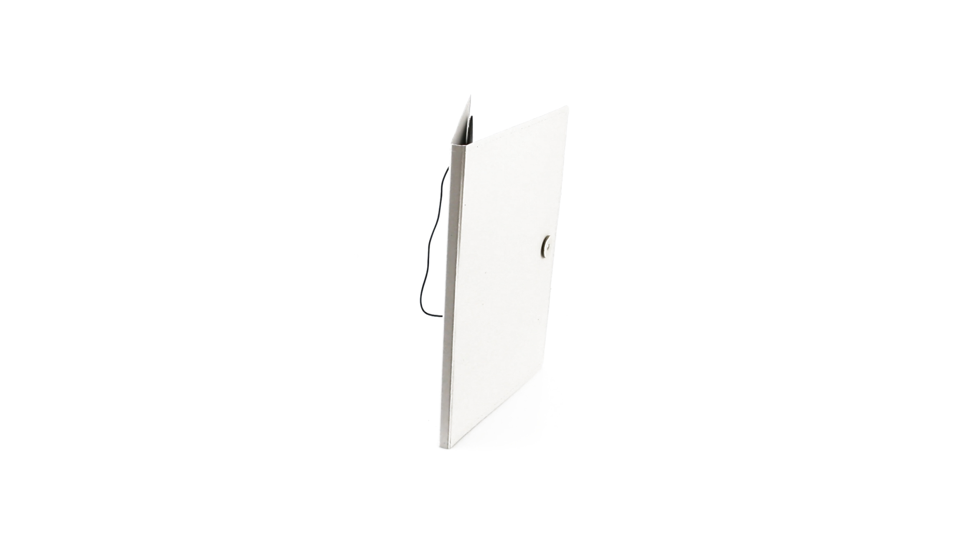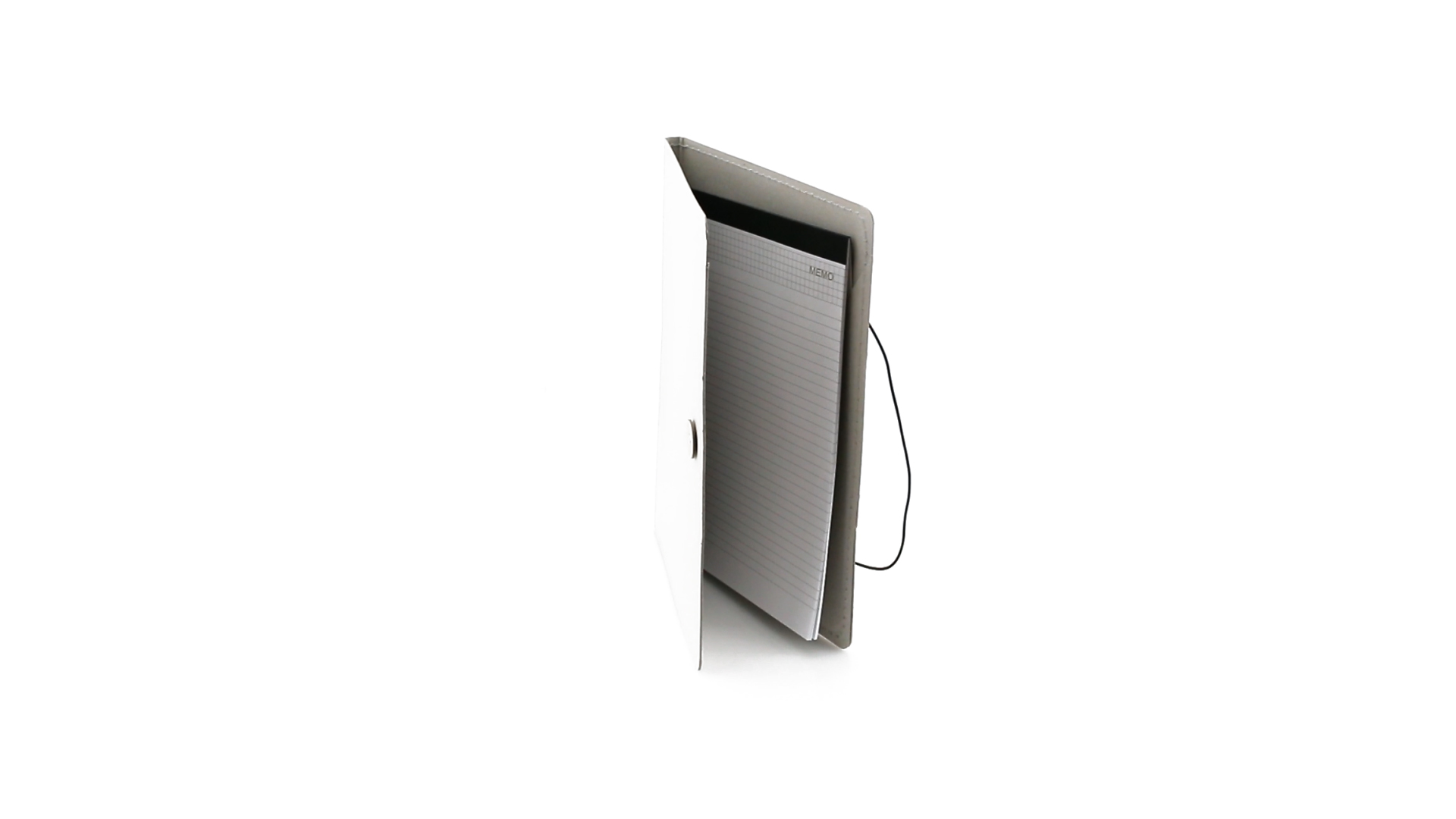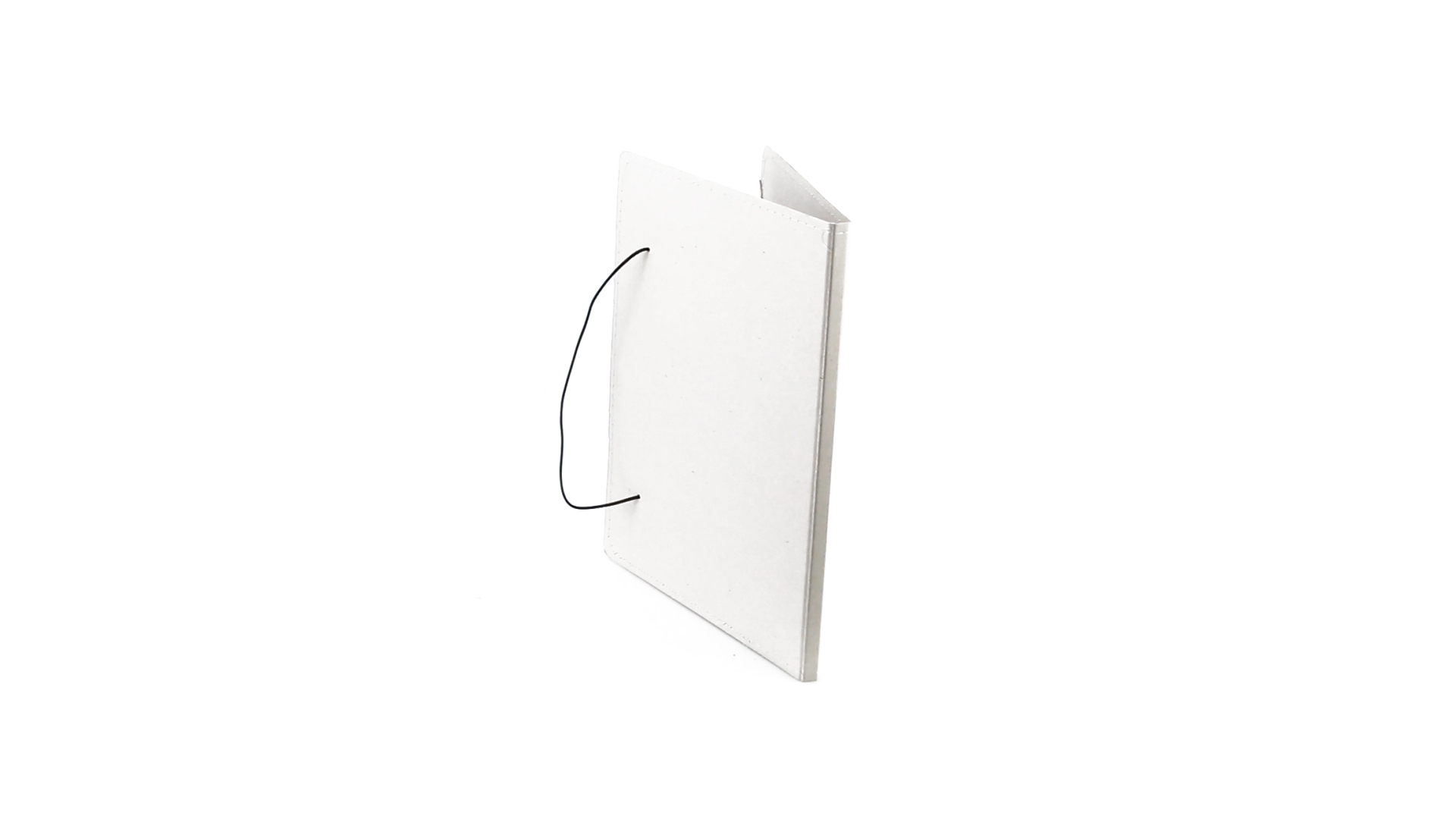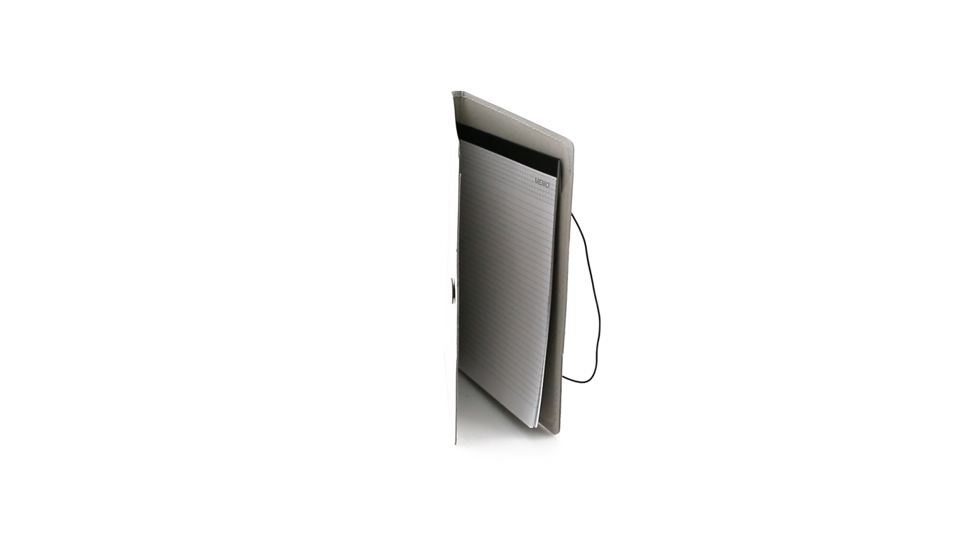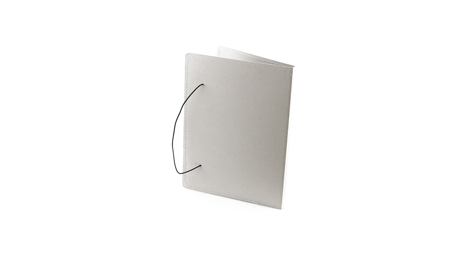 Mappe mit originellem Gummibandverschluss aus widerstandsfähigem Recyclingkarton mit Verstärkungsnähten. Mit Notizblock mit 20 linierten Blättern, dreieckiger Klappentasche und Stifthalter.