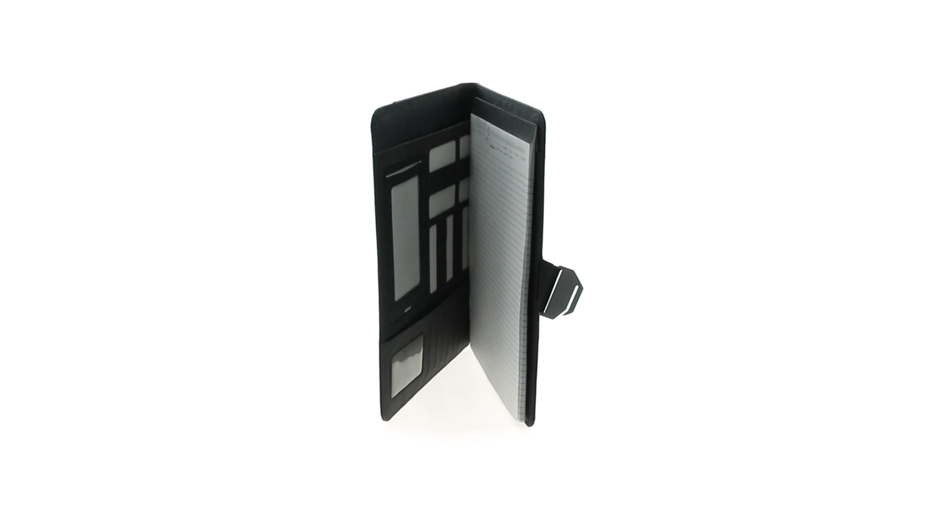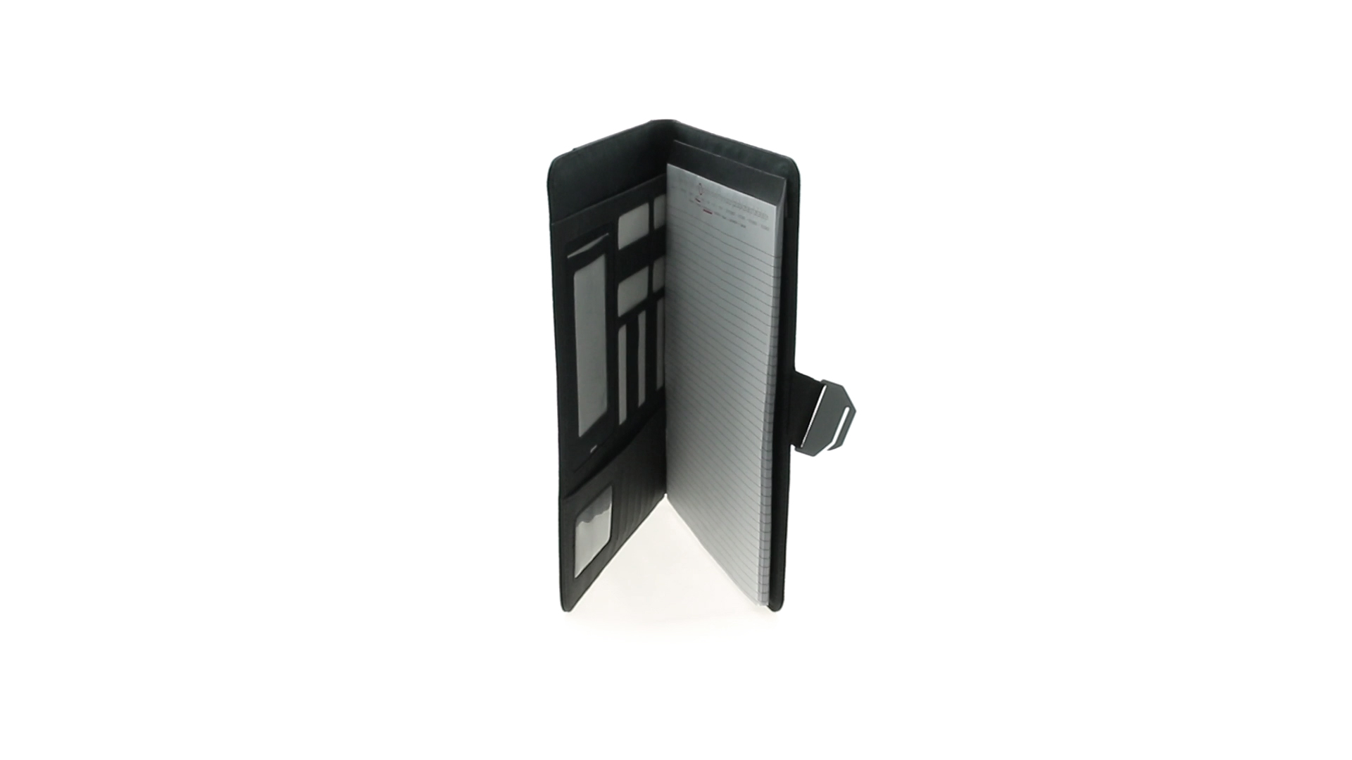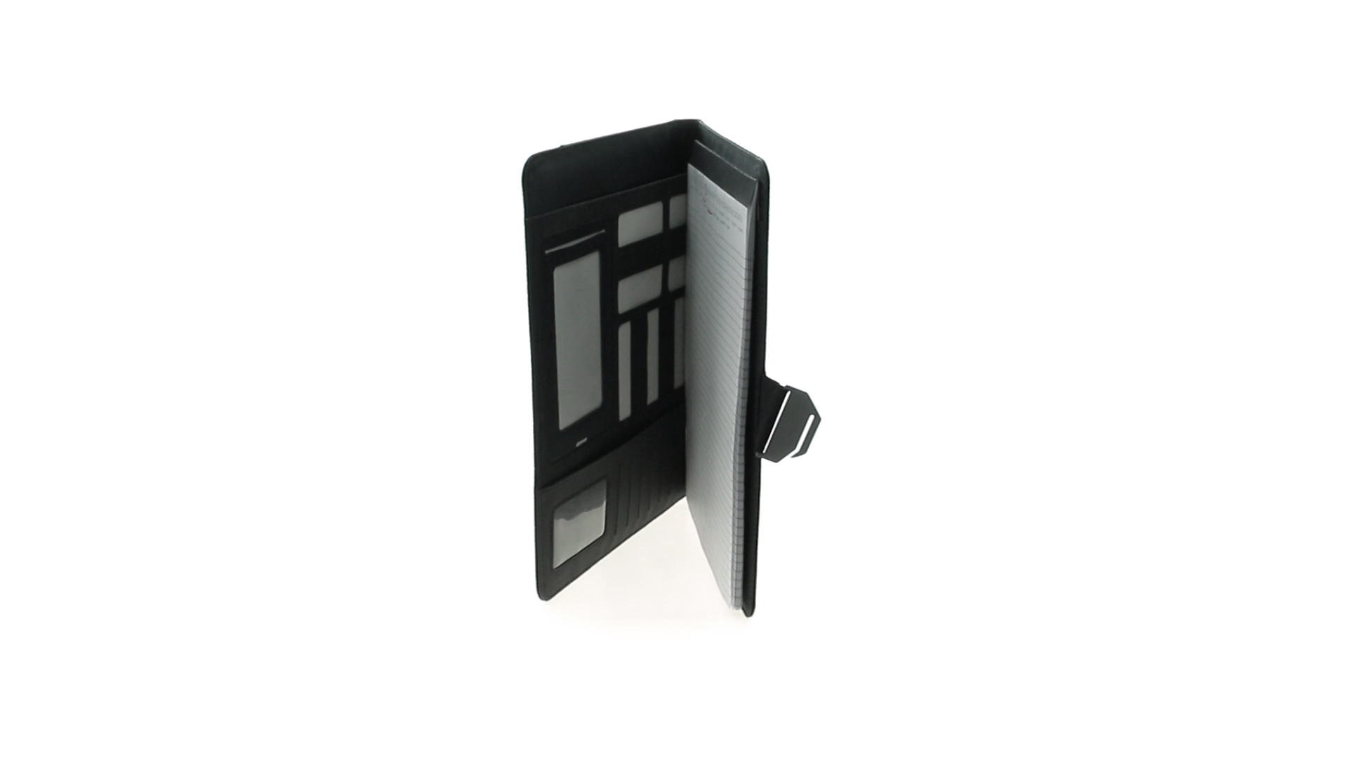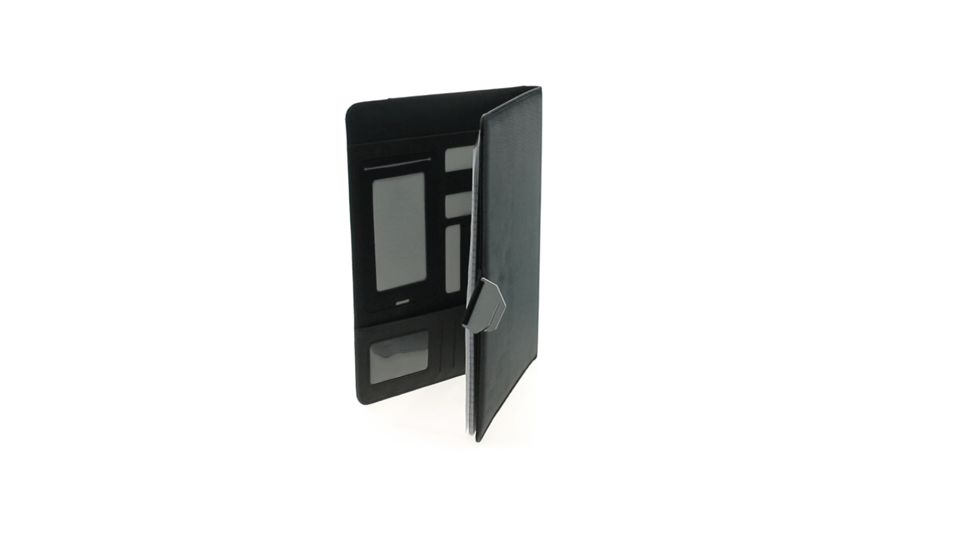 Mappe aus einer eleganten Polyester/Kunstleder-Kombination mit originellem Metallverschluss. Im Inneren mit Fächern für USB-Sticks und externen Akku, Smartphone-Hülle mit Touch-Funktion sowie Kartenfächern und Stifthalter. Mit herausnehmbarem Notizblock mit 20 Blättern. Präsentiert in einer eleganten schwarzen Box.
