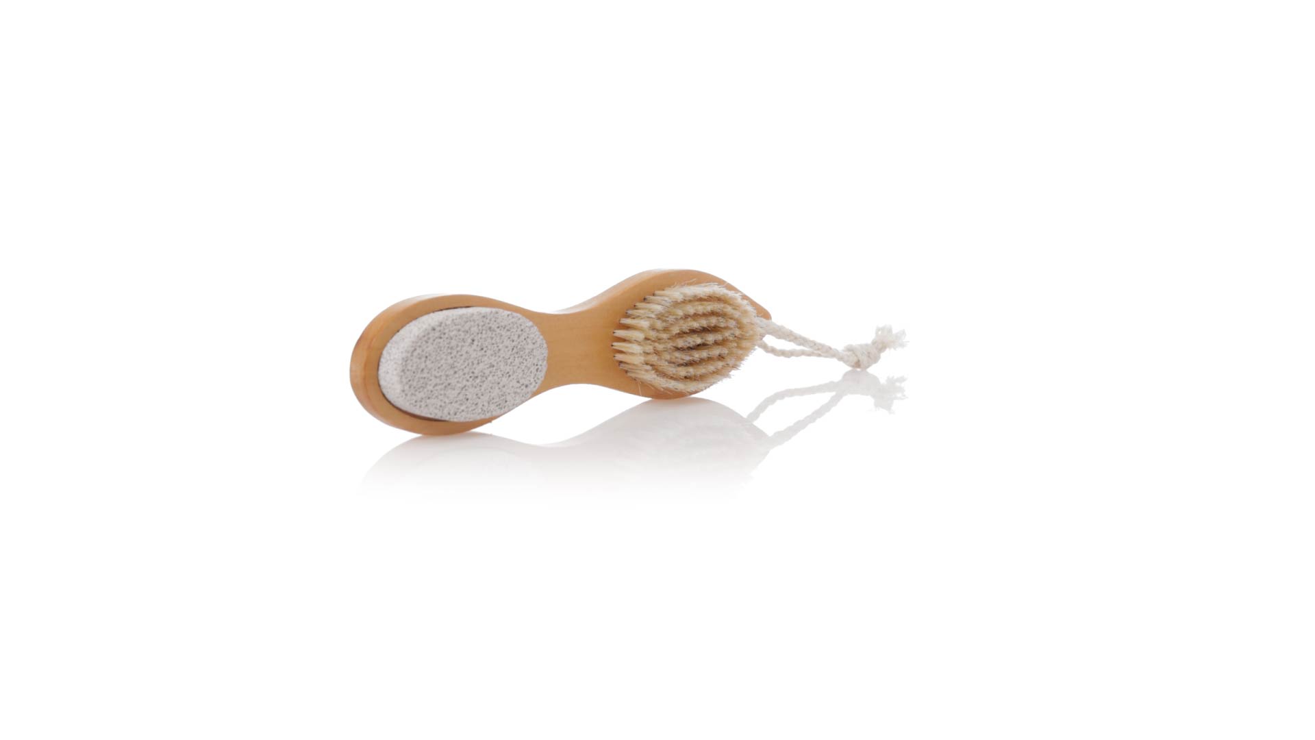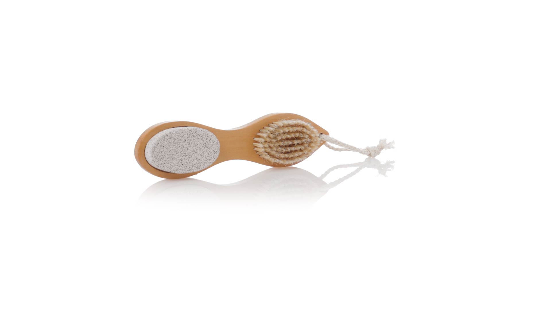 Nützliche Peelingbürste aus Naturholz. Vier verschiedene Funktionen an jedem Ende der Bürste: an einem Ende mit Bimsstein und Metallfeile; am anderen Ende mit Naturfeile und weichen Borsten. Mit praktischer Schnur zum Aufhängen nach Gebrauch.