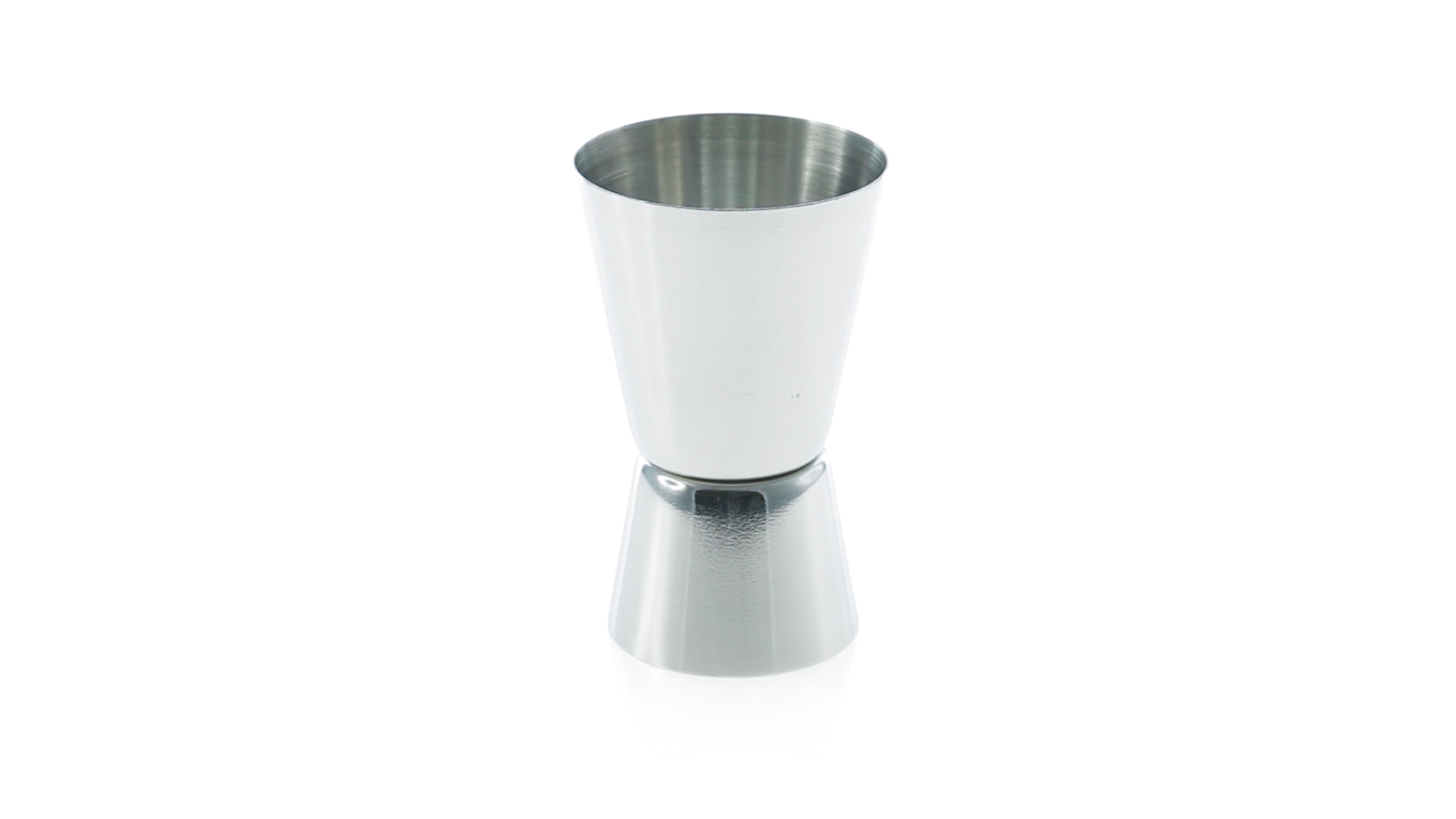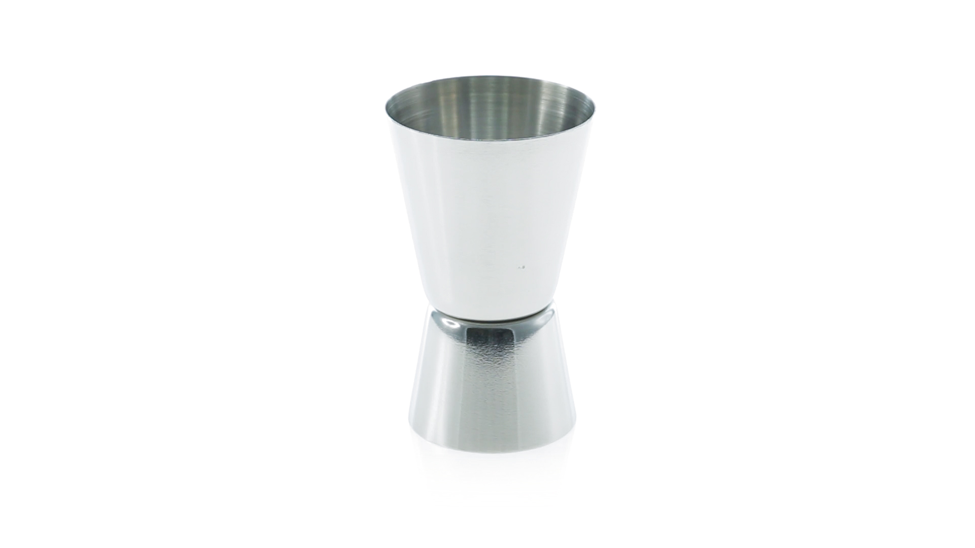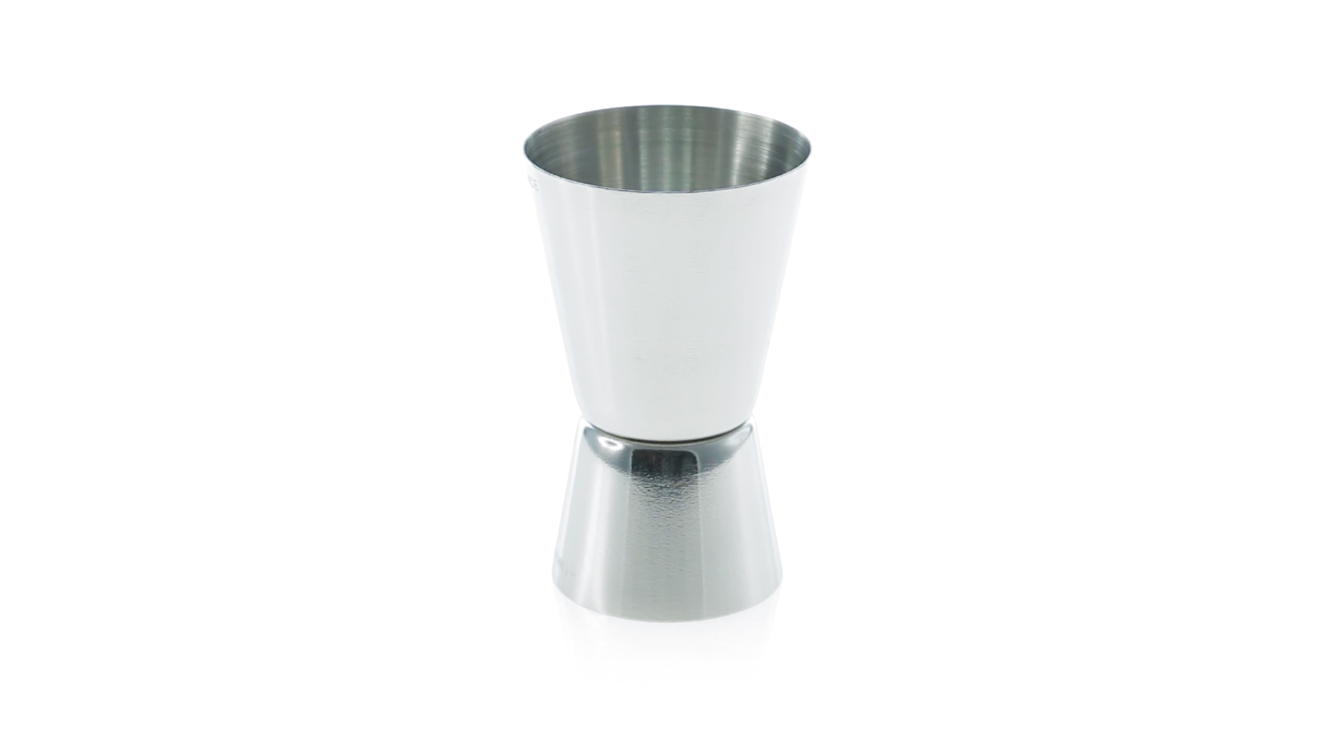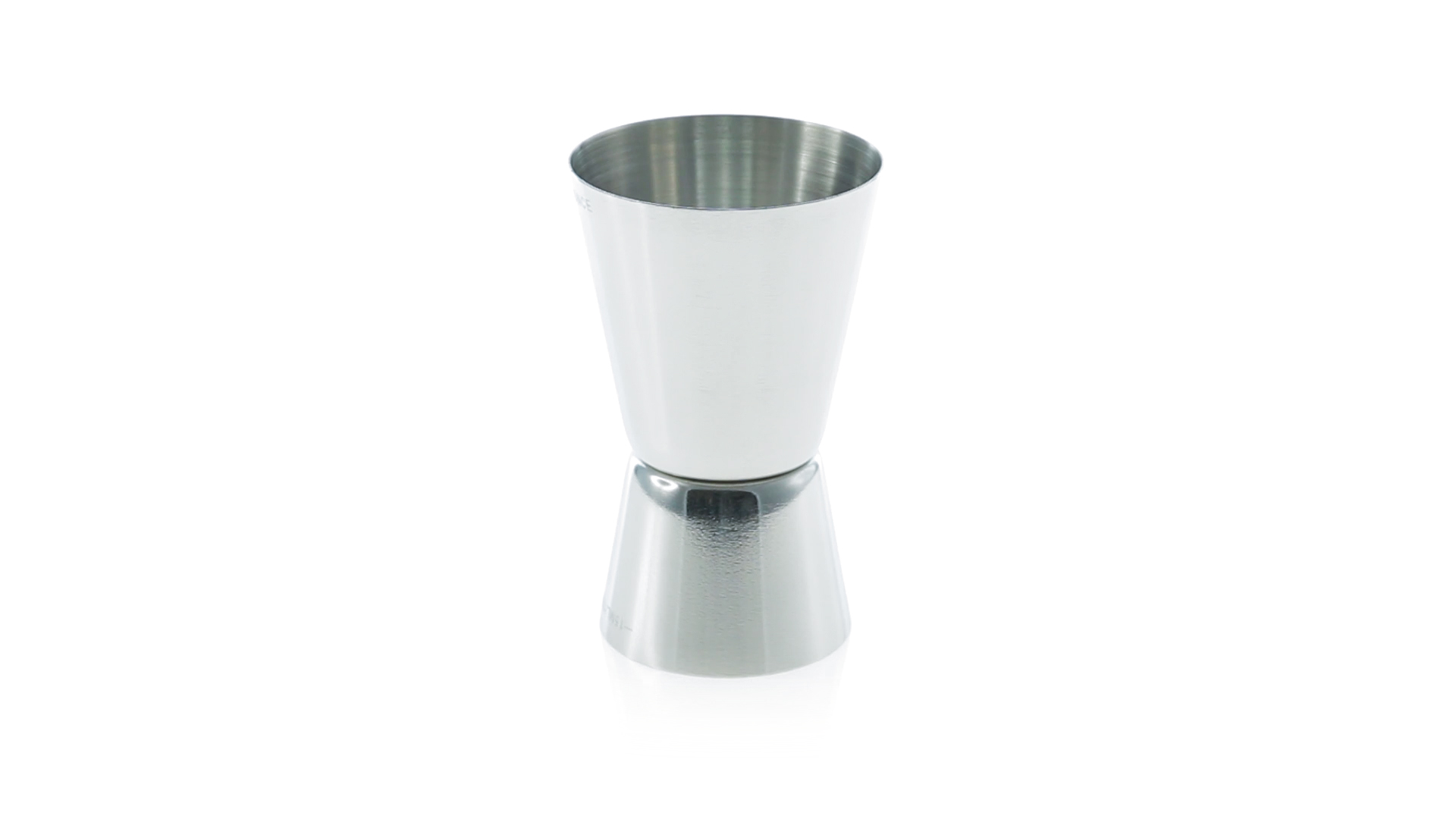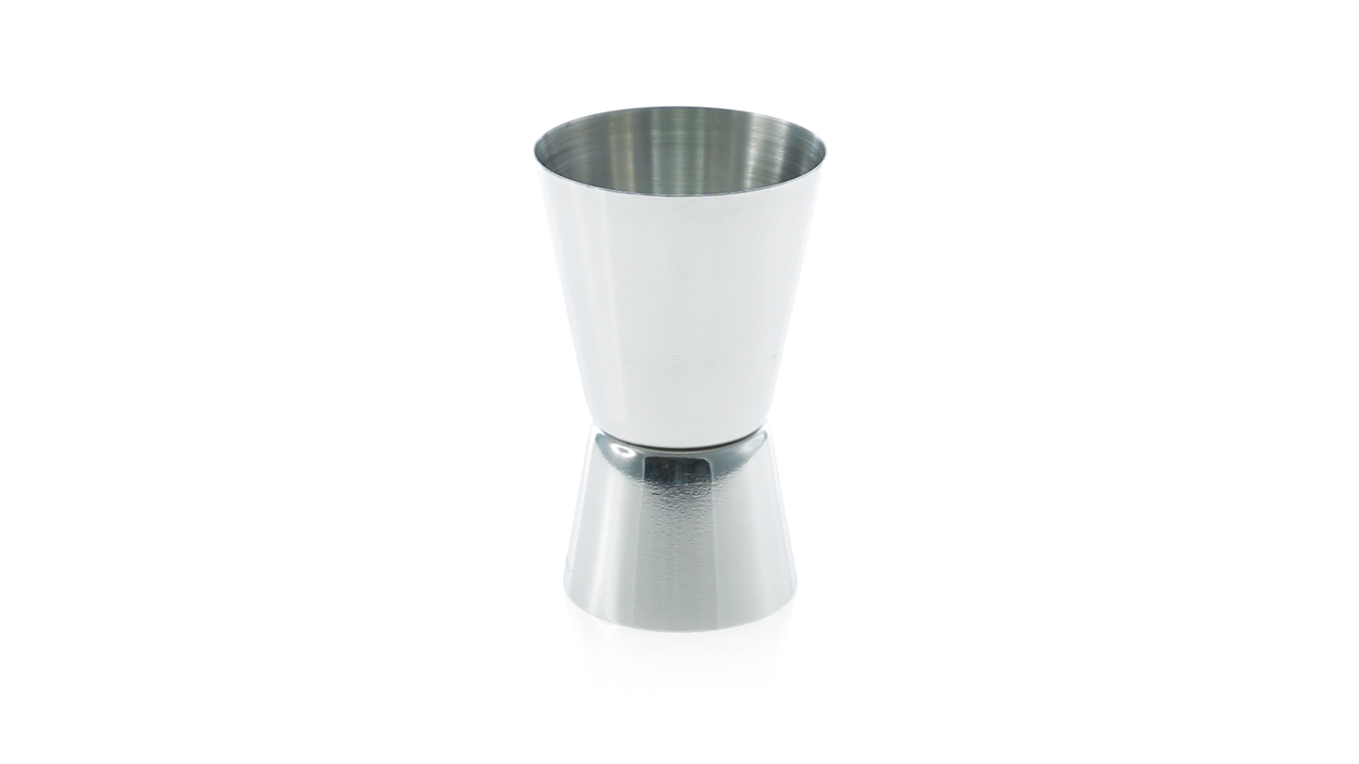 Doppelmessbecher aus Edelstahl mit mattem Finish. Speziell für den Laserdruck entwickelt. Präsentiert in einer PVC-Schachtel.