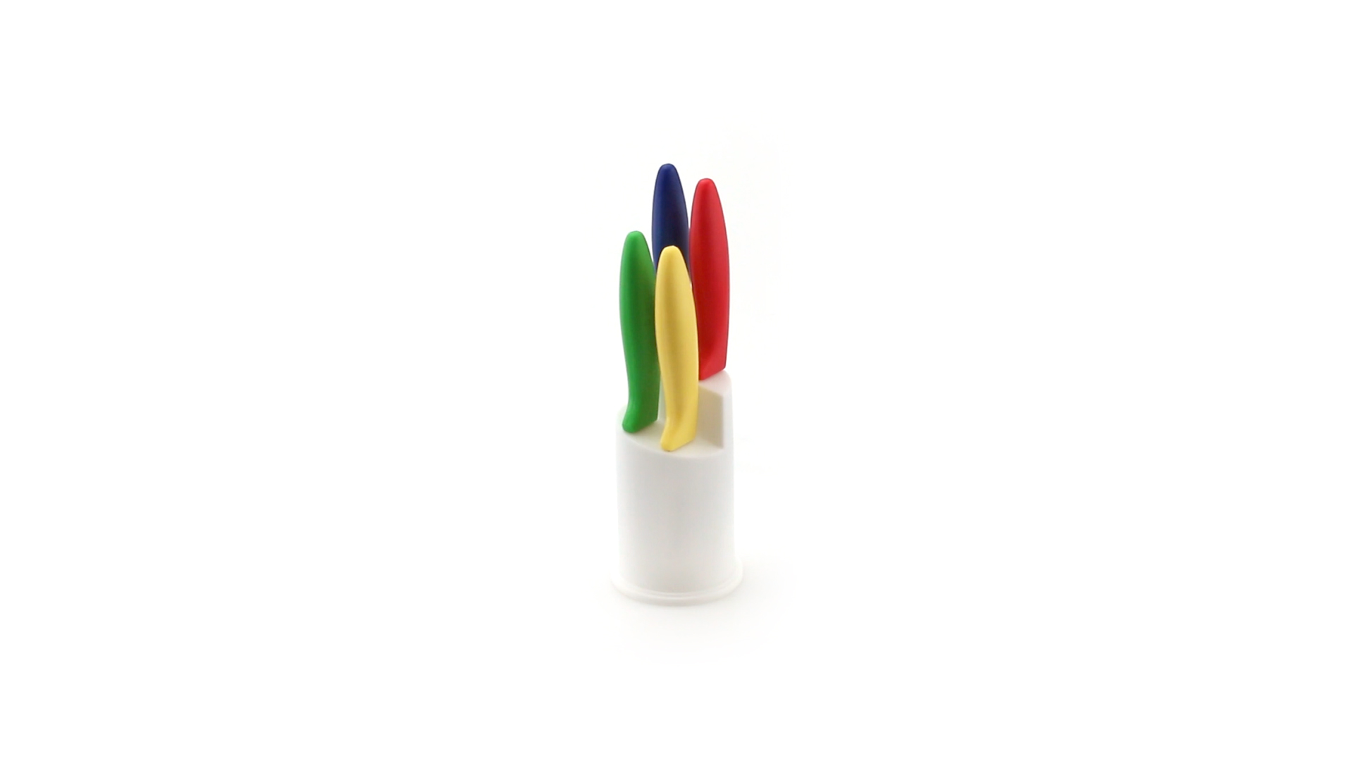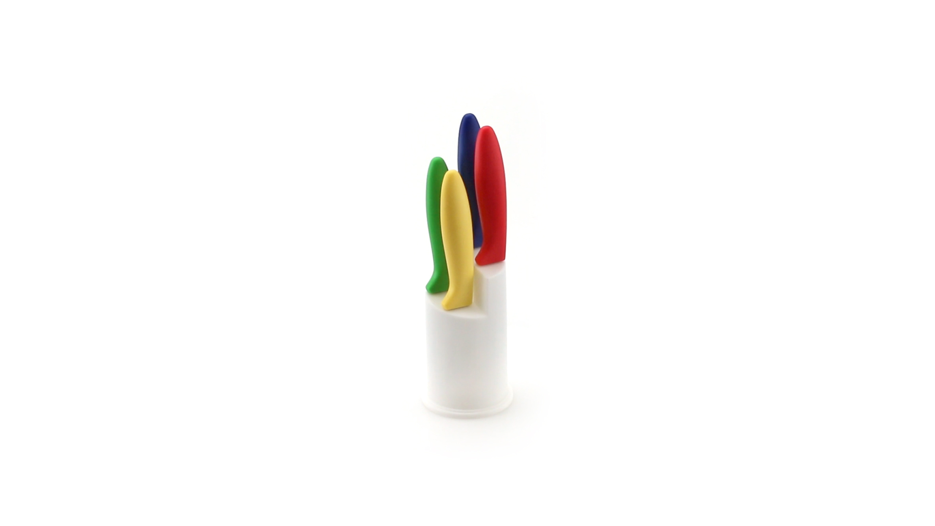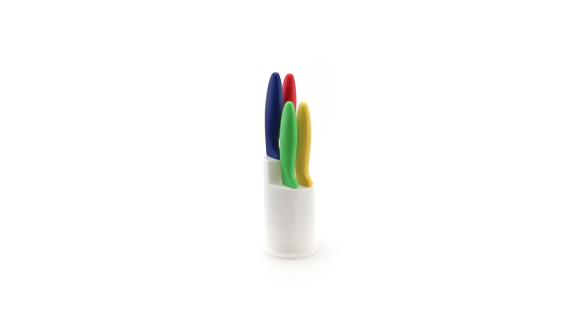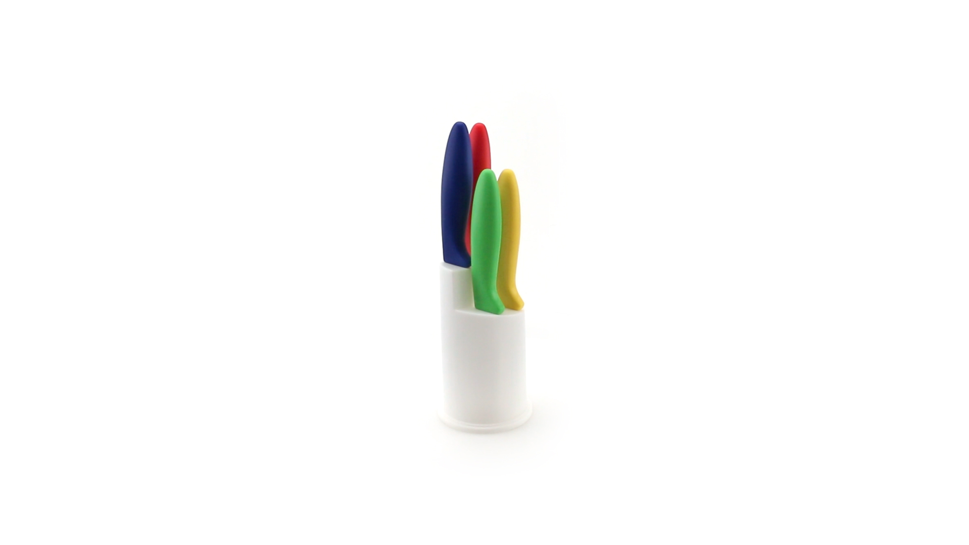 Messerset mit Messern von verschiedener Grösse mit unterschiedlichen Klingen aus Edelstahl und weichen, ergonomischen Griffen in fröhlichen Farben. Mit robustem Halter. Präsentiert in einer individuellen Box.