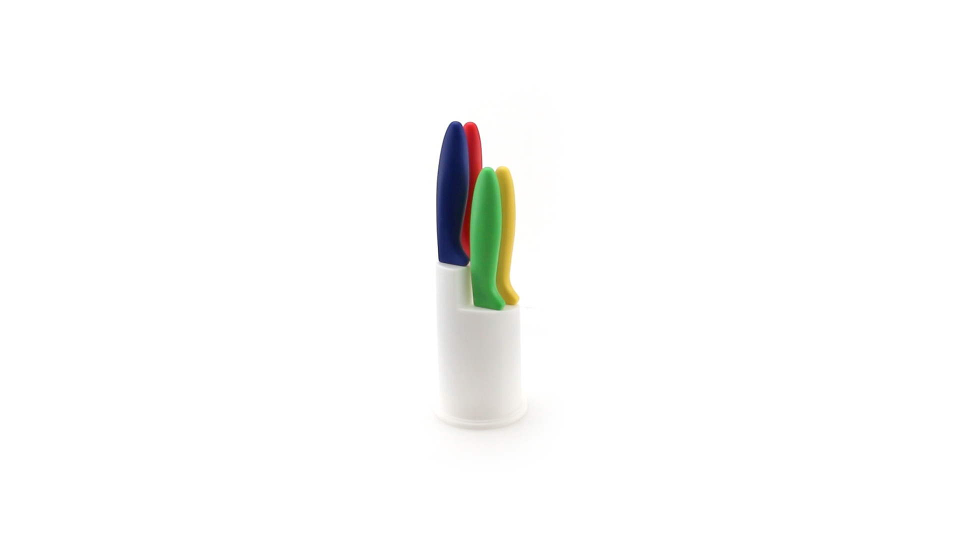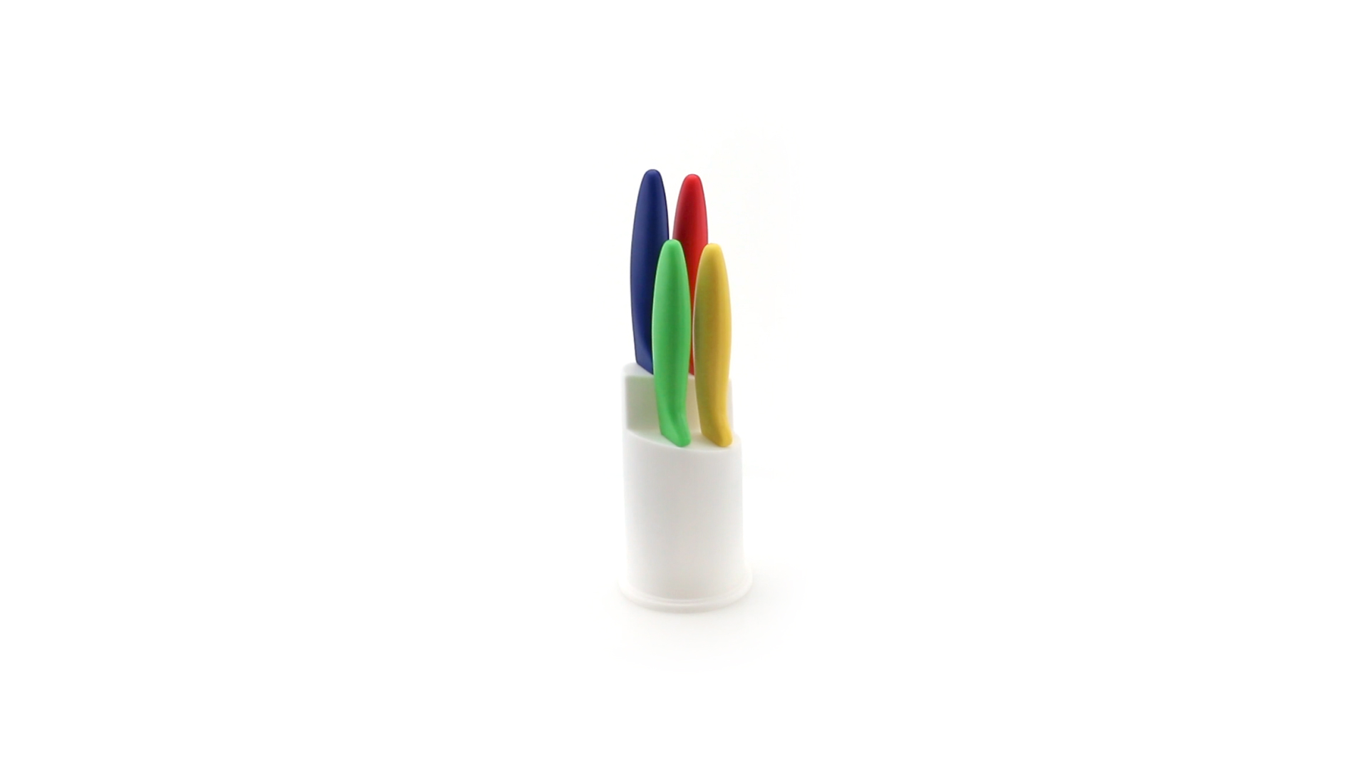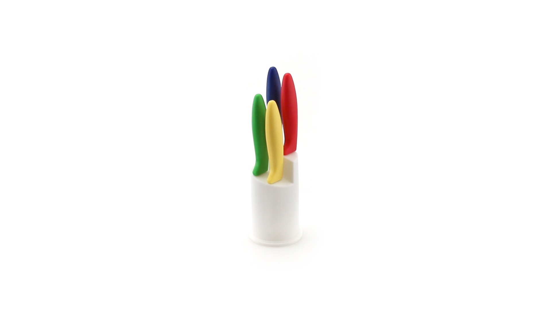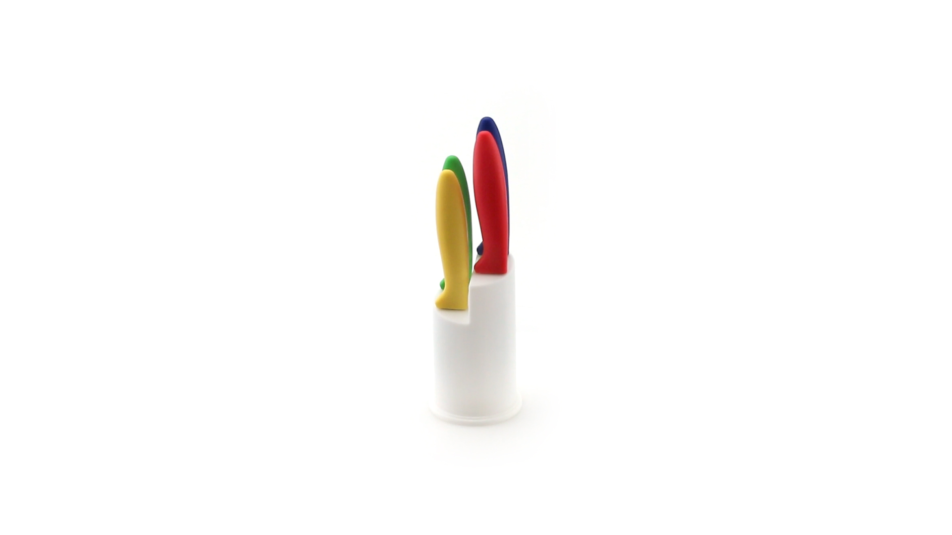 Messerset mit Messern von verschiedener Grösse mit unterschiedlichen Klingen aus Edelstahl und weichen, ergonomischen Griffen in fröhlichen Farben. Mit robustem Halter. Präsentiert in einer individuellen Box.