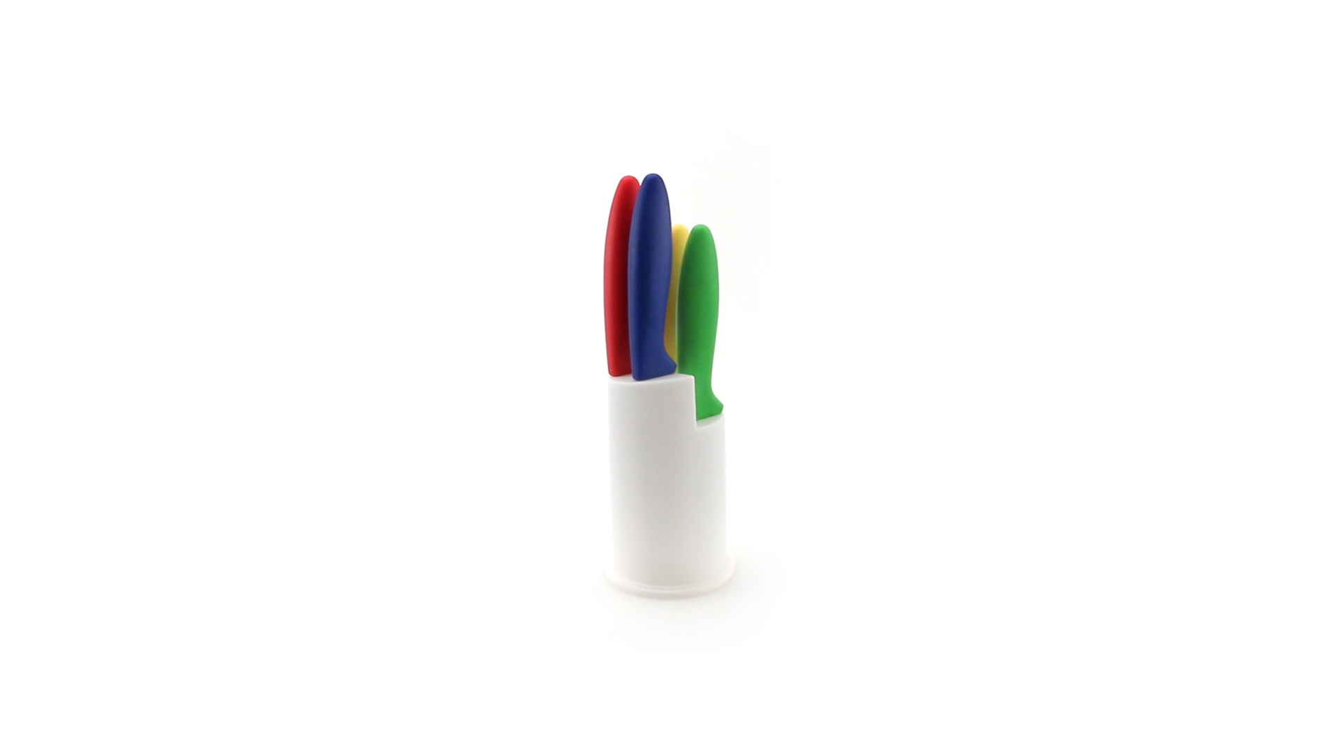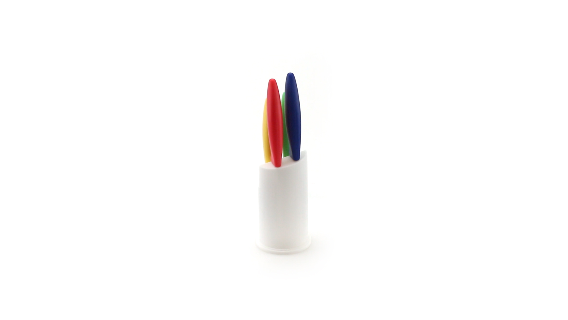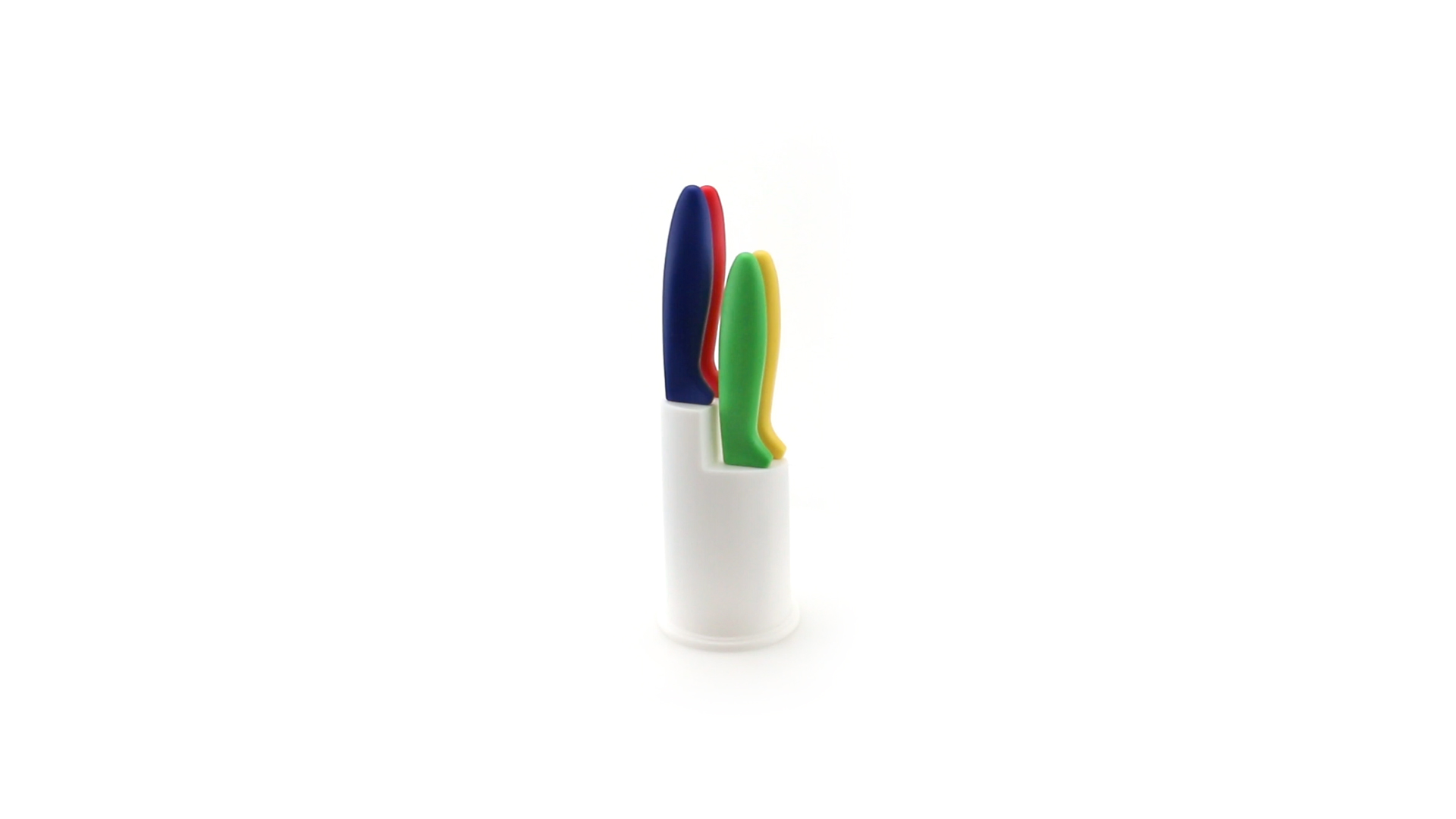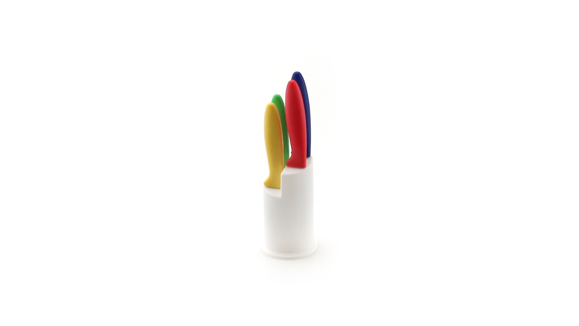 Messerset mit Messern von verschiedener Grösse mit unterschiedlichen Klingen aus Edelstahl und weichen, ergonomischen Griffen in fröhlichen Farben. Mit robustem Halter. Präsentiert in einer individuellen Box.
