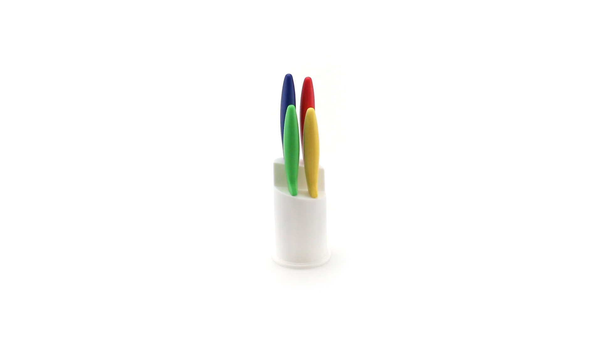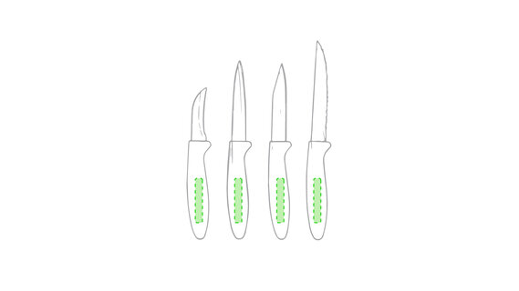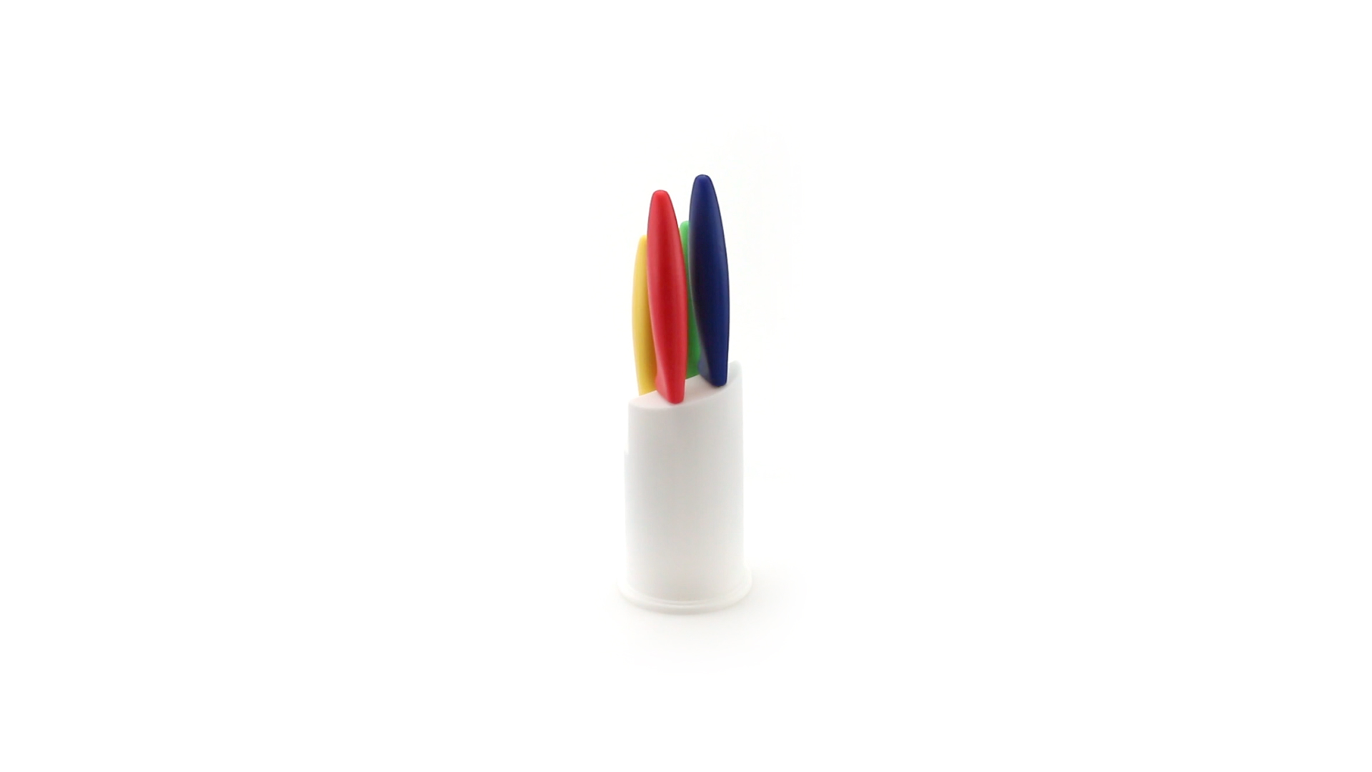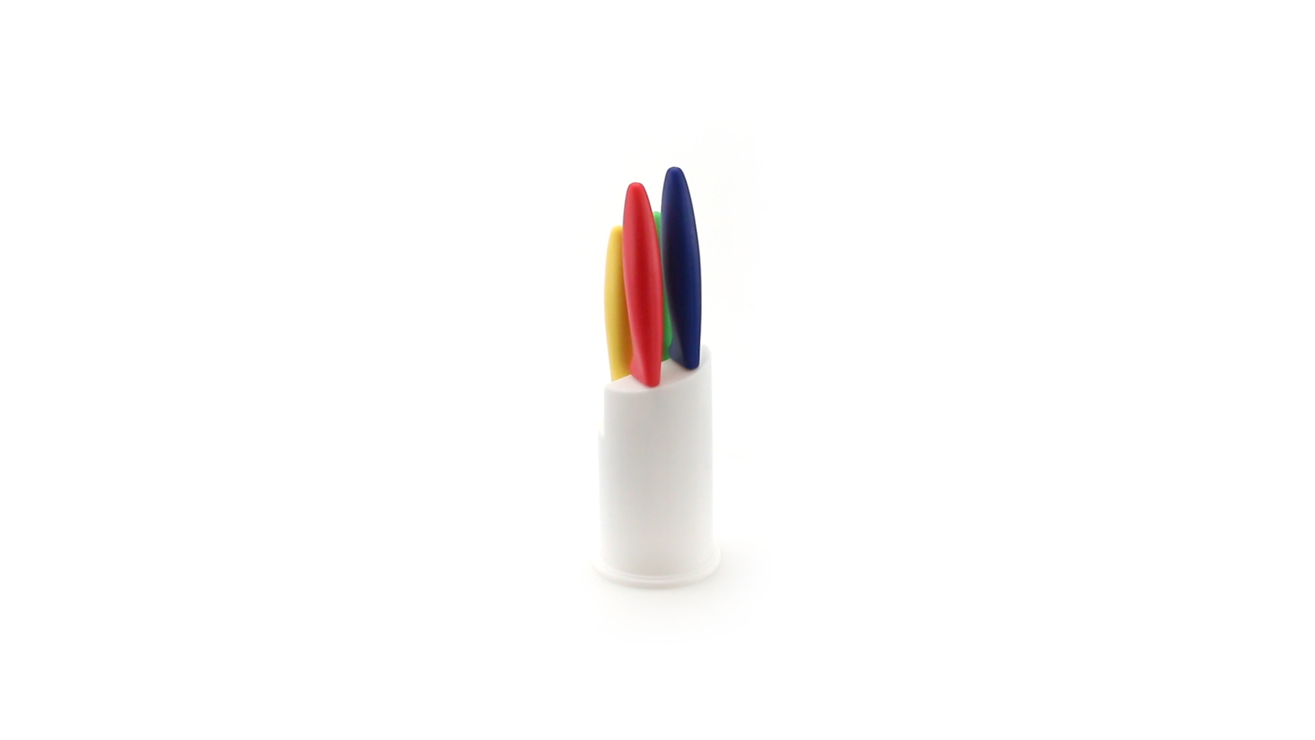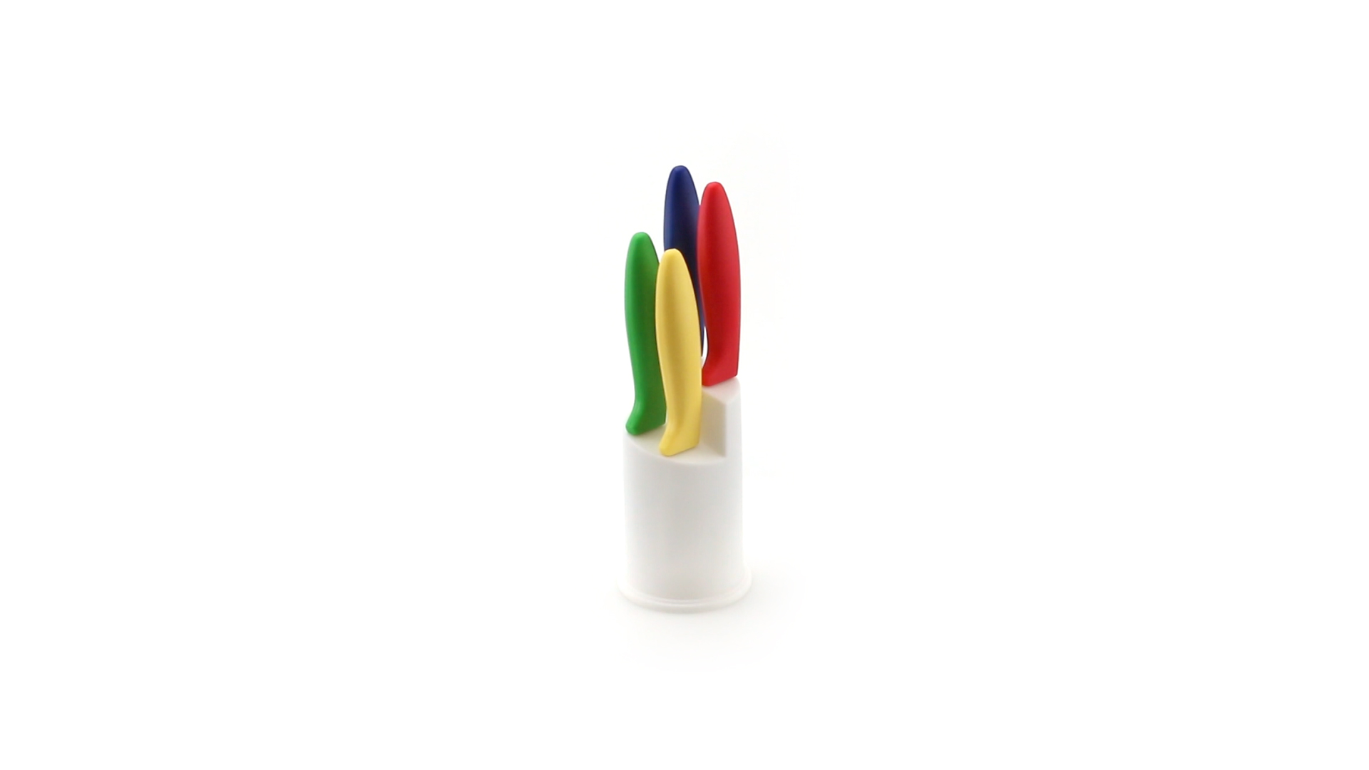 Messerset mit Messern von verschiedener Grösse mit unterschiedlichen Klingen aus Edelstahl und weichen, ergonomischen Griffen in fröhlichen Farben. Mit robustem Halter. Präsentiert in einer individuellen Box.