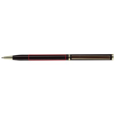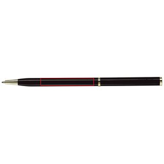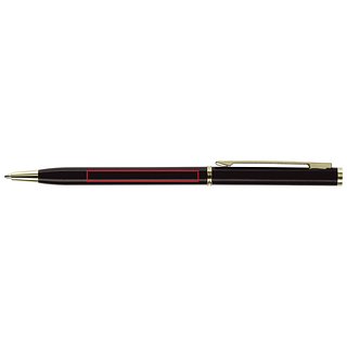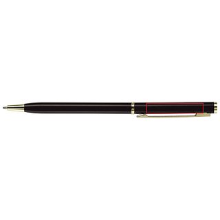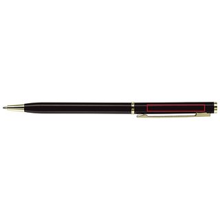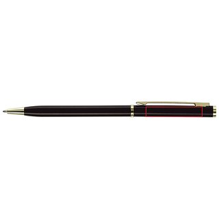 Dünner Metallkugelschreiber. Farbig matt mit goldfarbigen Teilen. Blauschreibende Metallmine.