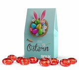 Feinste Lindt Lindor Ostereier aus Milchschokolade in individuell bedruckter Standboden-Kartonage.