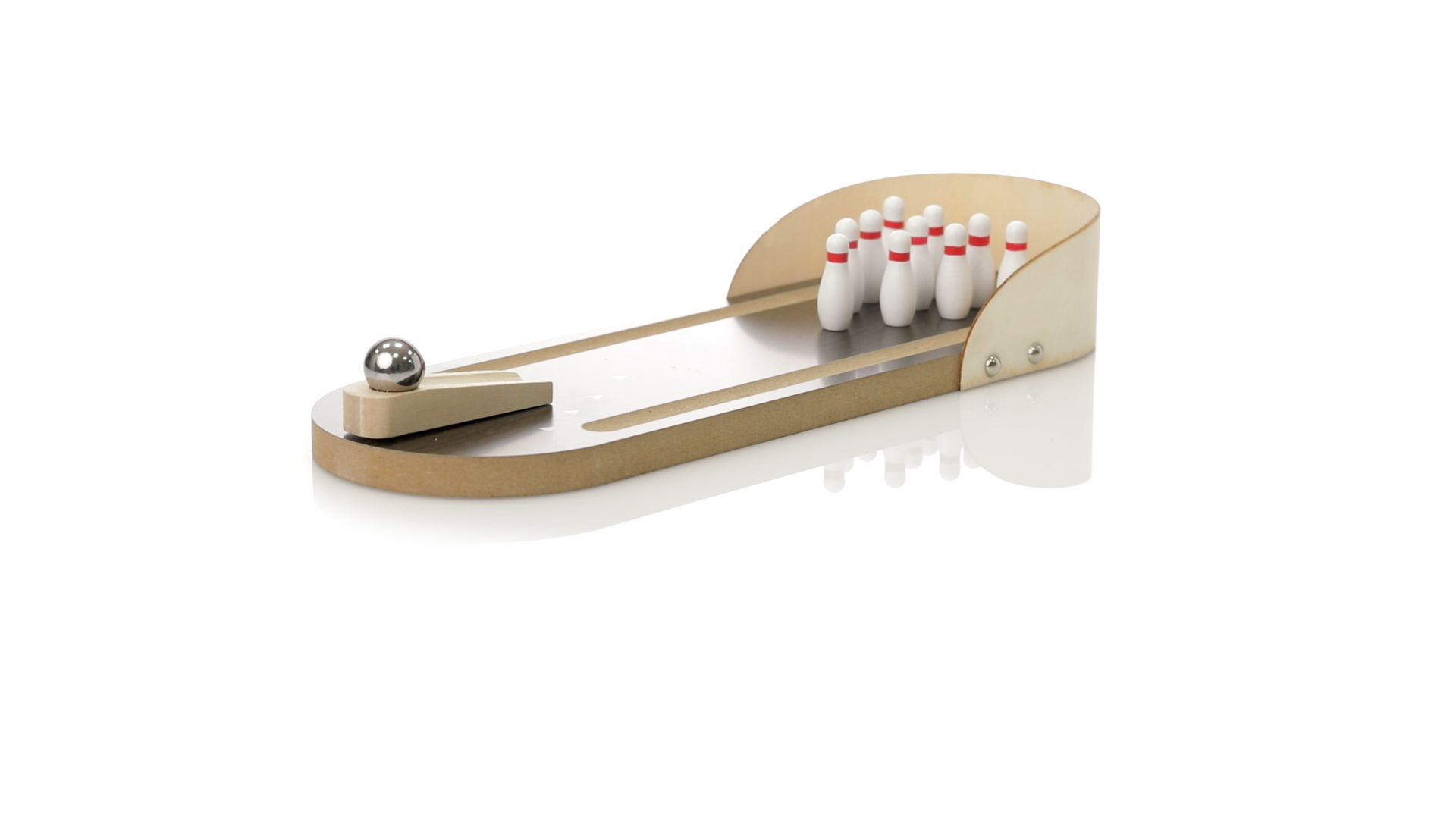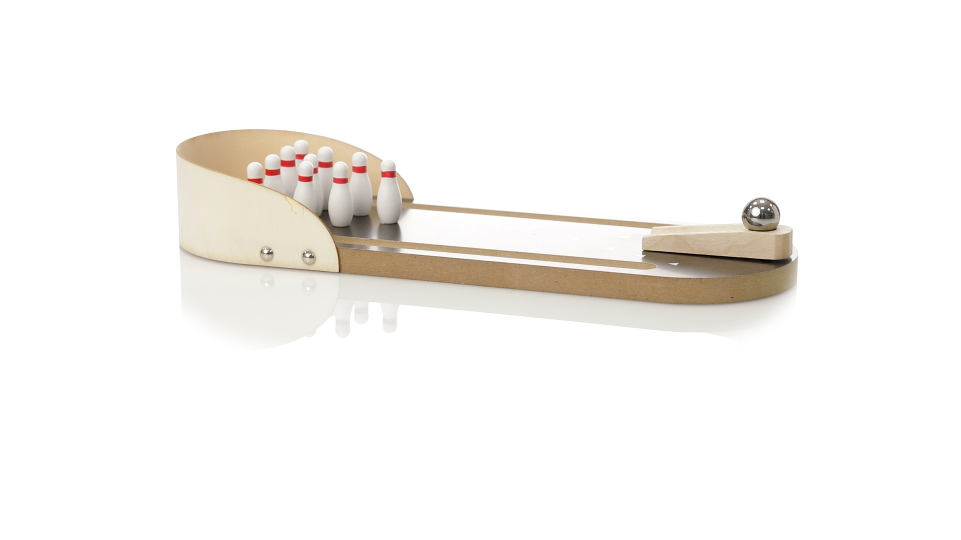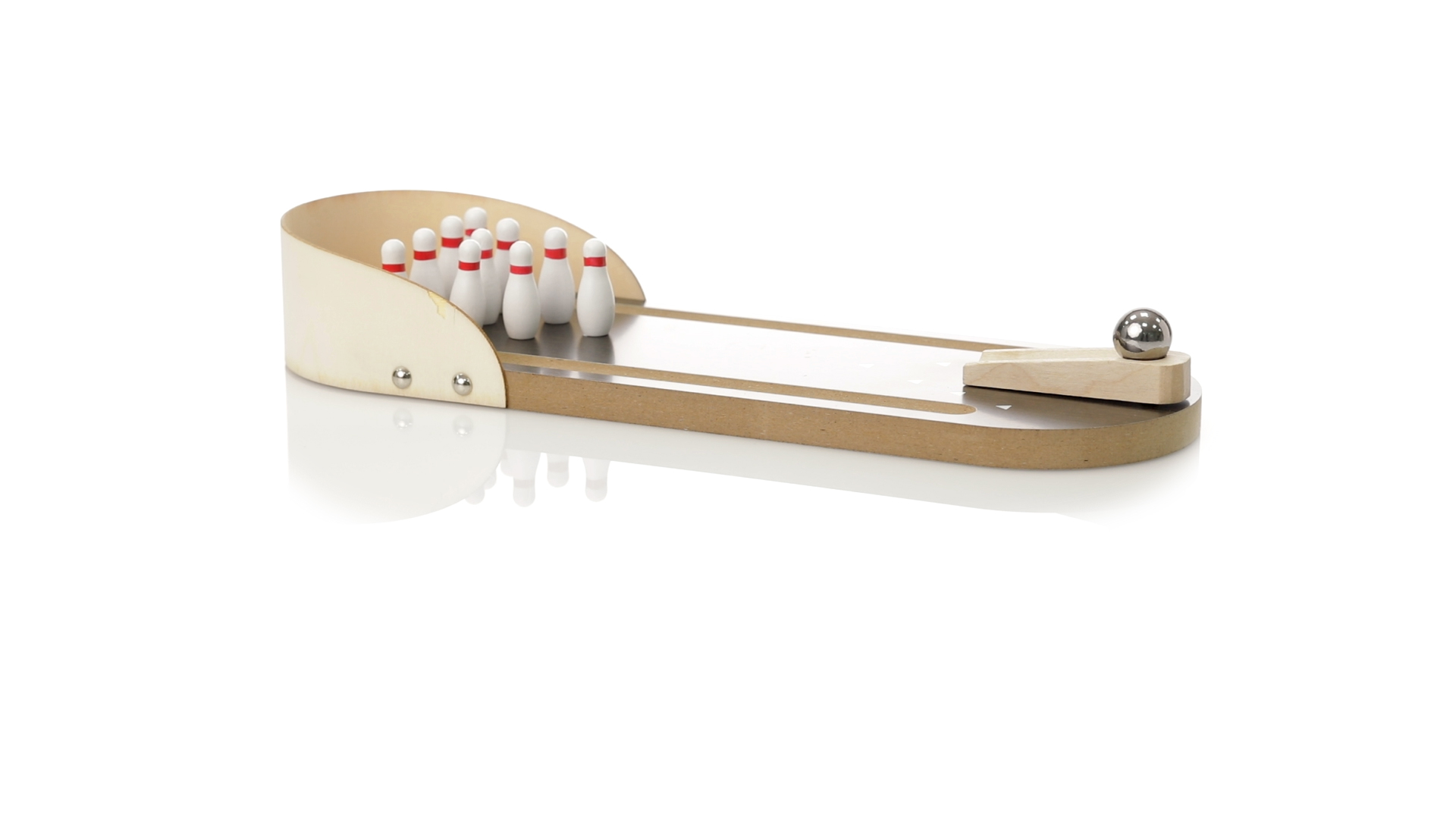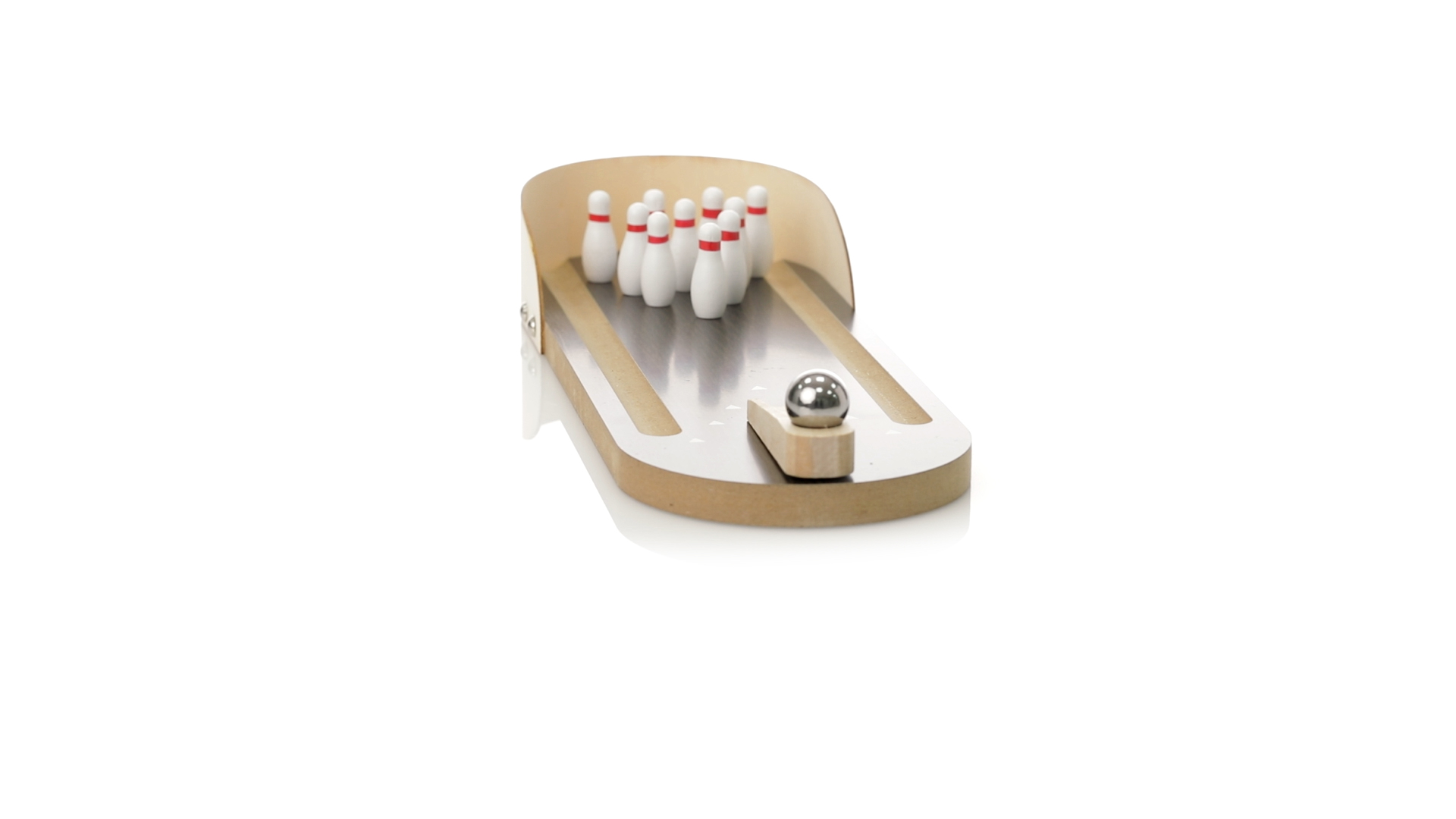 Mini-Bowlingspiel, hergestellt aus widerstandsfähigem Holz. Enthält 10 Pins und Metallkugel, mit verstellbarer Abschussrampe. Testen Sie Ihre Fähigkeiten mit diesem lustigen und süchtig machenden Spiel. Präsentiert in einer attraktiven, individuell gestalteten Box mit Kraftlackierung.