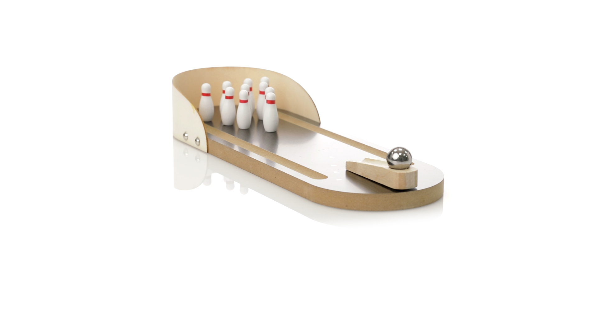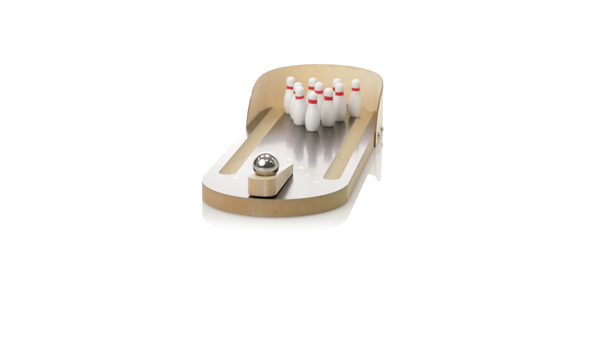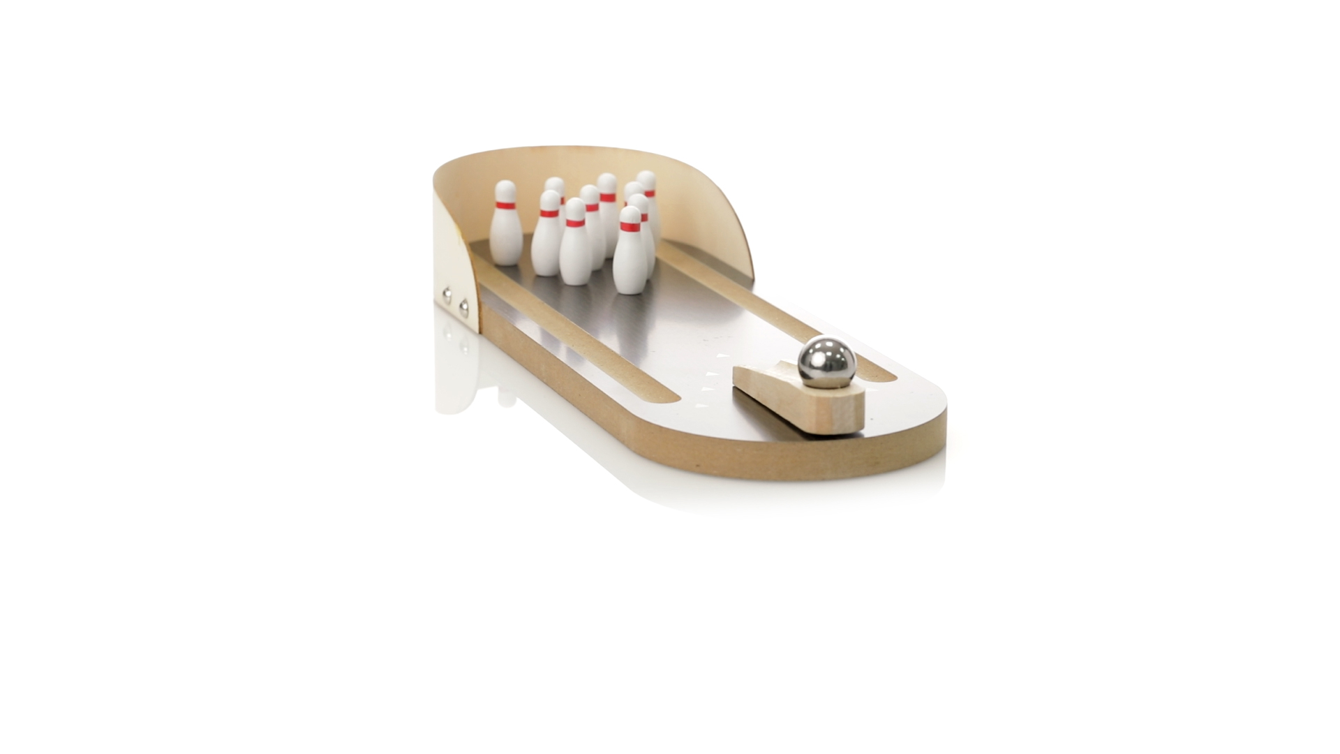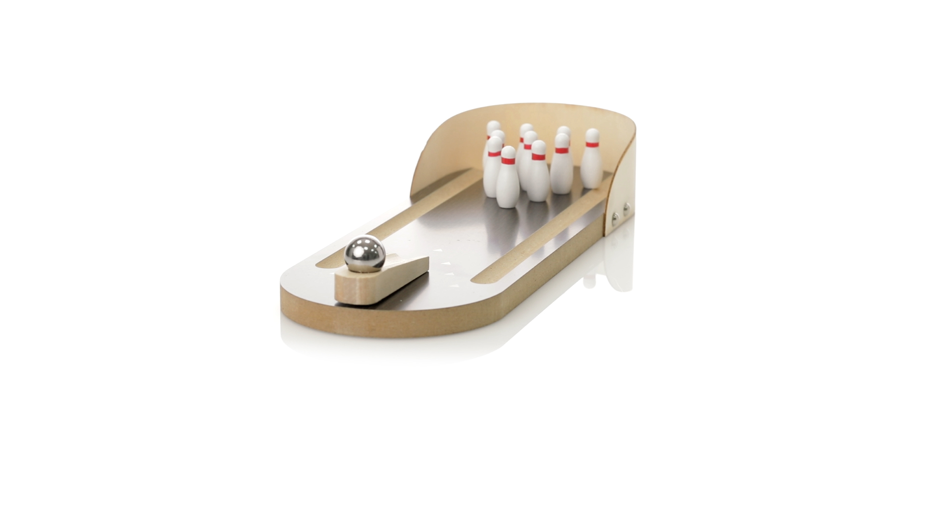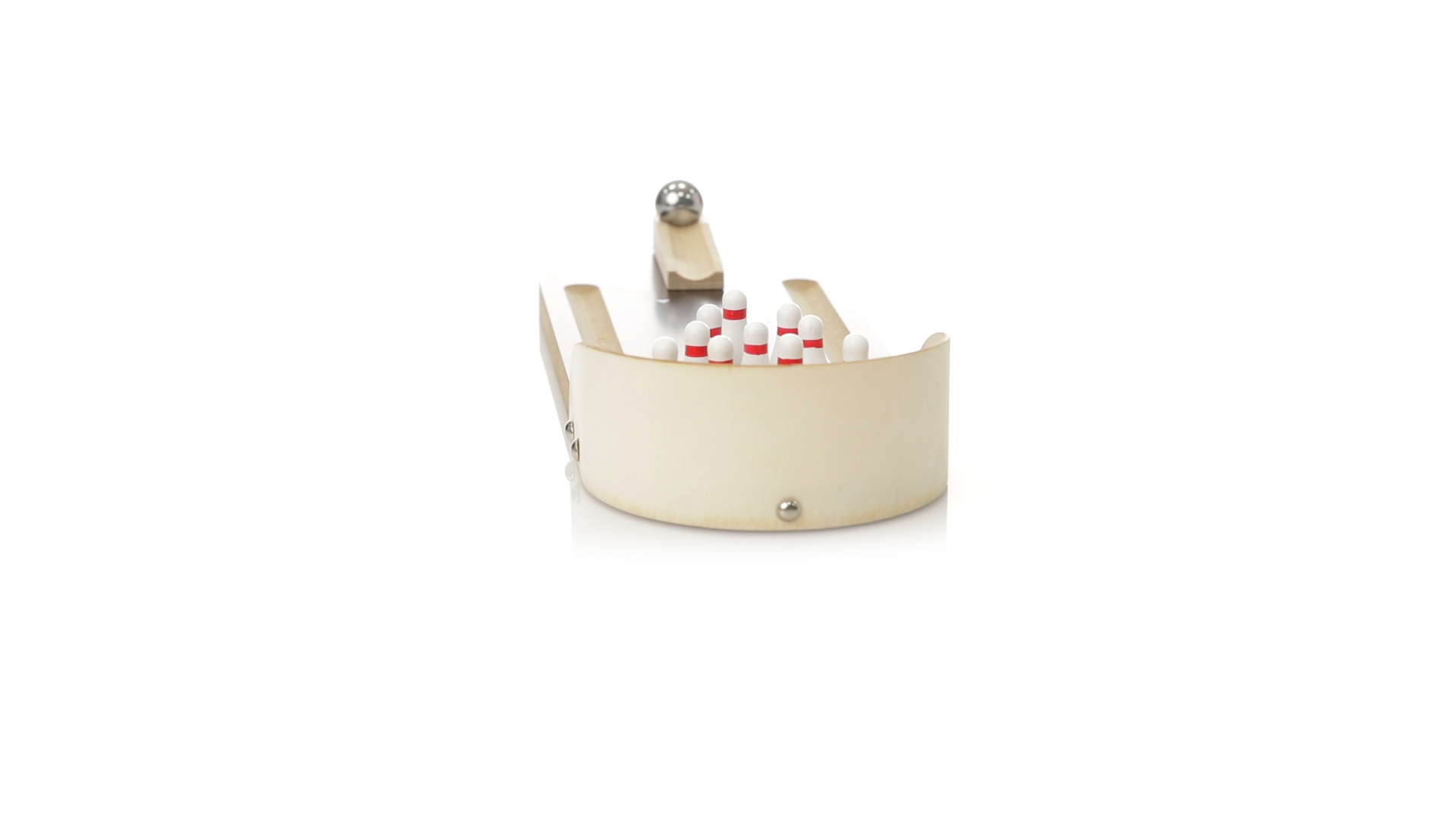 Mini-Bowlingspiel, hergestellt aus widerstandsfähigem Holz. Enthält 10 Pins und Metallkugel, mit verstellbarer Abschussrampe. Testen Sie Ihre Fähigkeiten mit diesem lustigen und süchtig machenden Spiel. Präsentiert in einer attraktiven, individuell gestalteten Box mit Kraftlackierung.