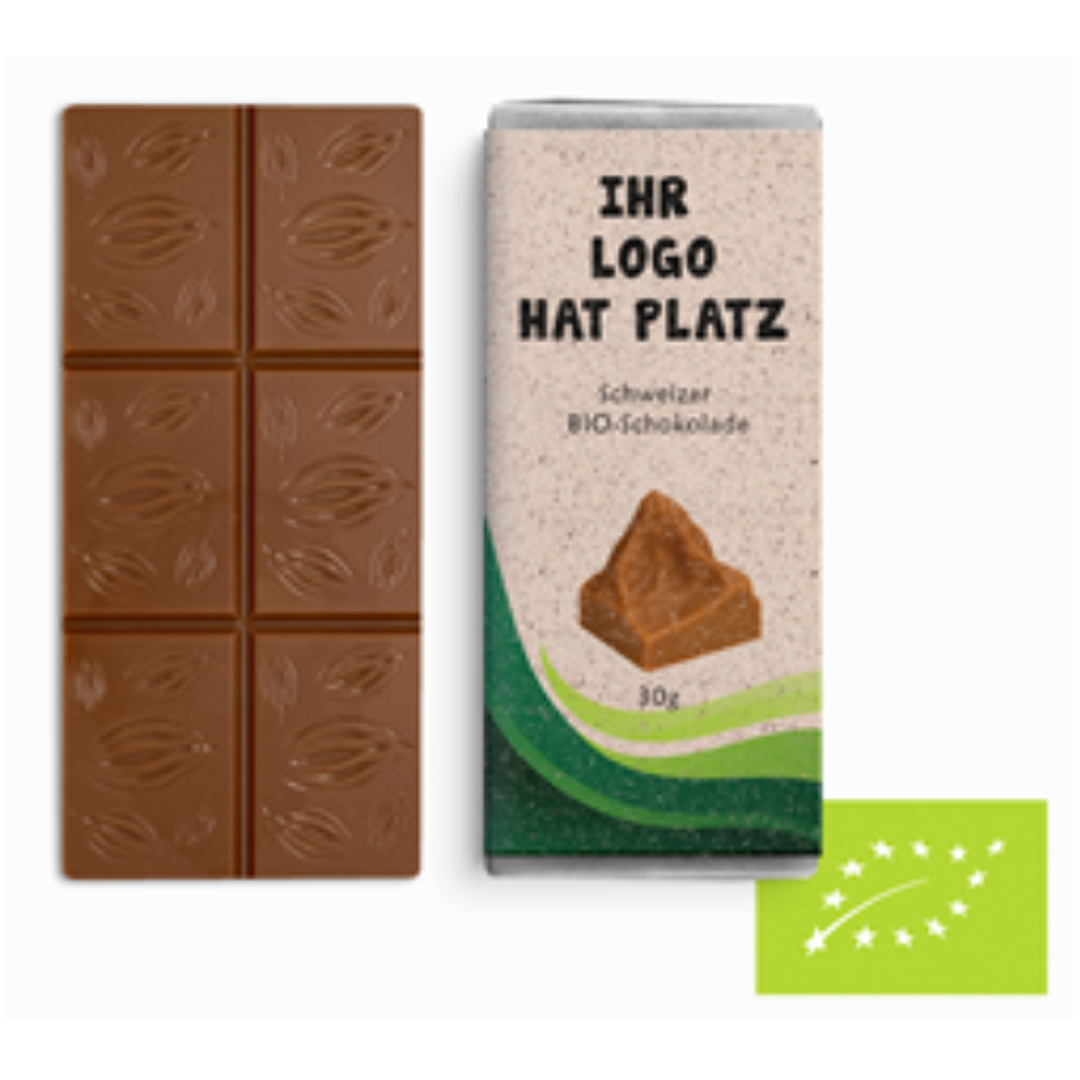 Die Mini Schokoladentafel 30 g in Bio-Qualität gefertigt aus erlesener Schweizer Couvertüre von Max Felchlin überzeugt durch exzellenten Geschmack, edle Verpackungsoptionen und ein kompaktes Format – perfekt für Marken, die Eindruck hinterlassen wollen.