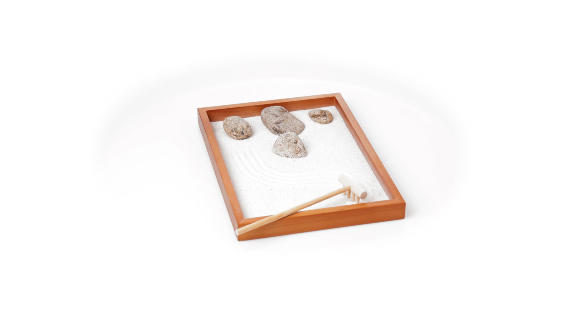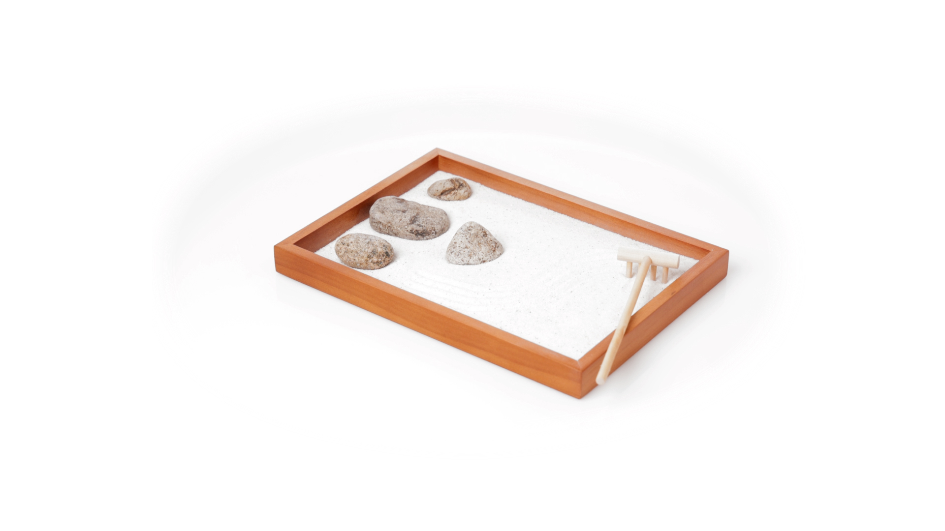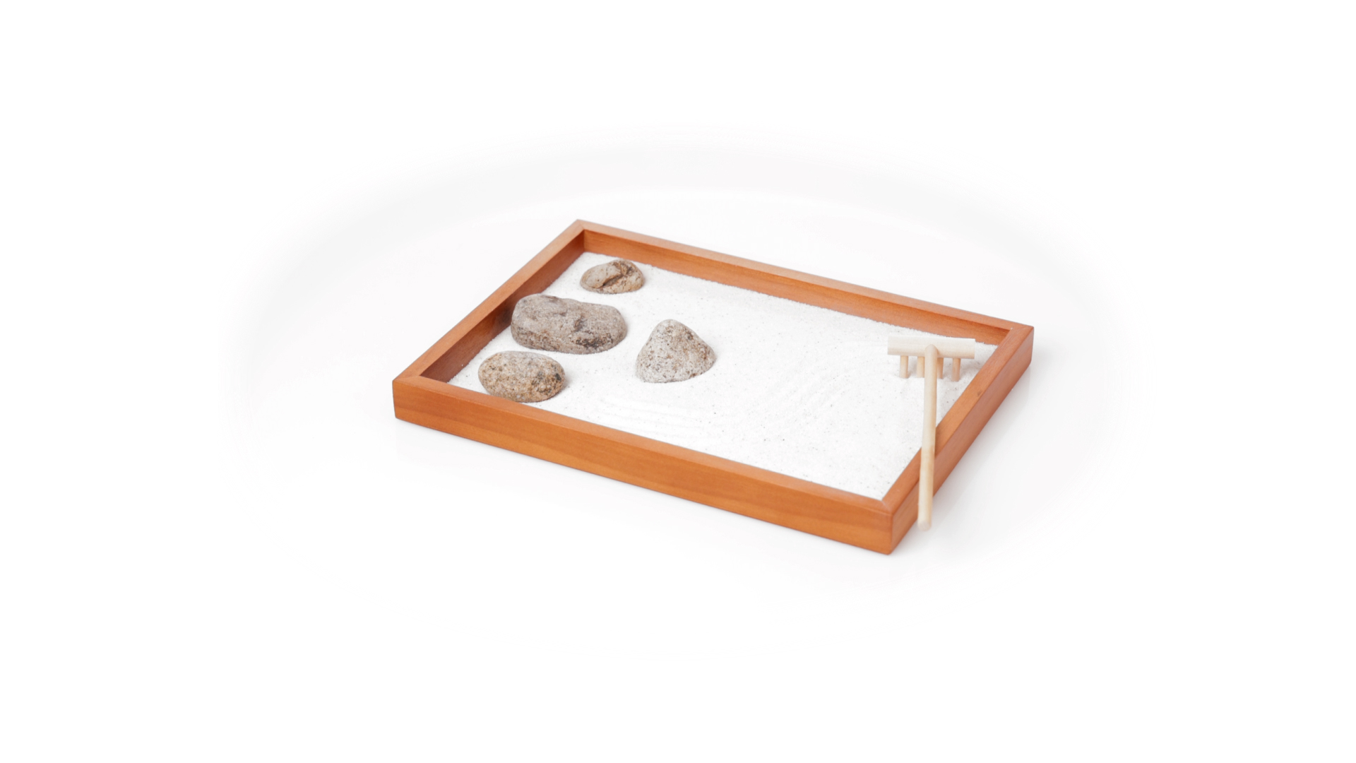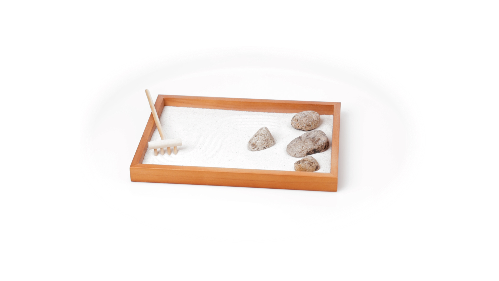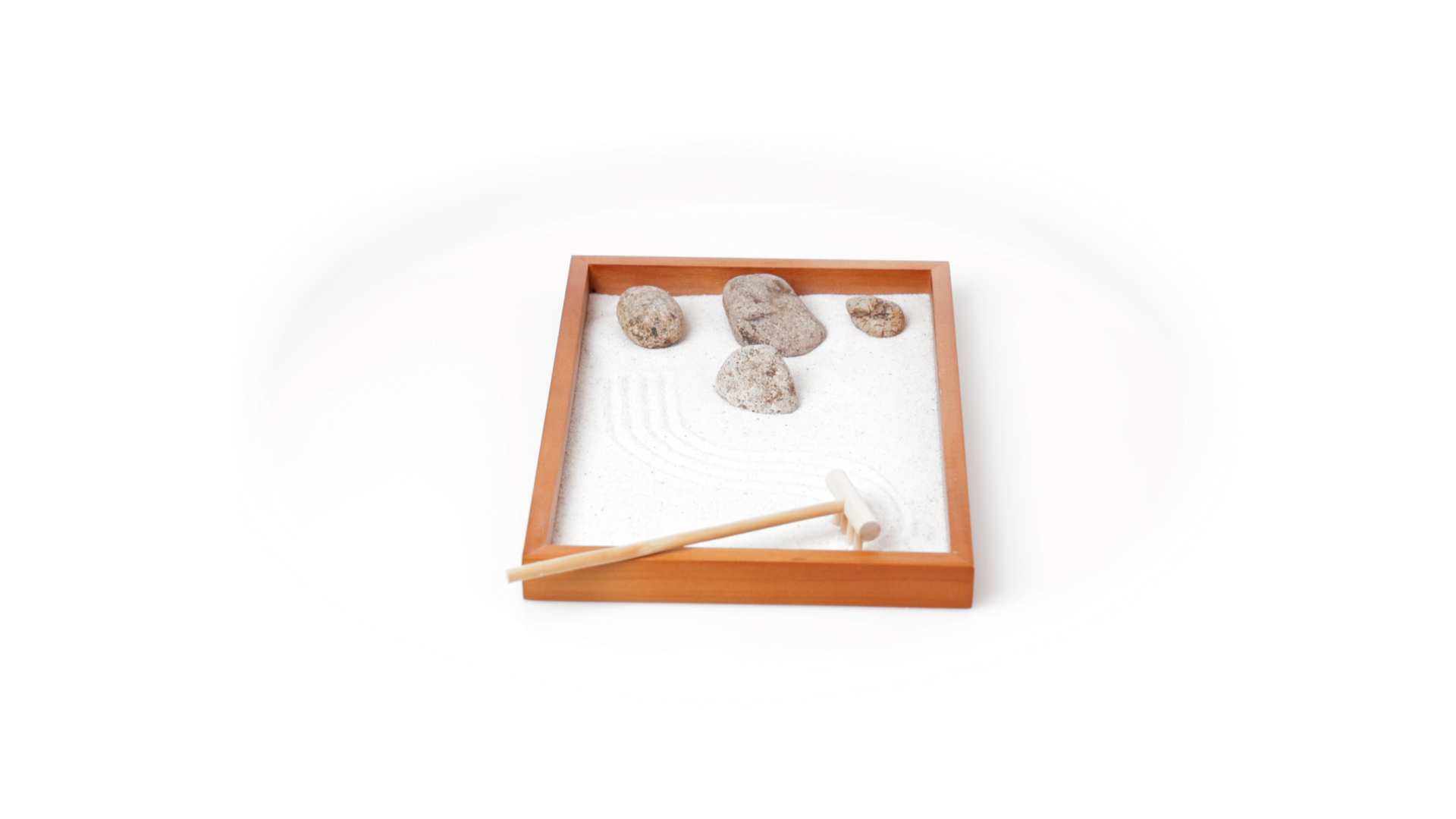 Mini-Zen-Garten für Entspannung und Seelenfrieden. Container Basis und Harke aus Naturholz, mit 4 Natursteinen und einem kleinen Beutel mit weissem Sand. Präsentiert in einer individuellen Box mit Kraft-Design.