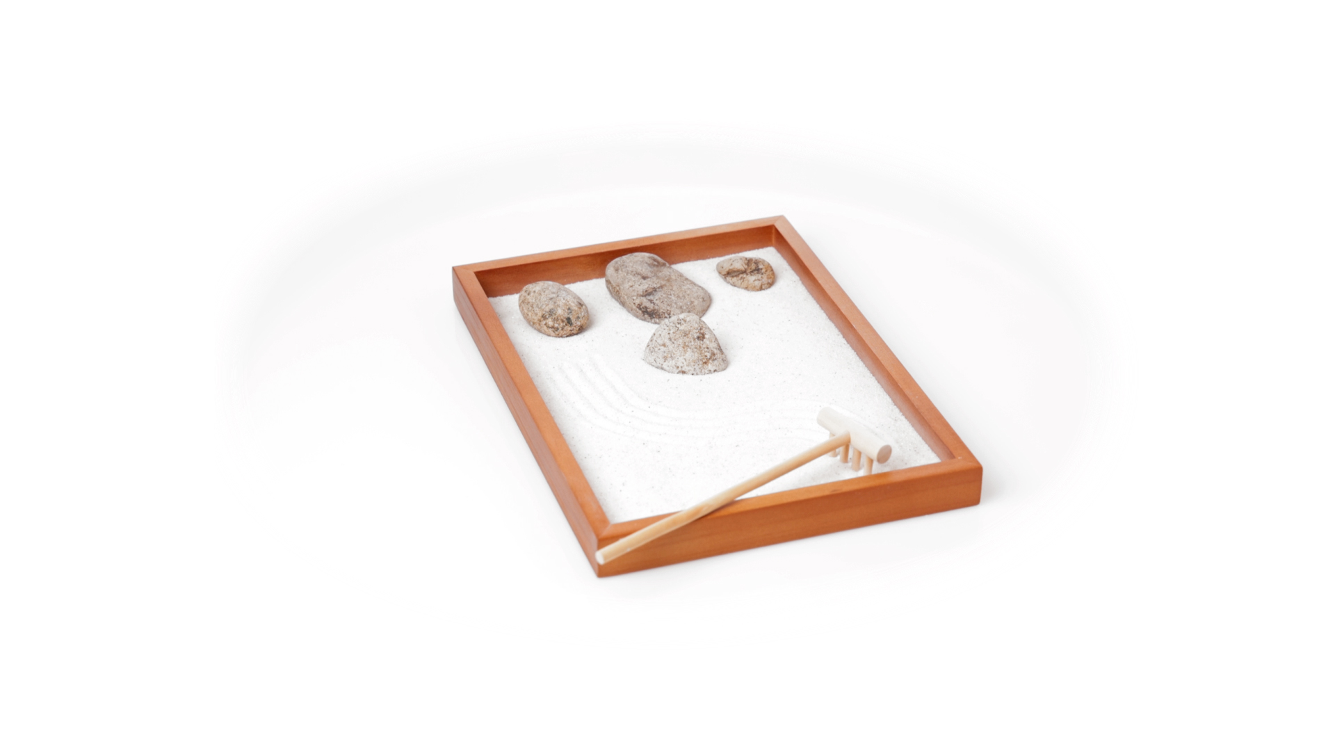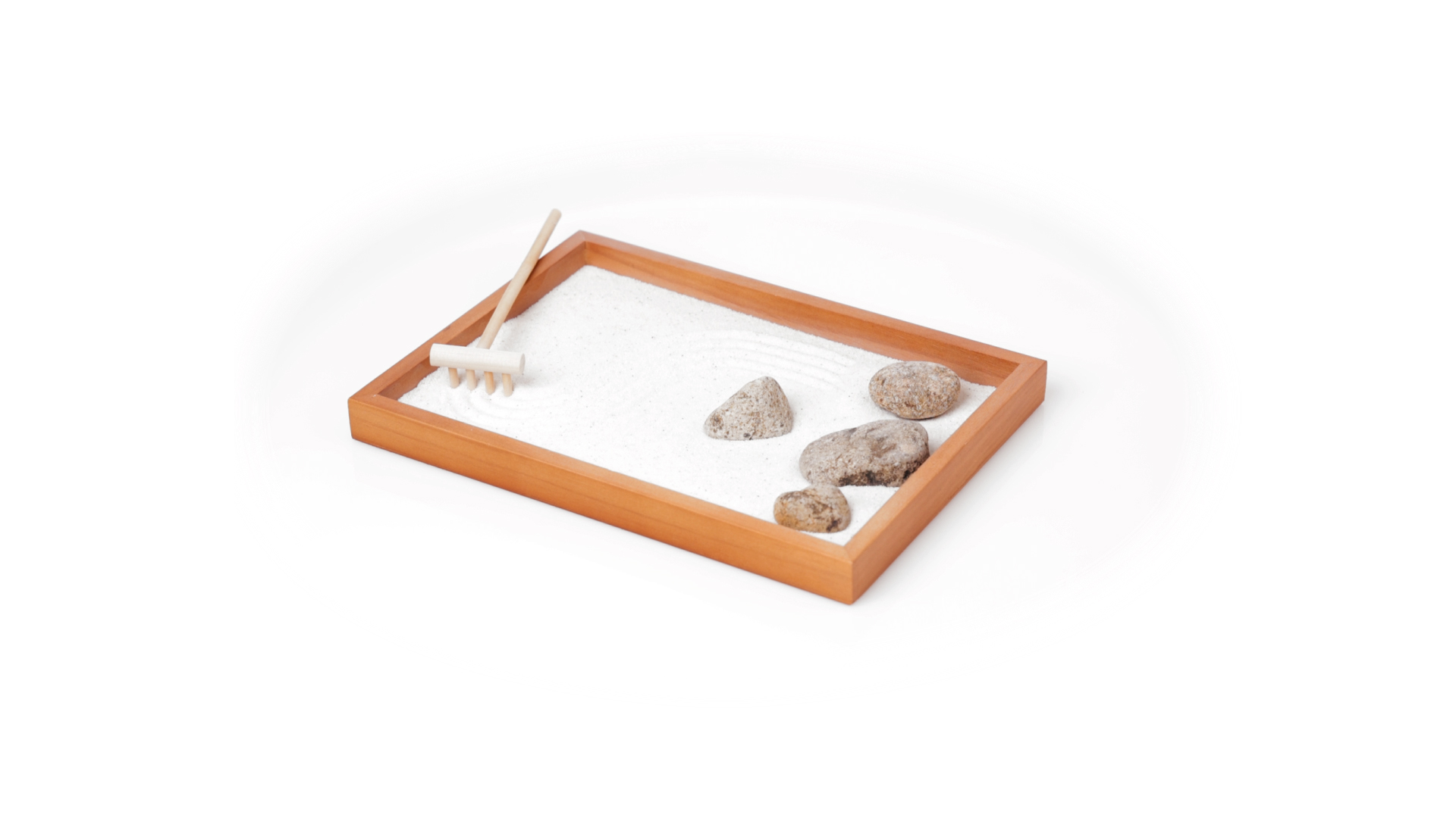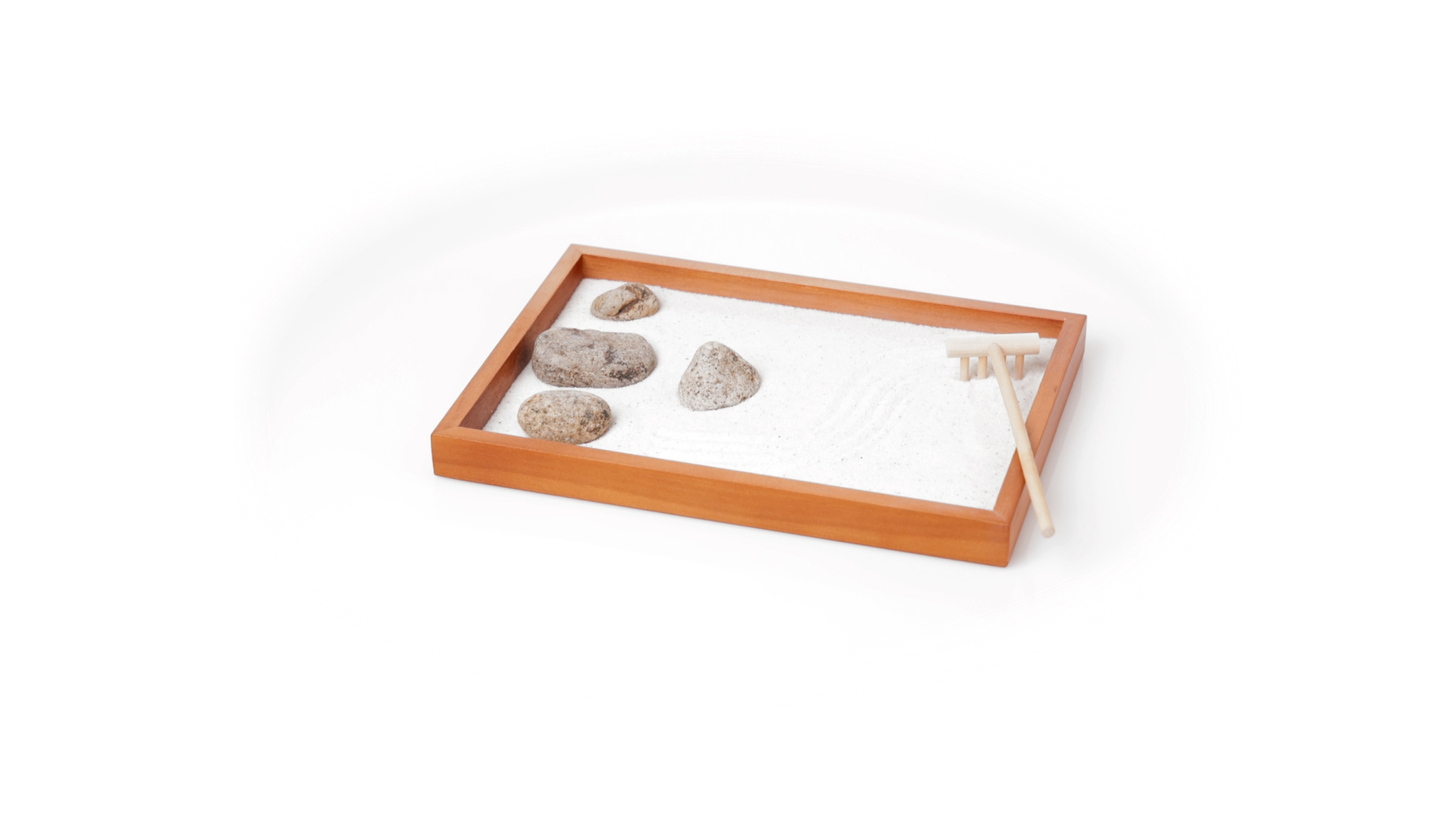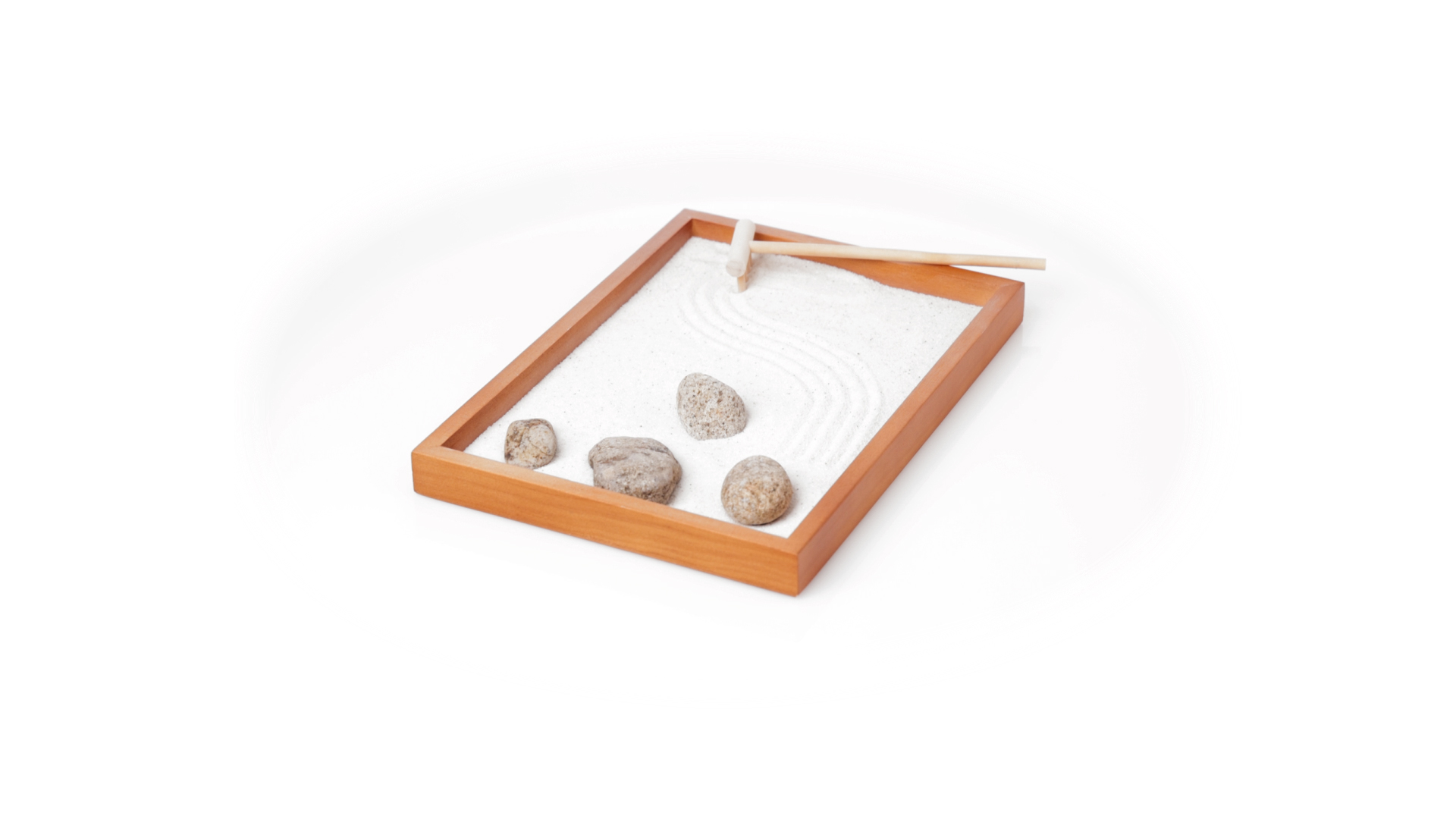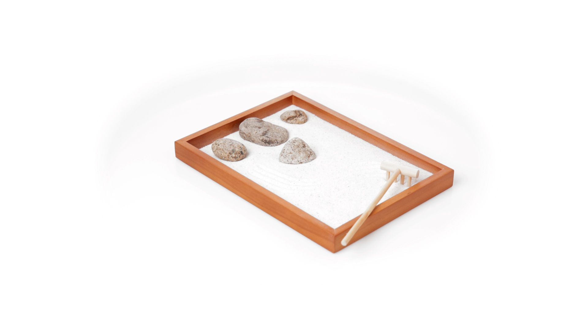 Mini-Zen-Garten für Entspannung und Seelenfrieden. Container Basis und Harke aus Naturholz, mit 4 Natursteinen und einem kleinen Beutel mit weissem Sand. Präsentiert in einer individuellen Box mit Kraft-Design.