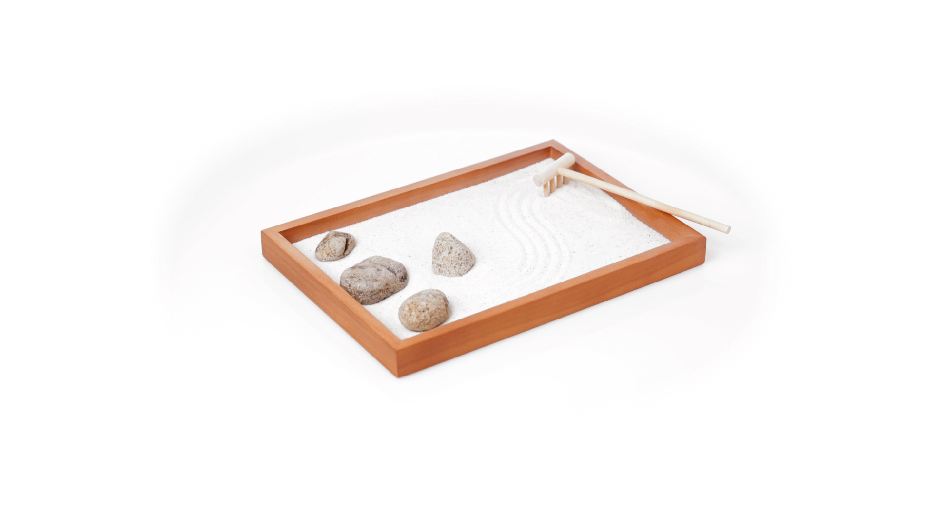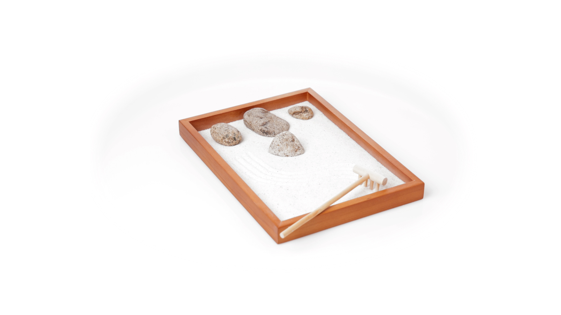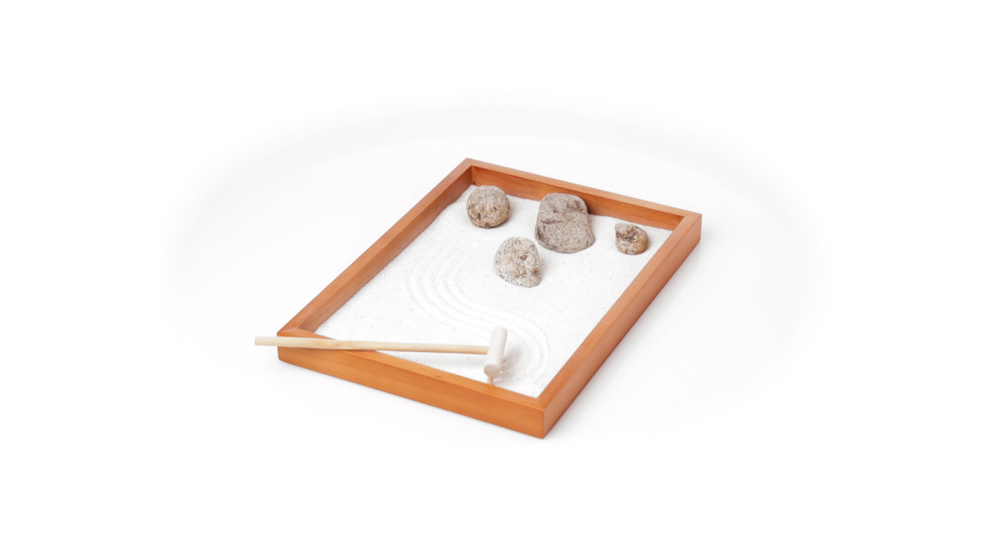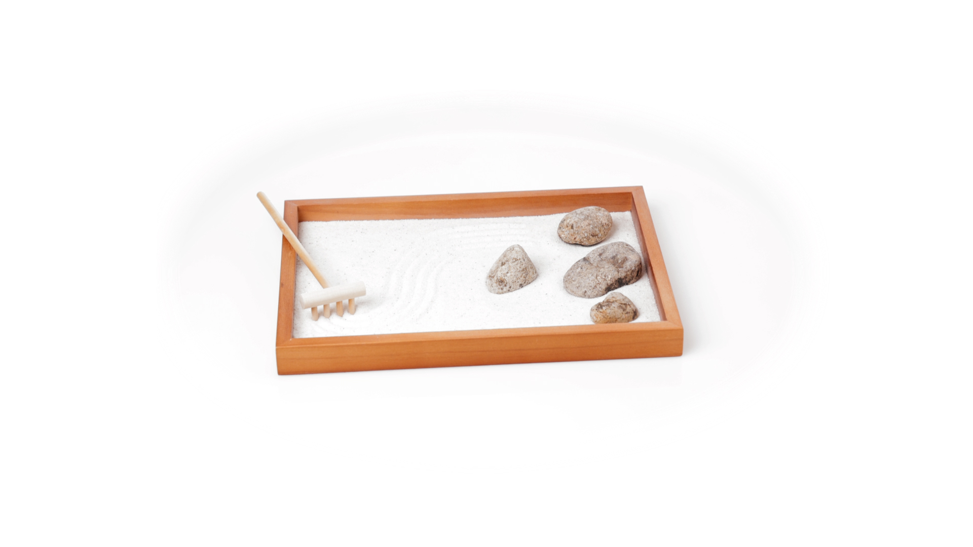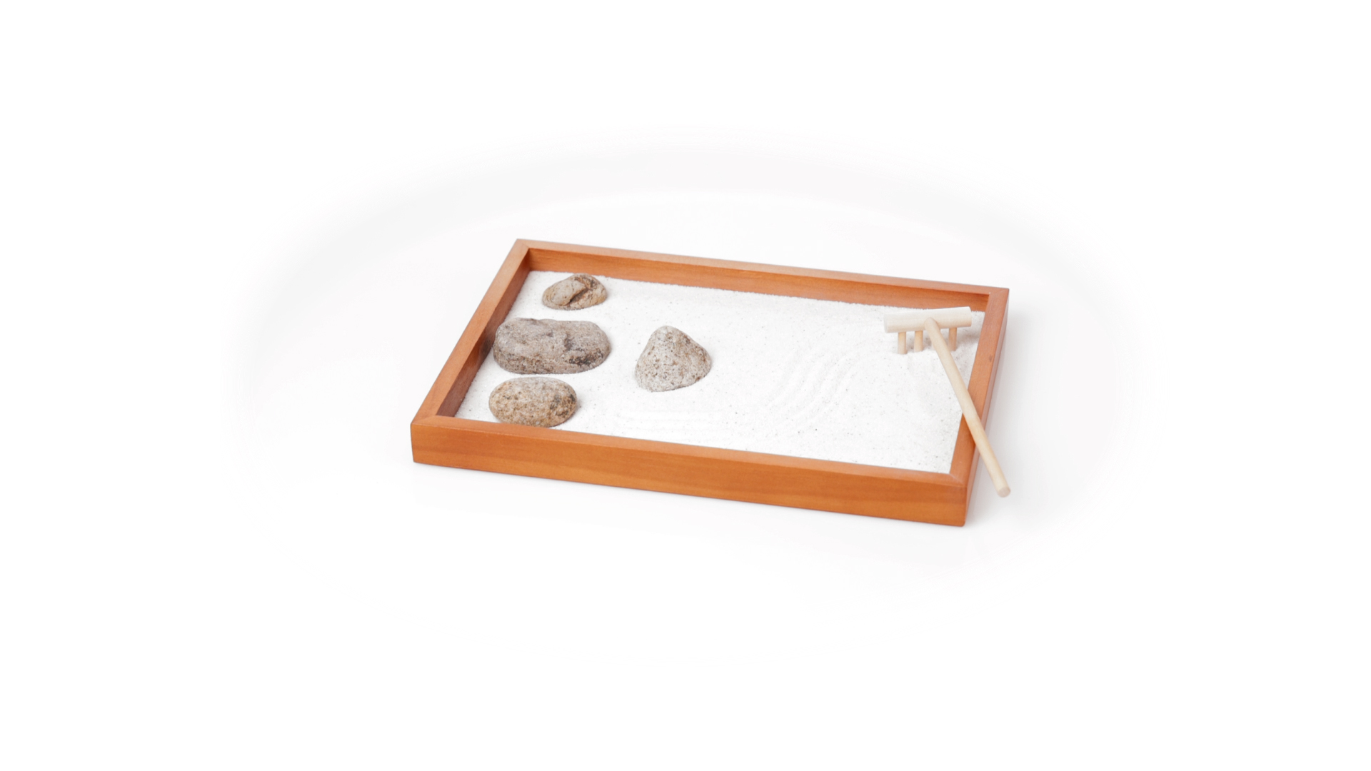 Mini-Zen-Garten für Entspannung und Seelenfrieden. Container Basis und Harke aus Naturholz, mit 4 Natursteinen und einem kleinen Beutel mit weissem Sand. Präsentiert in einer individuellen Box mit Kraft-Design.