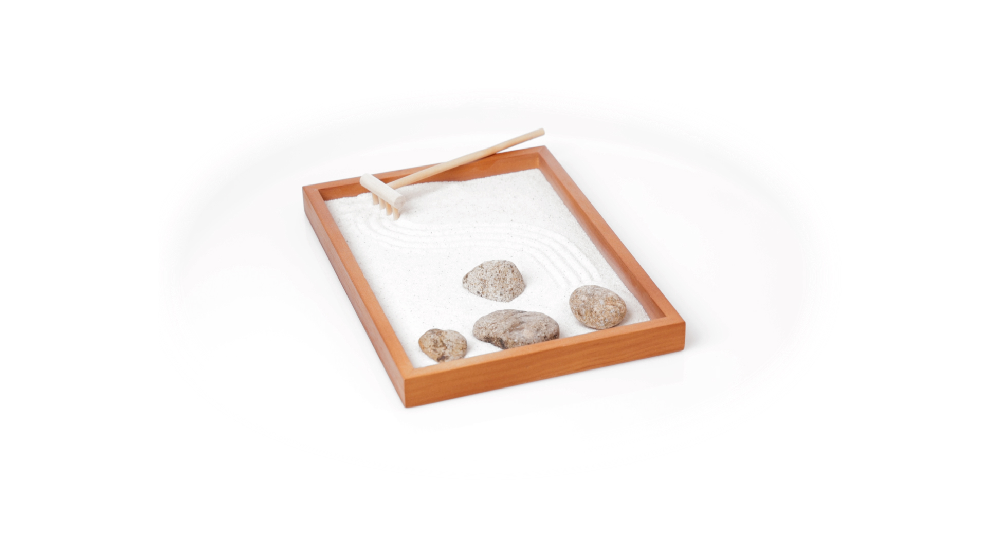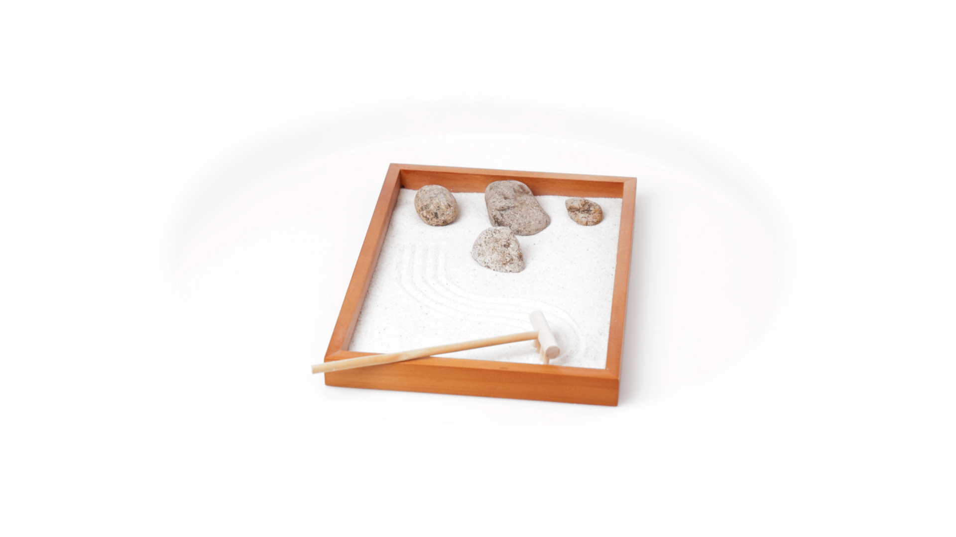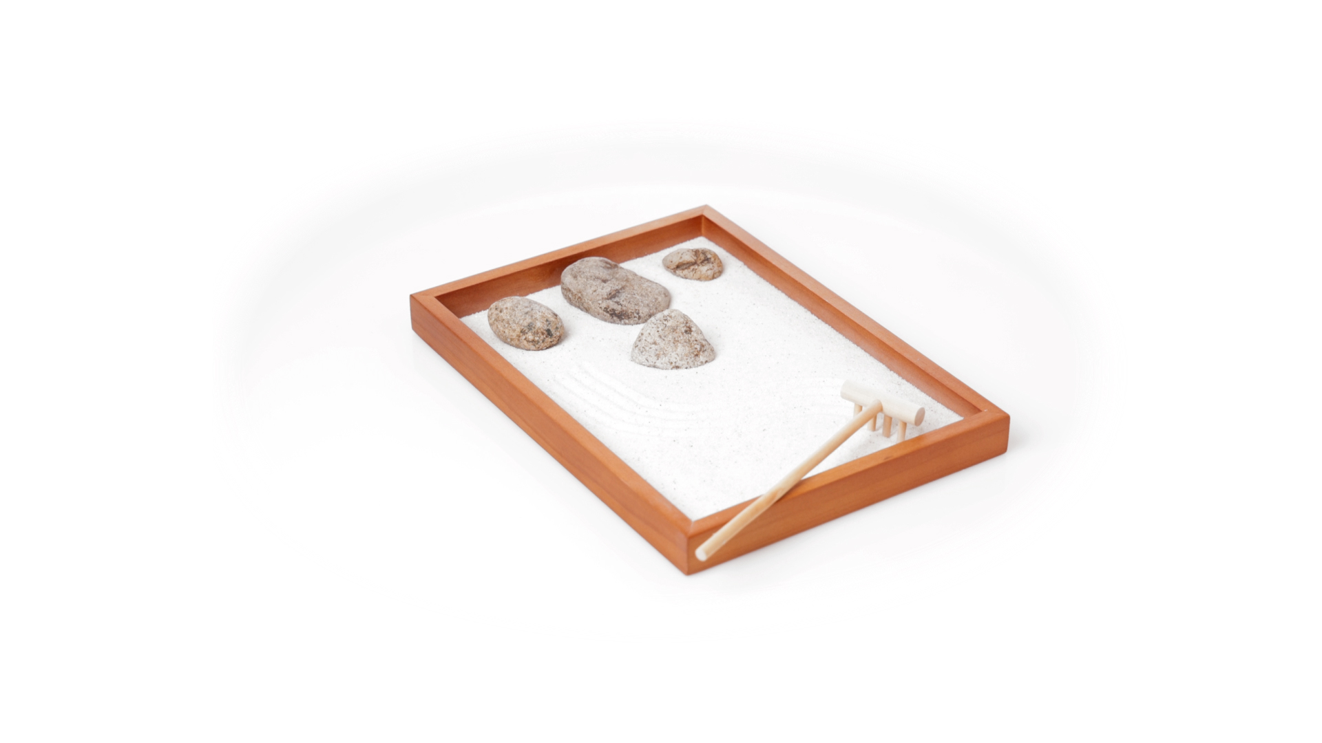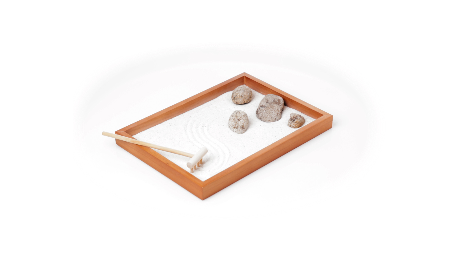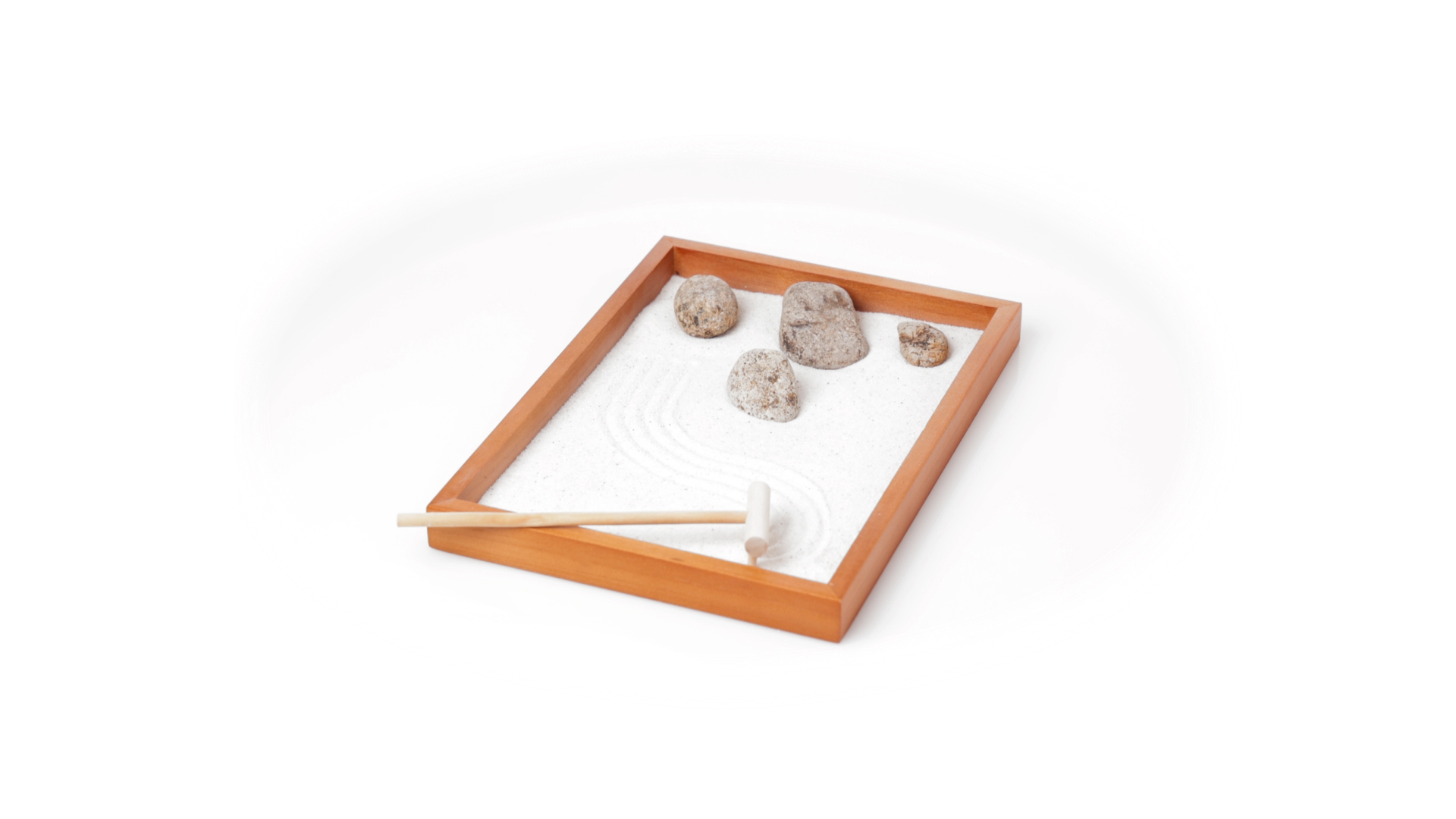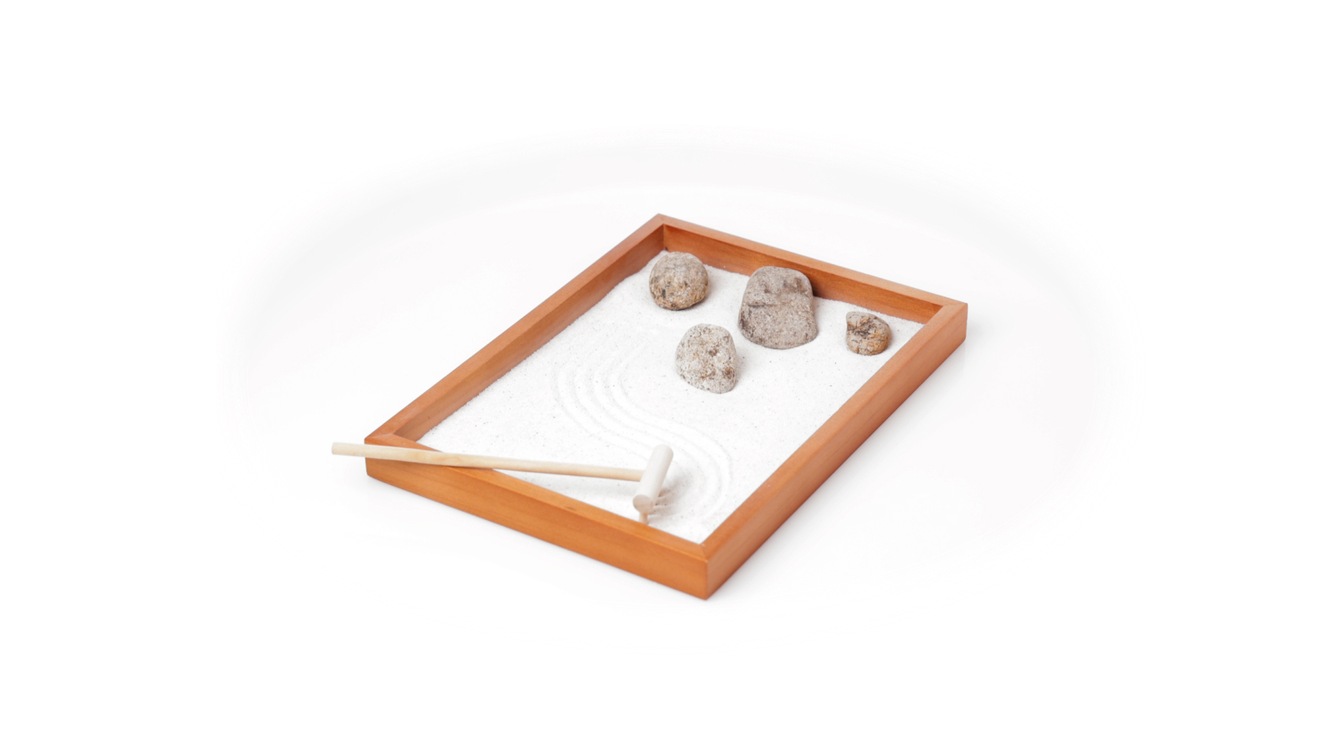 Mini-Zen-Garten für Entspannung und Seelenfrieden. Container Basis und Harke aus Naturholz, mit 4 Natursteinen und einem kleinen Beutel mit weissem Sand. Präsentiert in einer individuellen Box mit Kraft-Design.