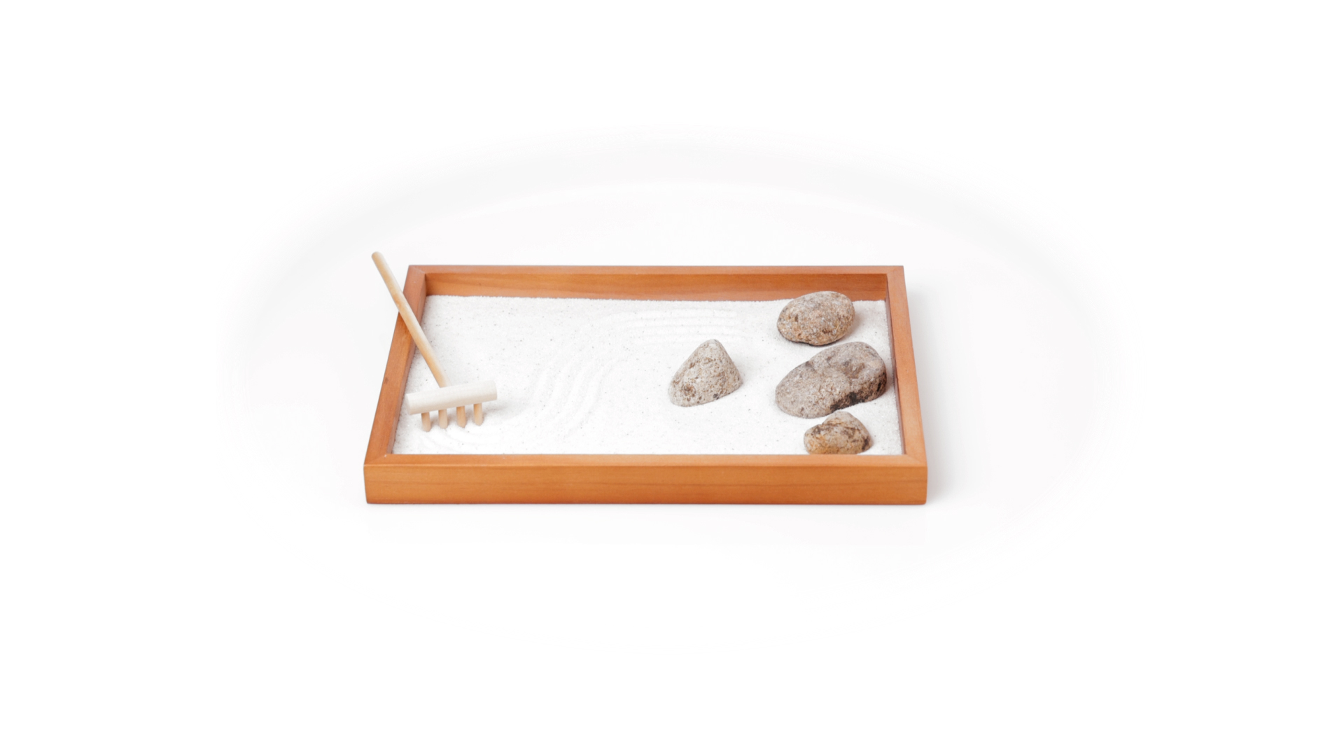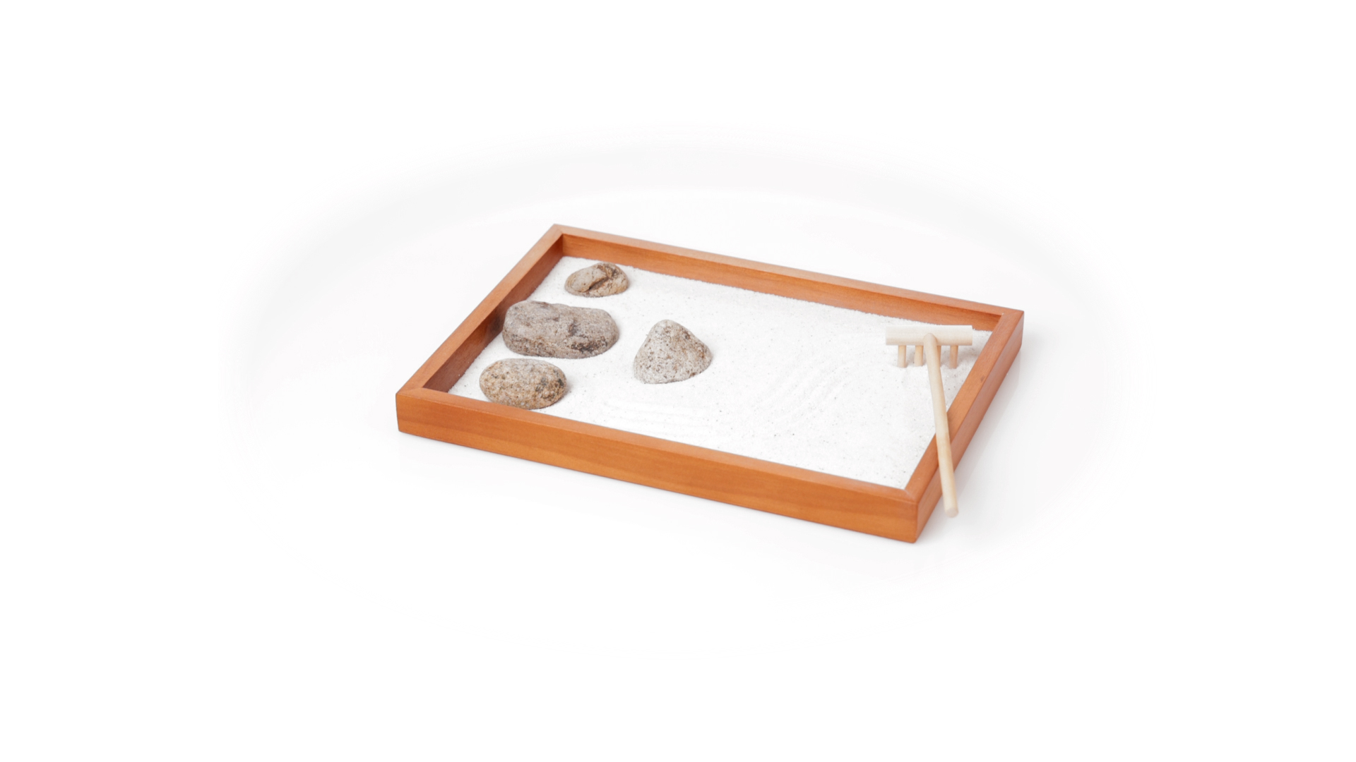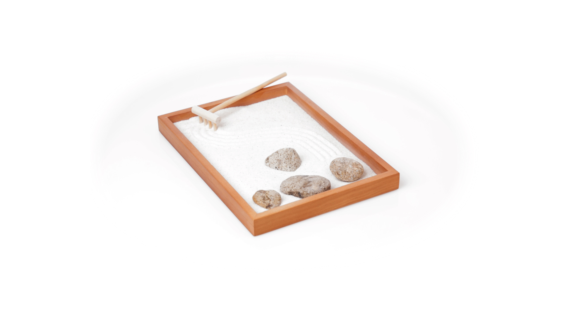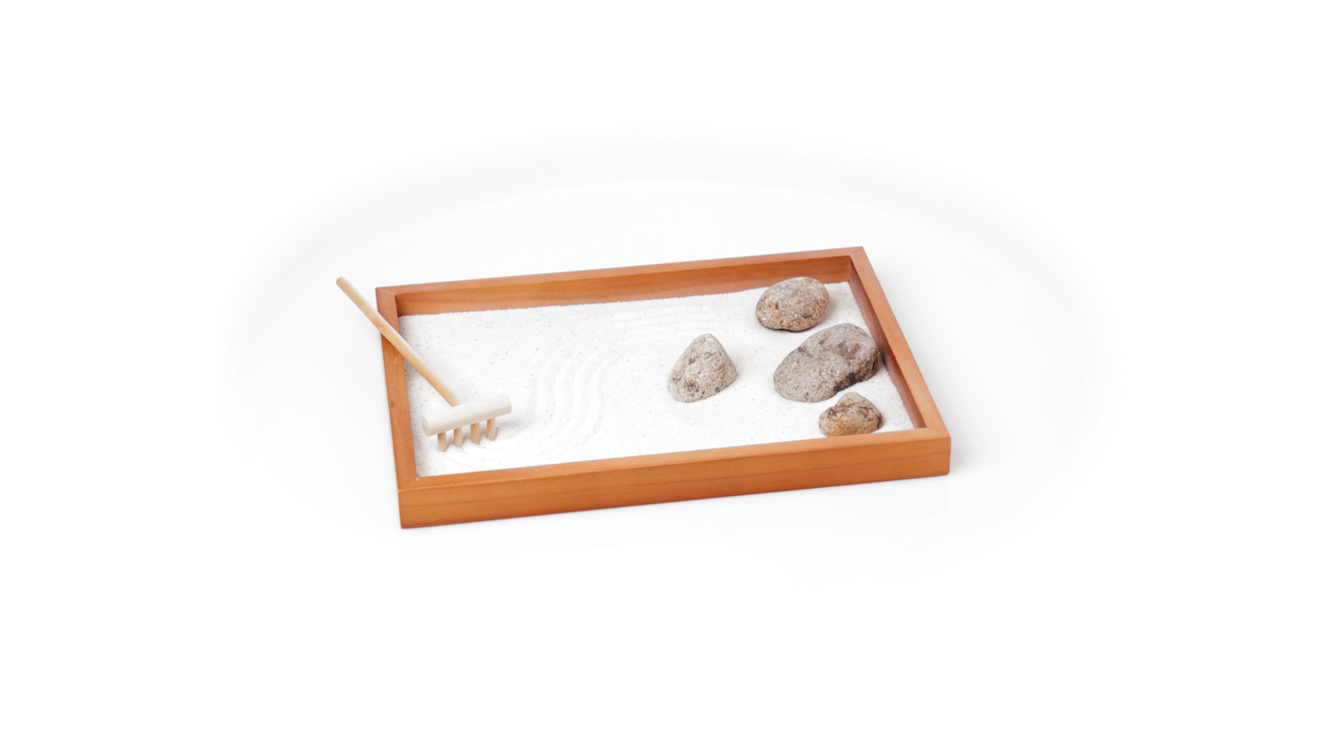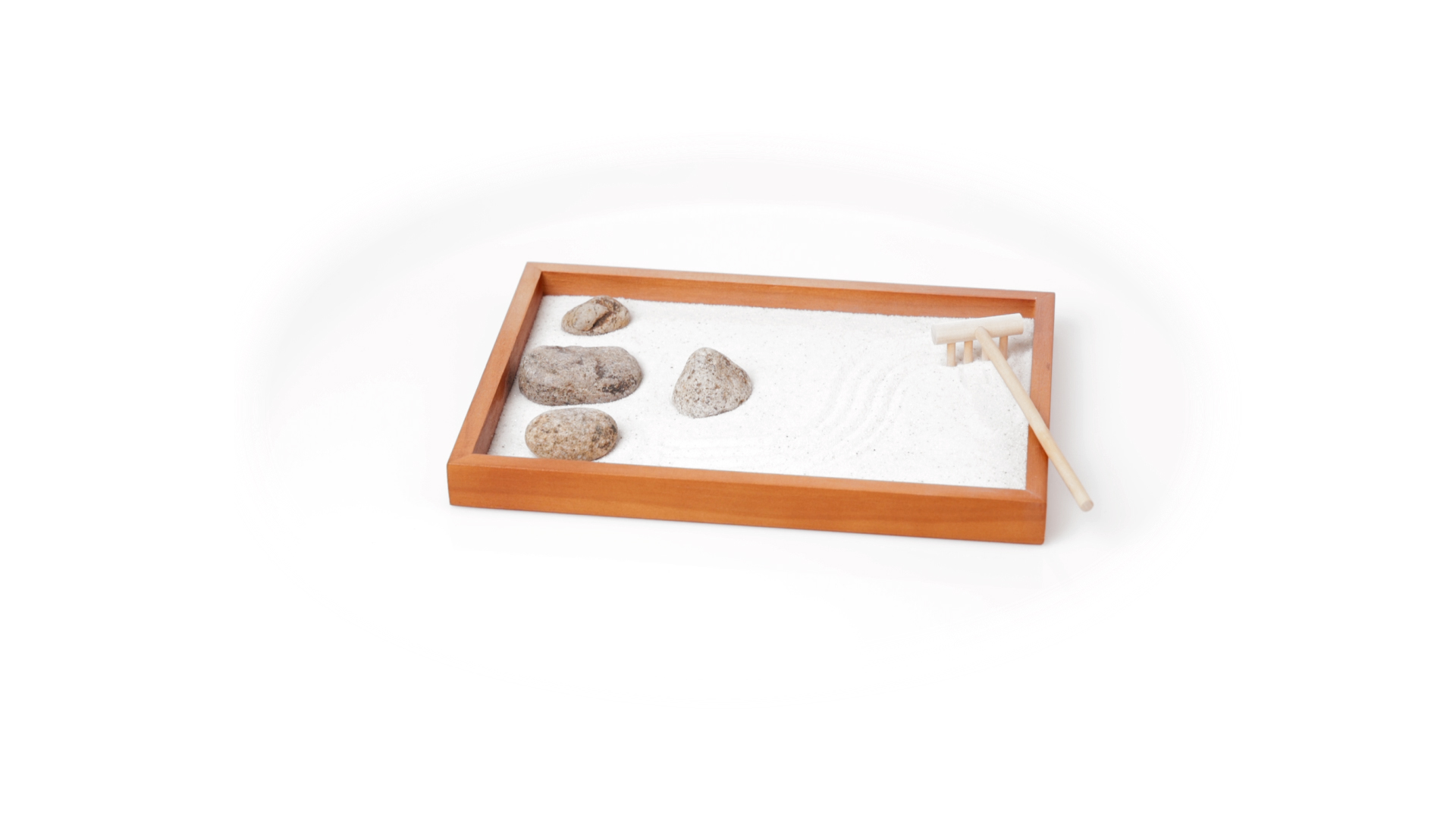 Mini-Zen-Garten für Entspannung und Seelenfrieden. Container Basis und Harke aus Naturholz, mit 4 Natursteinen und einem kleinen Beutel mit weissem Sand. Präsentiert in einer individuellen Box mit Kraft-Design.