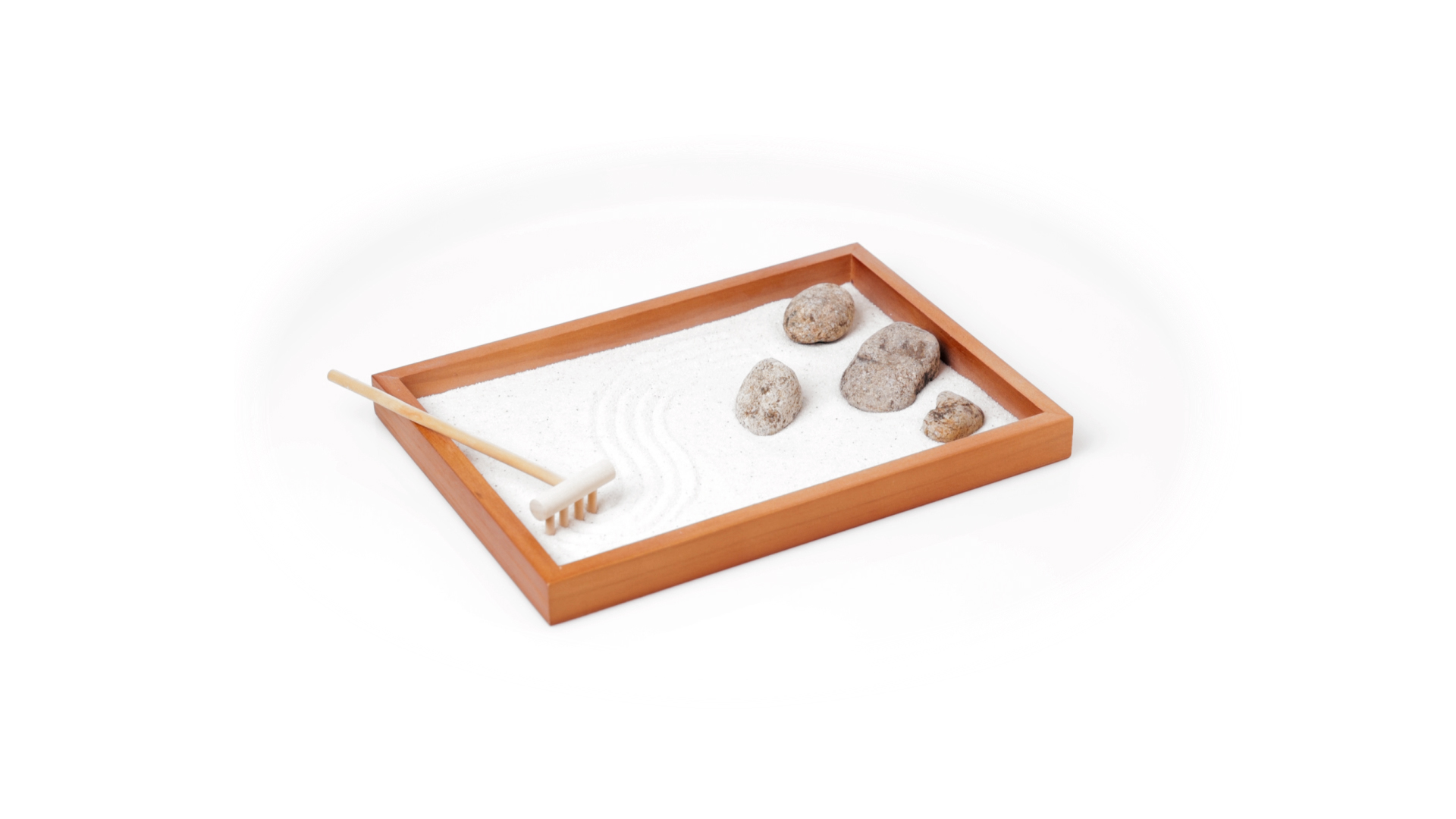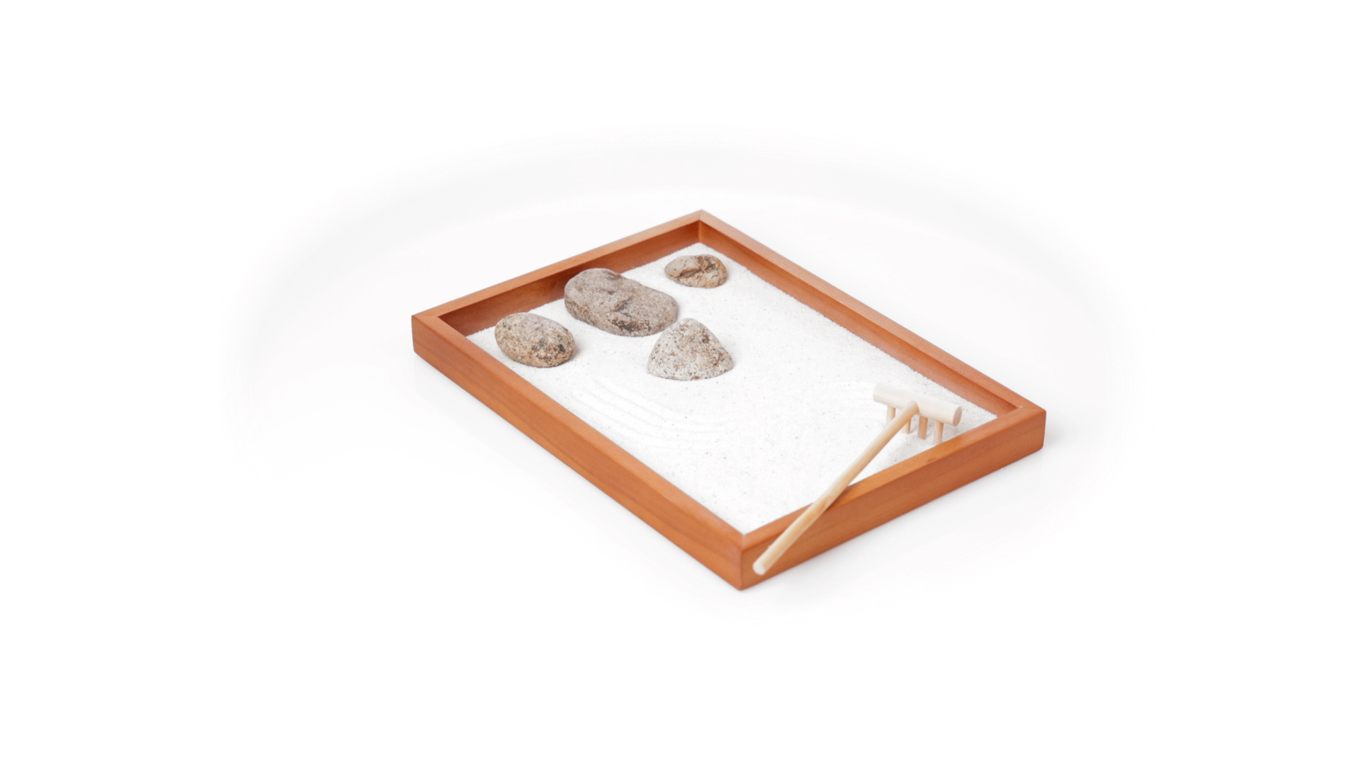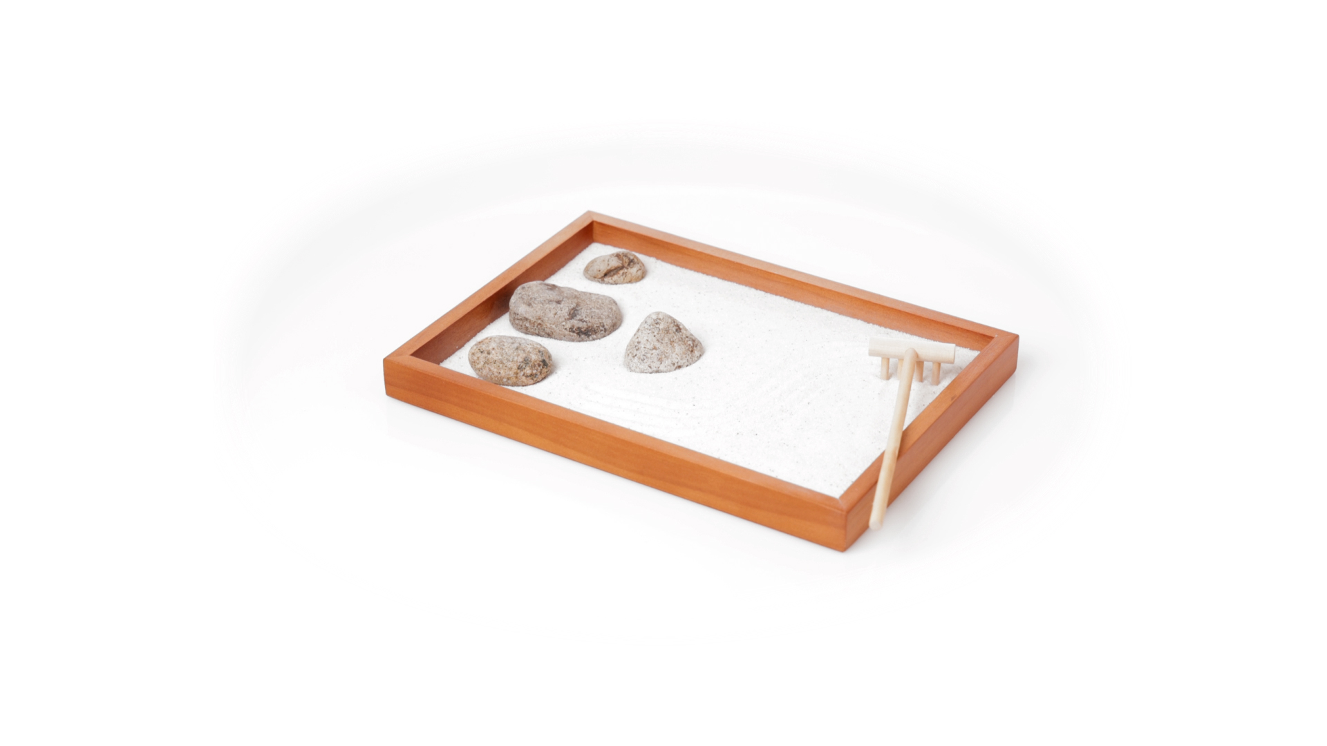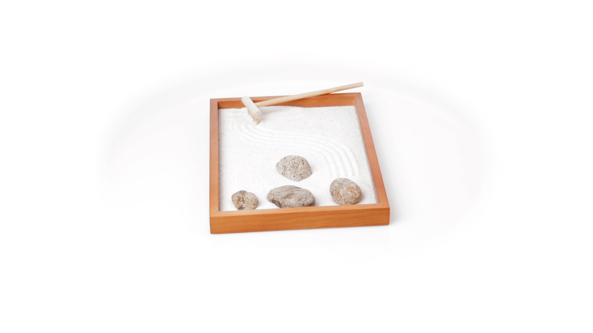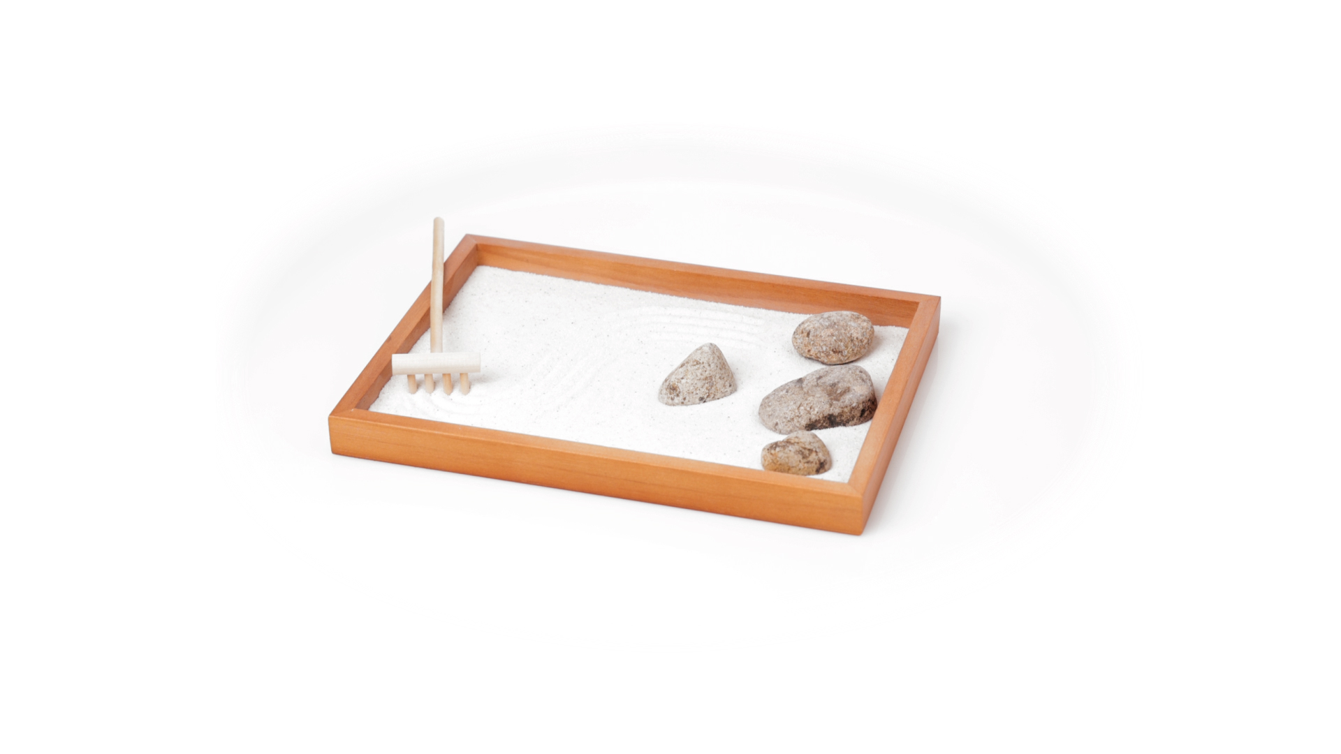 Mini-Zen-Garten für Entspannung und Seelenfrieden. Container Basis und Harke aus Naturholz, mit 4 Natursteinen und einem kleinen Beutel mit weissem Sand. Präsentiert in einer individuellen Box mit Kraft-Design.