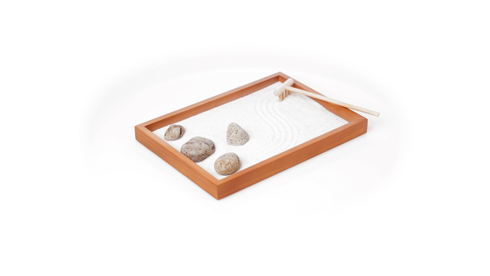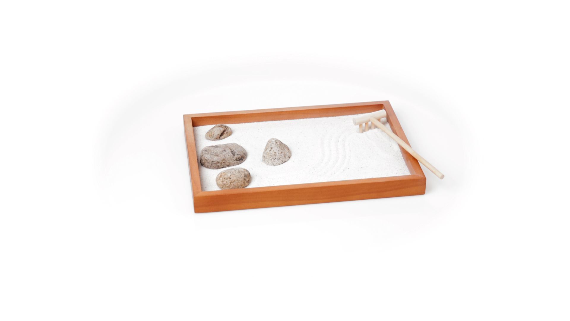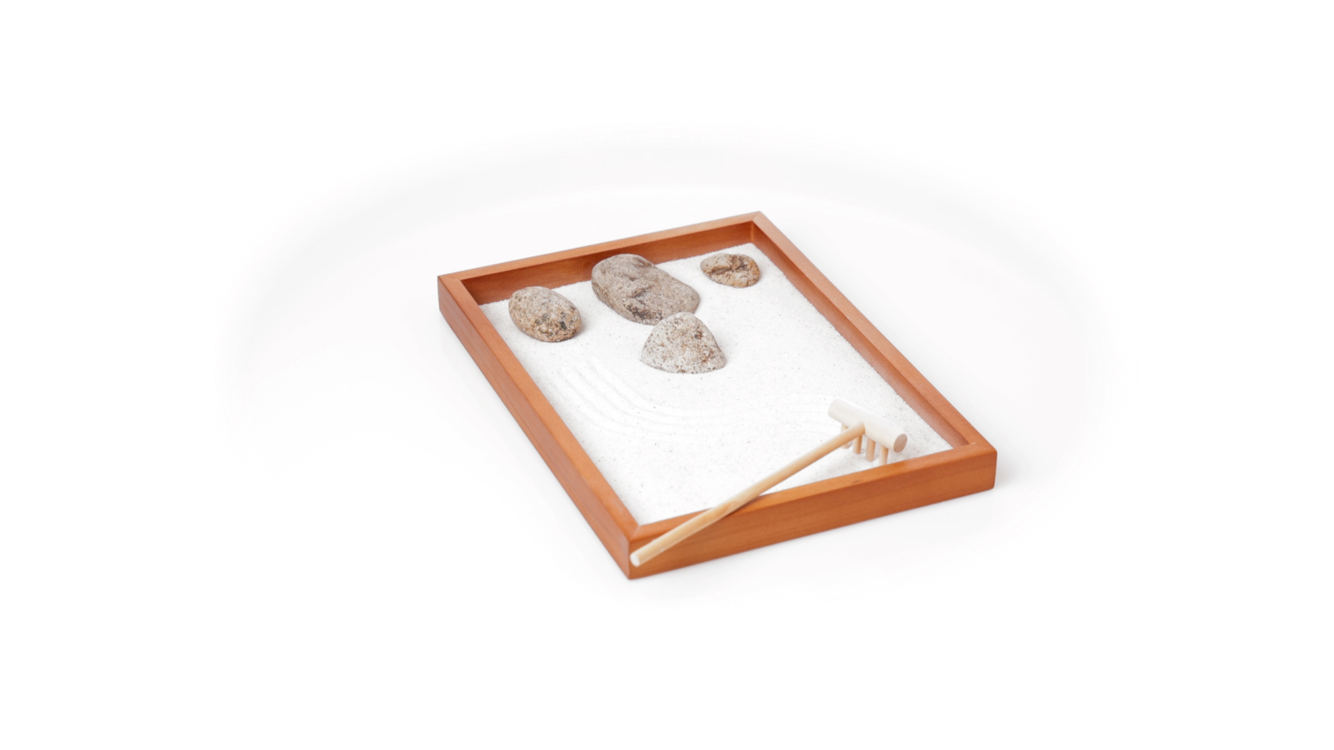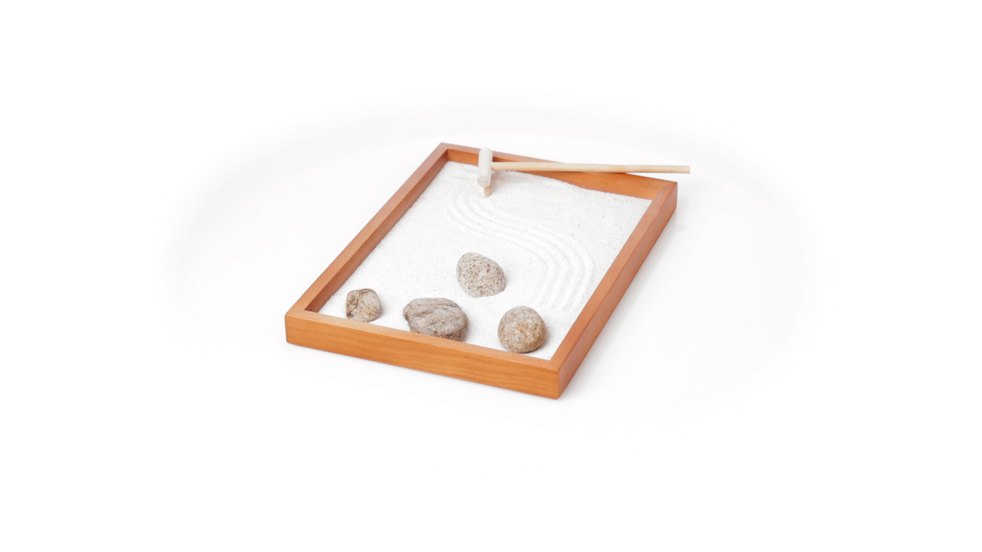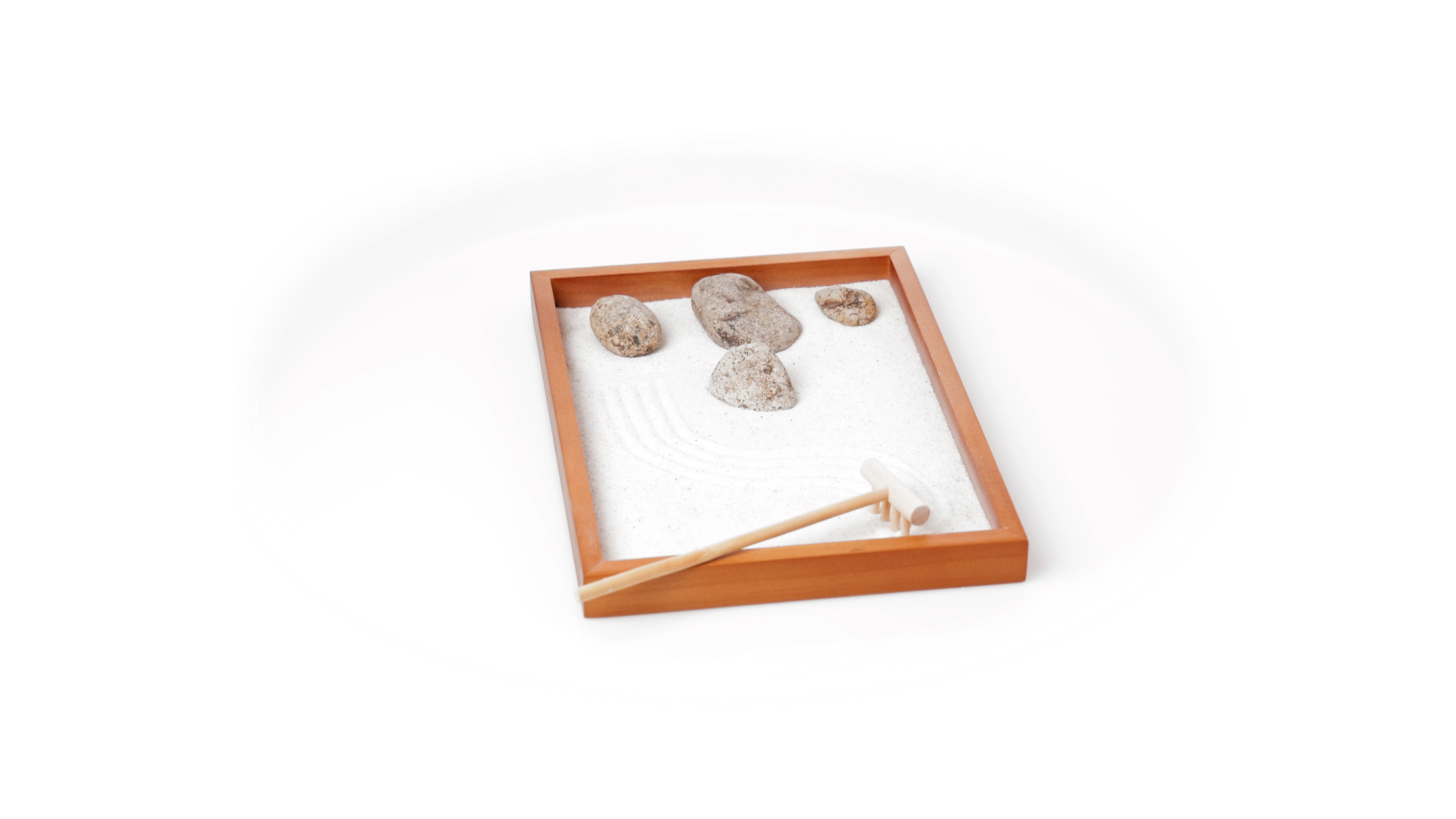Mini-Zen-Garten für Entspannung und Seelenfrieden. Container Basis und Harke aus Naturholz, mit 4 Natursteinen und einem kleinen Beutel mit weissem Sand. Präsentiert in einer individuellen Box mit Kraft-Design.