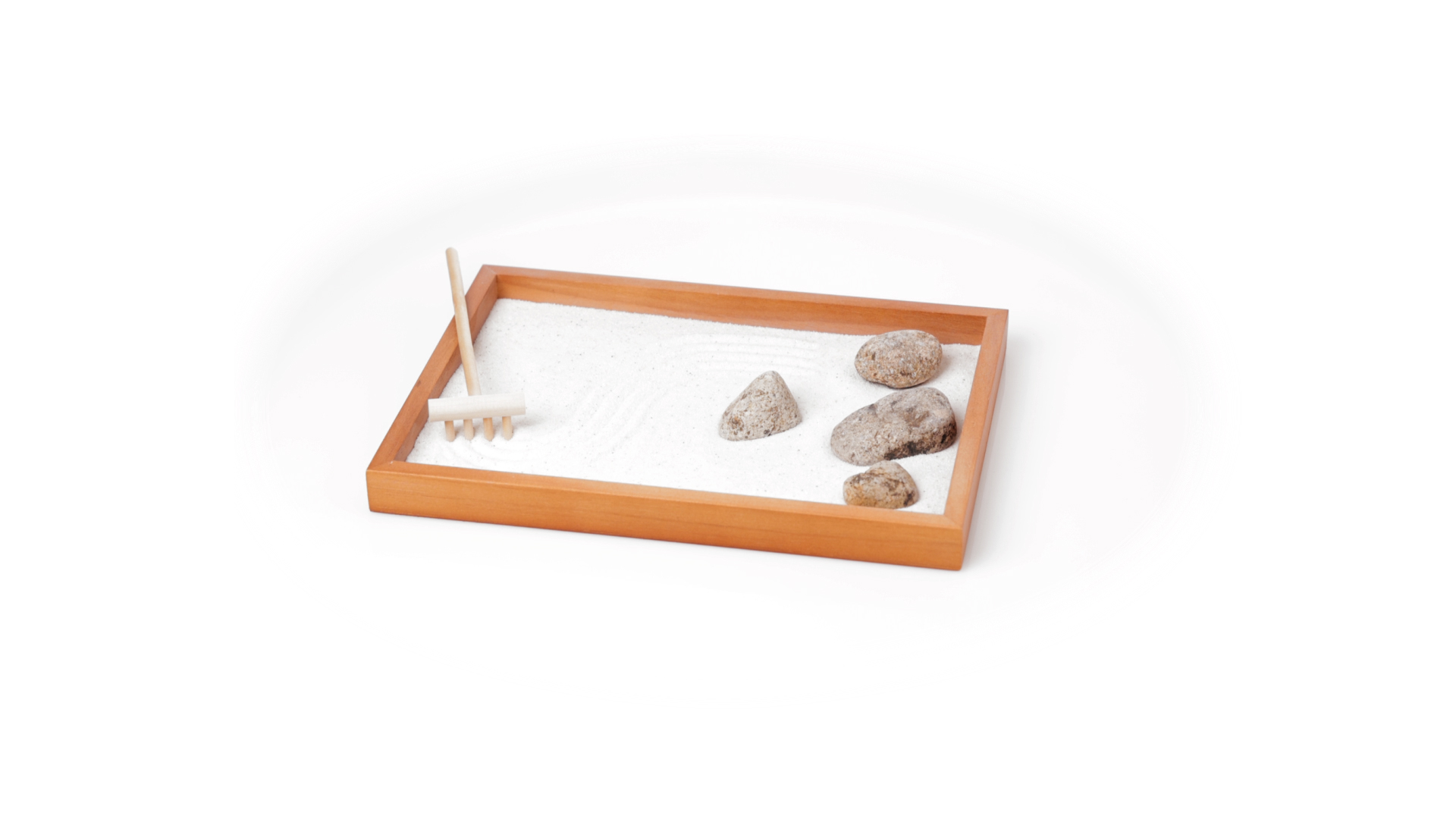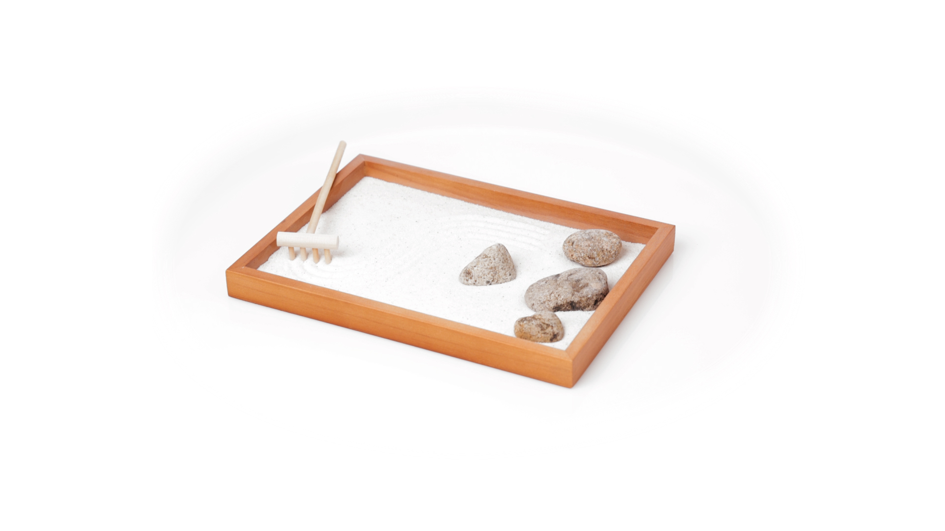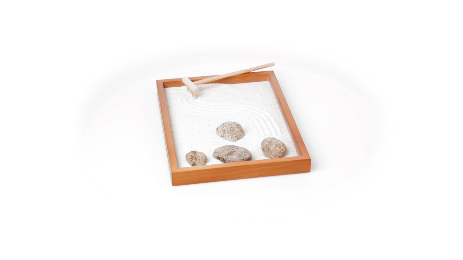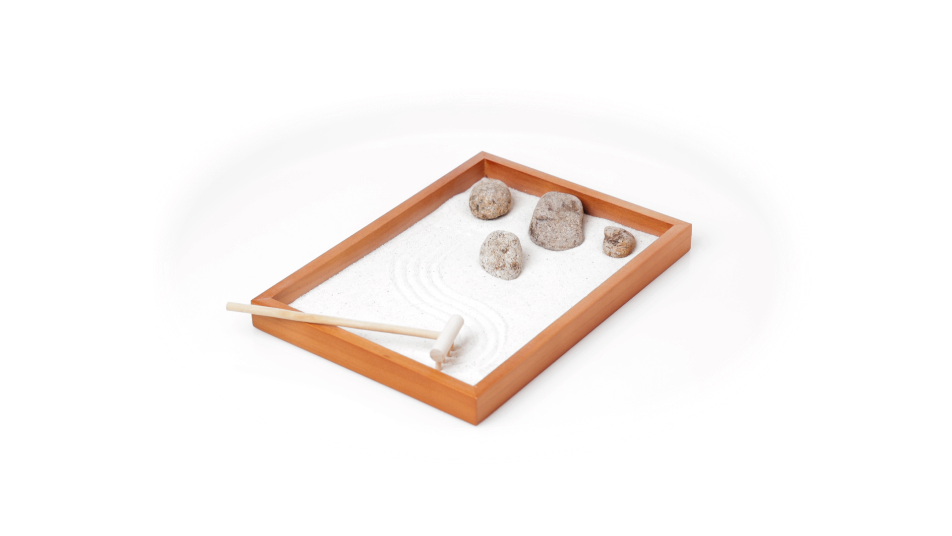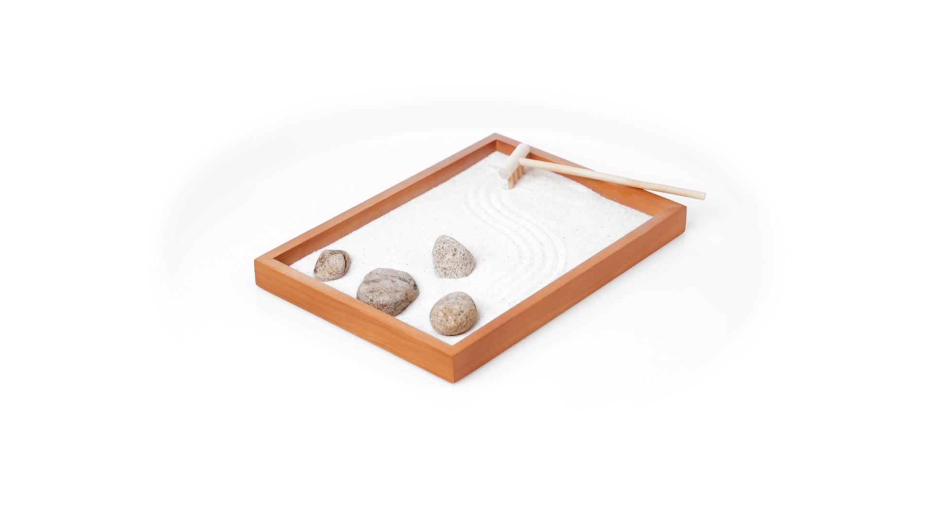 Mini-Zen-Garten für Entspannung und Seelenfrieden. Container Basis und Harke aus Naturholz, mit 4 Natursteinen und einem kleinen Beutel mit weissem Sand. Präsentiert in einer individuellen Box mit Kraft-Design.