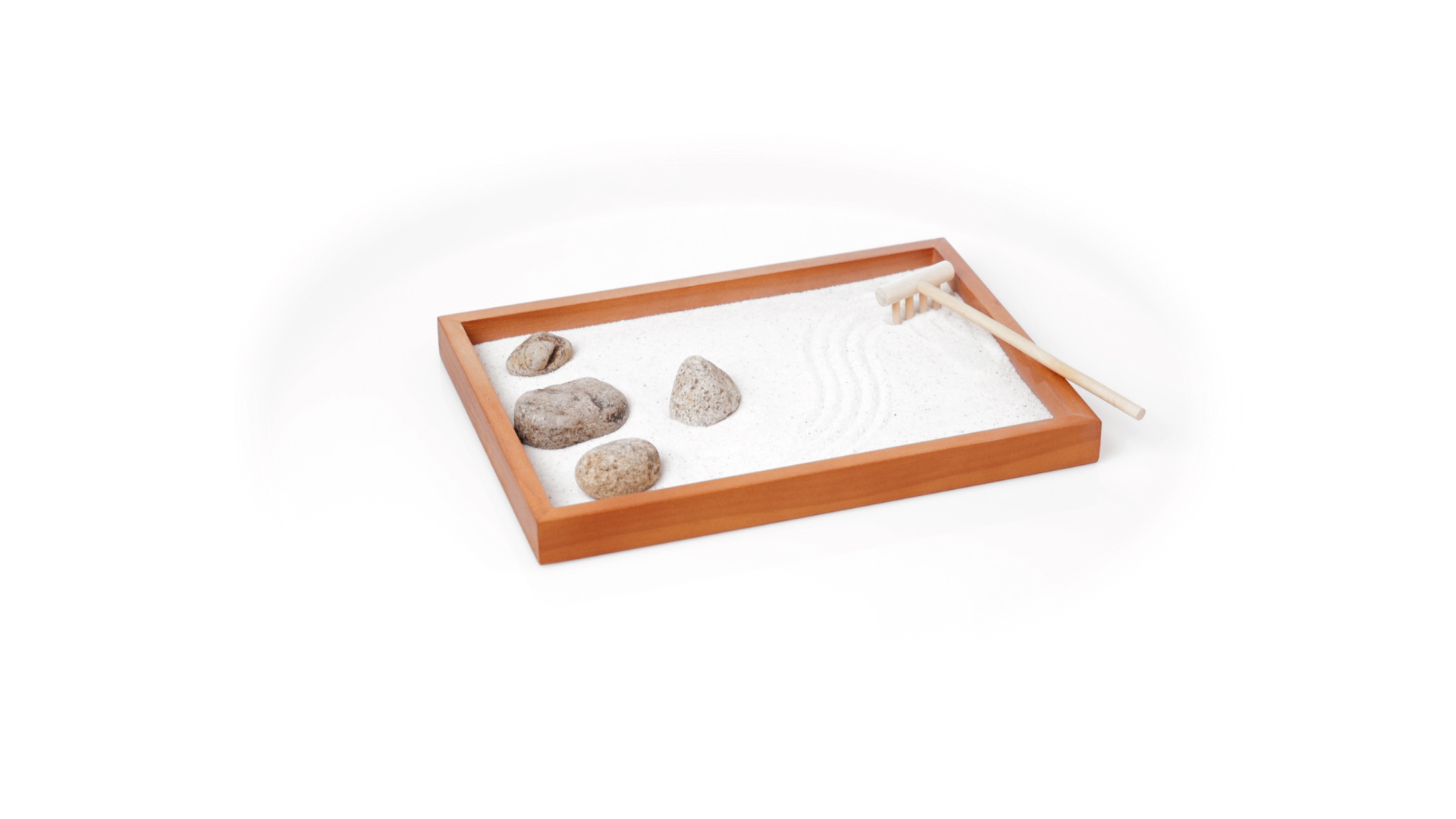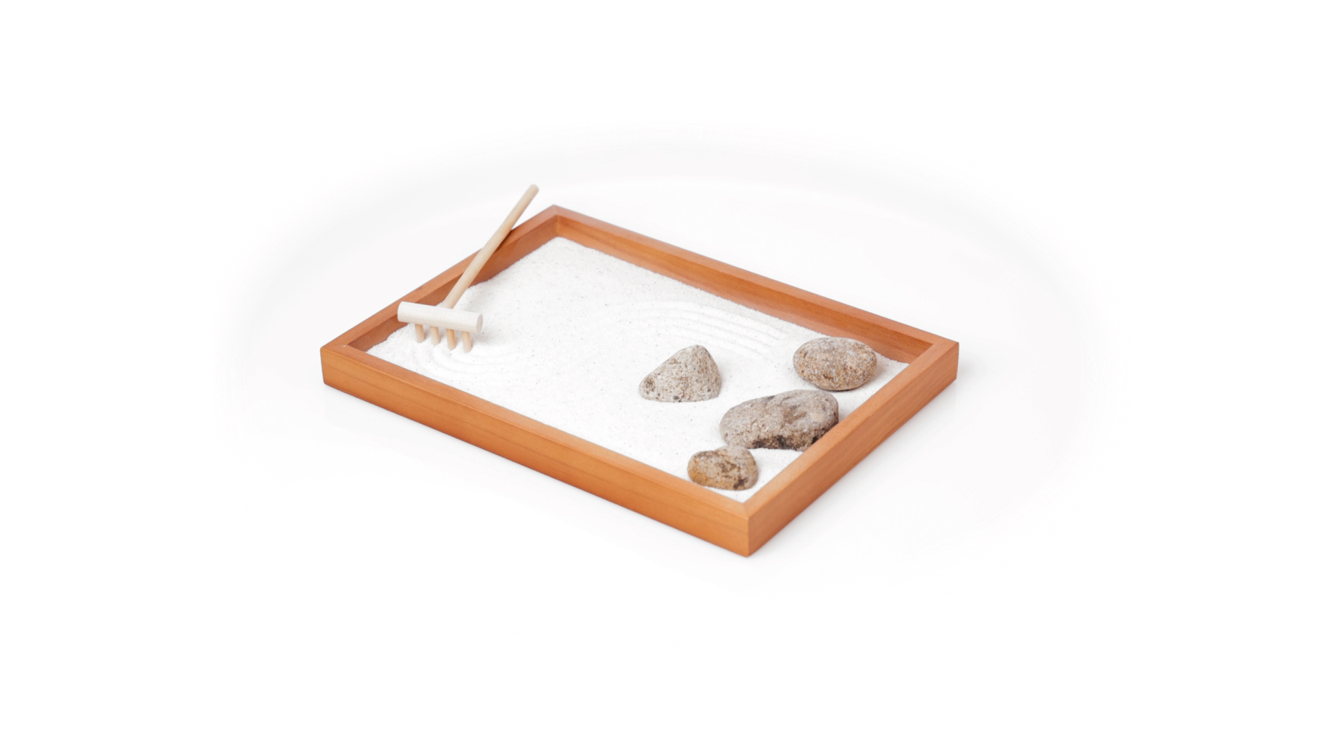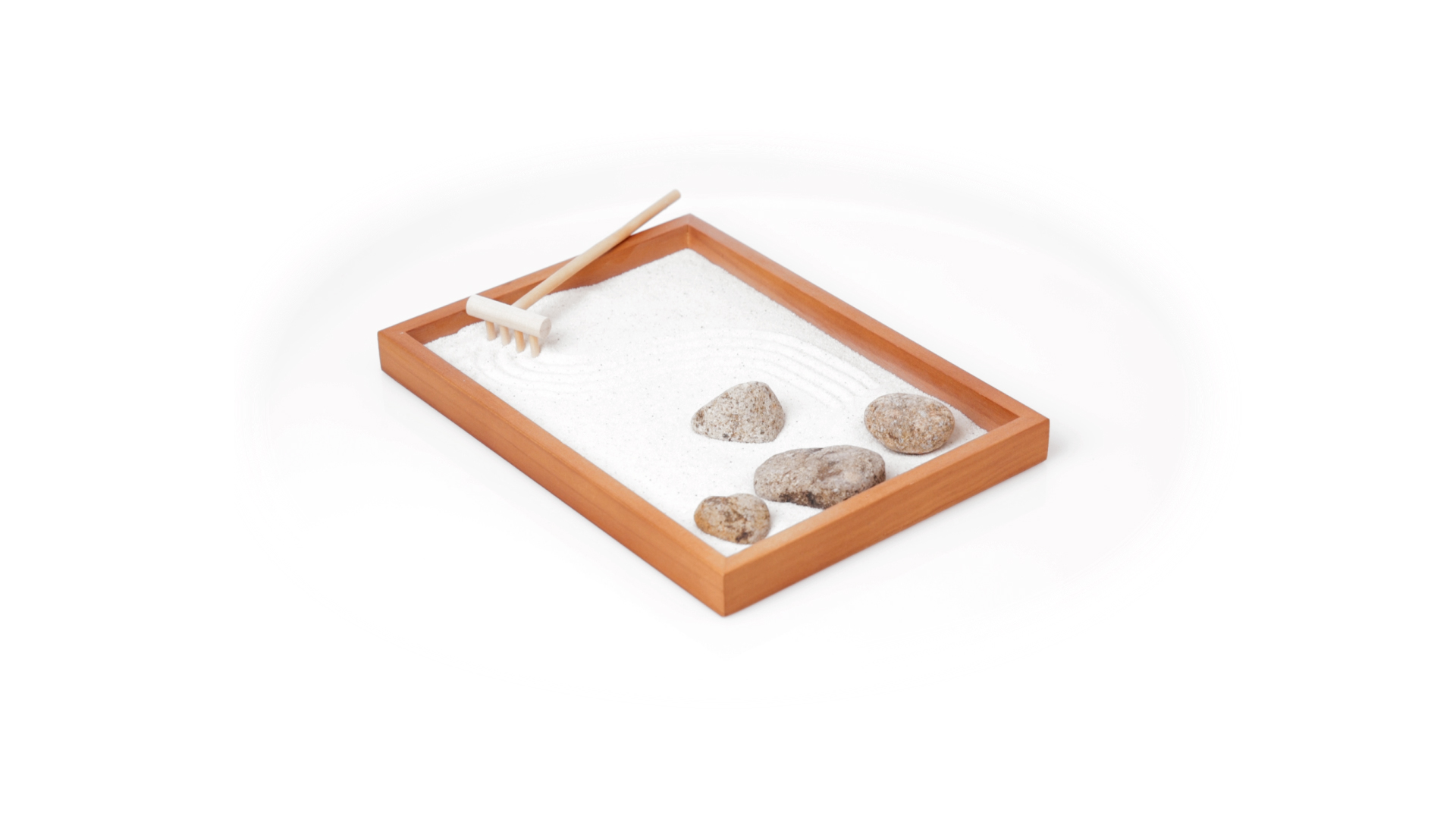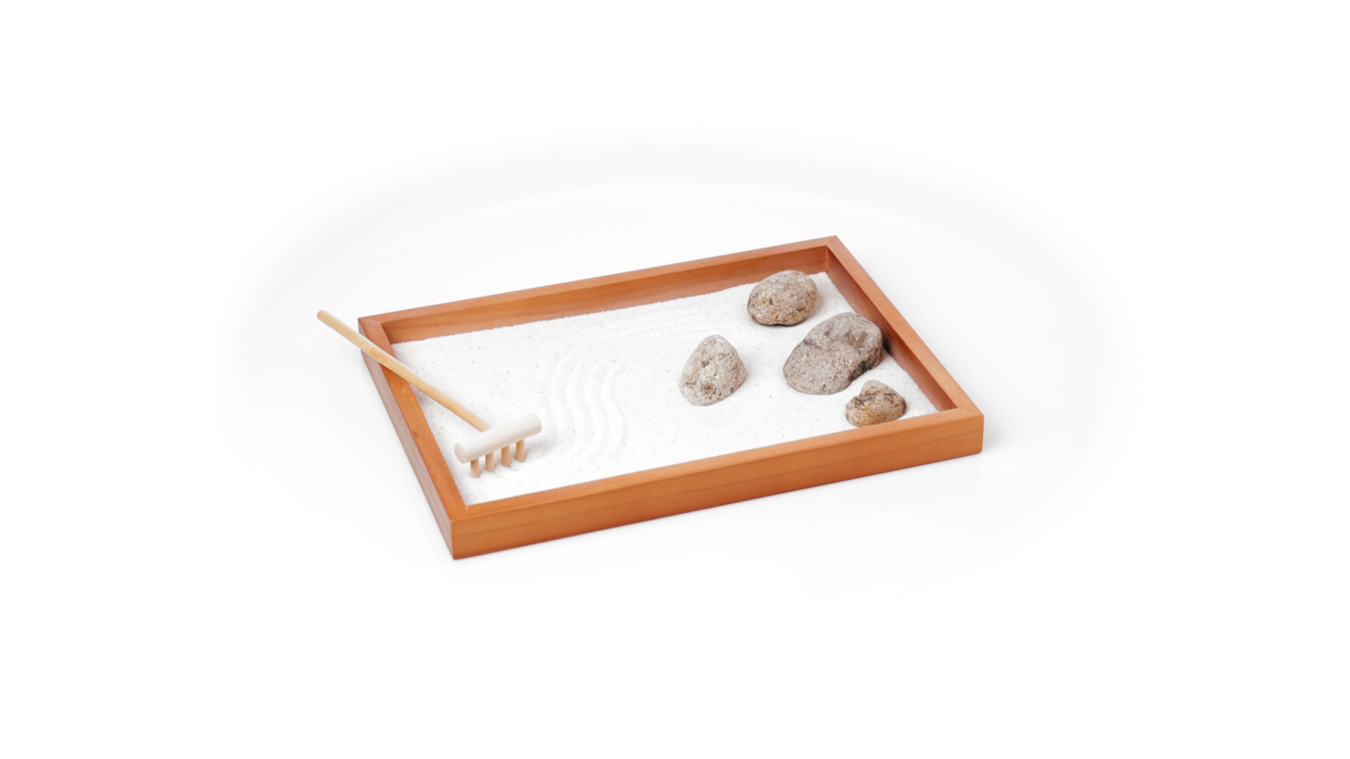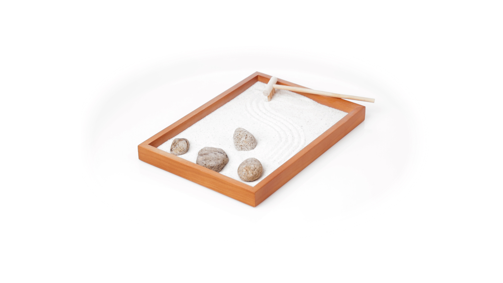 Mini-Zen-Garten für Entspannung und Seelenfrieden. Container Basis und Harke aus Naturholz, mit 4 Natursteinen und einem kleinen Beutel mit weissem Sand. Präsentiert in einer individuellen Box mit Kraft-Design.
