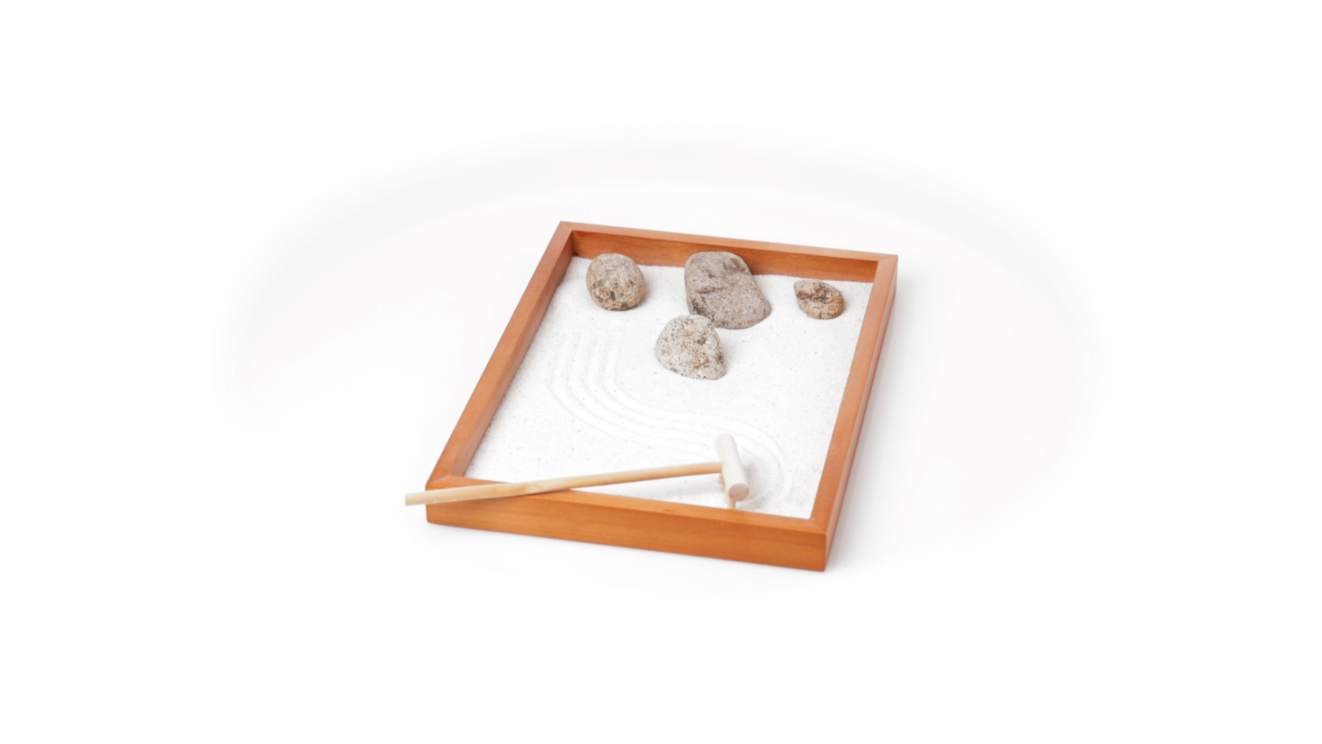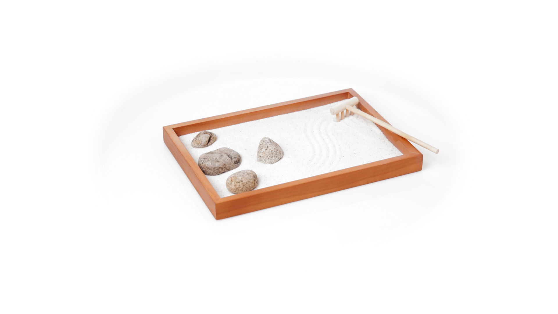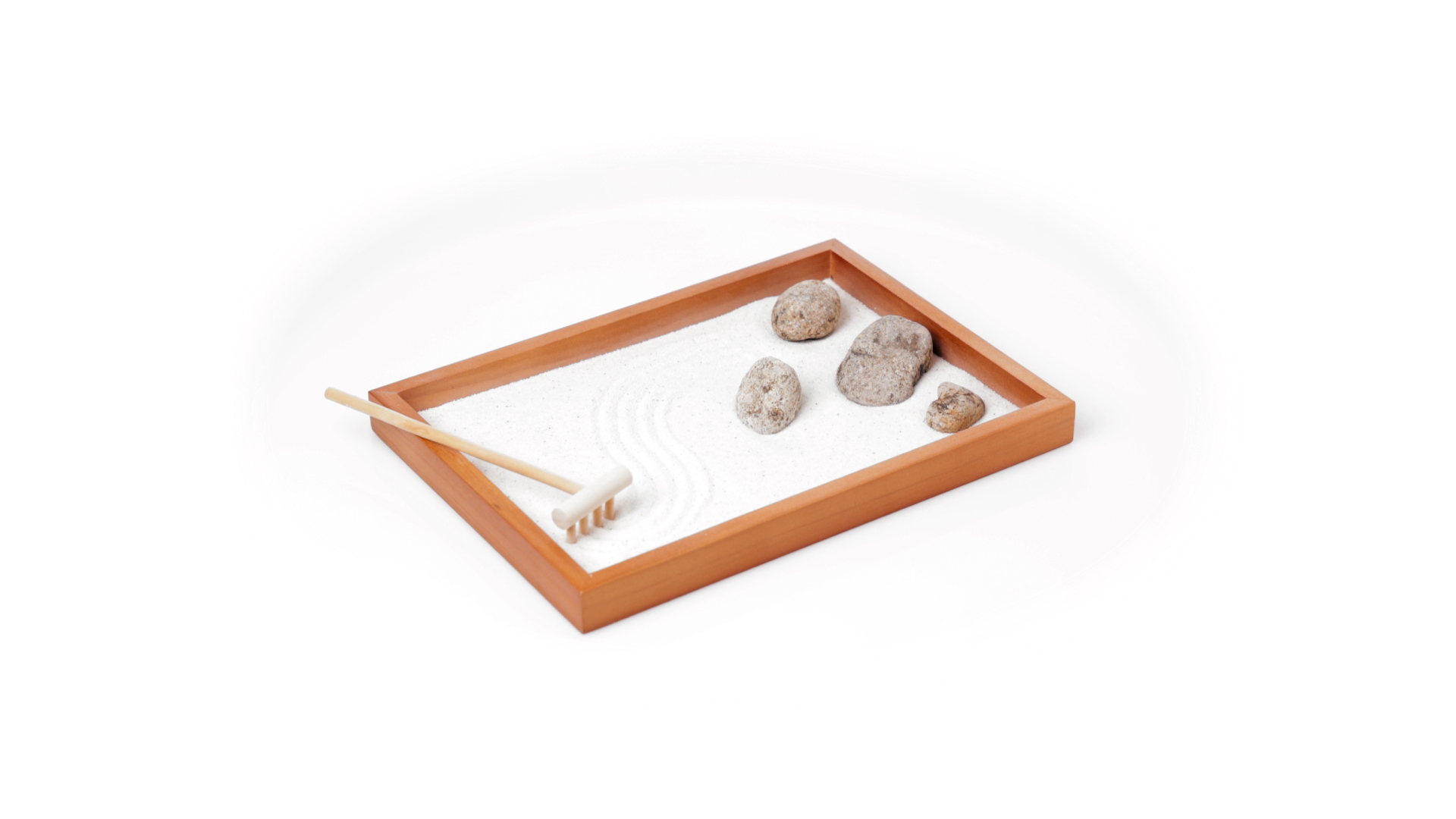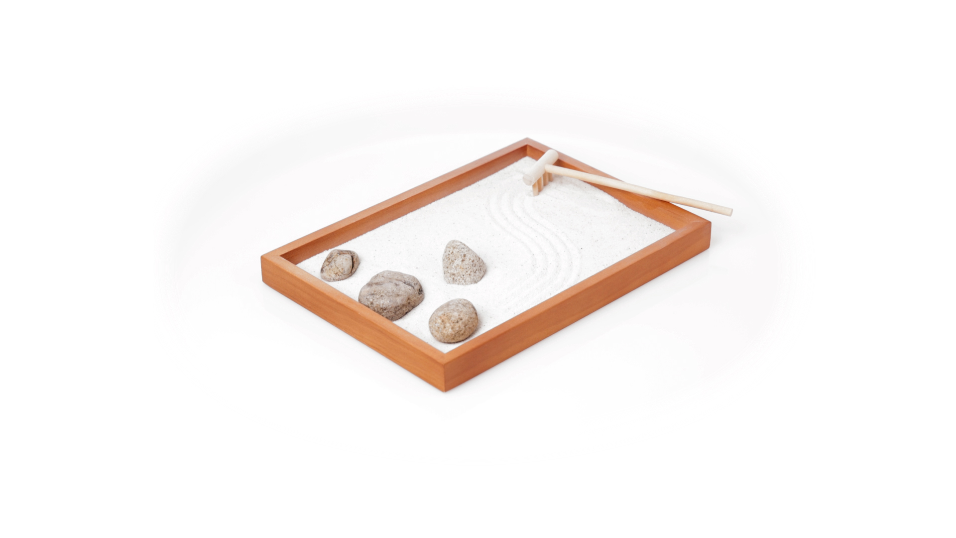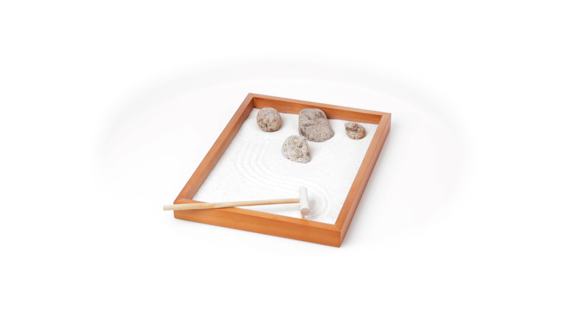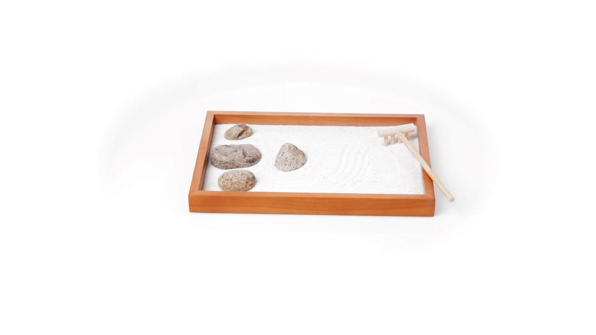 Mini-Zen-Garten für Entspannung und Seelenfrieden. Container Basis und Harke aus Naturholz, mit 4 Natursteinen und einem kleinen Beutel mit weissem Sand. Präsentiert in einer individuellen Box mit Kraft-Design.