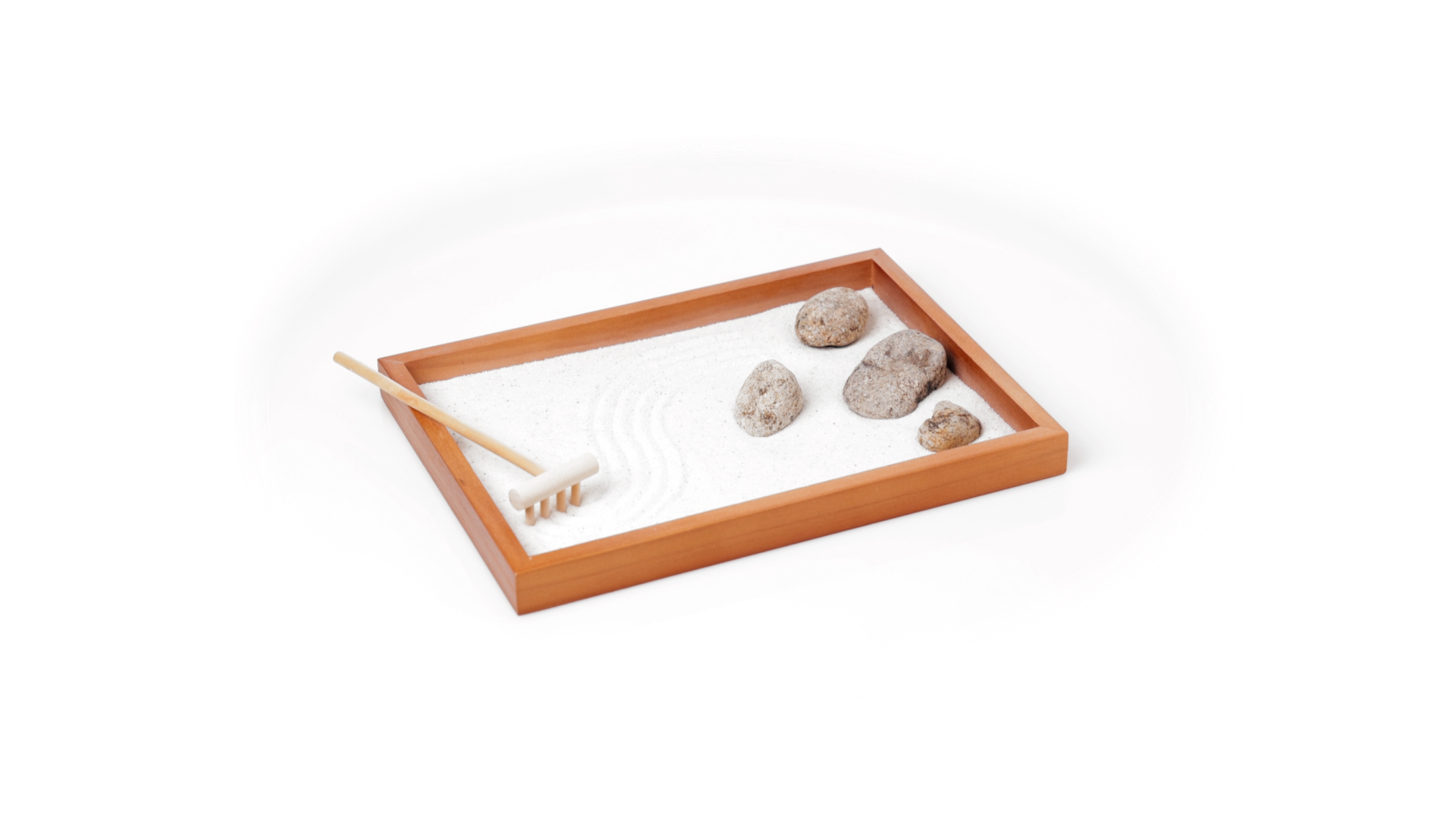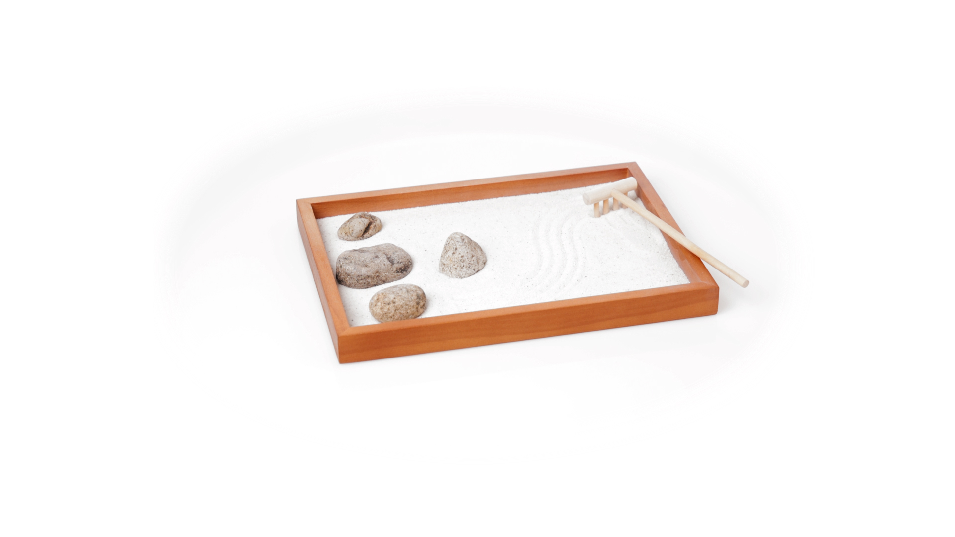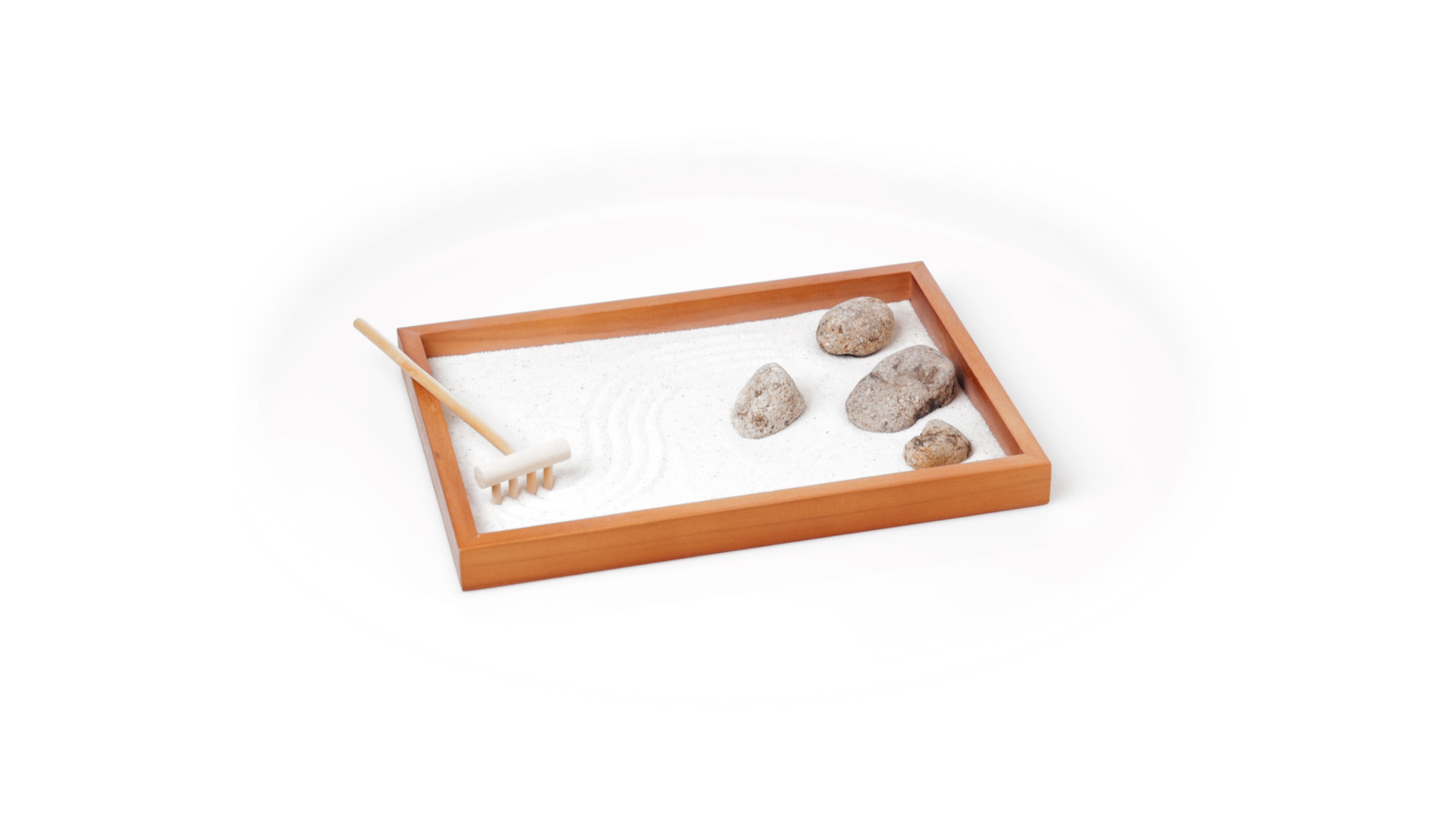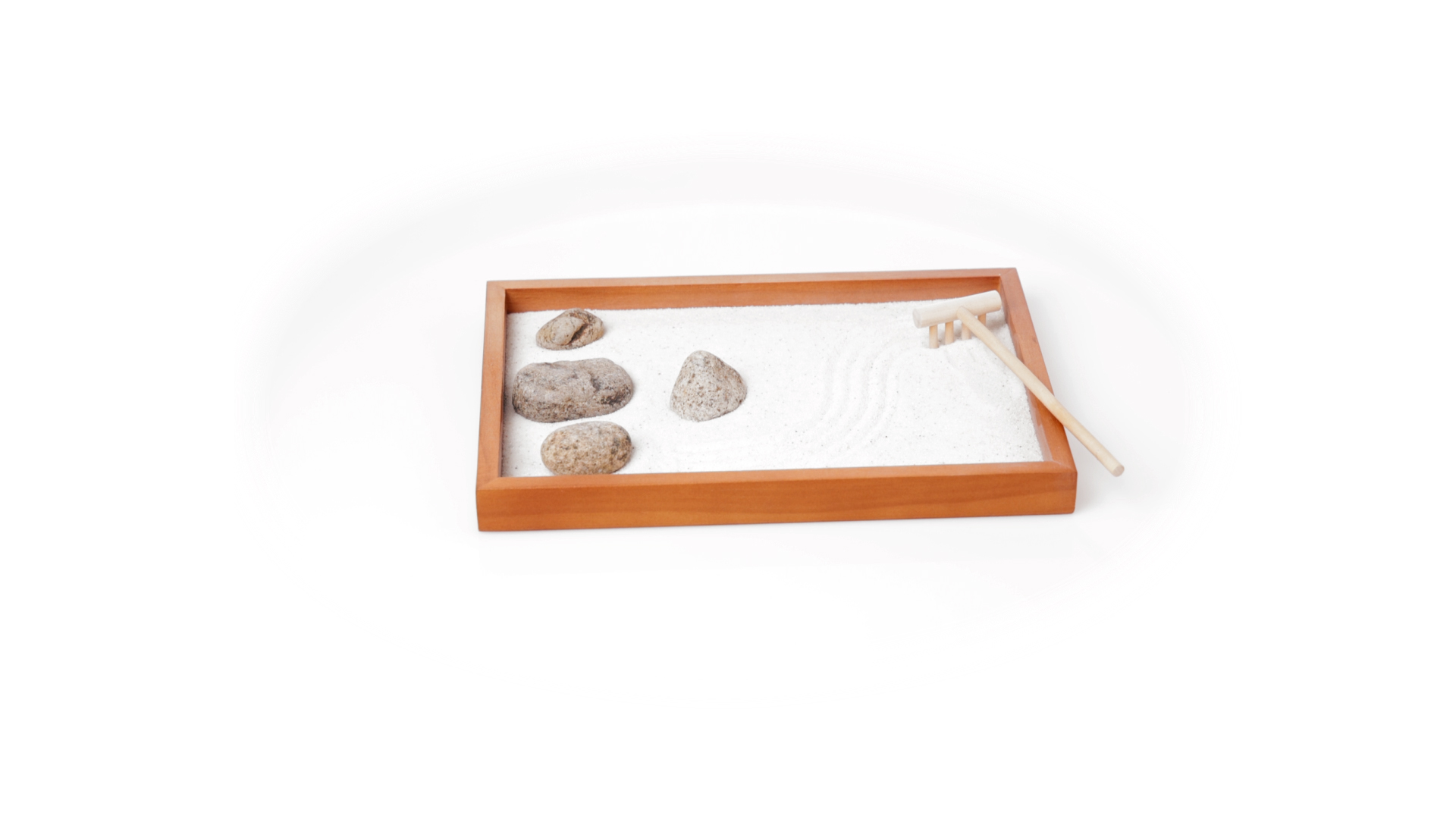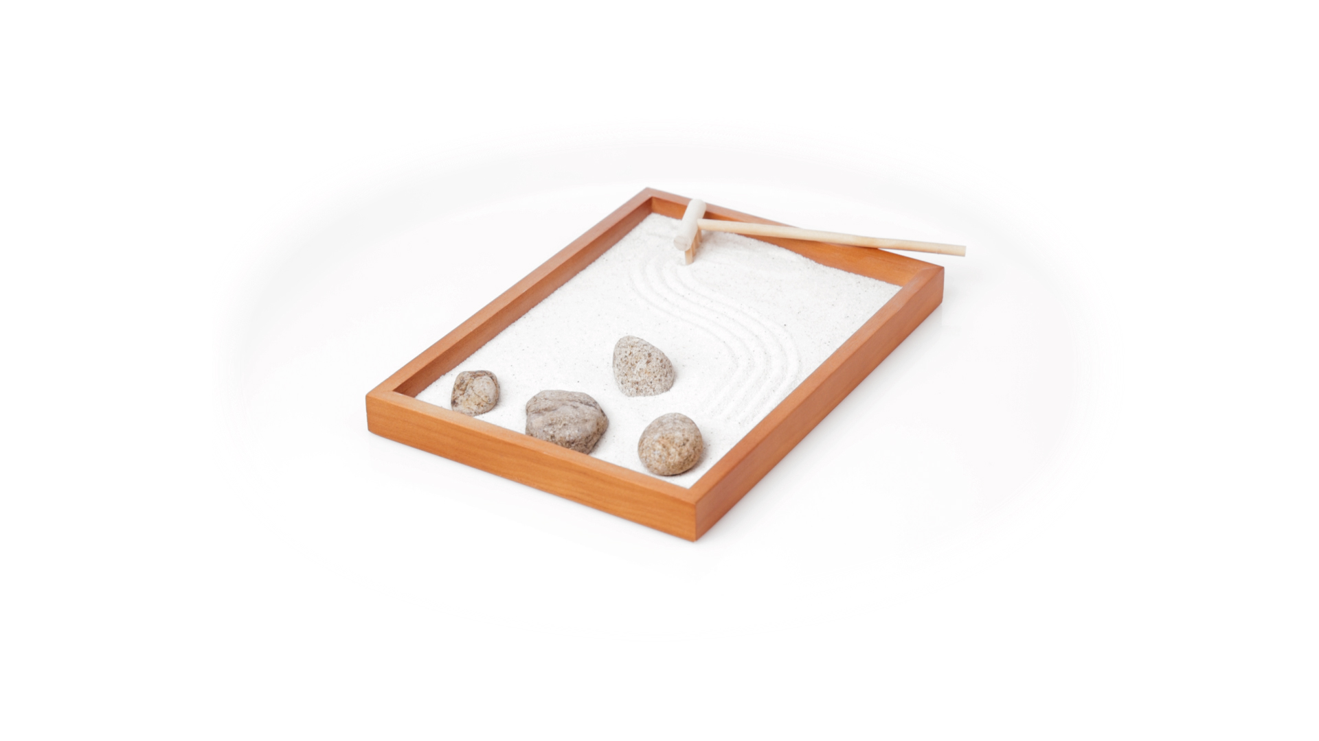 Mini-Zen-Garten für Entspannung und Seelenfrieden. Container Basis und Harke aus Naturholz, mit 4 Natursteinen und einem kleinen Beutel mit weissem Sand. Präsentiert in einer individuellen Box mit Kraft-Design.
