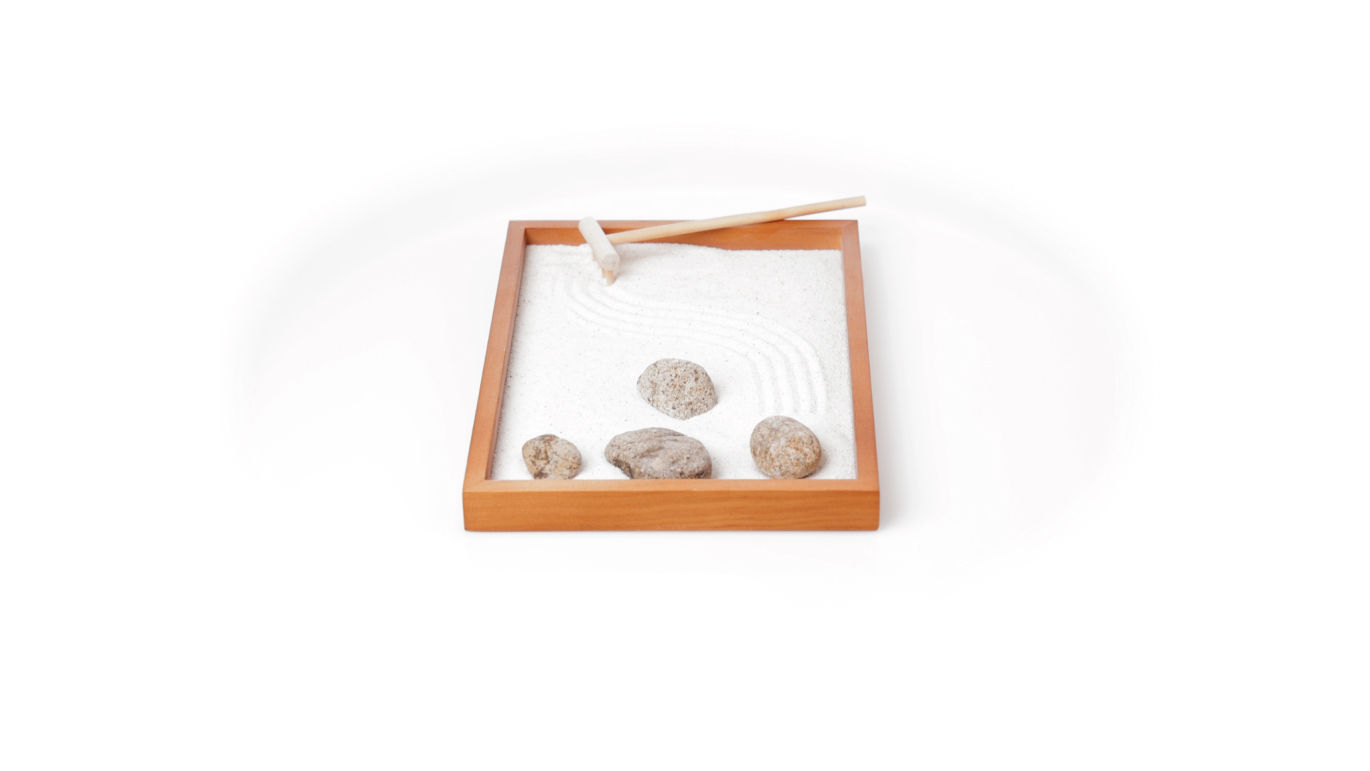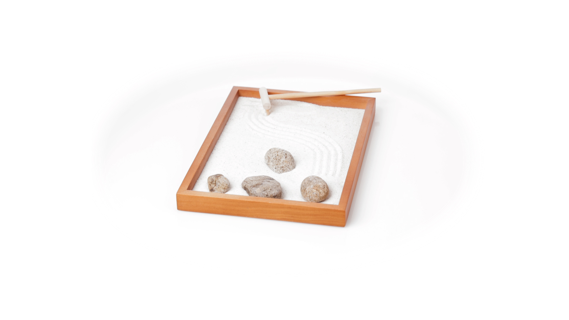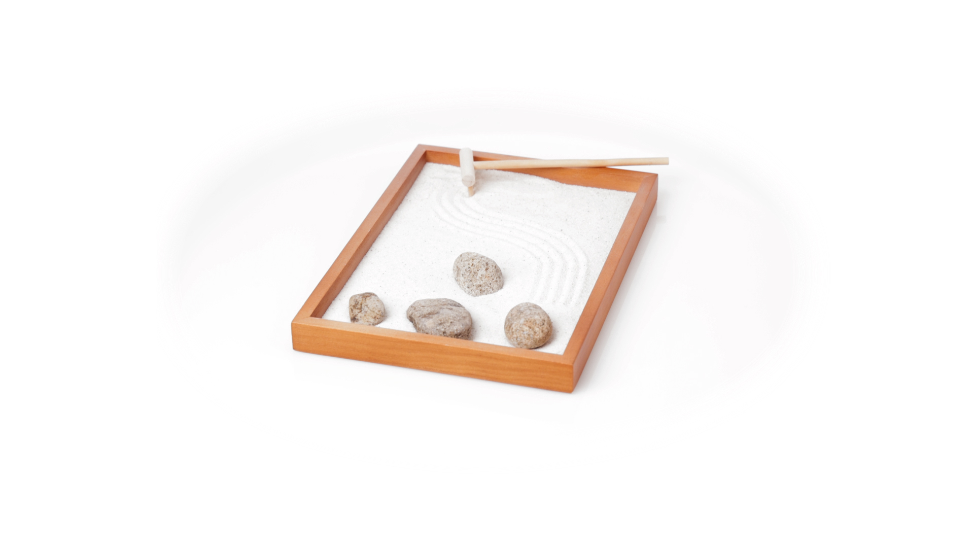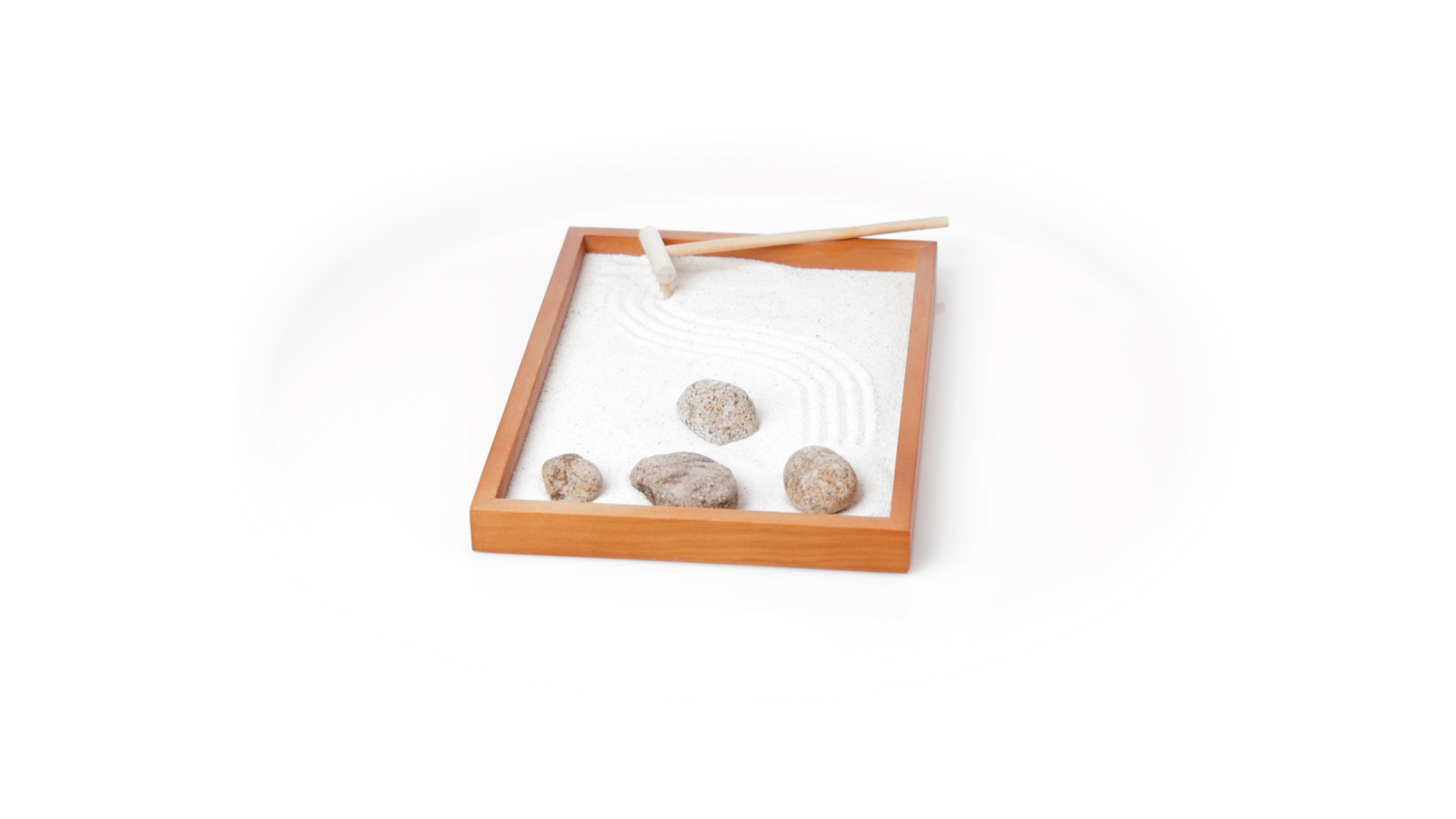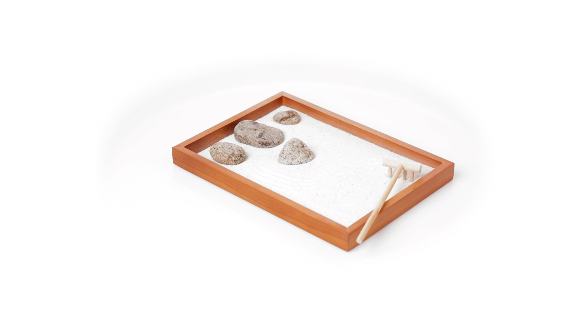 Mini-Zen-Garten für Entspannung und Seelenfrieden. Container Basis und Harke aus Naturholz, mit 4 Natursteinen und einem kleinen Beutel mit weissem Sand. Präsentiert in einer individuellen Box mit Kraft-Design.