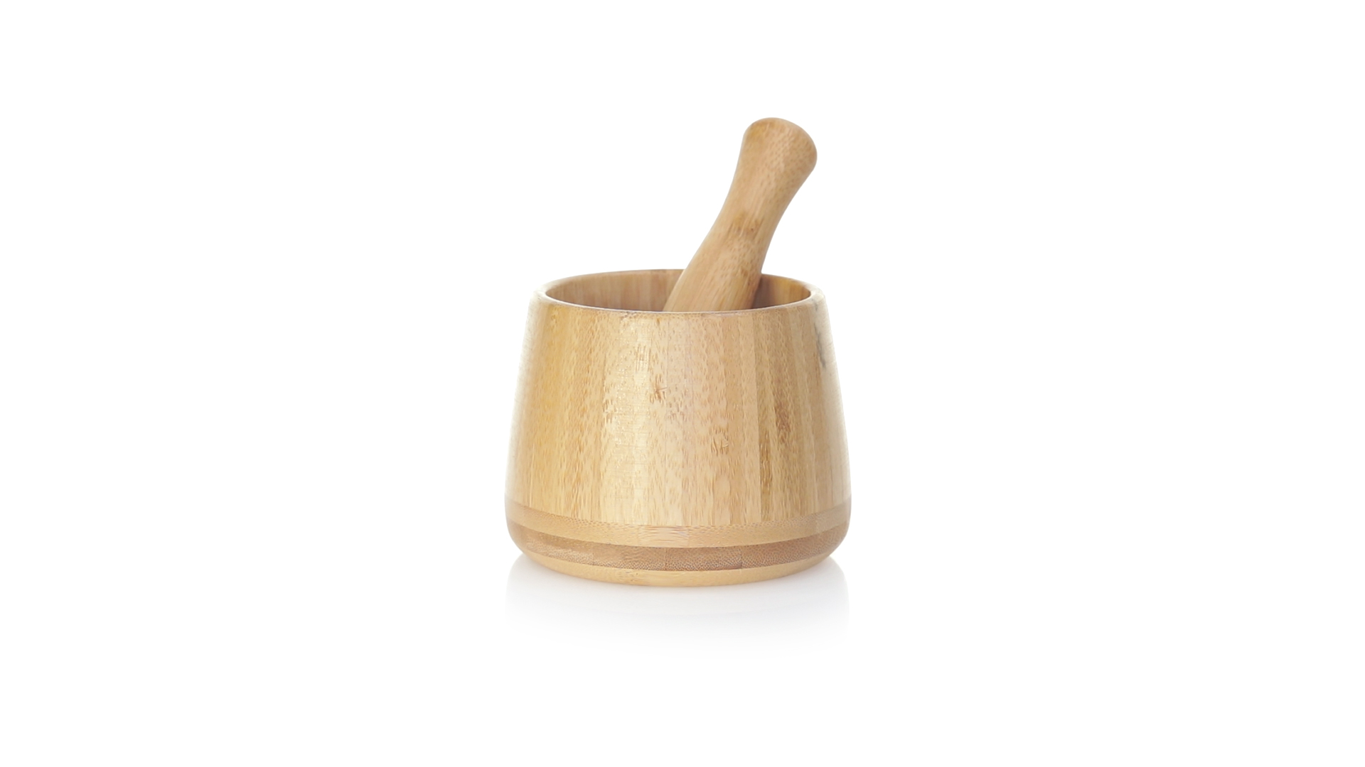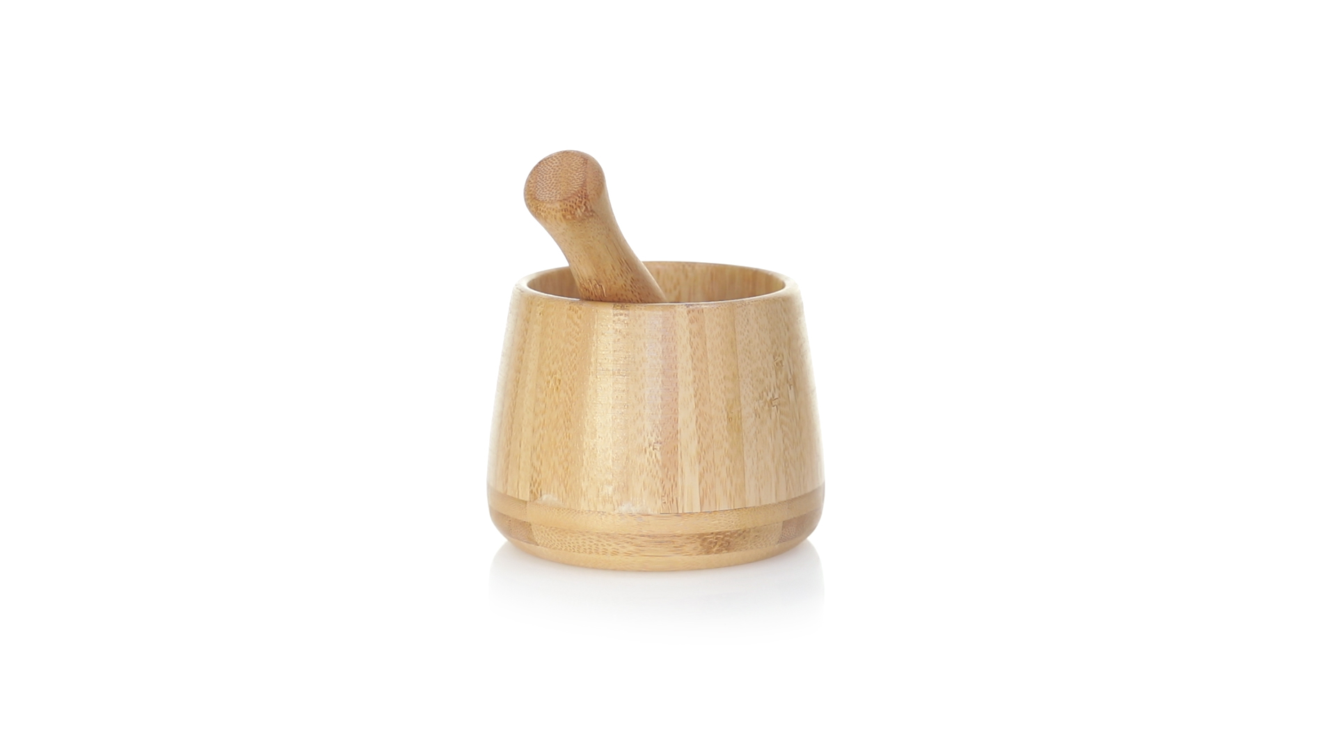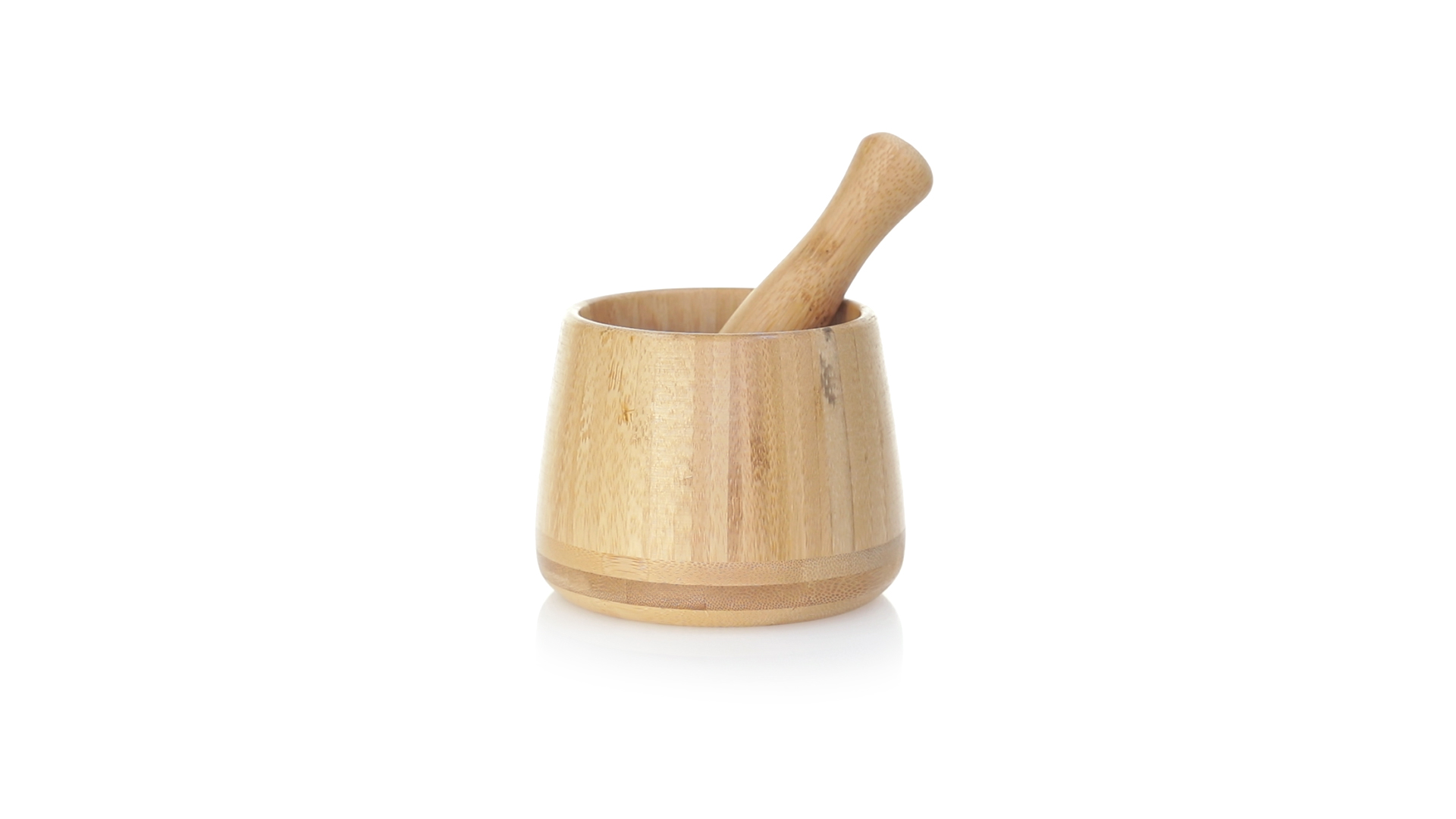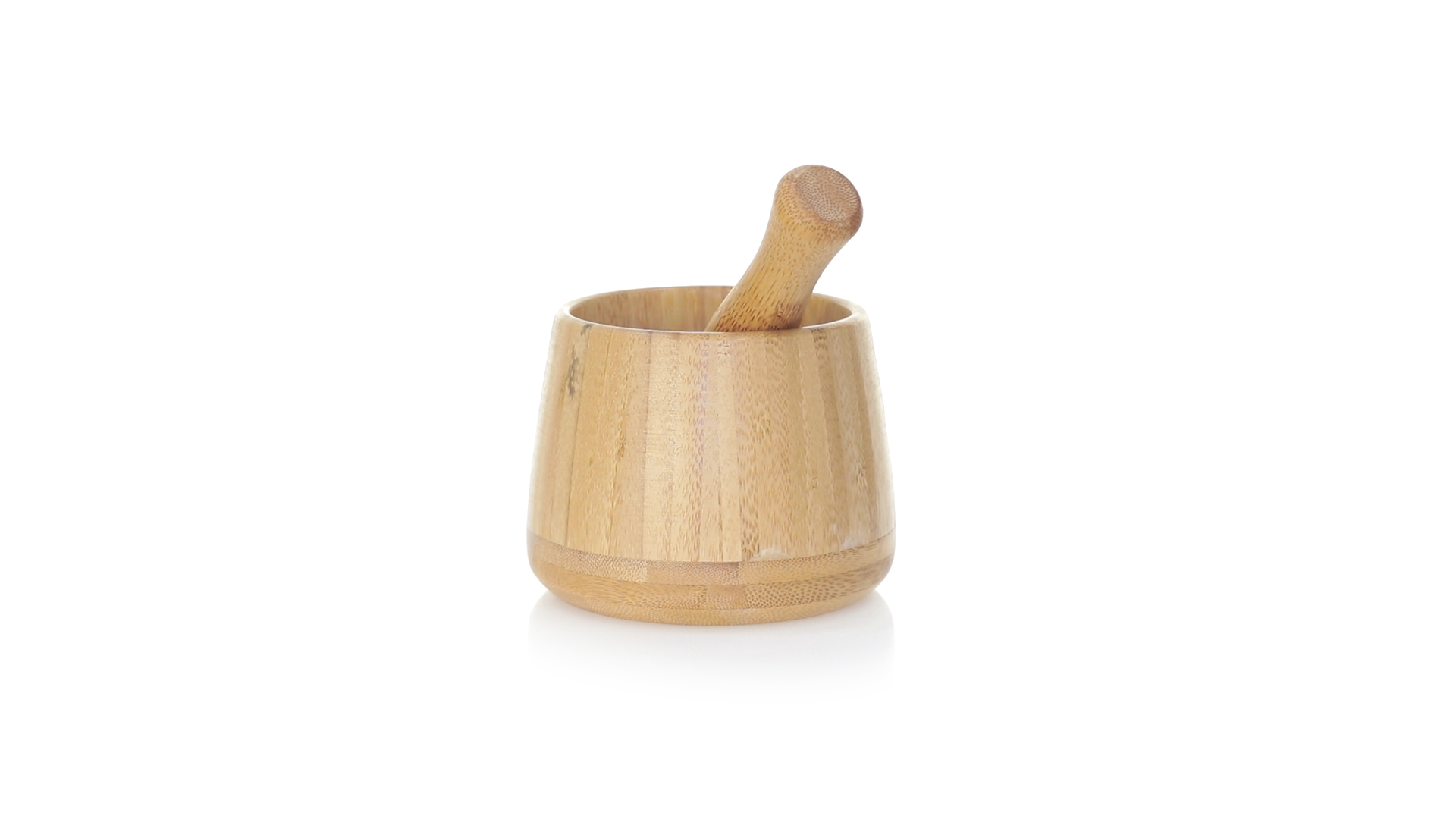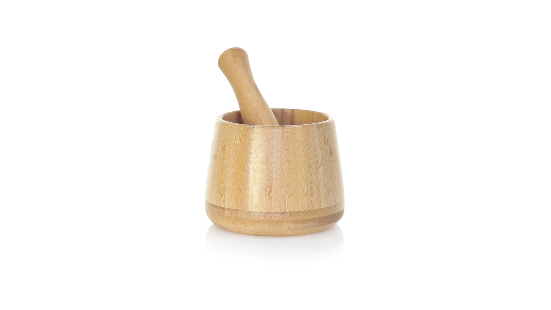 Linie "Natur" Mörser. Hergestellt aus Bambus, um die Verwendung von natürlichen Rohstoffen zu fördern. Inklusive Stössel und in einer individuellen, ökologisch gestalteten Schachtel.